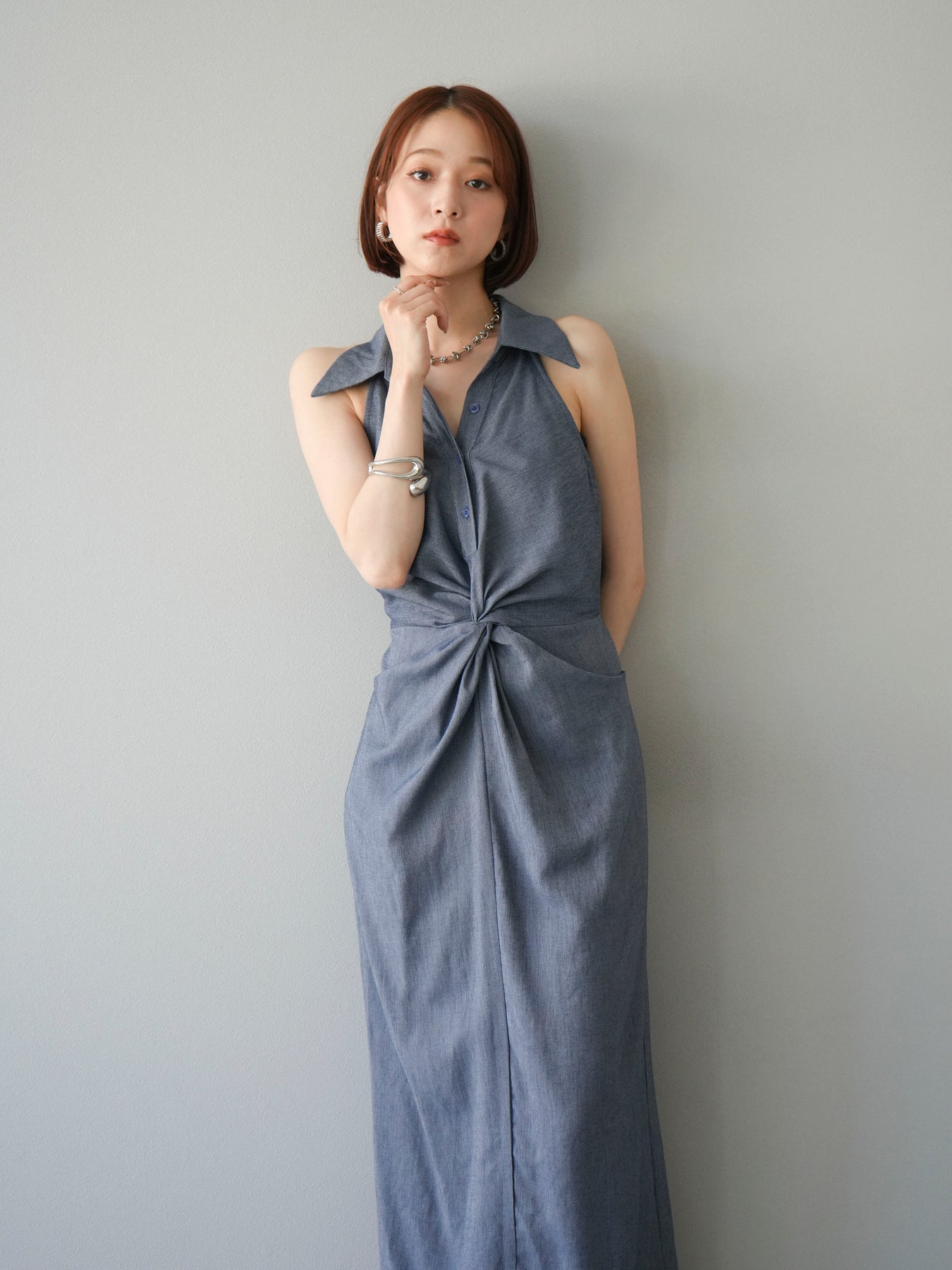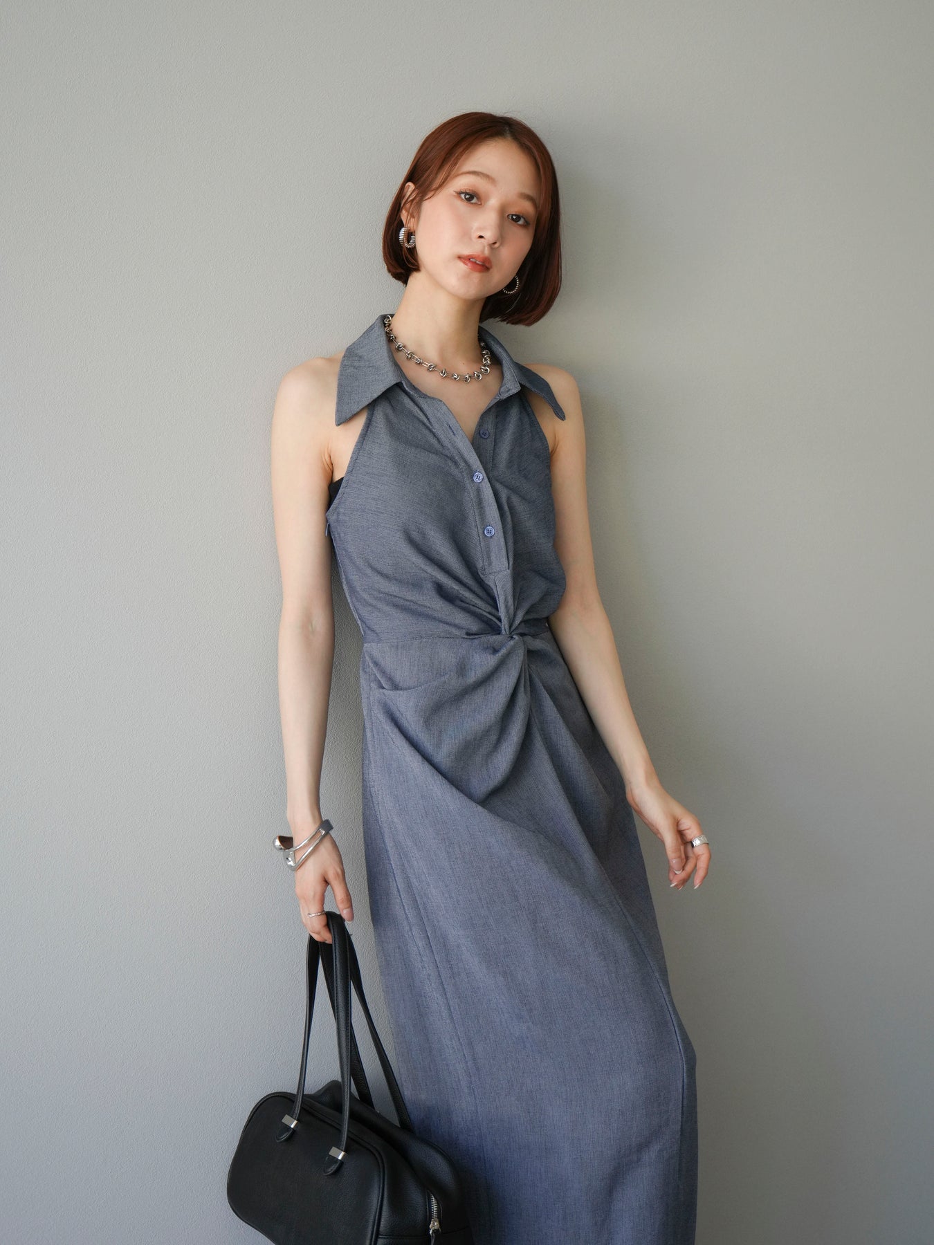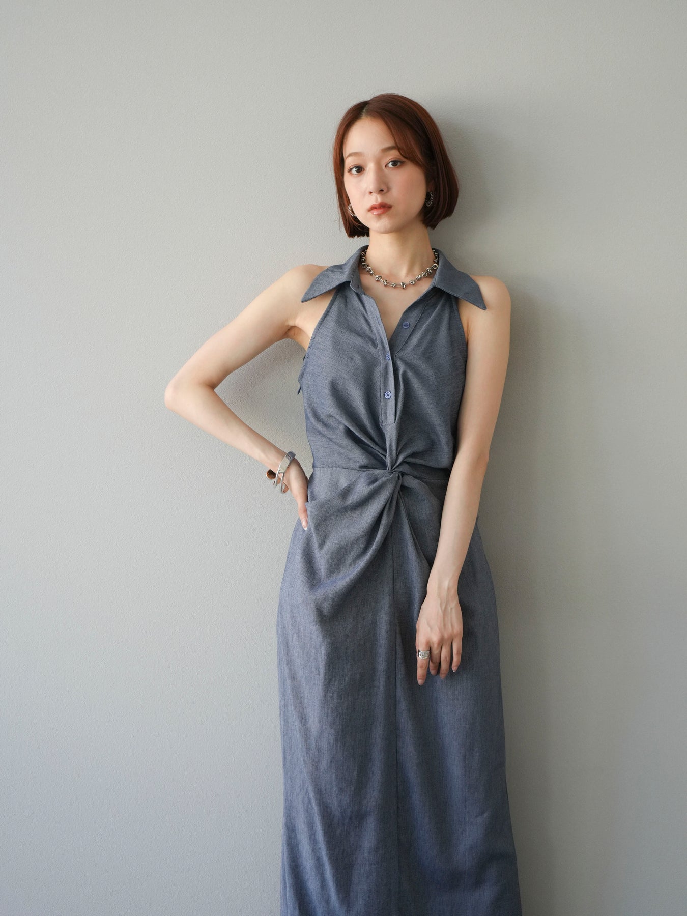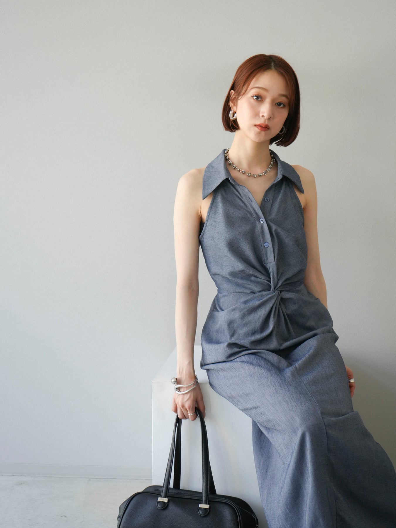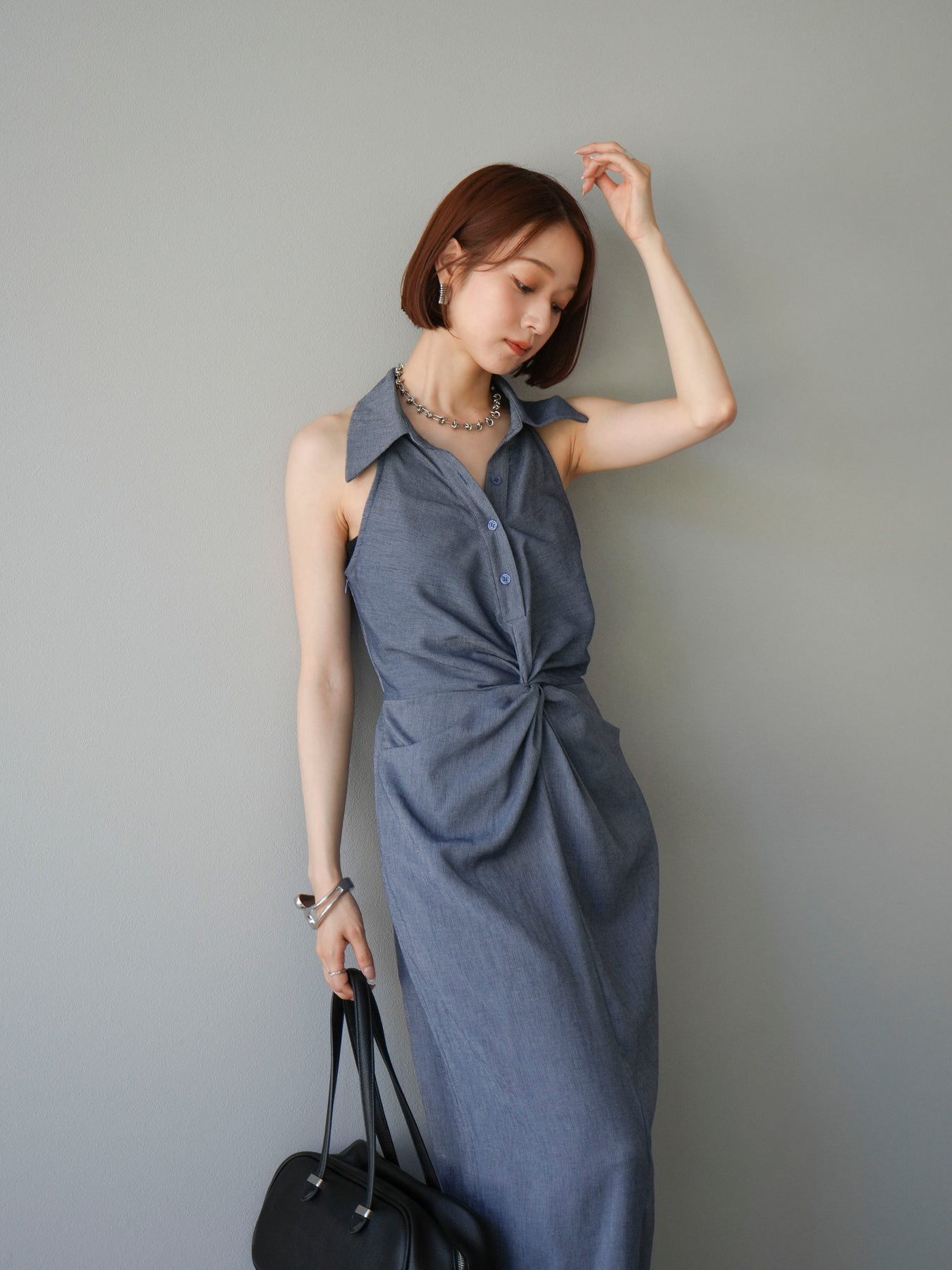シャツカラーとホルターデザインを掛け合わせた、洗練された印象のノースリーブワンピース。 フロントウエストのツイストディテールが、立体感のある美しいシルエットを演出し、スタイルアップも叶えます。 リネンライクな軽やかな素材感で、涼しげな着心地と品のある表情を両立。 デイリーからリゾートまで、幅広いシーンに映える一着です。 ※ボトムス、キャミソール(インナー)以外の商品は一律でインナーは付属していません