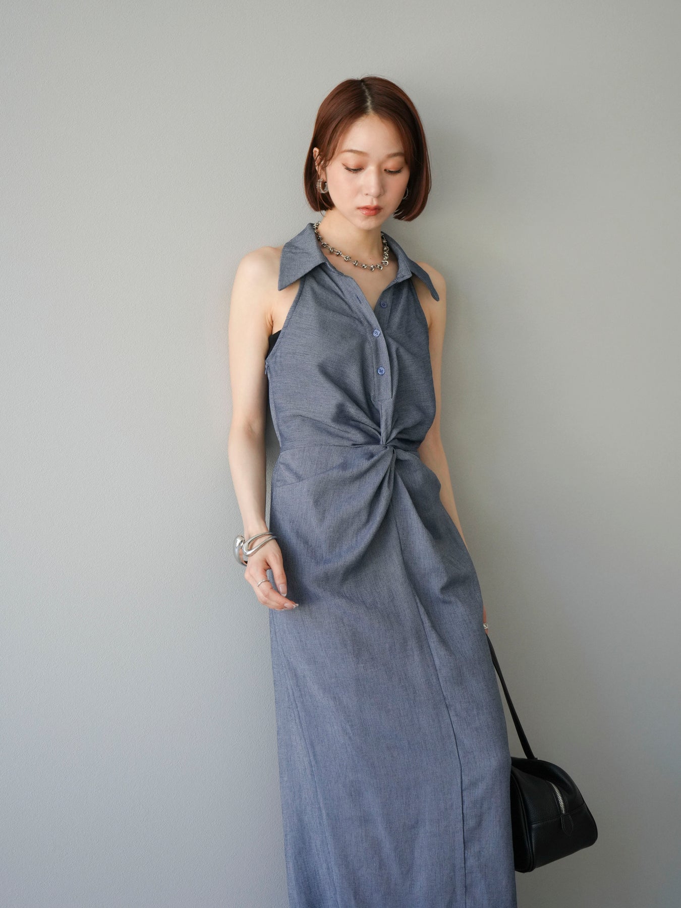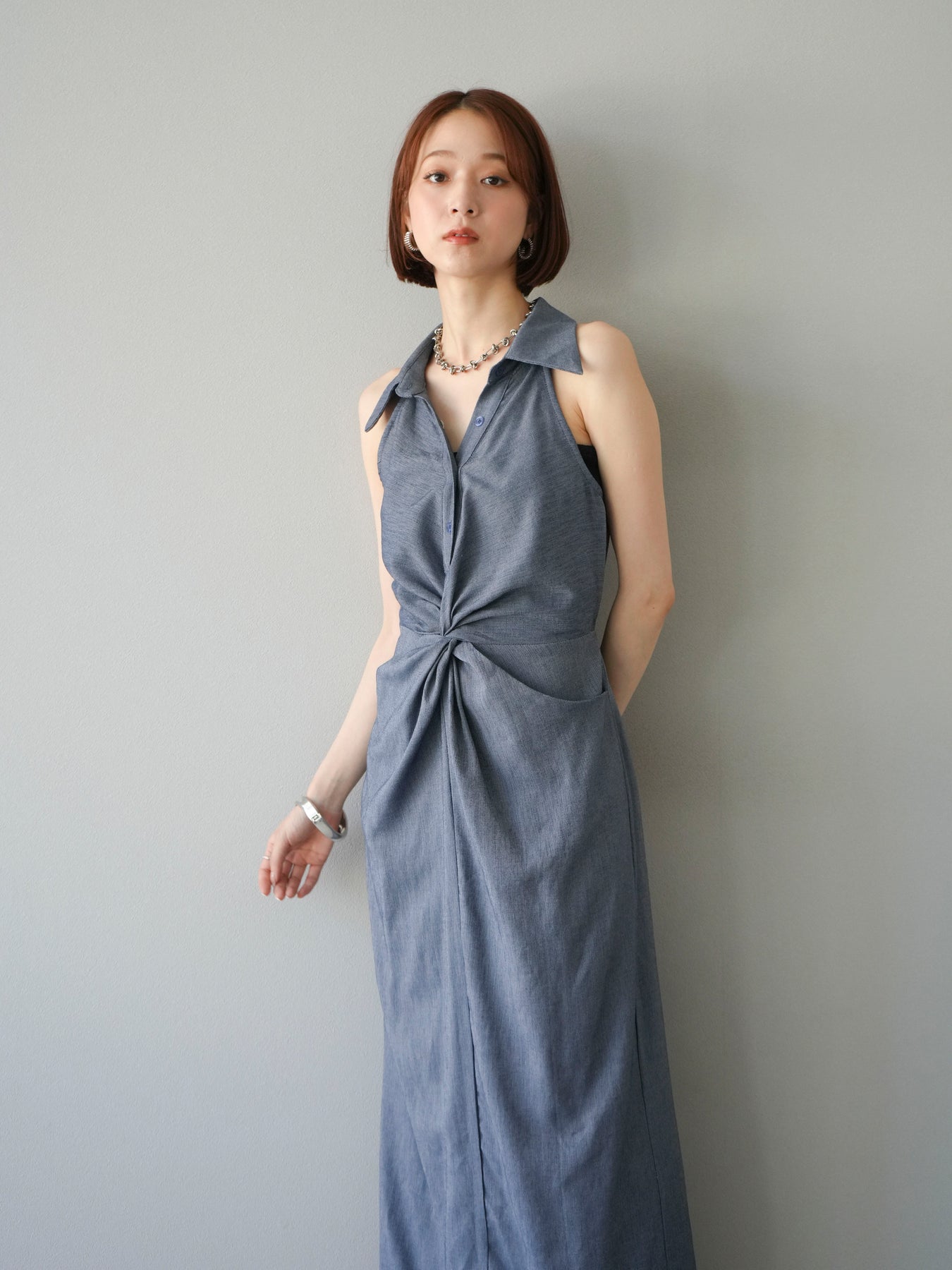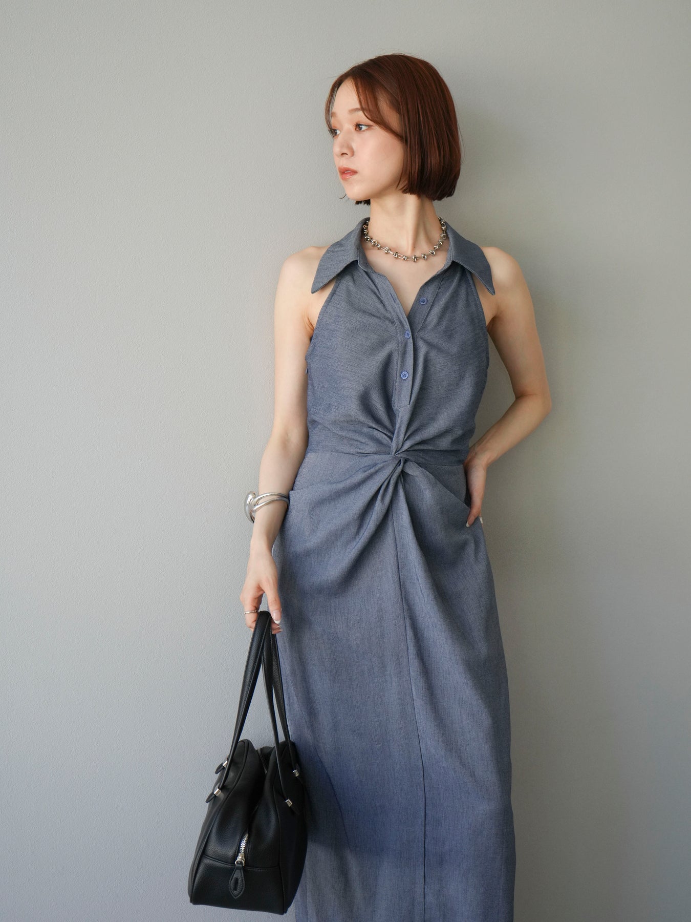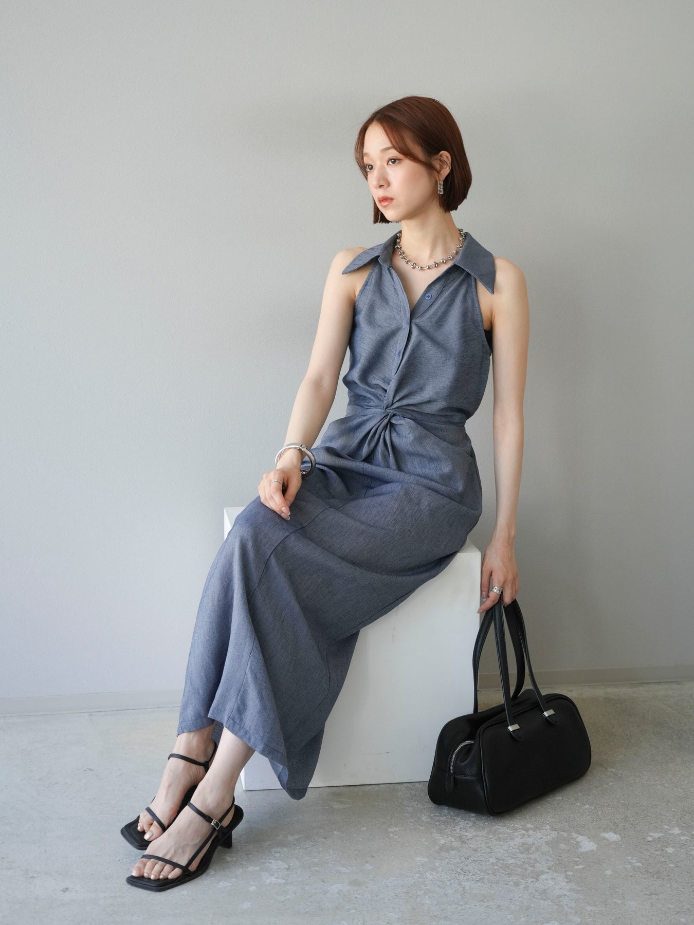シャツカラーとホルターデザインを掛け合わせた、洗練された印象のノースリーブワンピース。 フロントウエストのツイストディテールが、立体感のある美しいシルエットを演出し、スタイルアップも叶えます。 リネンライクな軽やかな素材感で、涼しげな着心地と品のある表情を両立。 デイリーからリゾートまで、幅広いシーンに映える一着です。 ※ボトムス、キャミソール(インナー)以外の商品は一律でインナーは付属していません
