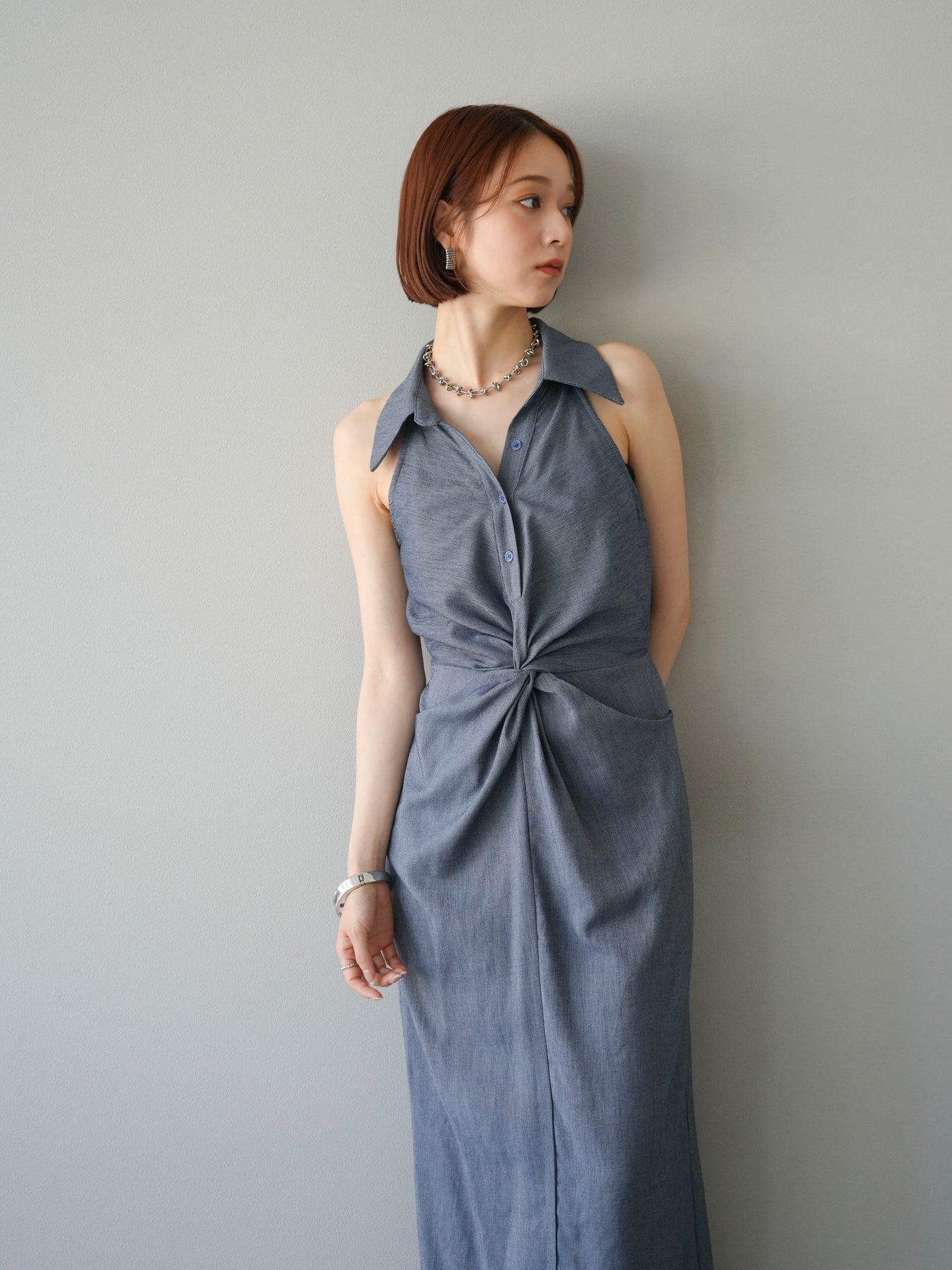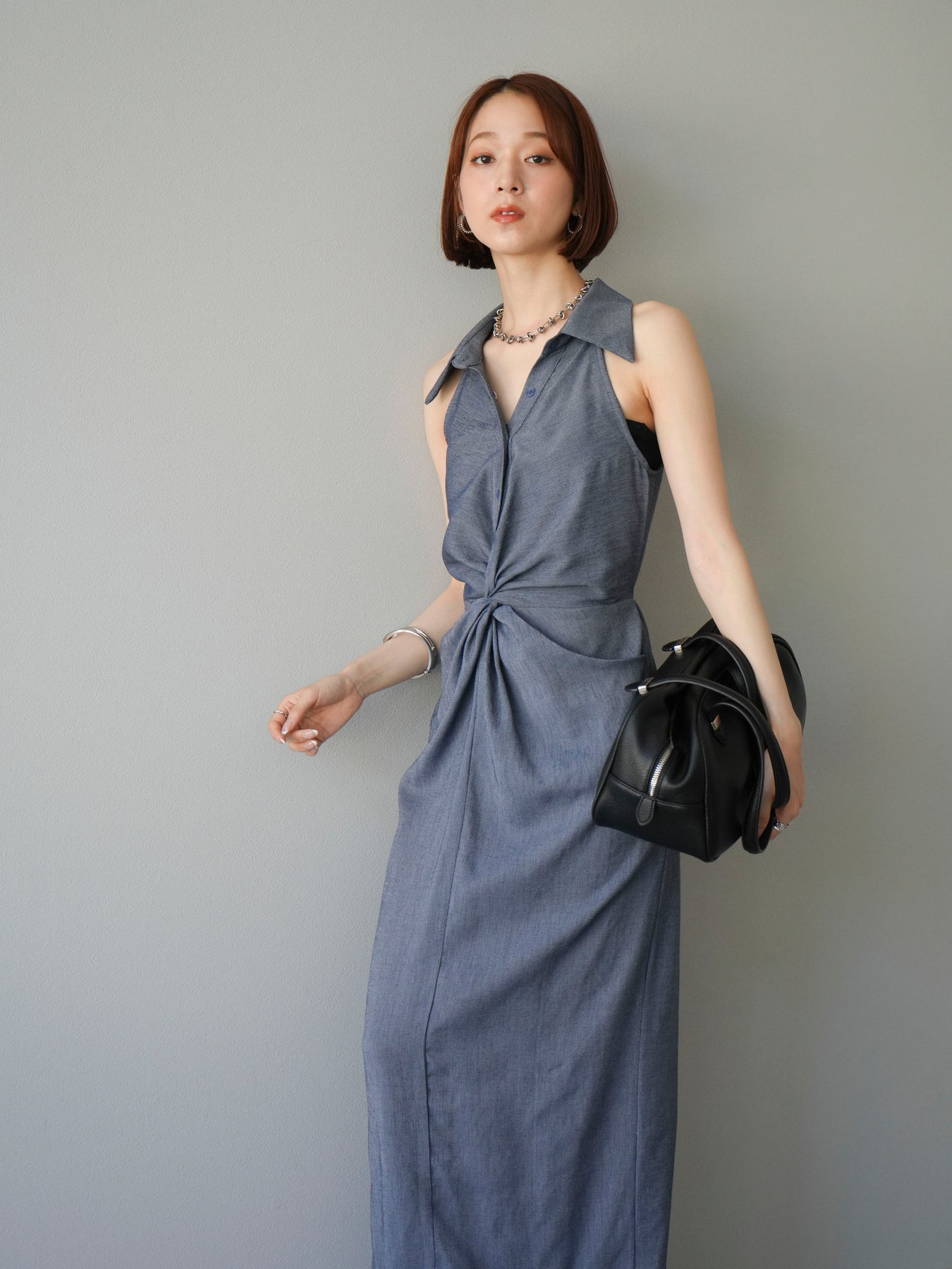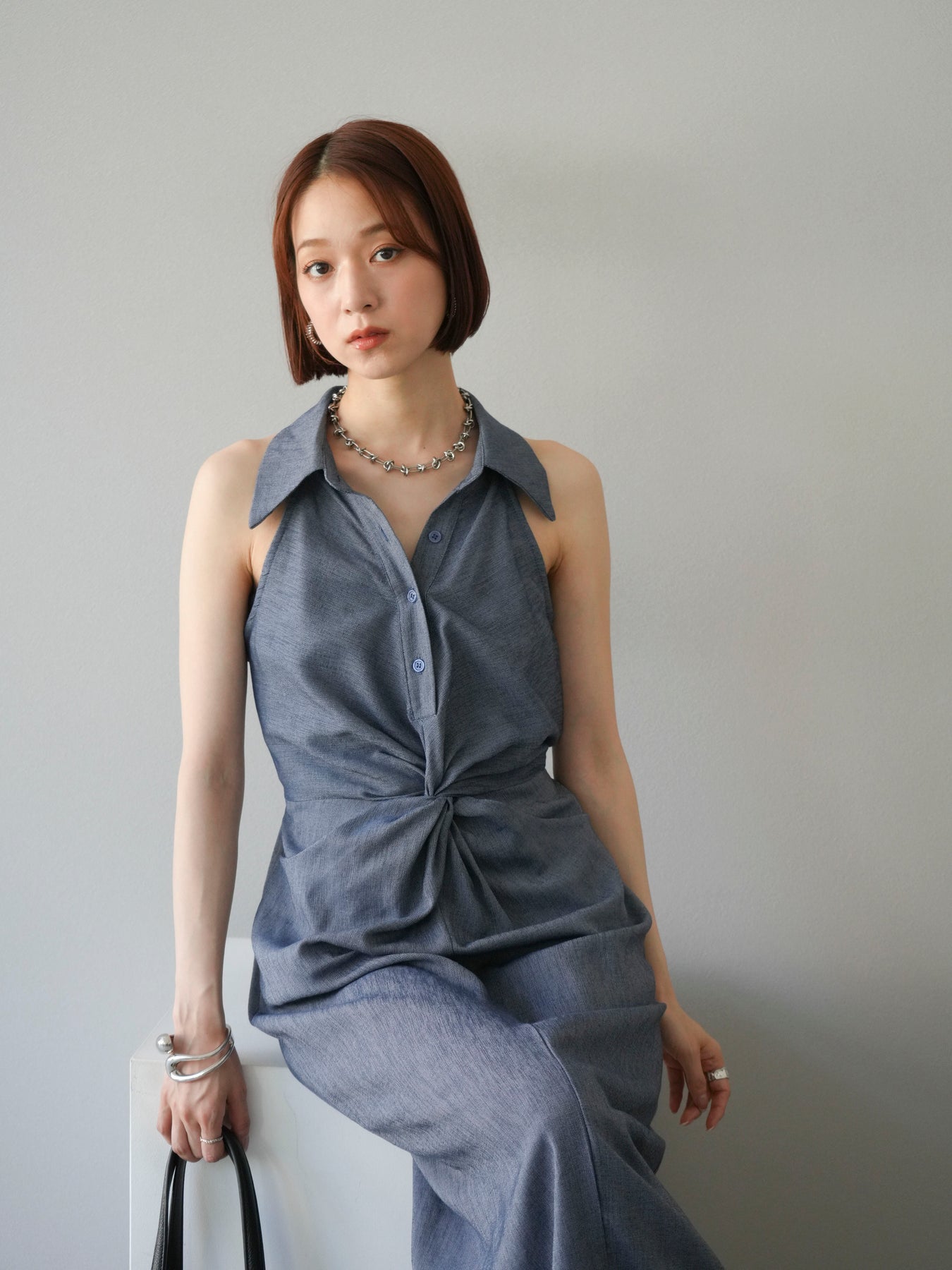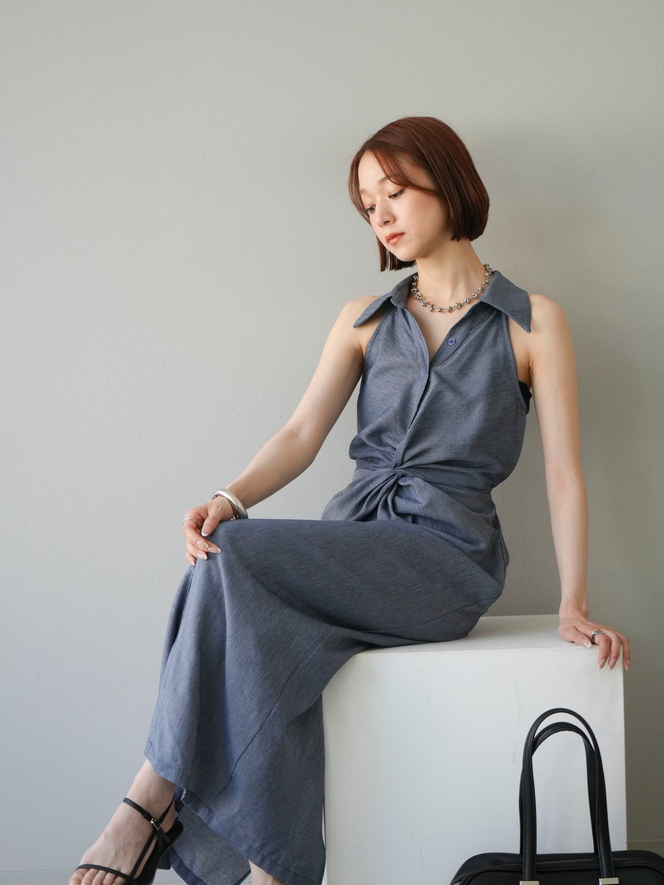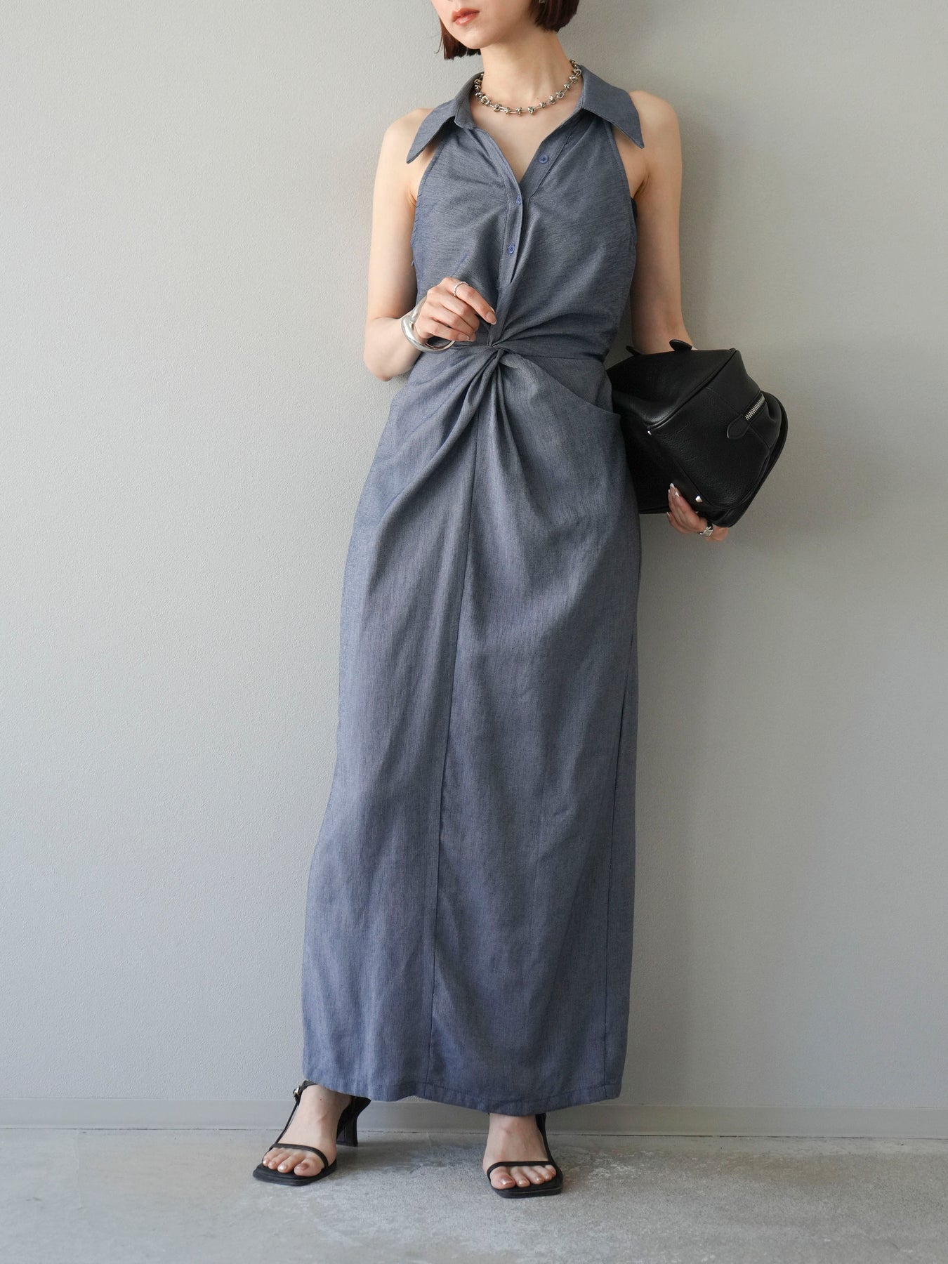 シャツカラーとホルターデザインを掛け合わせた、洗練された印象のノースリーブワンピース。 フロントウエストのツイストディテールが、立体感のある美しいシルエットを演出し、スタイルアップも叶えます。 リネンライクな軽やかな素材感で、涼しげな着心地と品のある表情を両立。 デイリーからリゾートまで、幅広いシーンに映える一着です。 ※ボトムス、キャミソール(インナー)以外の商品は一律でインナーは付属していません