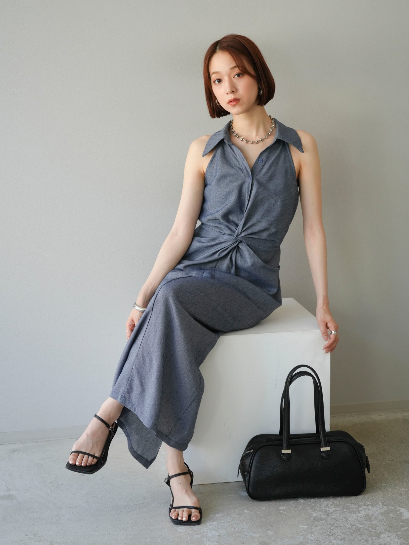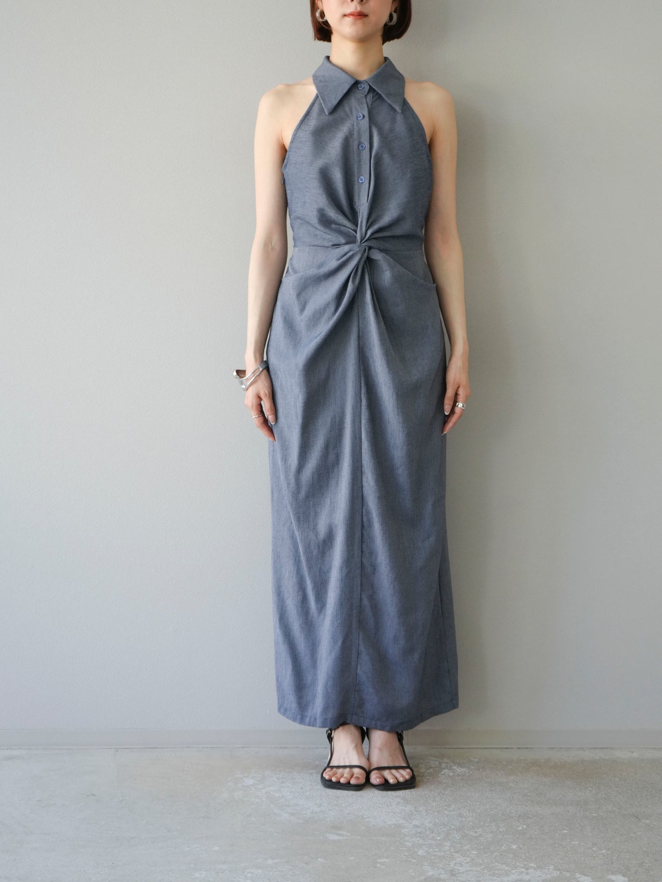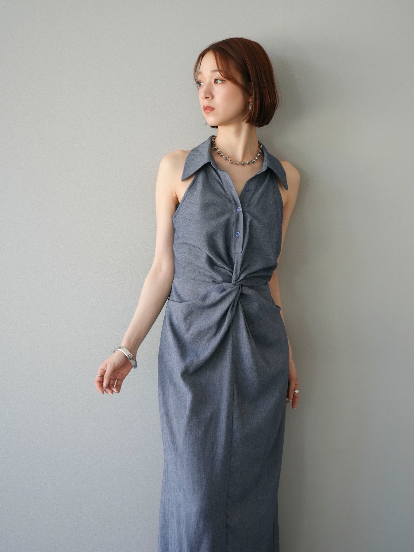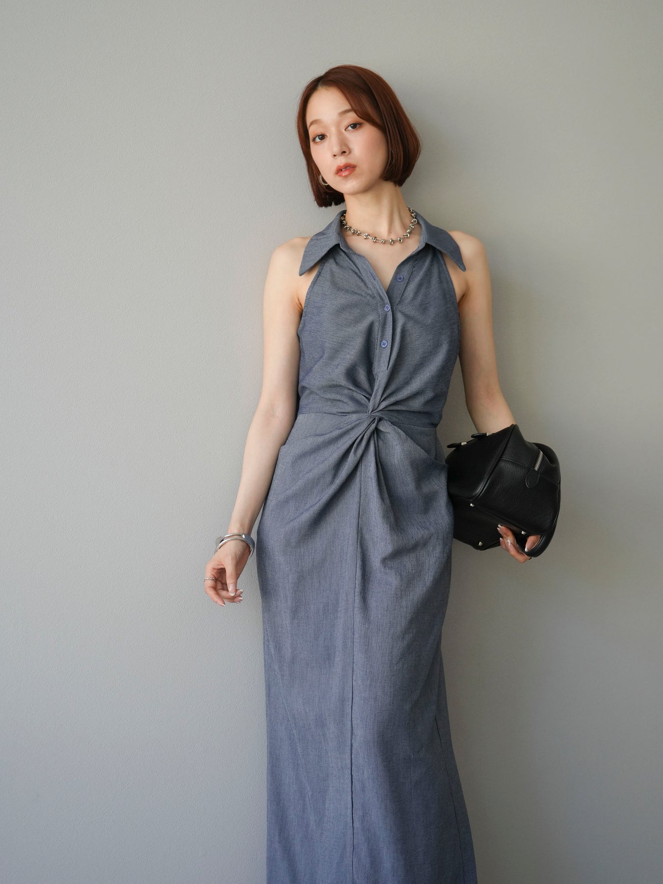シャツカラーとホルターデザインを掛け合わせた、洗練された印象のノースリーブワンピース。 フロントウエストのツイストディテールが、立体感のある美しいシルエットを演出し、スタイルアップも叶えます。 リネンライクな軽やかな素材感で、涼しげな着心地と品のある表情を両立。 デイリーからリゾートまで、幅広いシーンに映える一着です。 ※ボトムス、キャミソール(インナー)以外の商品は一律でインナーは付属していません