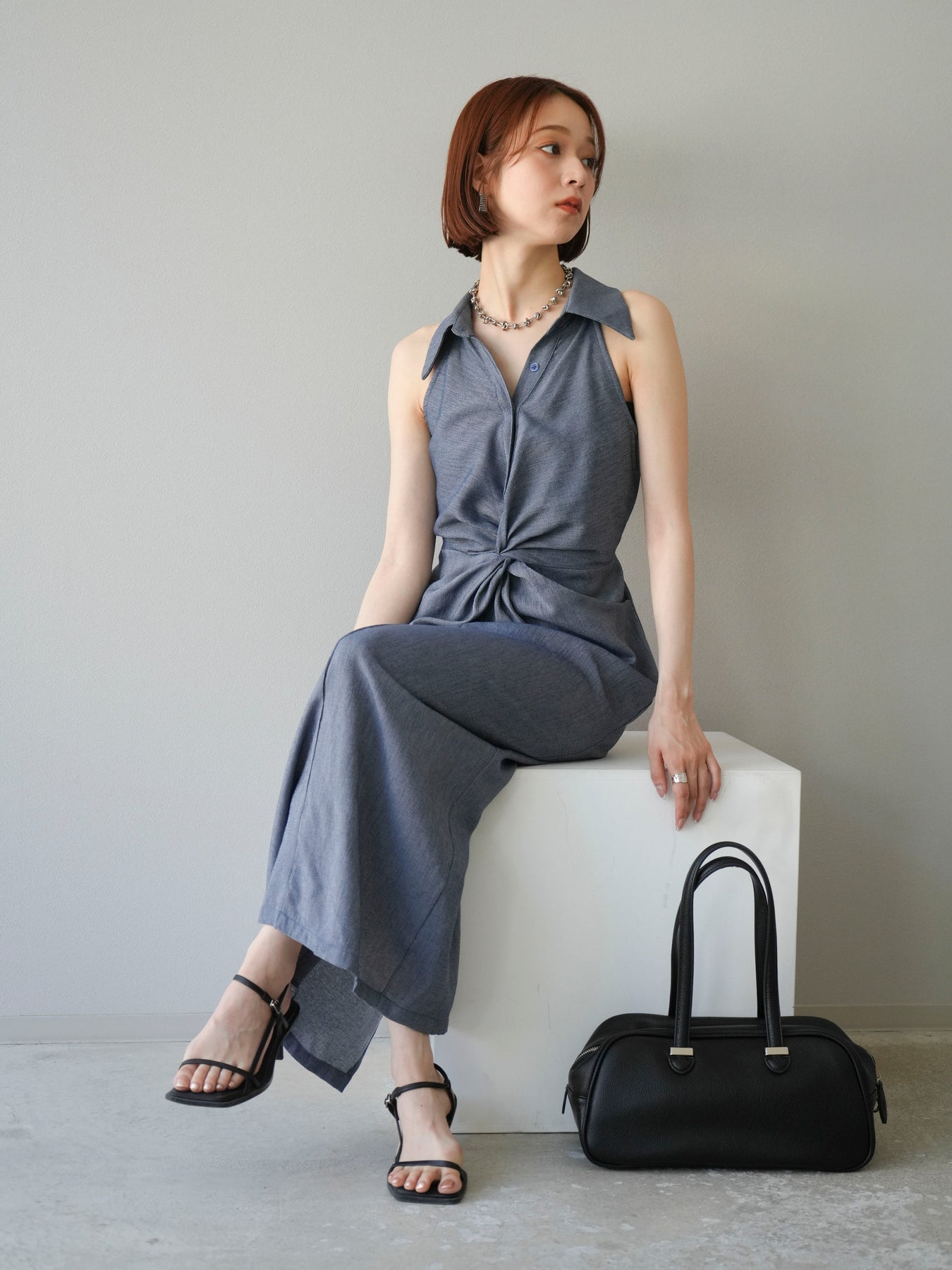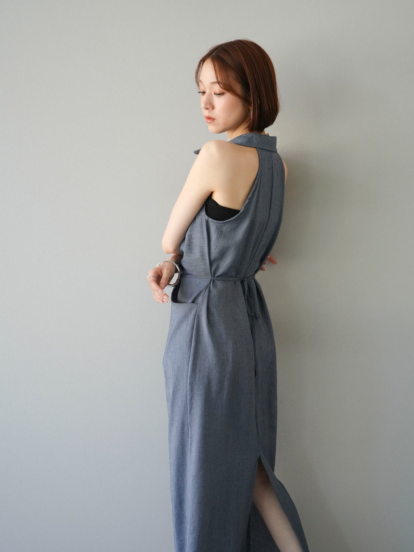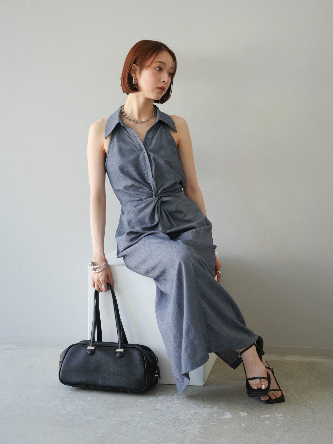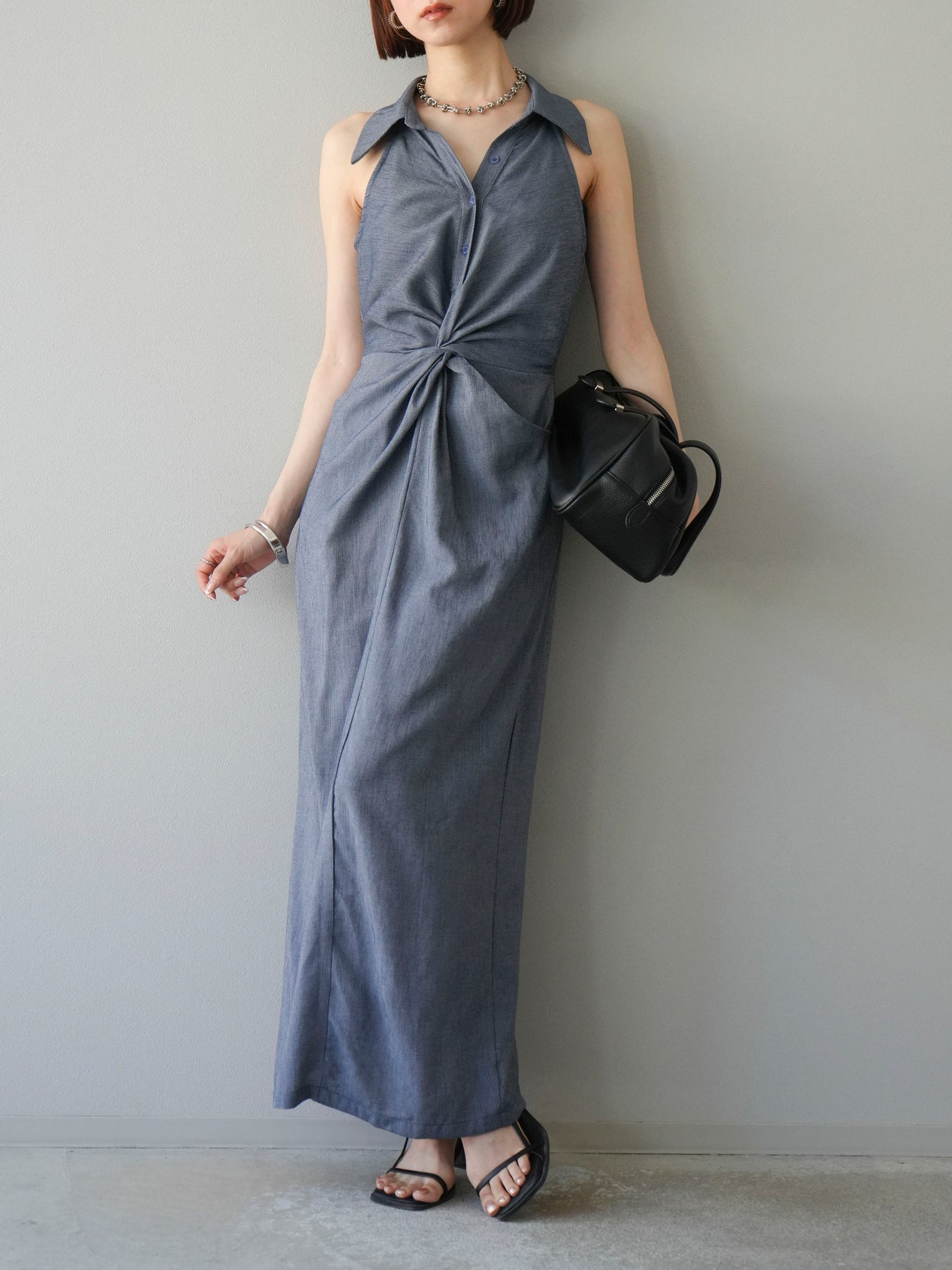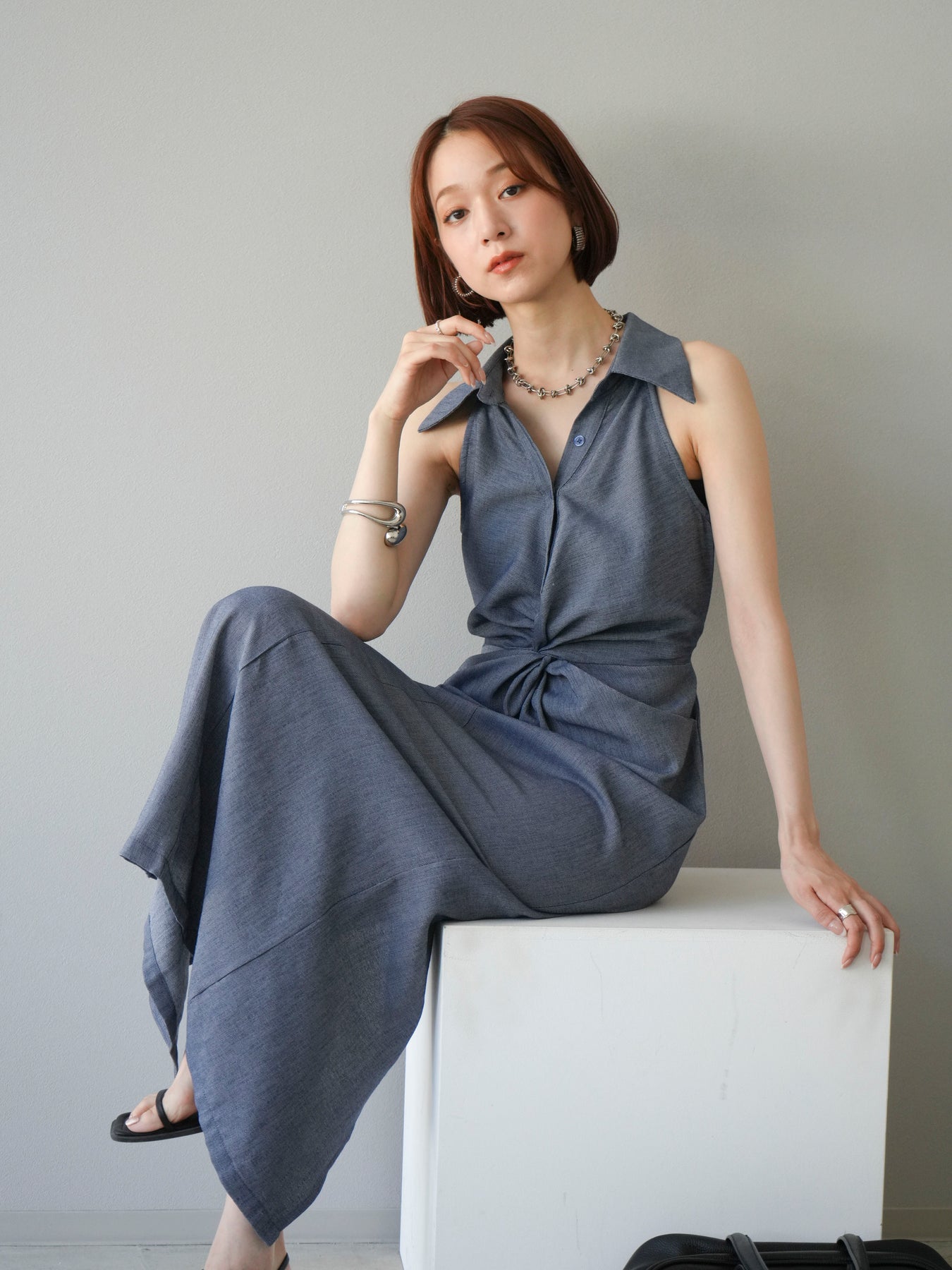 シャツカラーとホルターデザインを掛け合わせた、洗練された印象のノースリーブワンピース。 フロントウエストのツイストディテールが、立体感のある美しいシルエットを演出し、スタイルアップも叶えます。 リネンライクな軽やかな素材感で、涼しげな着心地と品のある表情を両立。 デイリーからリゾートまで、幅広いシーンに映える一着です。 ※ボトムス、キャミソール(インナー)以外の商品は一律でインナーは付属していません