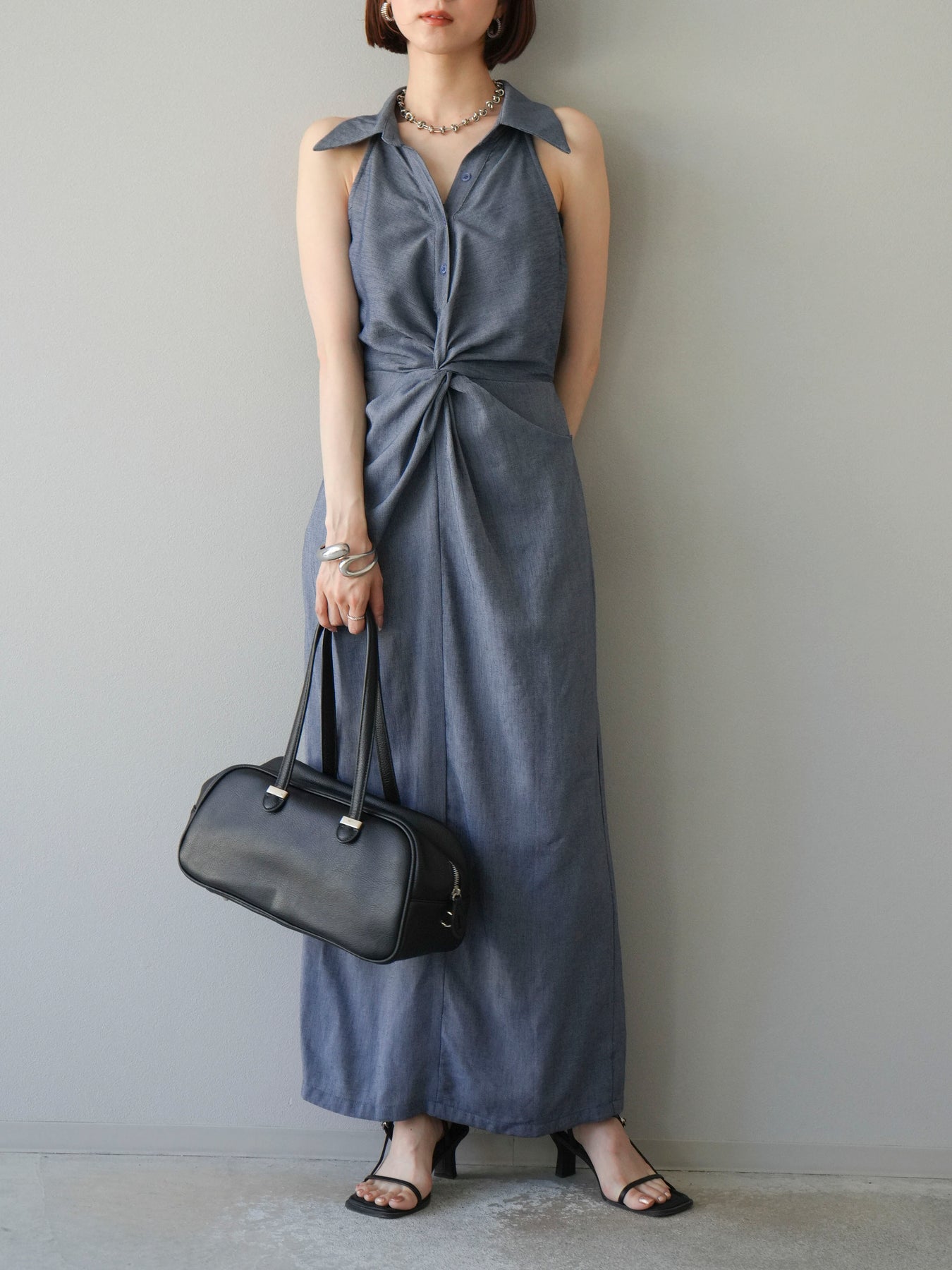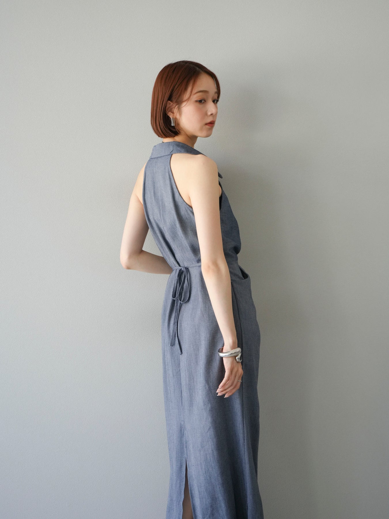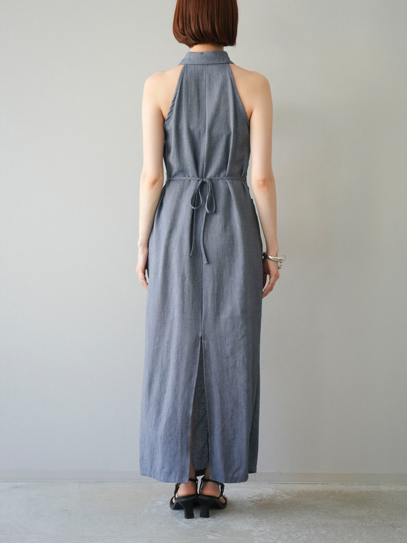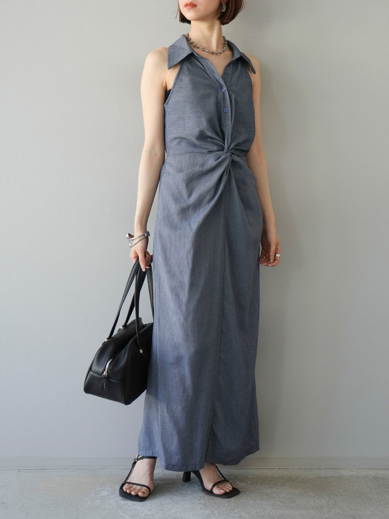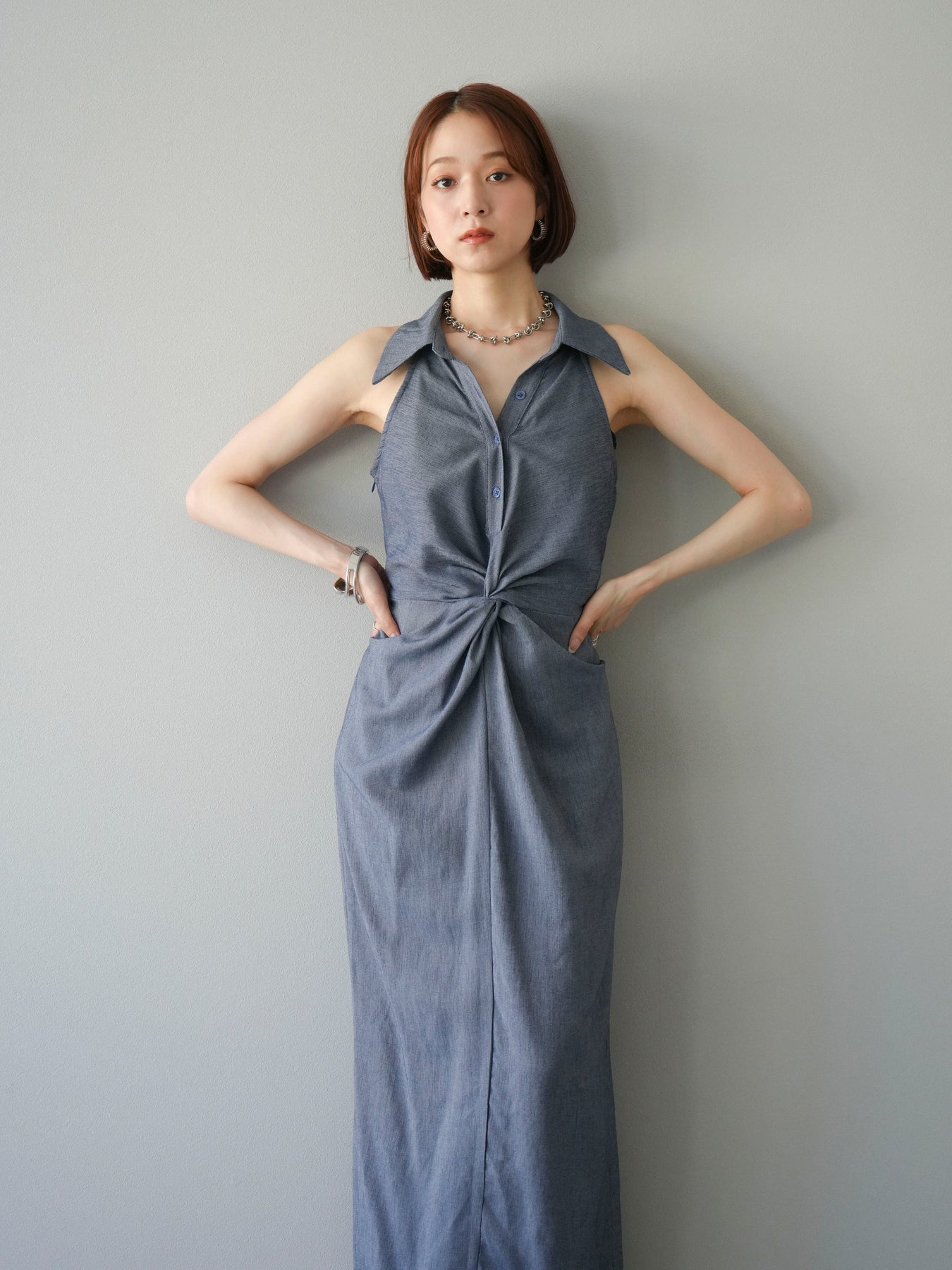 シャツカラーとホルターデザインを掛け合わせた、洗練された印象のノースリーブワンピース。 フロントウエストのツイストディテールが、立体感のある美しいシルエットを演出し、スタイルアップも叶えます。 リネンライクな軽やかな素材感で、涼しげな着心地と品のある表情を両立。 デイリーからリゾートまで、幅広いシーンに映える一着です。 ※ボトムス、キャミソール(インナー)以外の商品は一律でインナーは付属していません