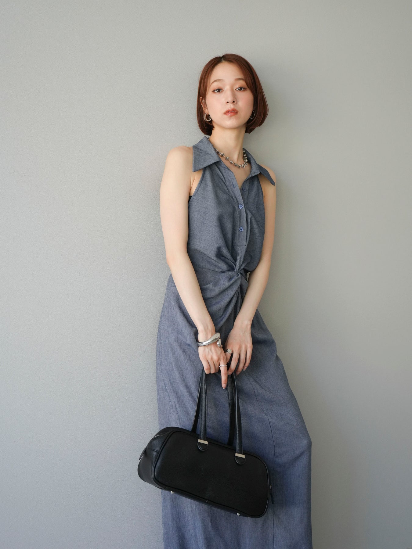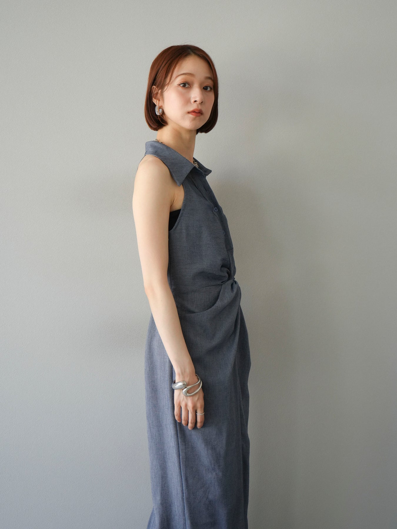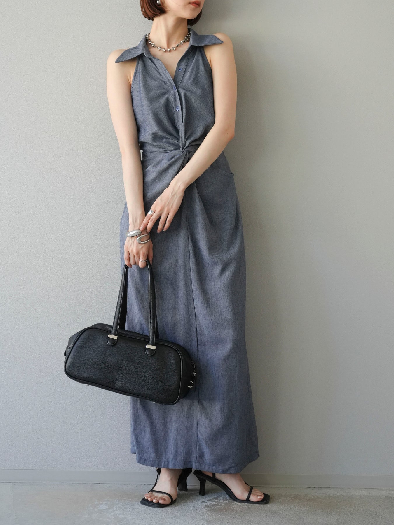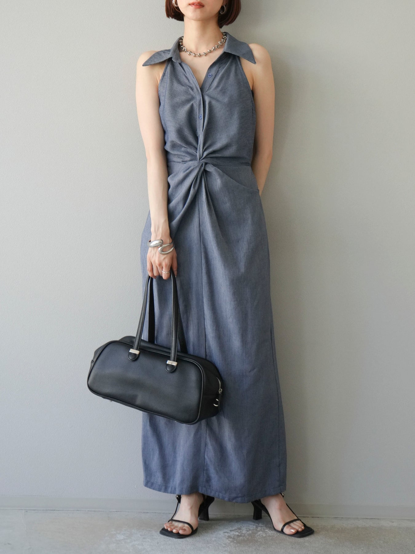 シャツカラーとホルターデザインを掛け合わせた、洗練された印象のノースリーブワンピース。 フロントウエストのツイストディテールが、立体感のある美しいシルエットを演出し、スタイルアップも叶えます。 リネンライクな軽やかな素材感で、涼しげな着心地と品のある表情を両立。 デイリーからリゾートまで、幅広いシーンに映える一着です。 ※ボトムス、キャミソール(インナー)以外の商品は一律でインナーは付属していません