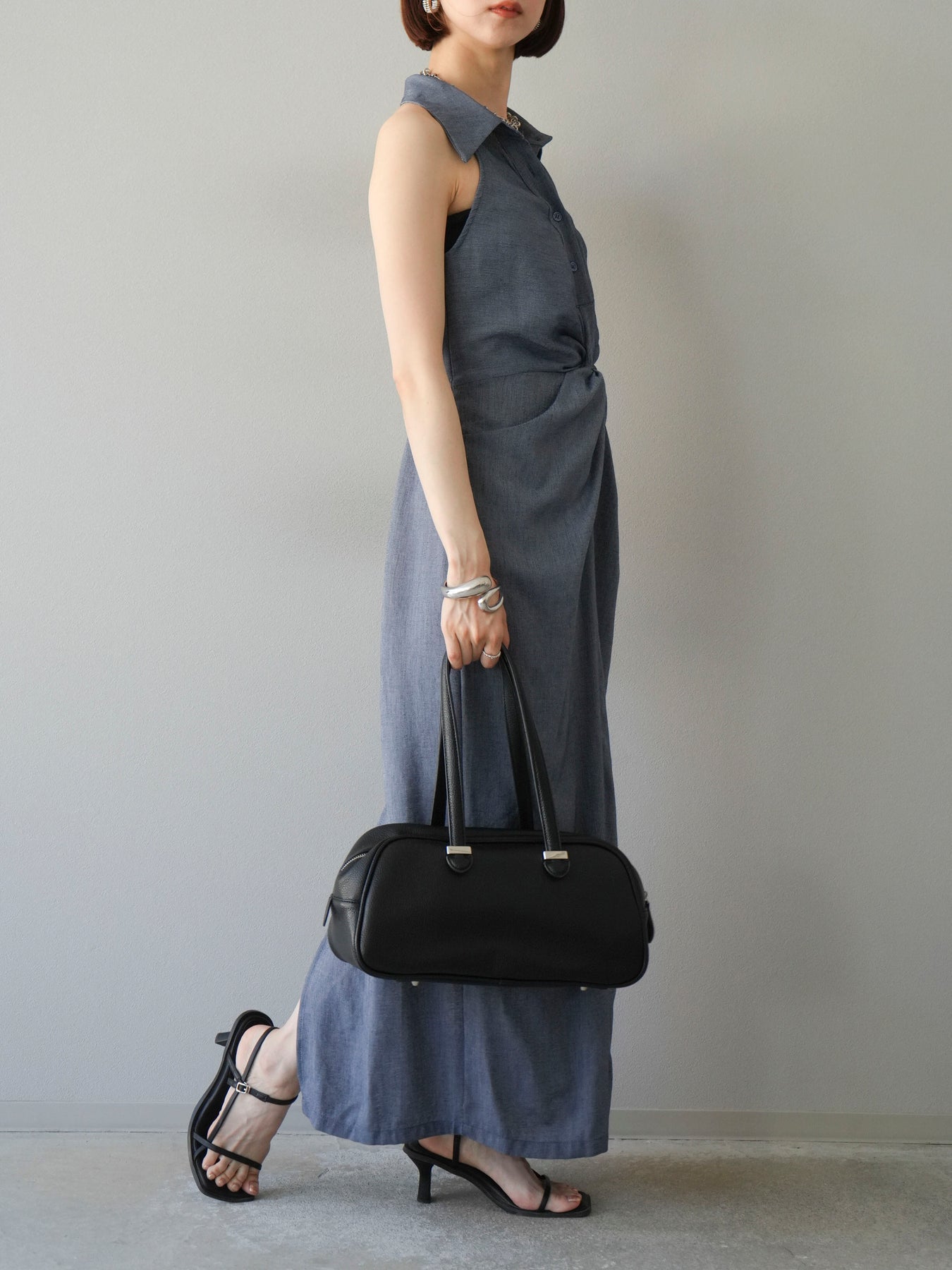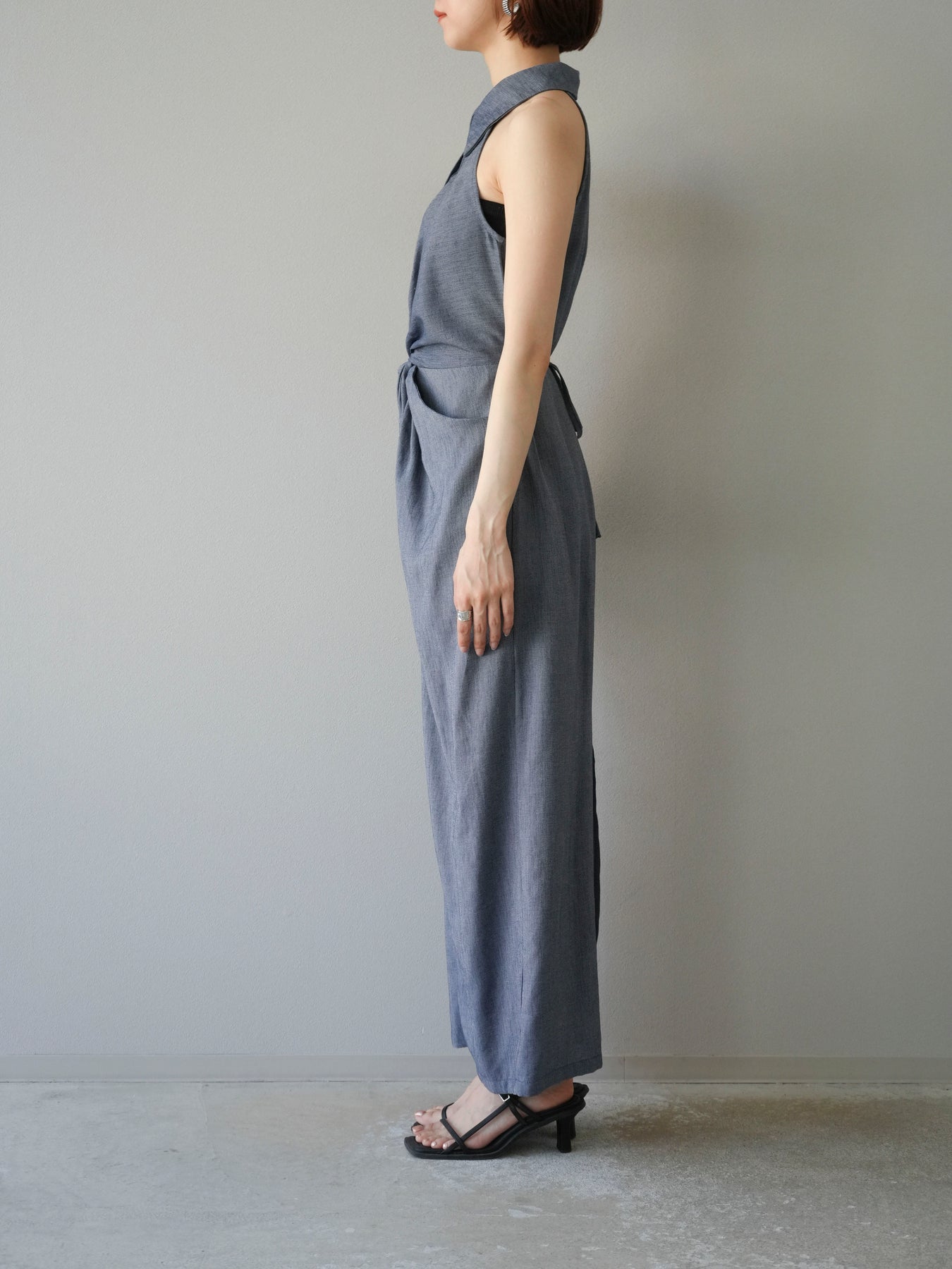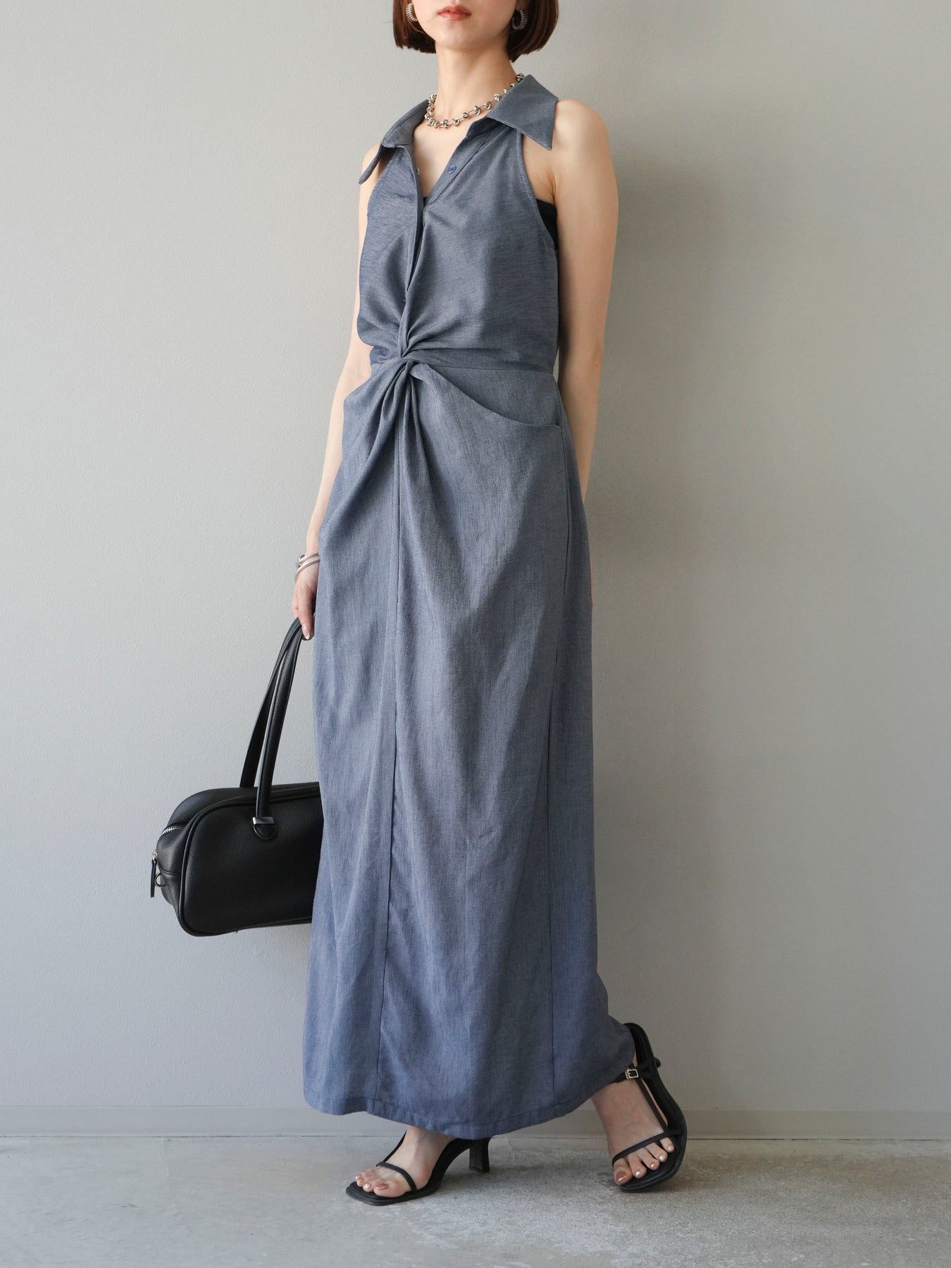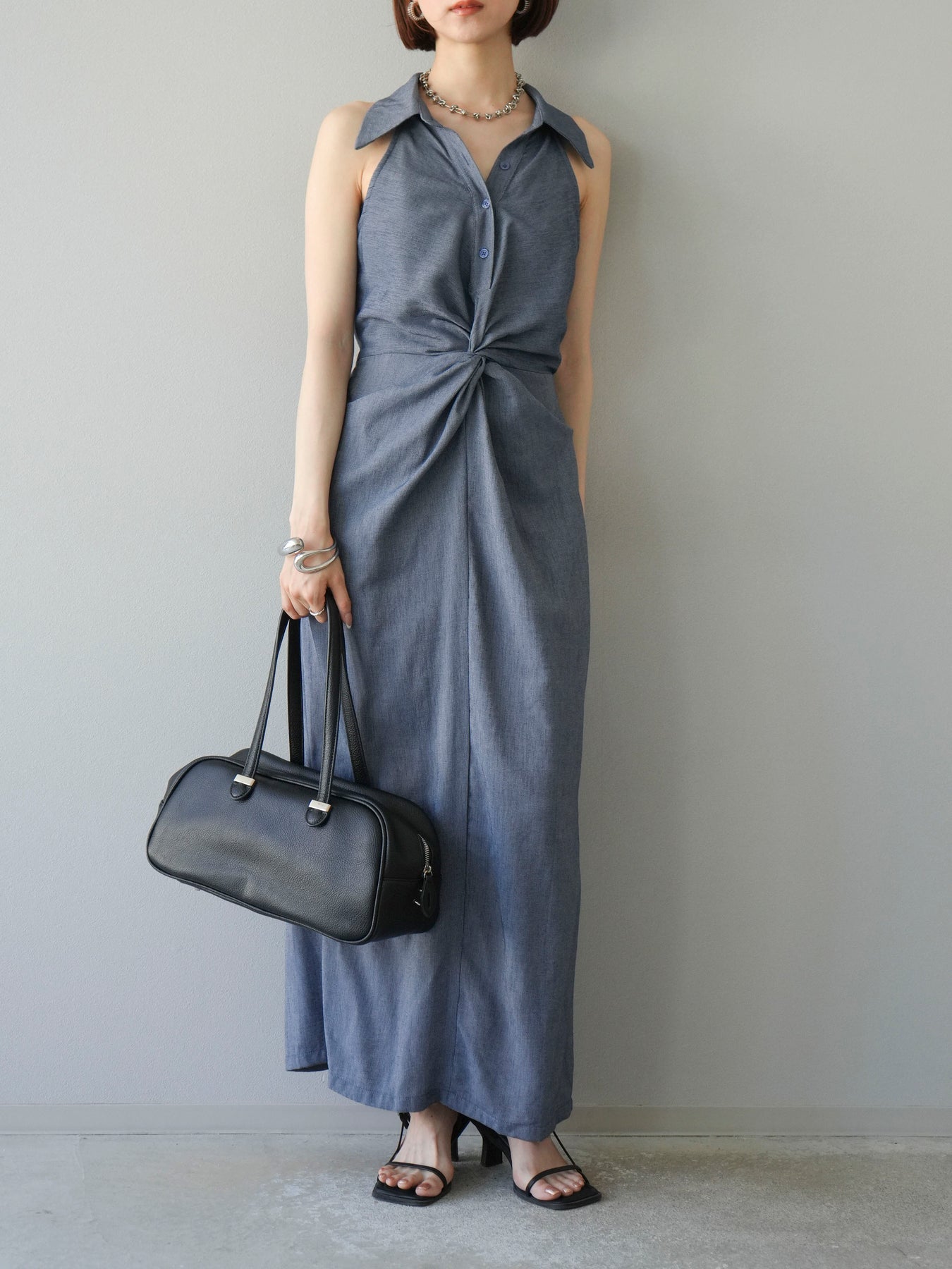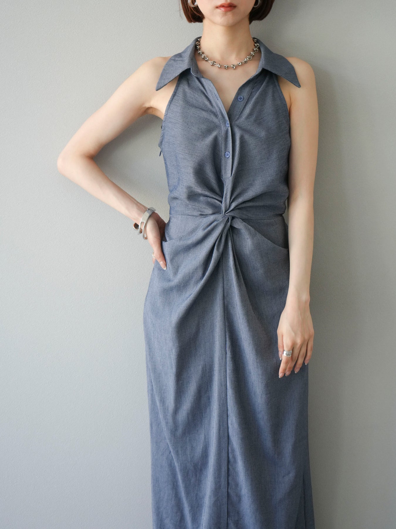 シャツカラーとホルターデザインを掛け合わせた、洗練された印象のノースリーブワンピース。 フロントウエストのツイストディテールが、立体感のある美しいシルエットを演出し、スタイルアップも叶えます。 リネンライクな軽やかな素材感で、涼しげな着心地と品のある表情を両立。 デイリーからリゾートまで、幅広いシーンに映える一着です。 ※ボトムス、キャミソール(インナー)以外の商品は一律でインナーは付属していません