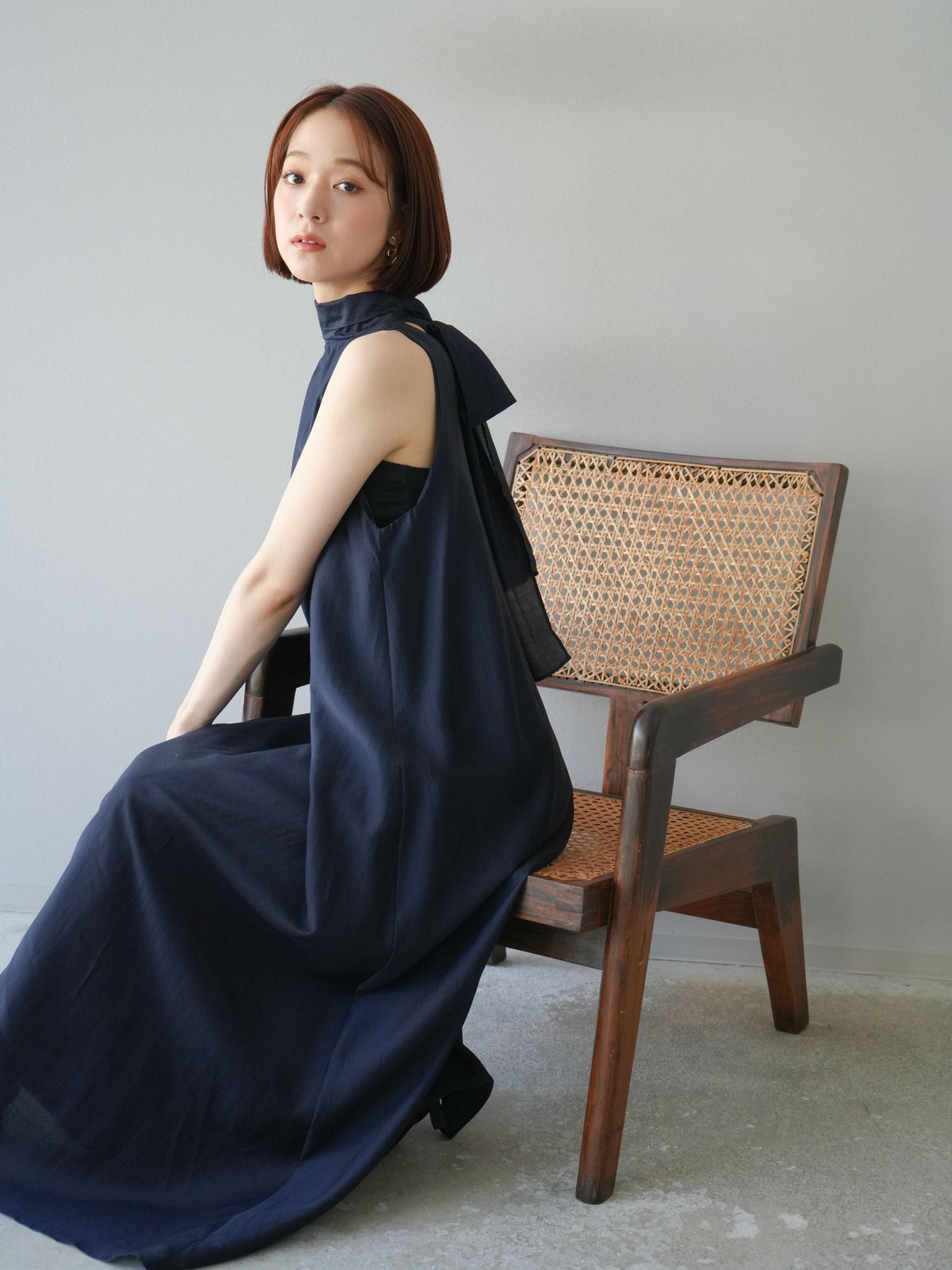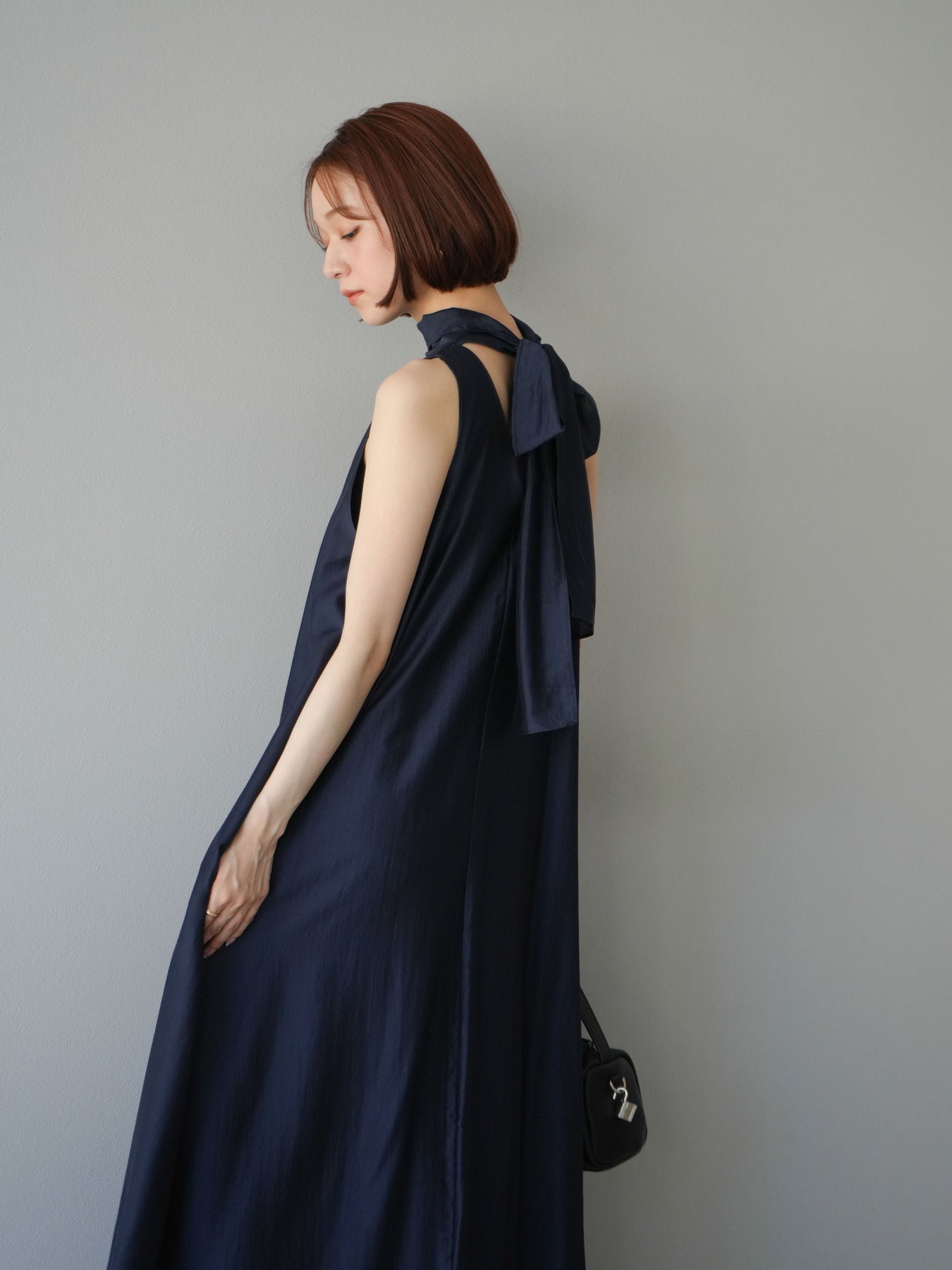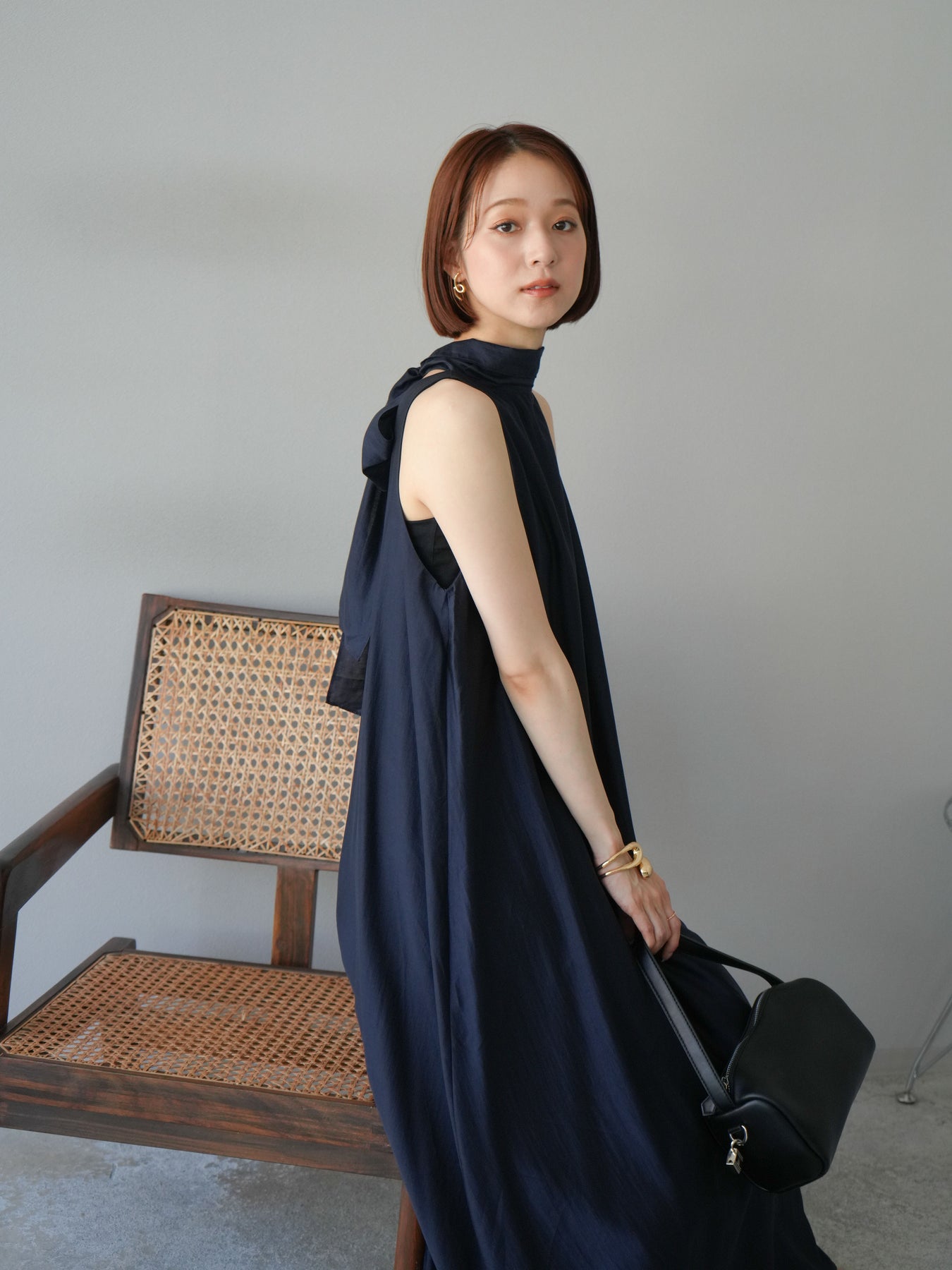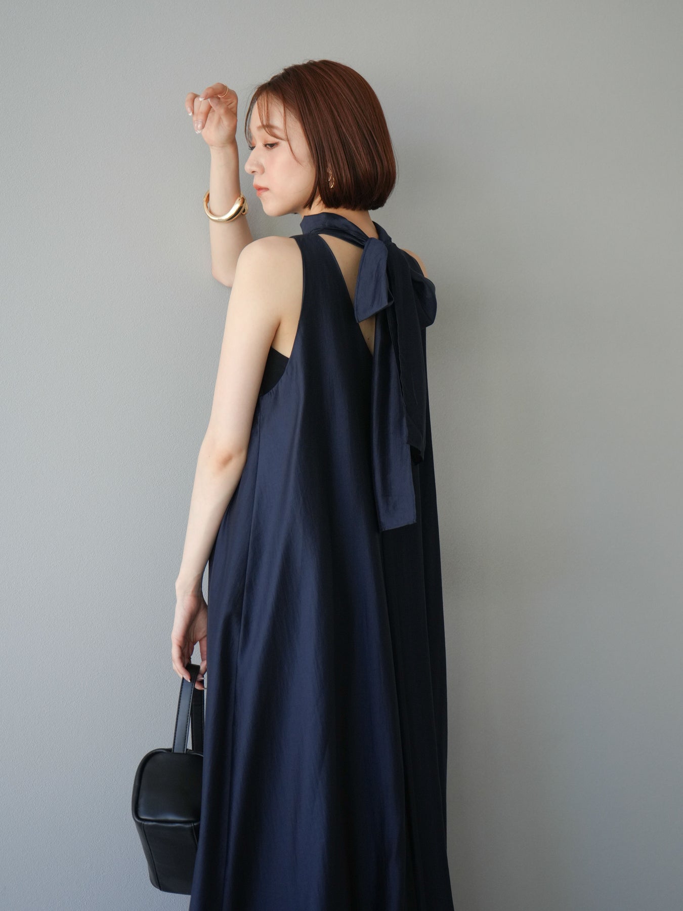 程よい光沢と落ち感のある素材を使用した、上品な印象のホルターワンピース。 首元はスタンド風のデザインで、バックに向かってリボンを結ぶ仕様になっており、後ろ姿まで印象的に演出します。 歩くたびにふわりと揺れるシルエットが、夏の装いに軽やかさをプラス。 インナーとのレイヤードを楽しめる、広めに開いたバックオープンデザインもポイントです。 一枚でスタイリングが決まる、夏の主役ワンピースです。 ※ボトムス、キャミソール(インナー)以外の商品は一律でインナーは付属していません。