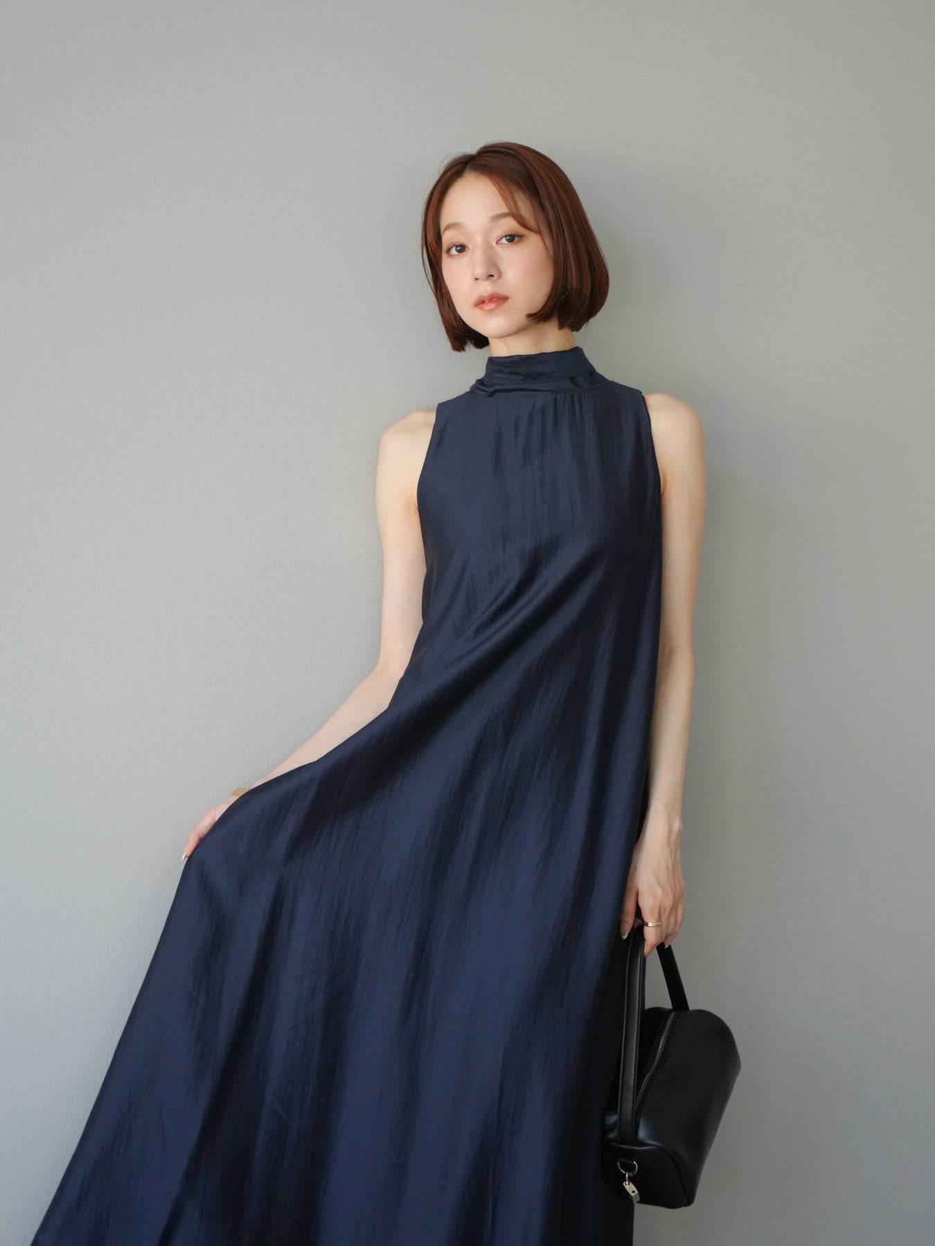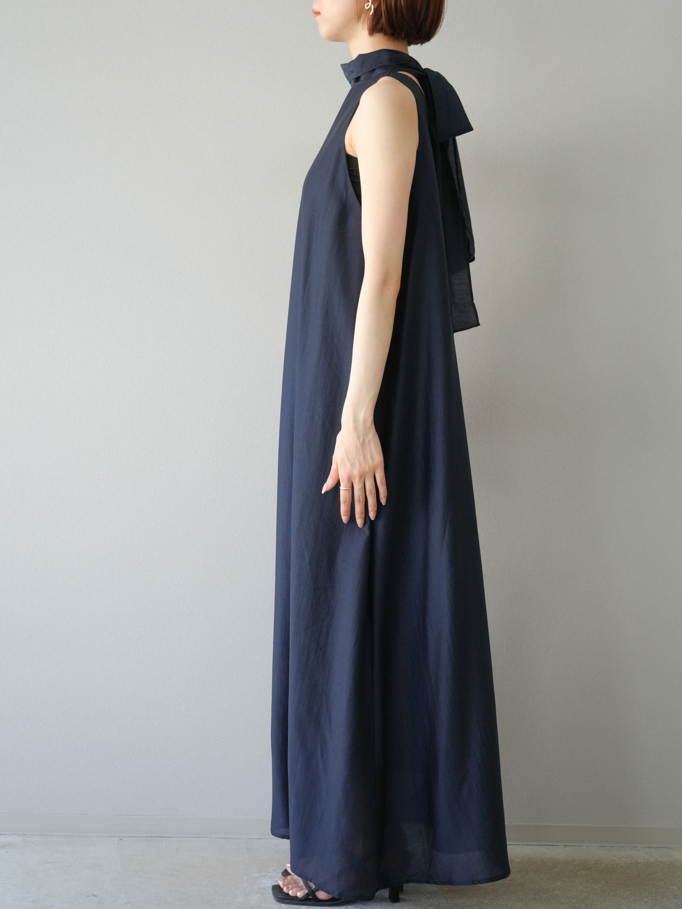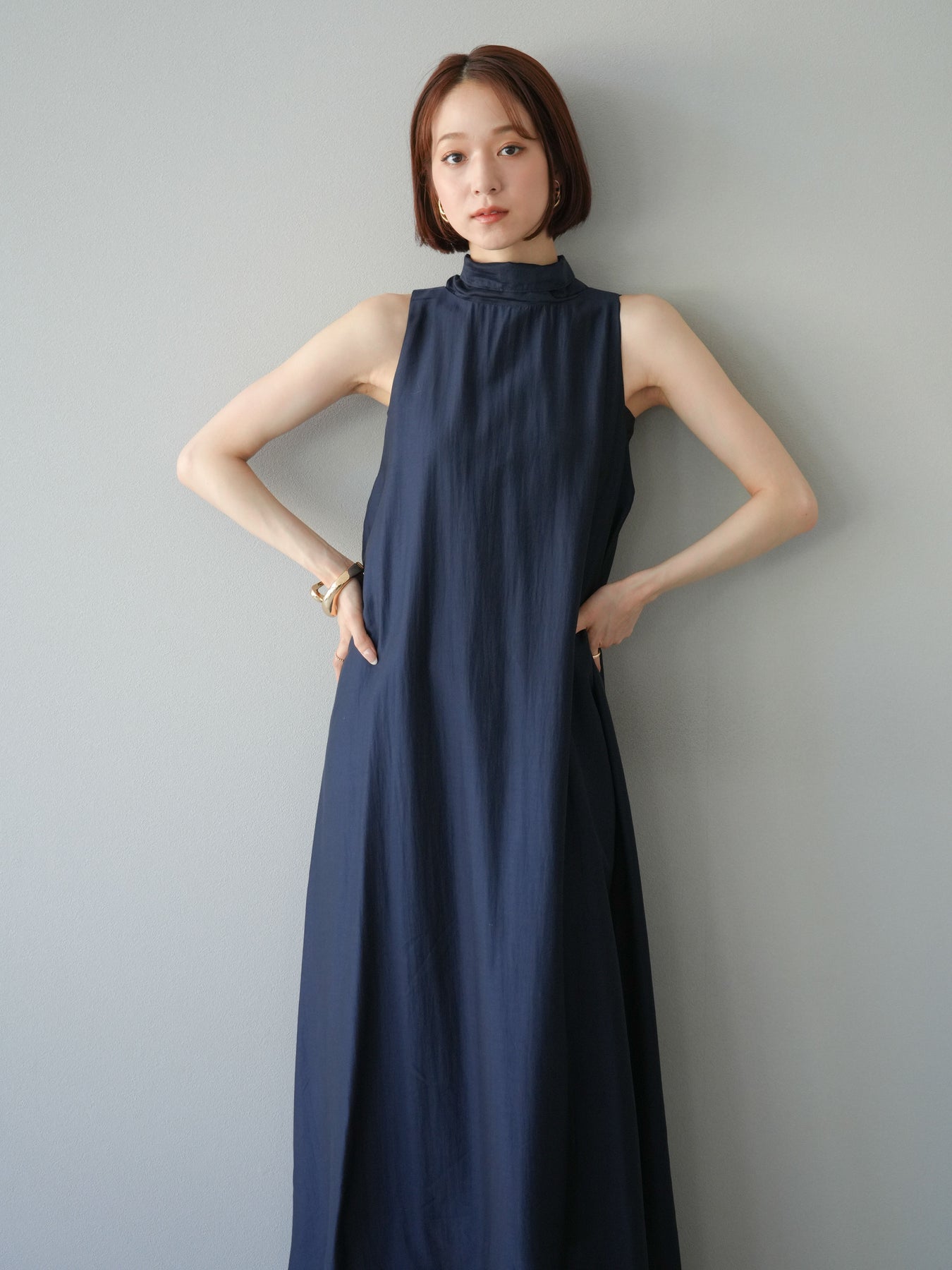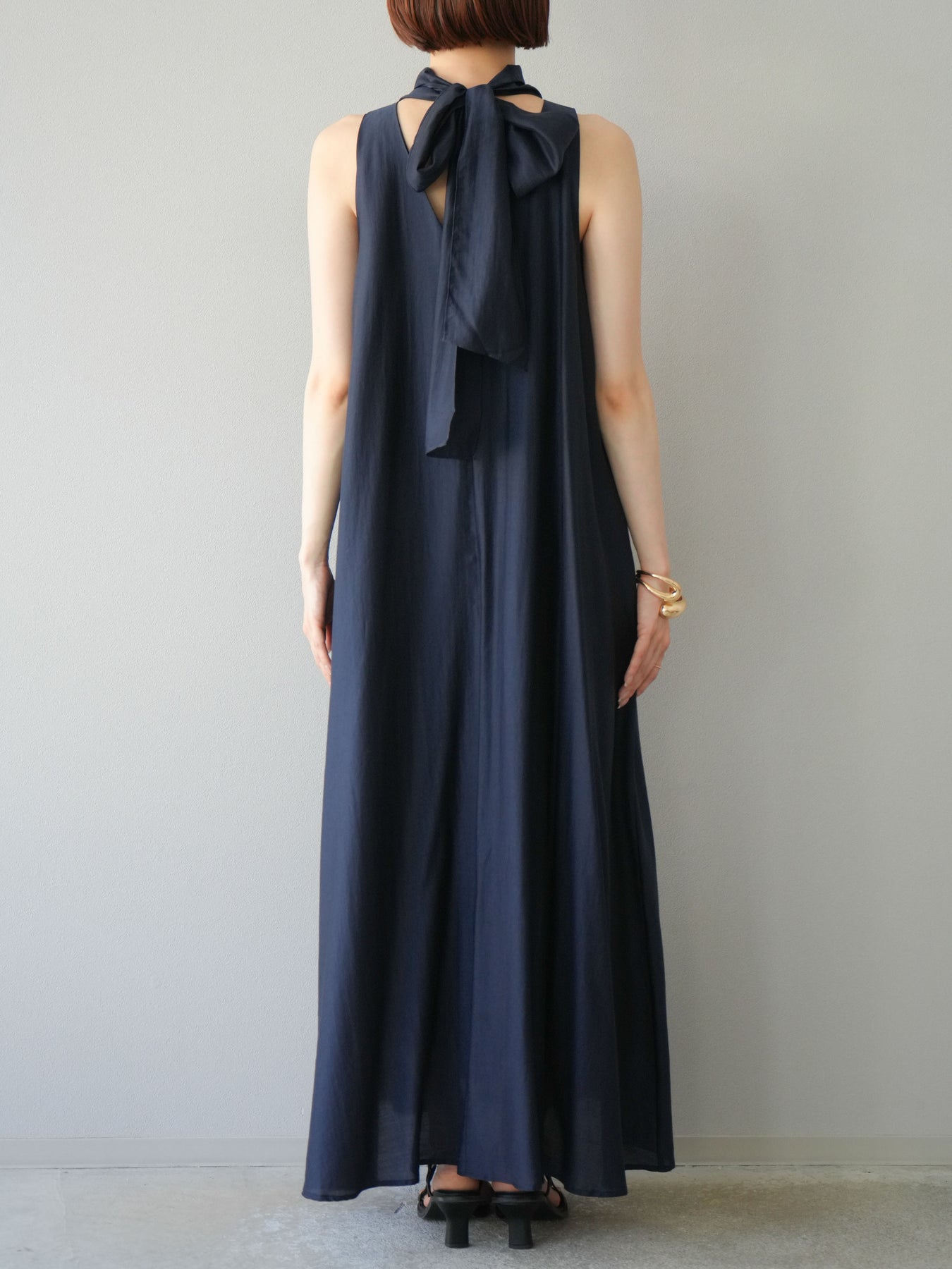 程よい光沢と落ち感のある素材を使用した、上品な印象のホルターワンピース。 首元はスタンド風のデザインで、バックに向かってリボンを結ぶ仕様になっており、後ろ姿まで印象的に演出します。 歩くたびにふわりと揺れるシルエットが、夏の装いに軽やかさをプラス。 インナーとのレイヤードを楽しめる、広めに開いたバックオープンデザインもポイントです。 一枚でスタイリングが決まる、夏の主役ワンピースです。 ※ボトムス、キャミソール(インナー)以外の商品は一律でインナーは付属していません。
