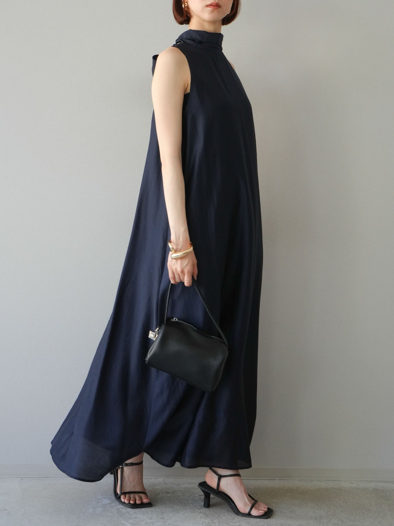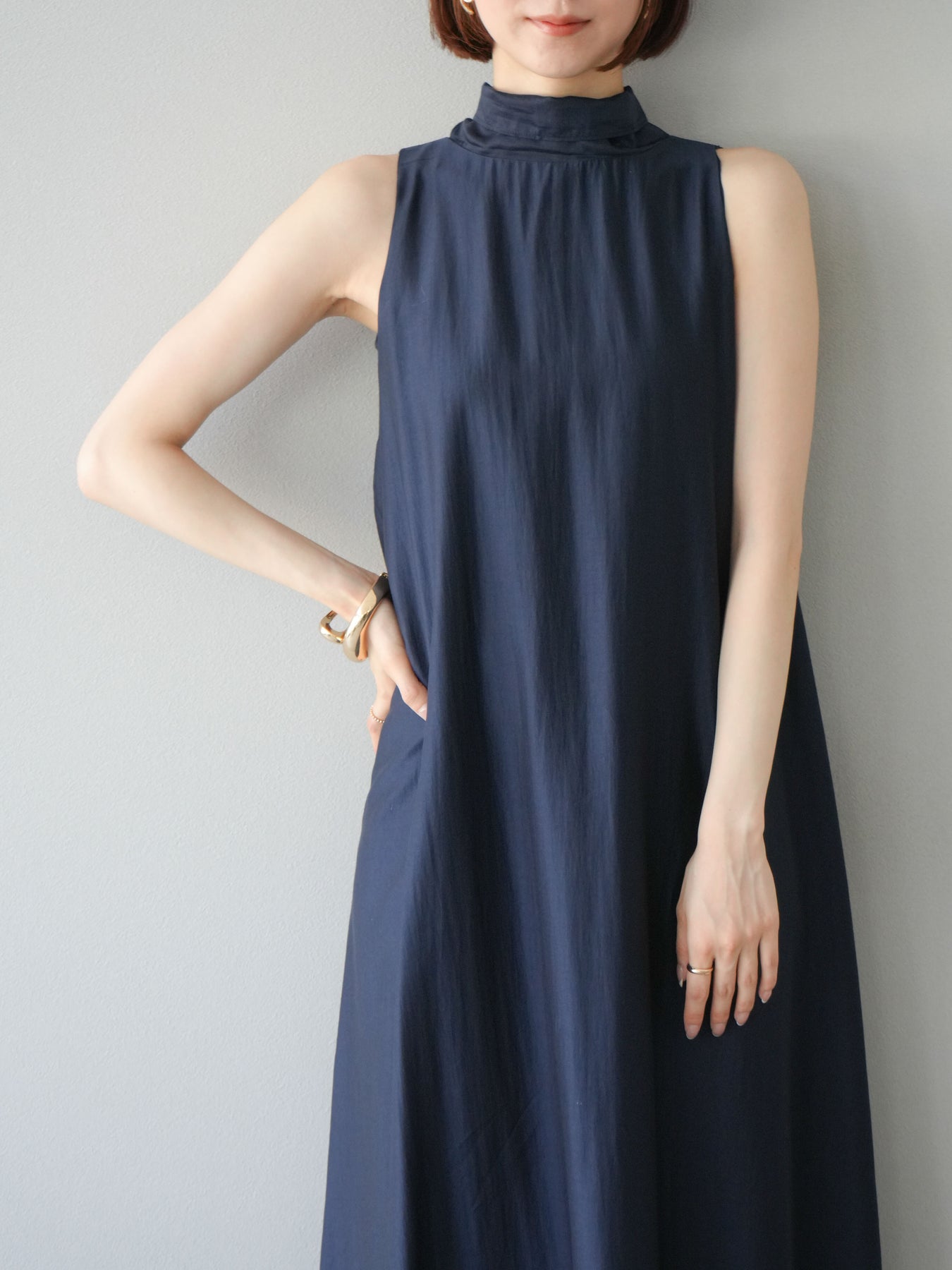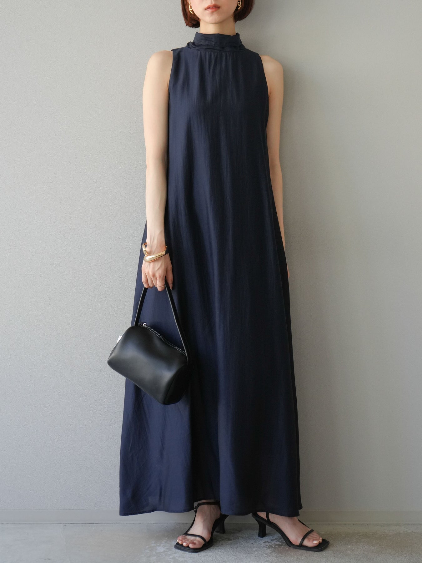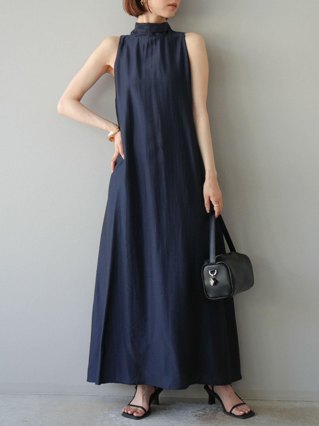 程よい光沢と落ち感のある素材を使用した、上品な印象のホルターワンピース。 首元はスタンド風のデザインで、バックに向かってリボンを結ぶ仕様になっており、後ろ姿まで印象的に演出します。 歩くたびにふわりと揺れるシルエットが、夏の装いに軽やかさをプラス。 インナーとのレイヤードを楽しめる、広めに開いたバックオープンデザインもポイントです。 一枚でスタイリングが決まる、夏の主役ワンピースです。 ※ボトムス、キャミソール(インナー)以外の商品は一律でインナーは付属していません。