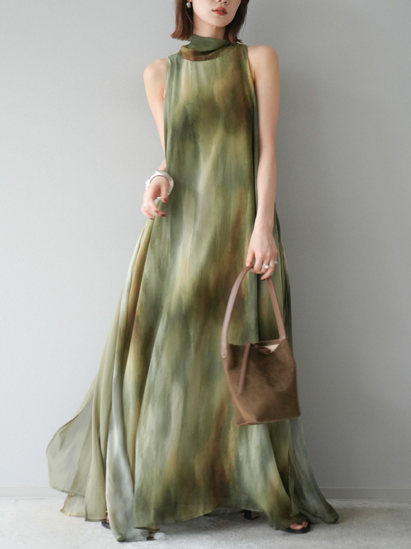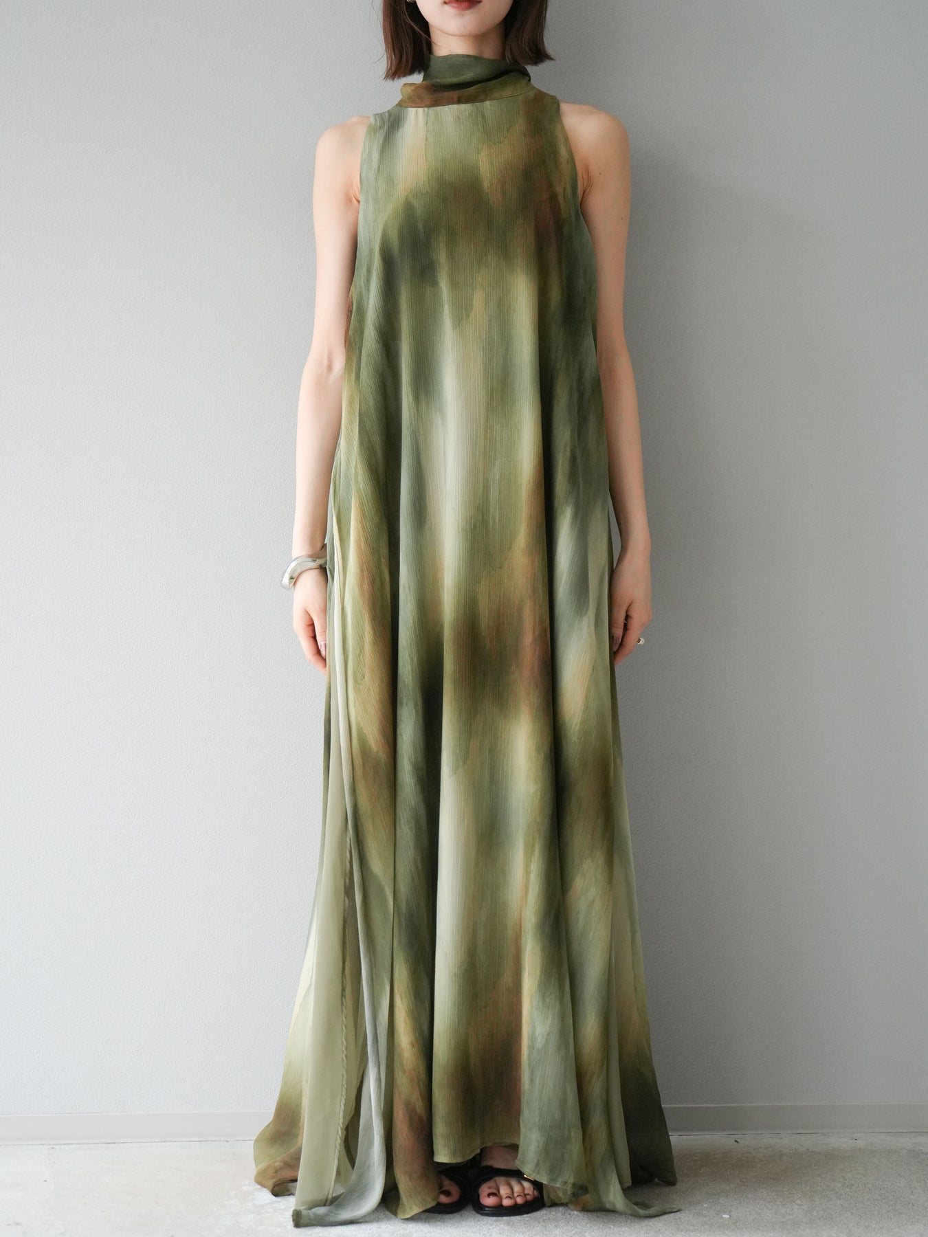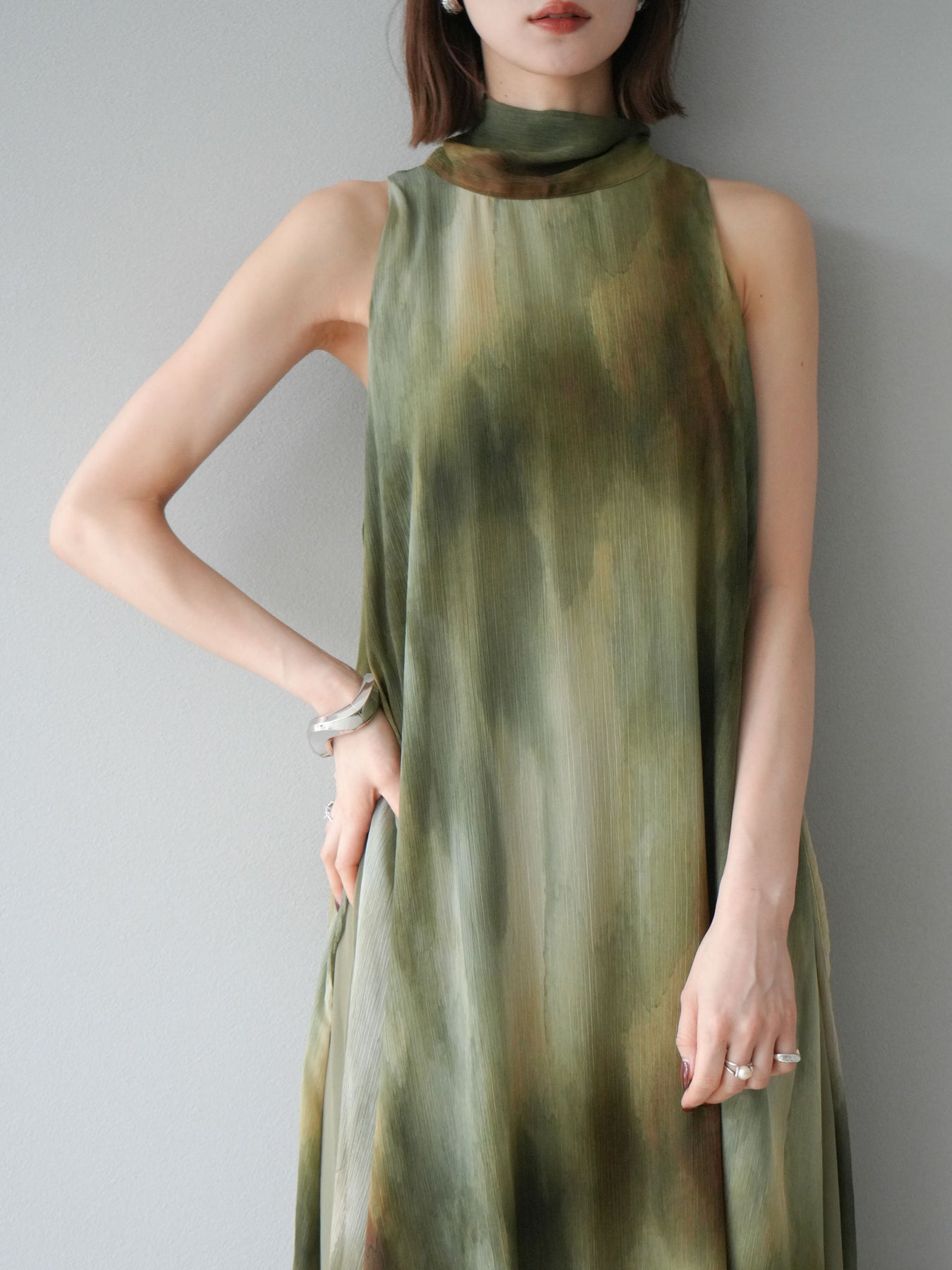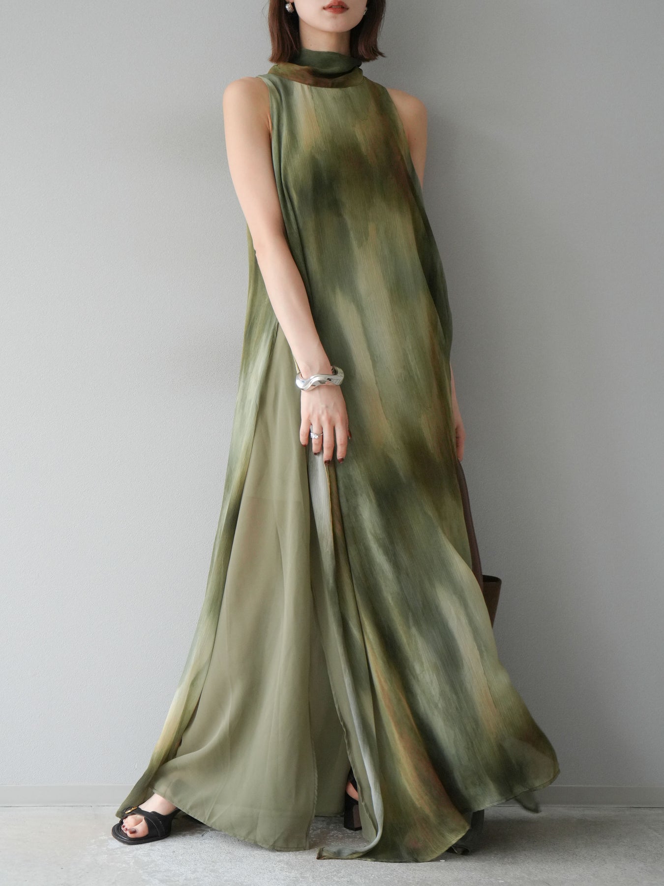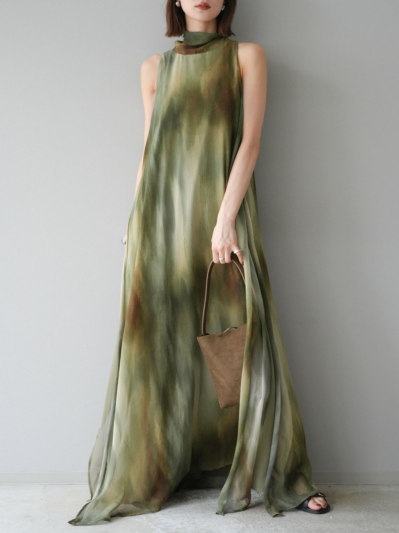 水彩画のようなニュアンスプリントが印象的な、1枚で存在感のあるワンピース。 軽やかなシアー素材を贅沢に使用し、動くたびにふわりと揺れるエアリーなシルエットが魅力。 首元は上品なハイネックデザインで、バックには抜け感を演出するスリット入り。 レイヤードデザインにより奥行きのある表情を楽しめ、リゾートからフォーマルシーンまで幅広く活躍します。 インナー次第で印象を変えられる、着回し力の高い一着です。 ※ボトムス、キャミソール(インナー)以外の商品は一律でインナーは付属していません。