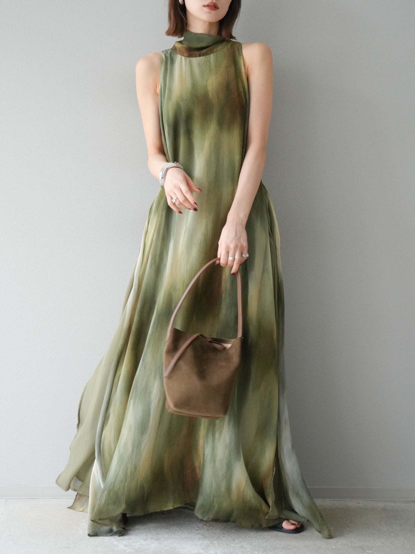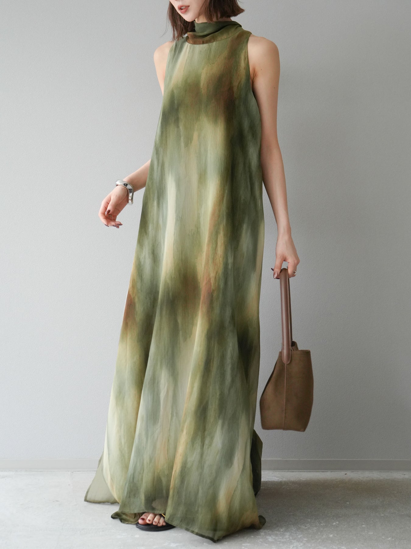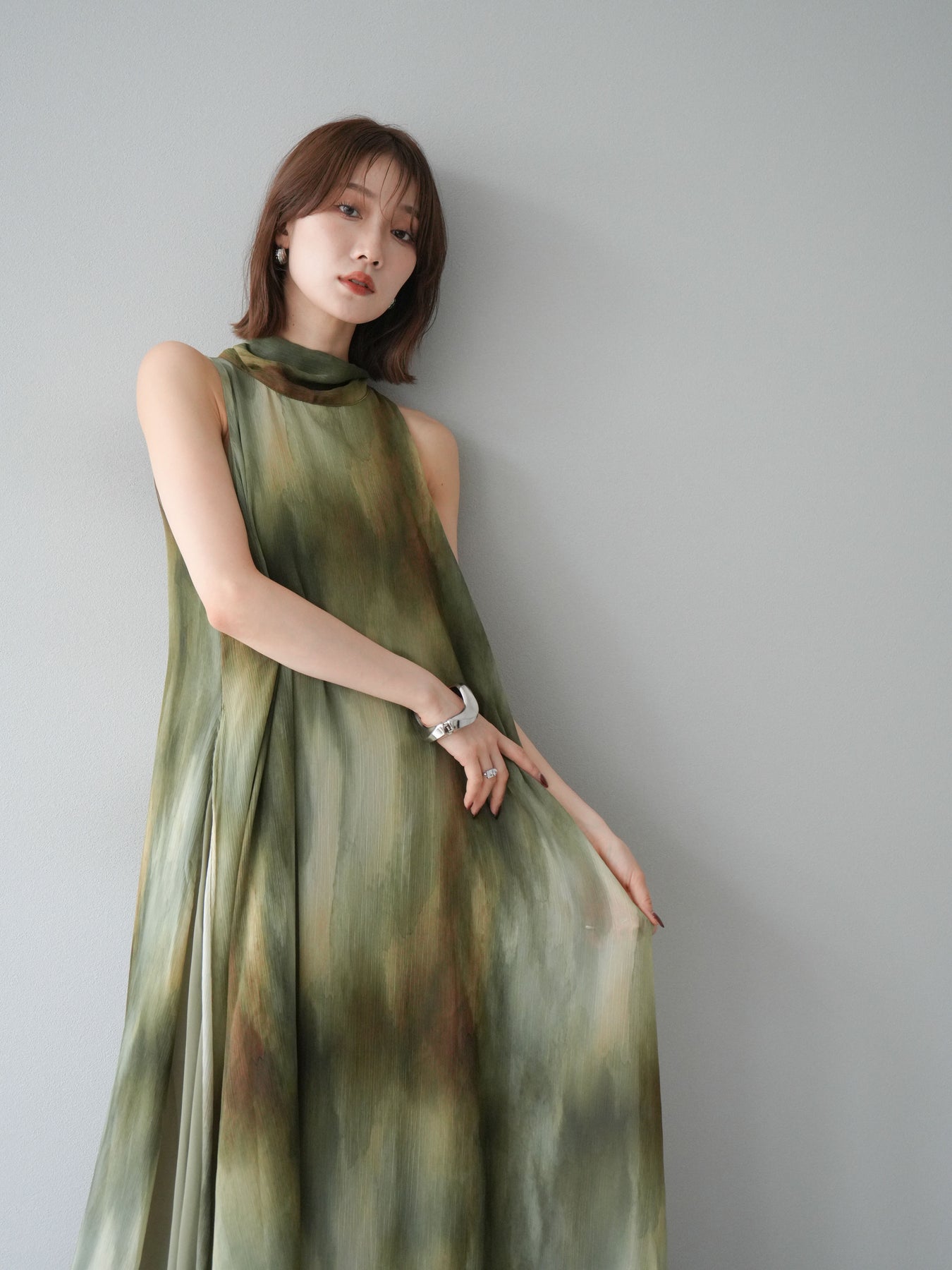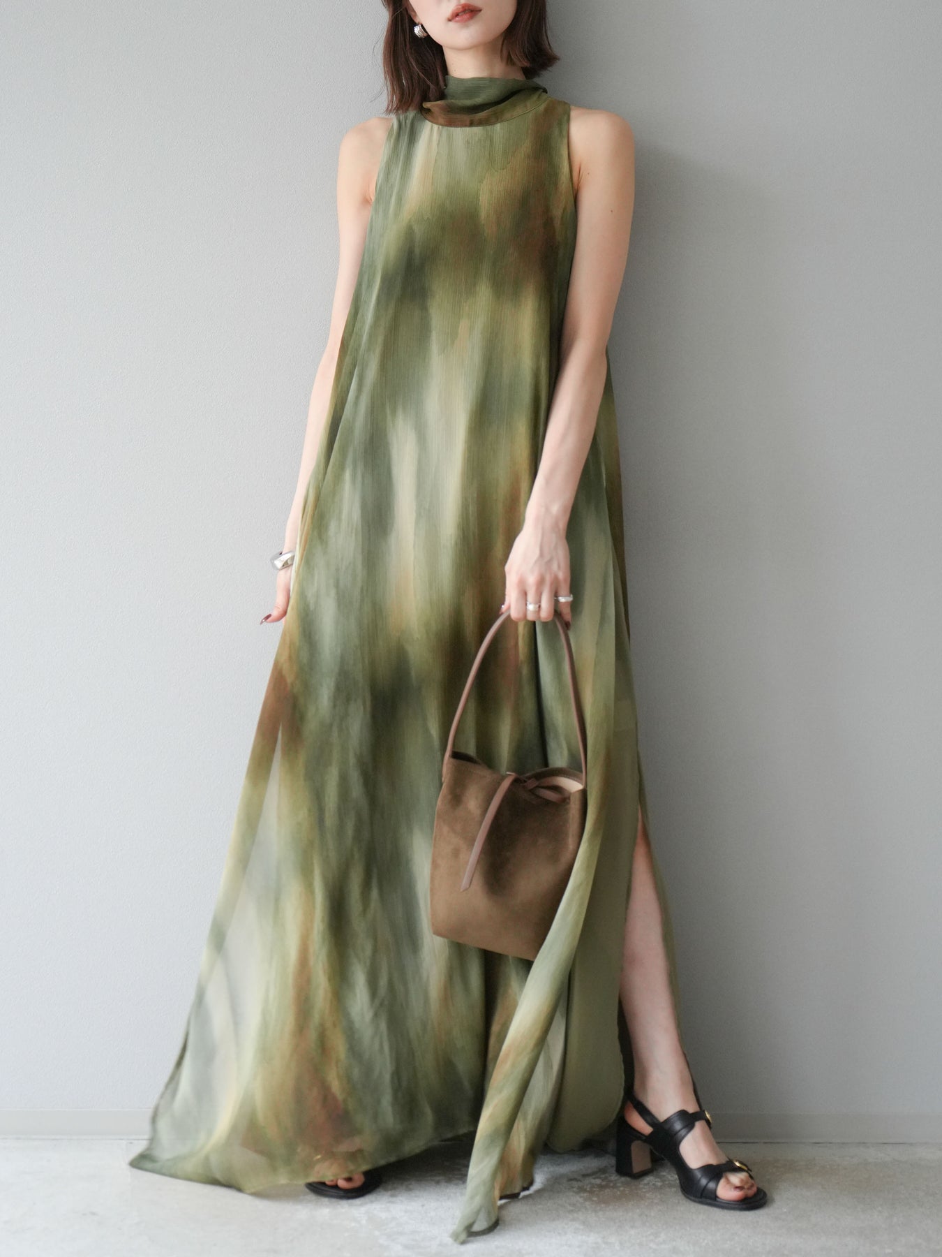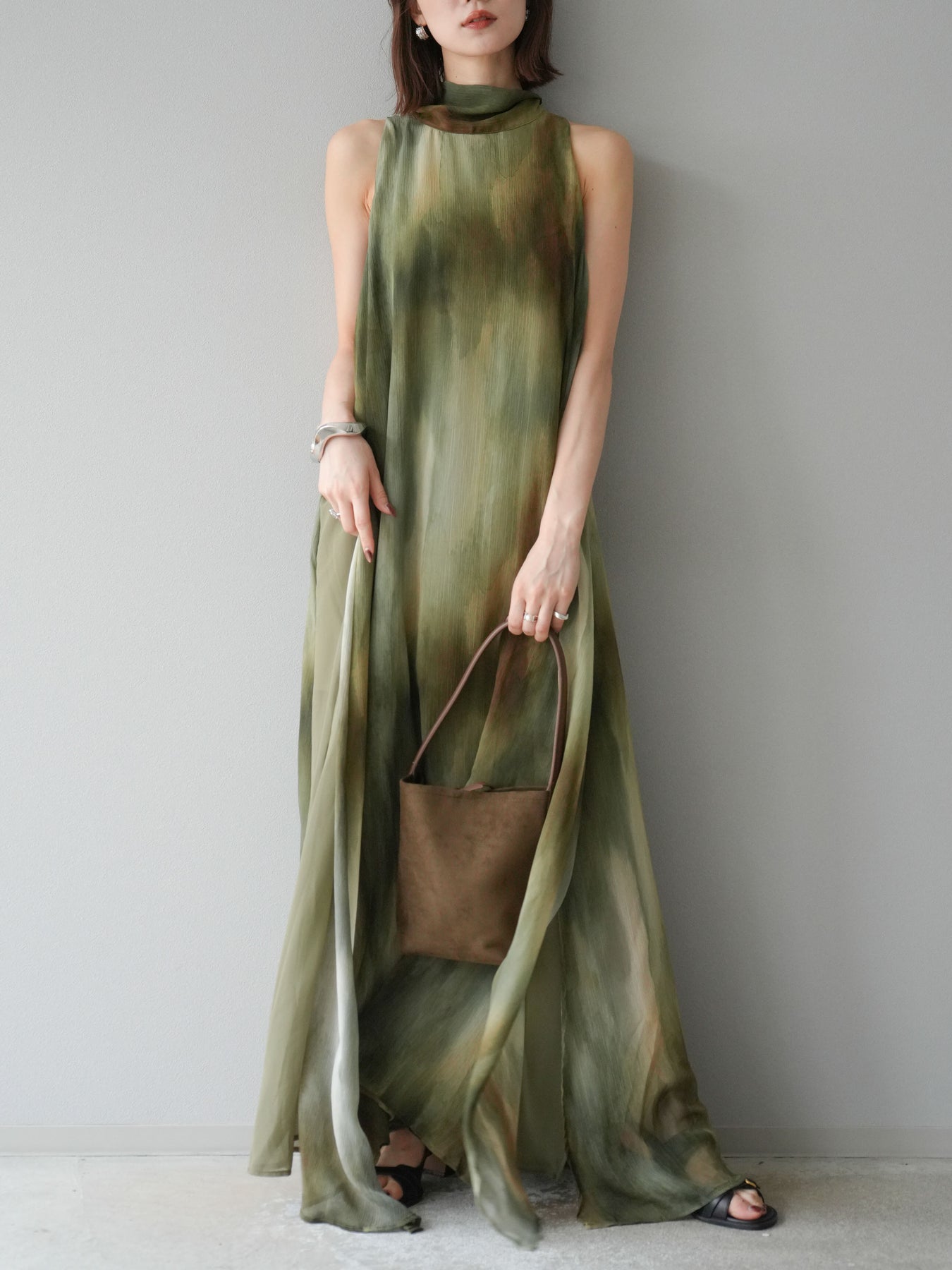 水彩画のようなニュアンスプリントが印象的な、1枚で存在感のあるワンピース。 軽やかなシアー素材を贅沢に使用し、動くたびにふわりと揺れるエアリーなシルエットが魅力。 首元は上品なハイネックデザインで、バックには抜け感を演出するスリット入り。 レイヤードデザインにより奥行きのある表情を楽しめ、リゾートからフォーマルシーンまで幅広く活躍します。 インナー次第で印象を変えられる、着回し力の高い一着です。 ※ボトムス、キャミソール(インナー)以外の商品は一律でインナーは付属していません。