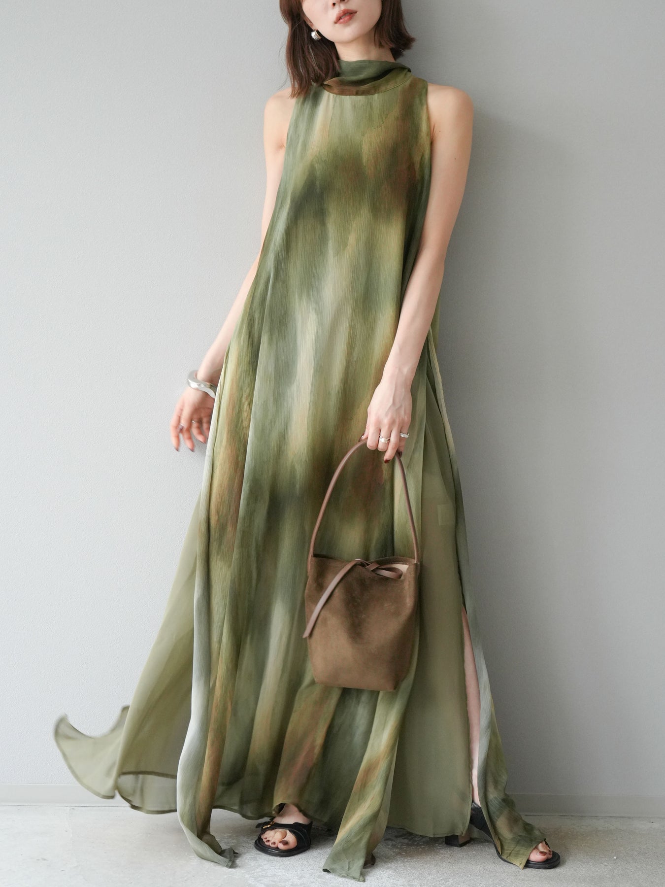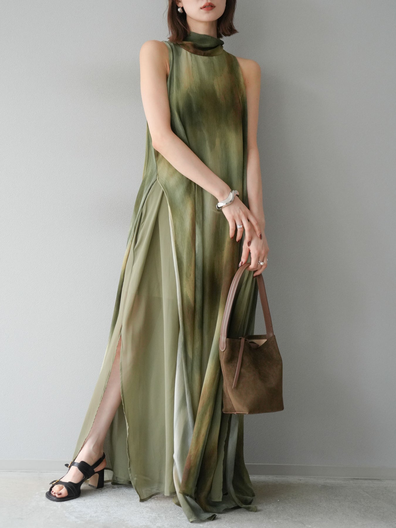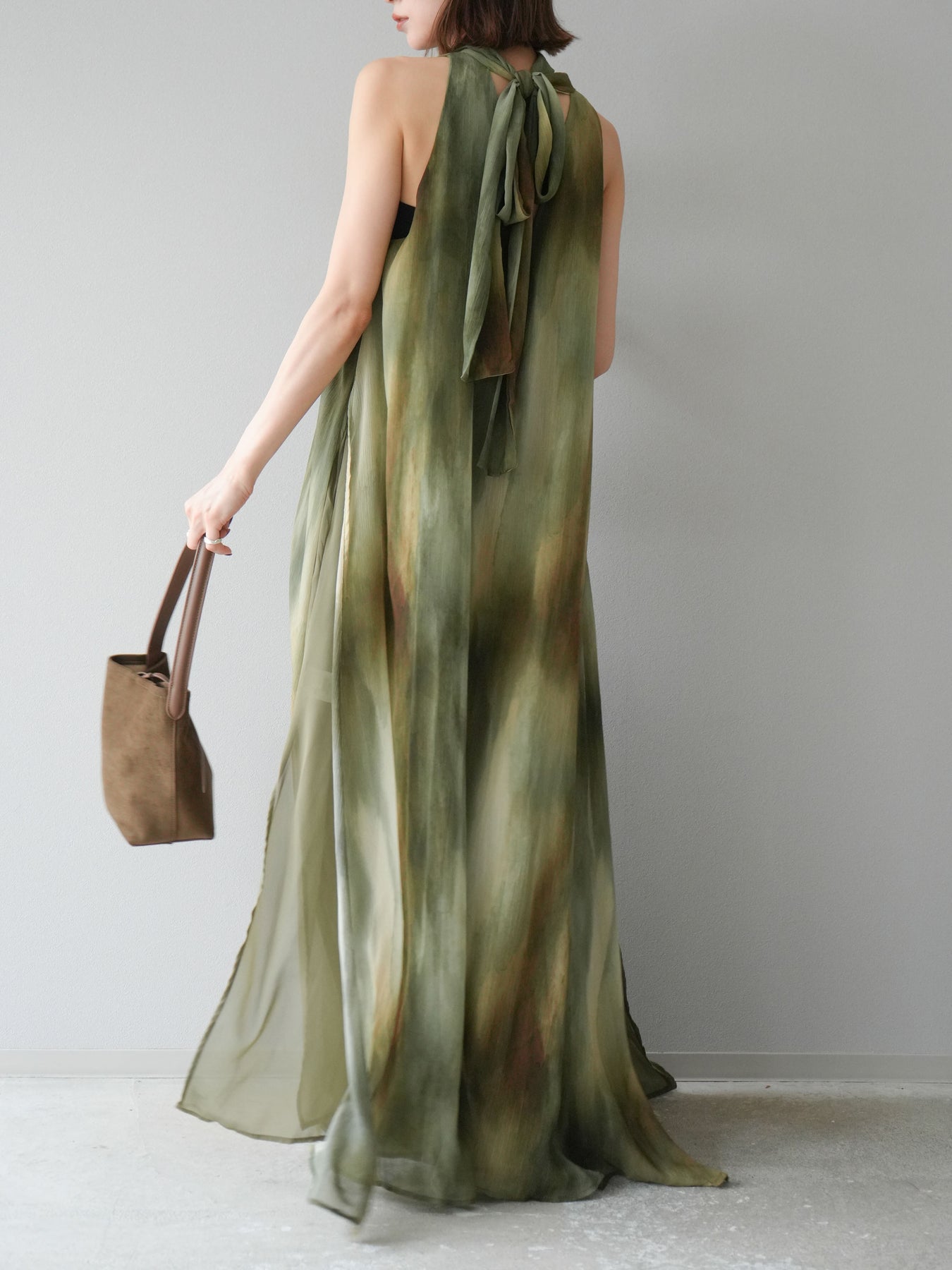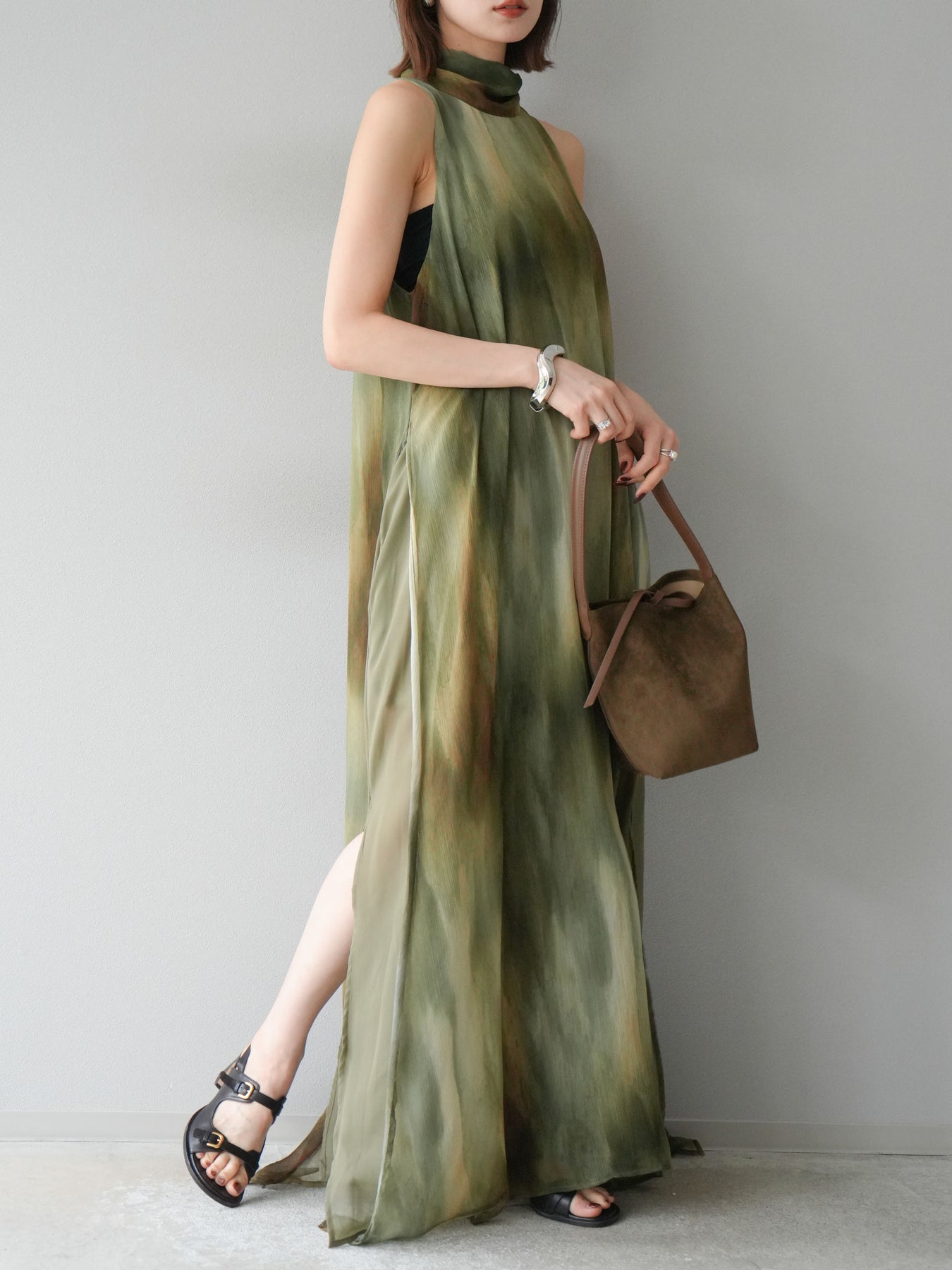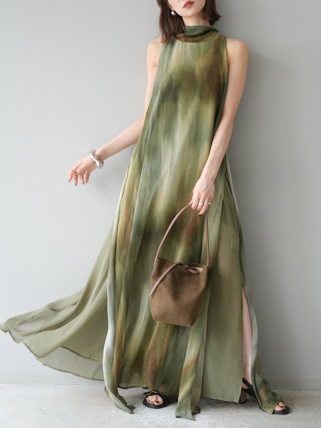 水彩画のようなニュアンスプリントが印象的な、1枚で存在感のあるワンピース。 軽やかなシアー素材を贅沢に使用し、動くたびにふわりと揺れるエアリーなシルエットが魅力。 首元は上品なハイネックデザインで、バックには抜け感を演出するスリット入り。 レイヤードデザインにより奥行きのある表情を楽しめ、リゾートからフォーマルシーンまで幅広く活躍します。 インナー次第で印象を変えられる、着回し力の高い一着です。 ※ボトムス、キャミソール(インナー)以外の商品は一律でインナーは付属していません。
