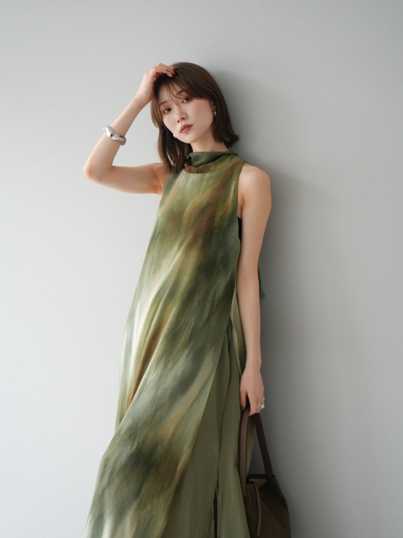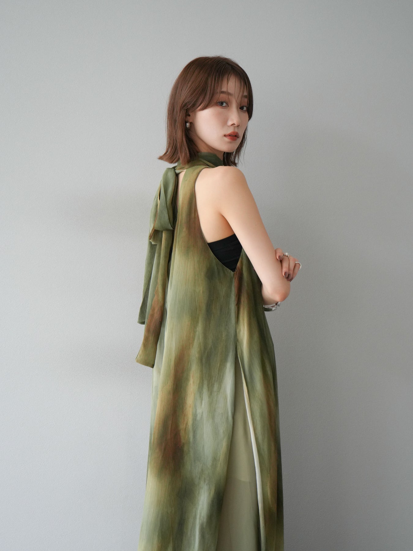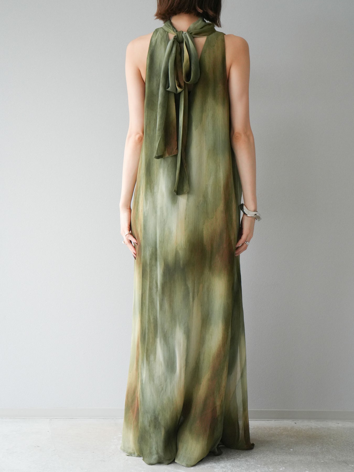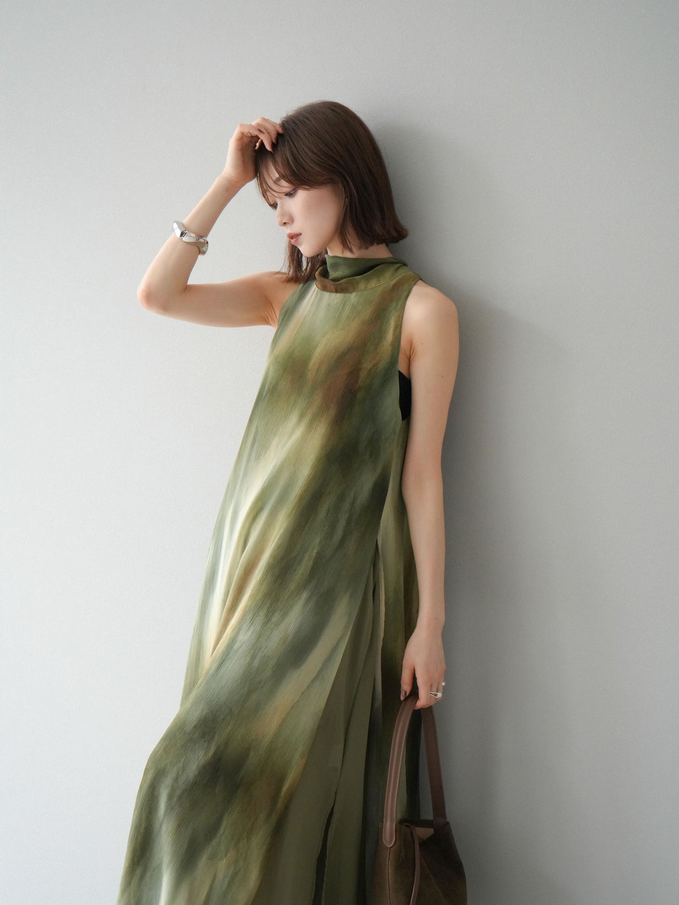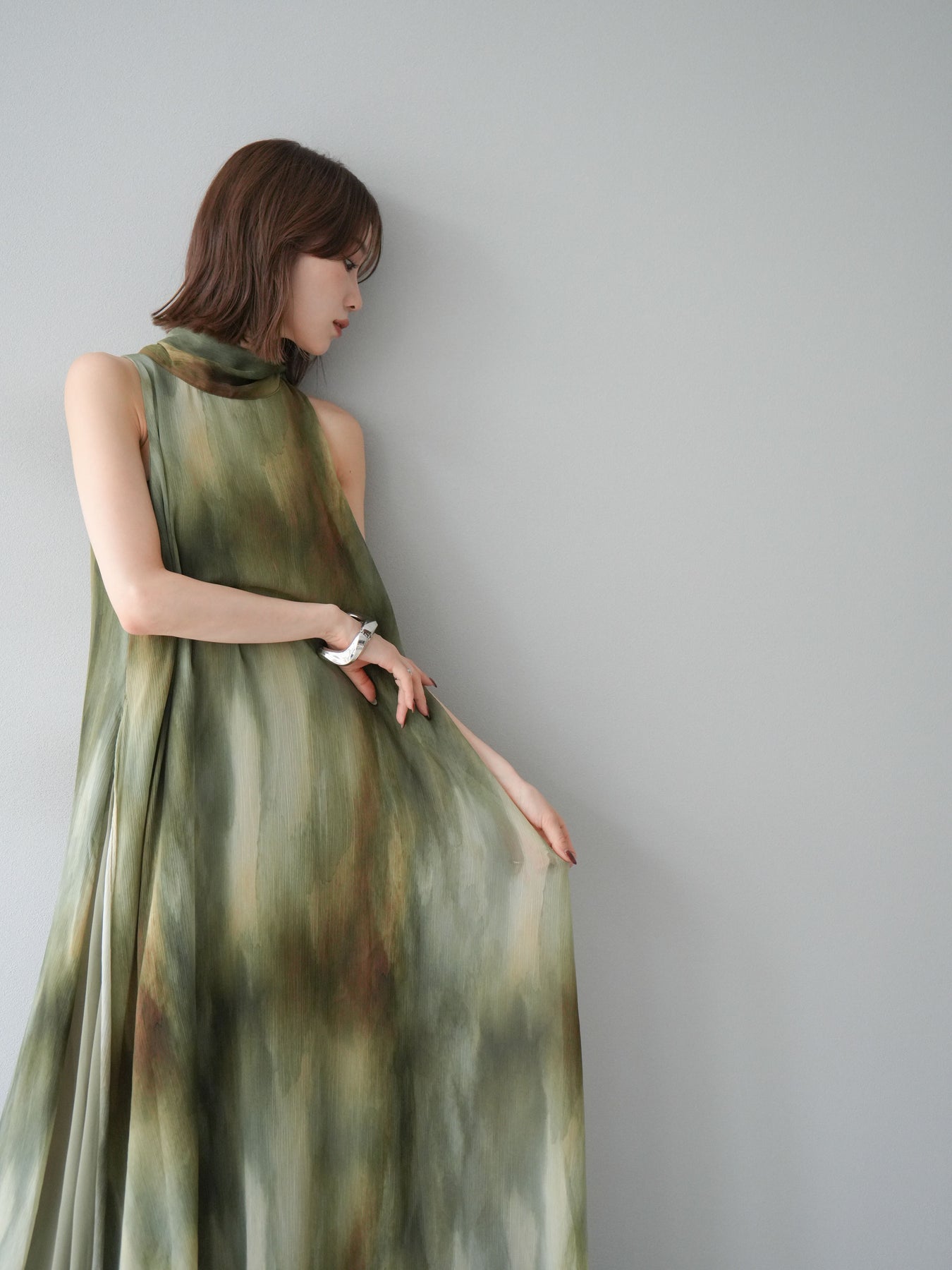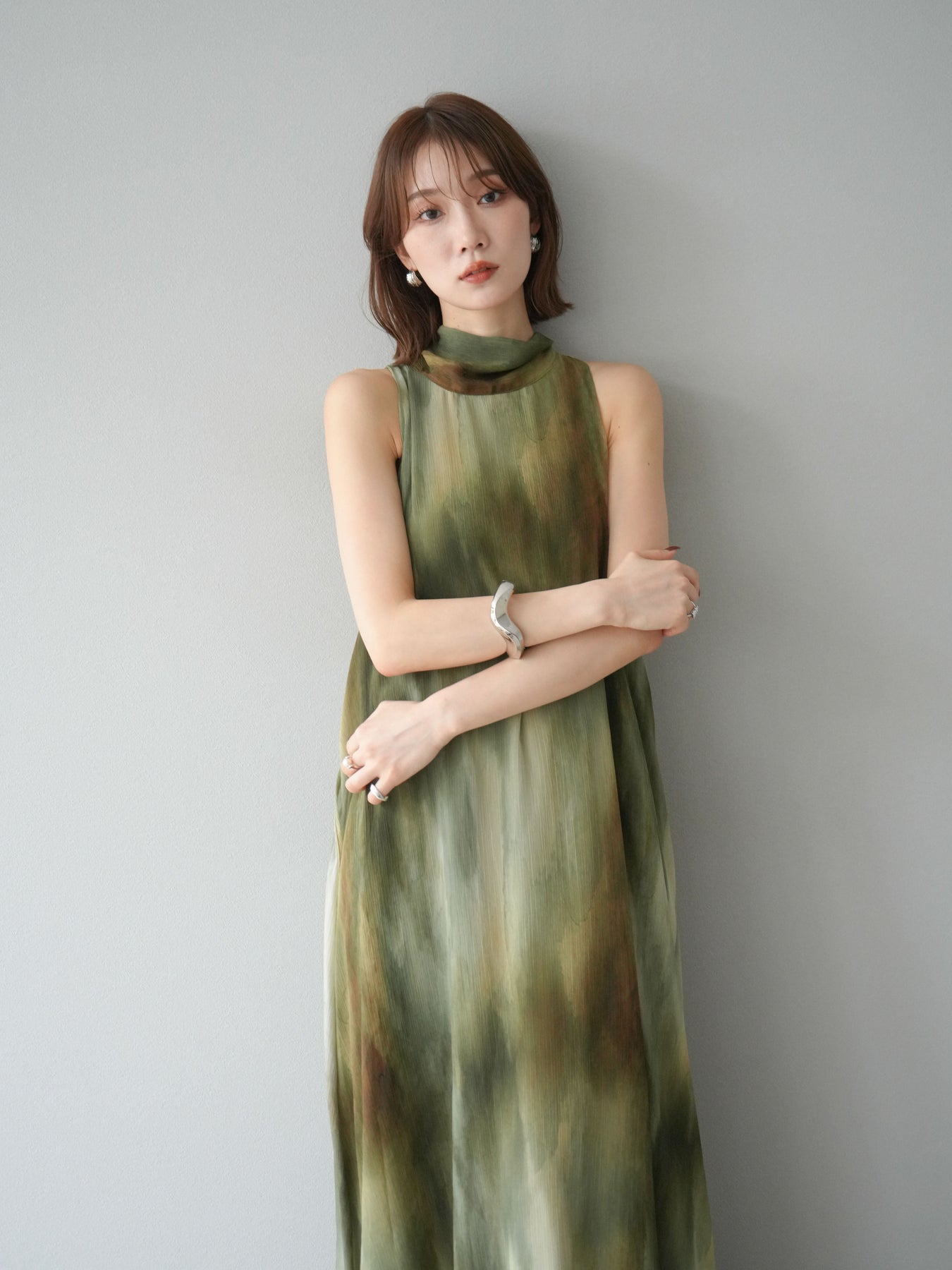 水彩画のようなニュアンスプリントが印象的な、1枚で存在感のあるワンピース。 軽やかなシアー素材を贅沢に使用し、動くたびにふわりと揺れるエアリーなシルエットが魅力。 首元は上品なハイネックデザインで、バックには抜け感を演出するスリット入り。 レイヤードデザインにより奥行きのある表情を楽しめ、リゾートからフォーマルシーンまで幅広く活躍します。 インナー次第で印象を変えられる、着回し力の高い一着です。 ※ボトムス、キャミソール(インナー)以外の商品は一律でインナーは付属していません。