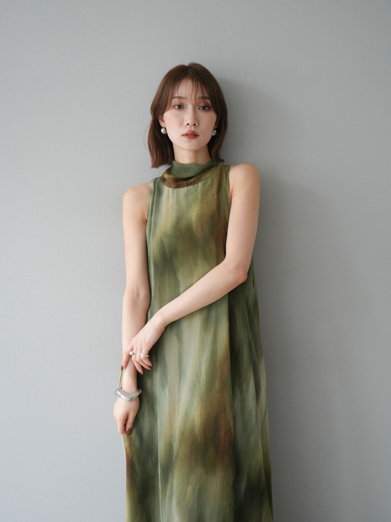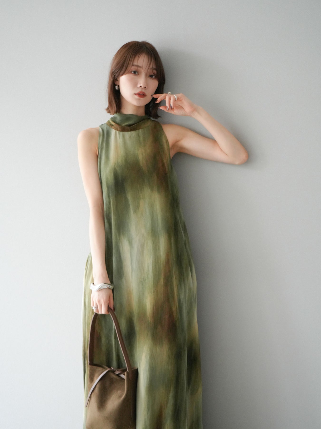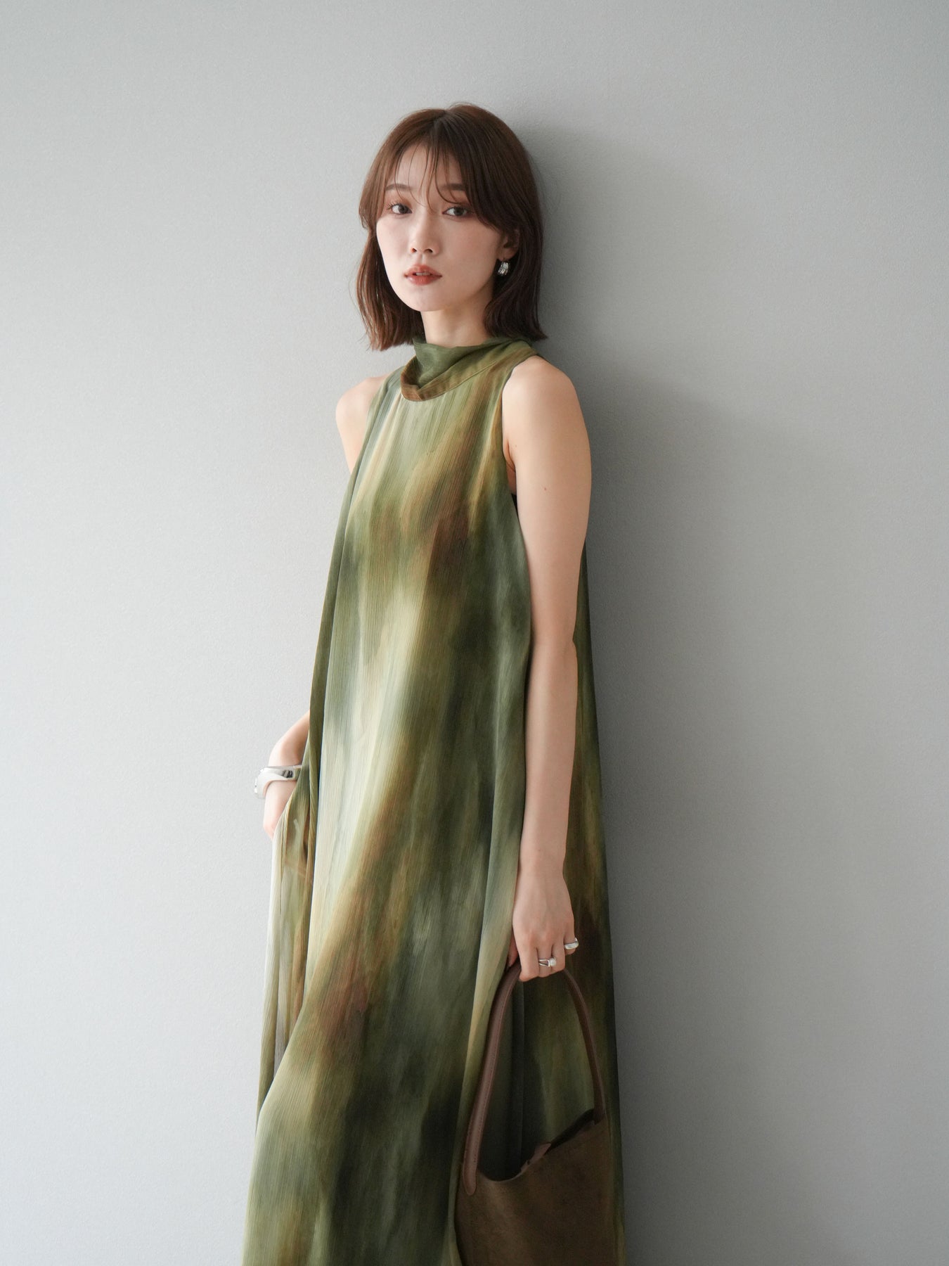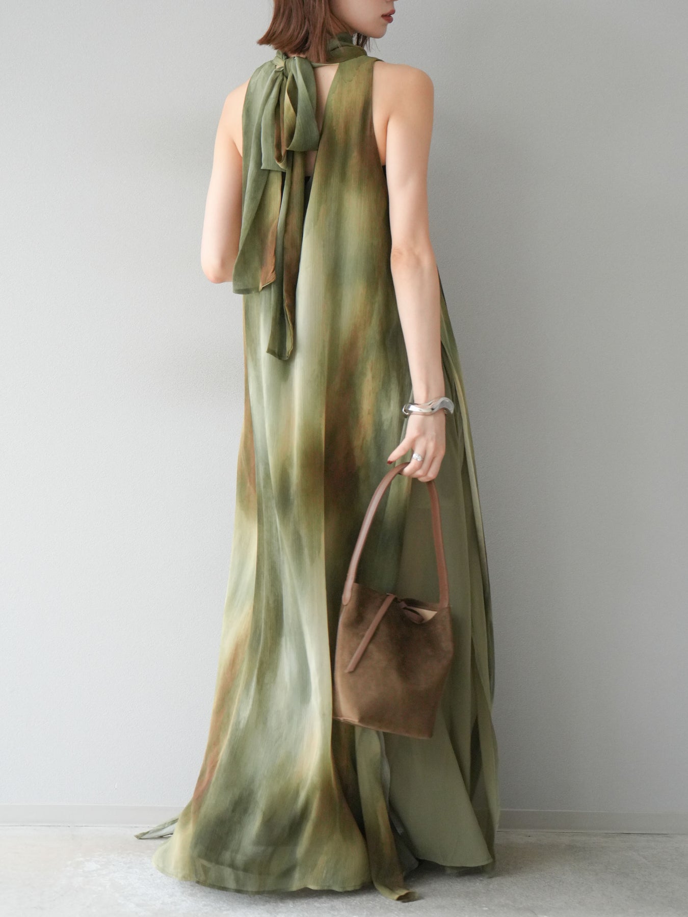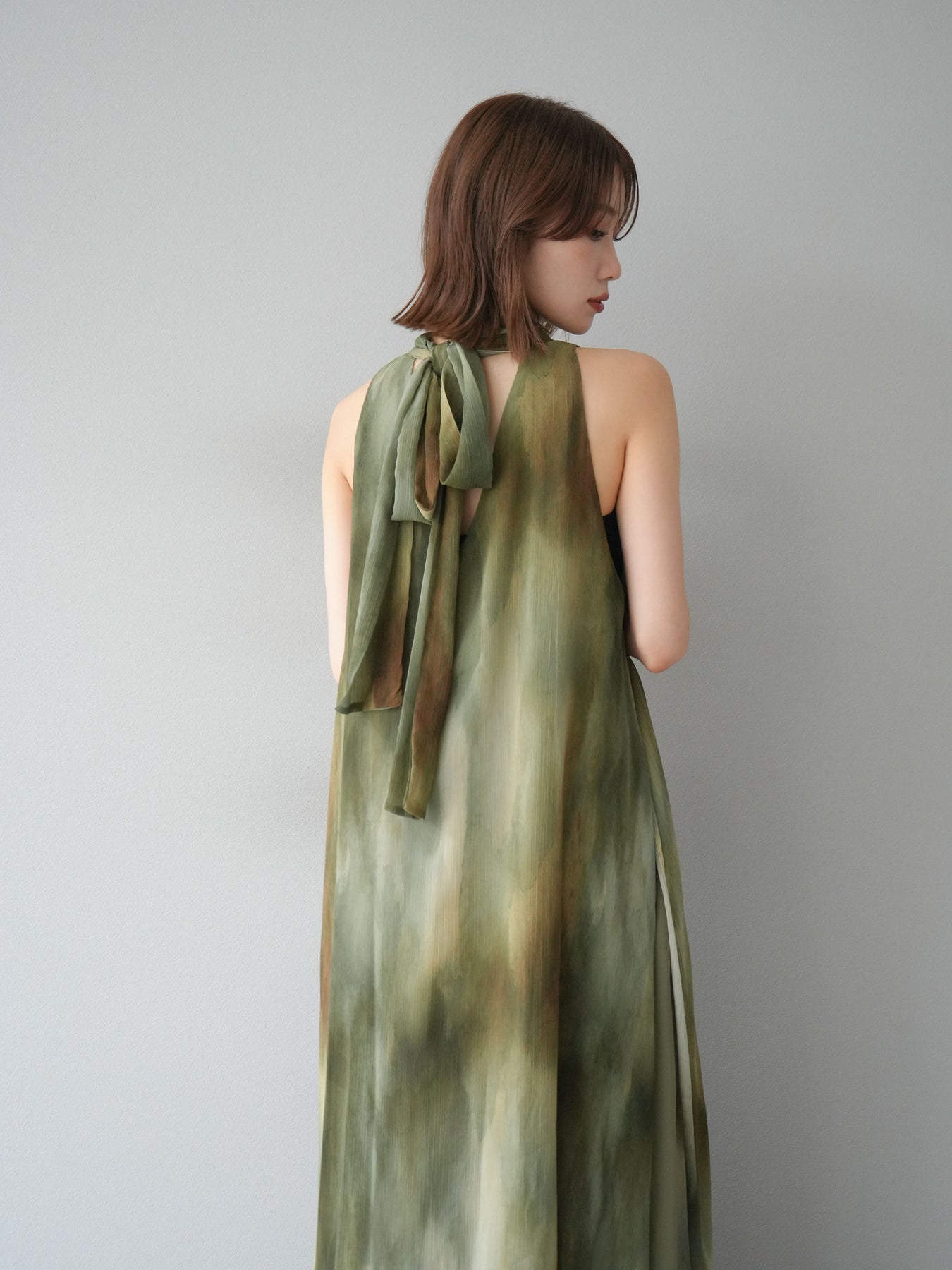 水彩画のようなニュアンスプリントが印象的な、1枚で存在感のあるワンピース。 軽やかなシアー素材を贅沢に使用し、動くたびにふわりと揺れるエアリーなシルエットが魅力。 首元は上品なハイネックデザインで、バックには抜け感を演出するスリット入り。 レイヤードデザインにより奥行きのある表情を楽しめ、リゾートからフォーマルシーンまで幅広く活躍します。 インナー次第で印象を変えられる、着回し力の高い一着です。 ※ボトムス、キャミソール(インナー)以外の商品は一律でインナーは付属していません。