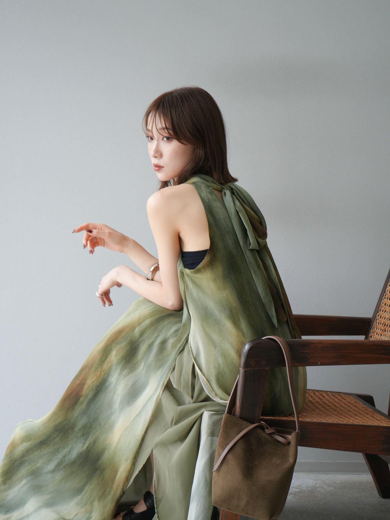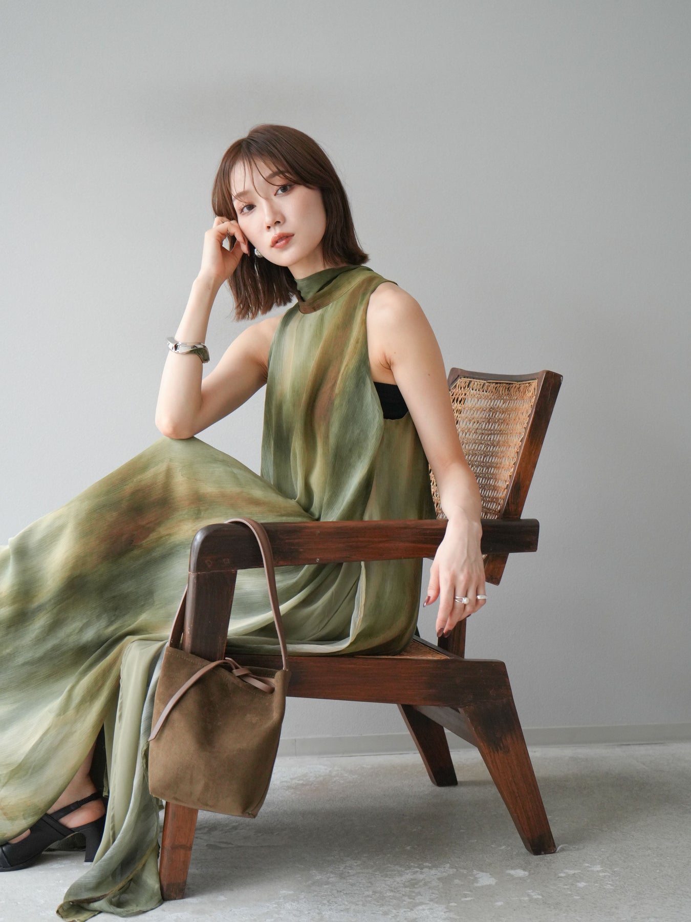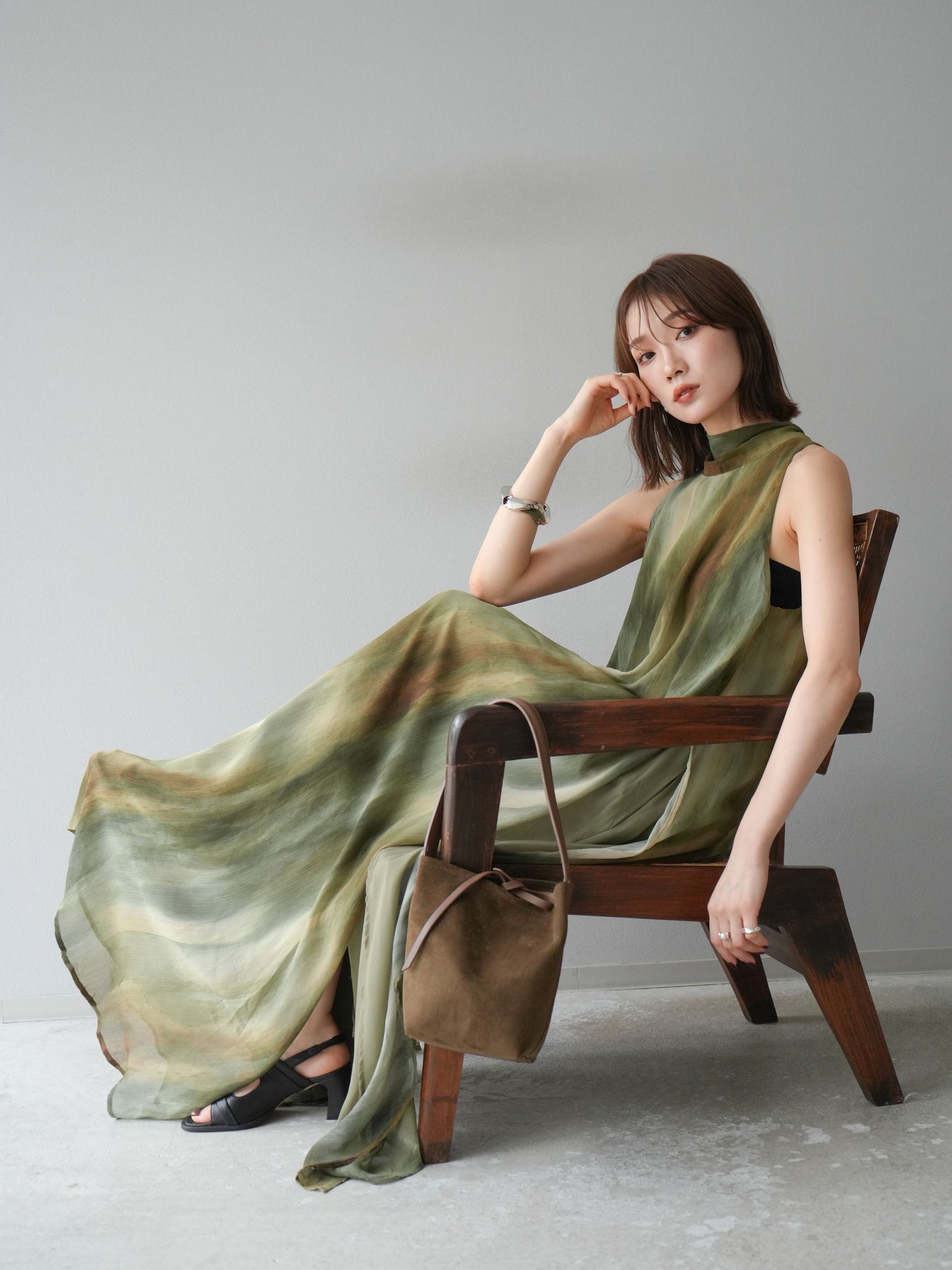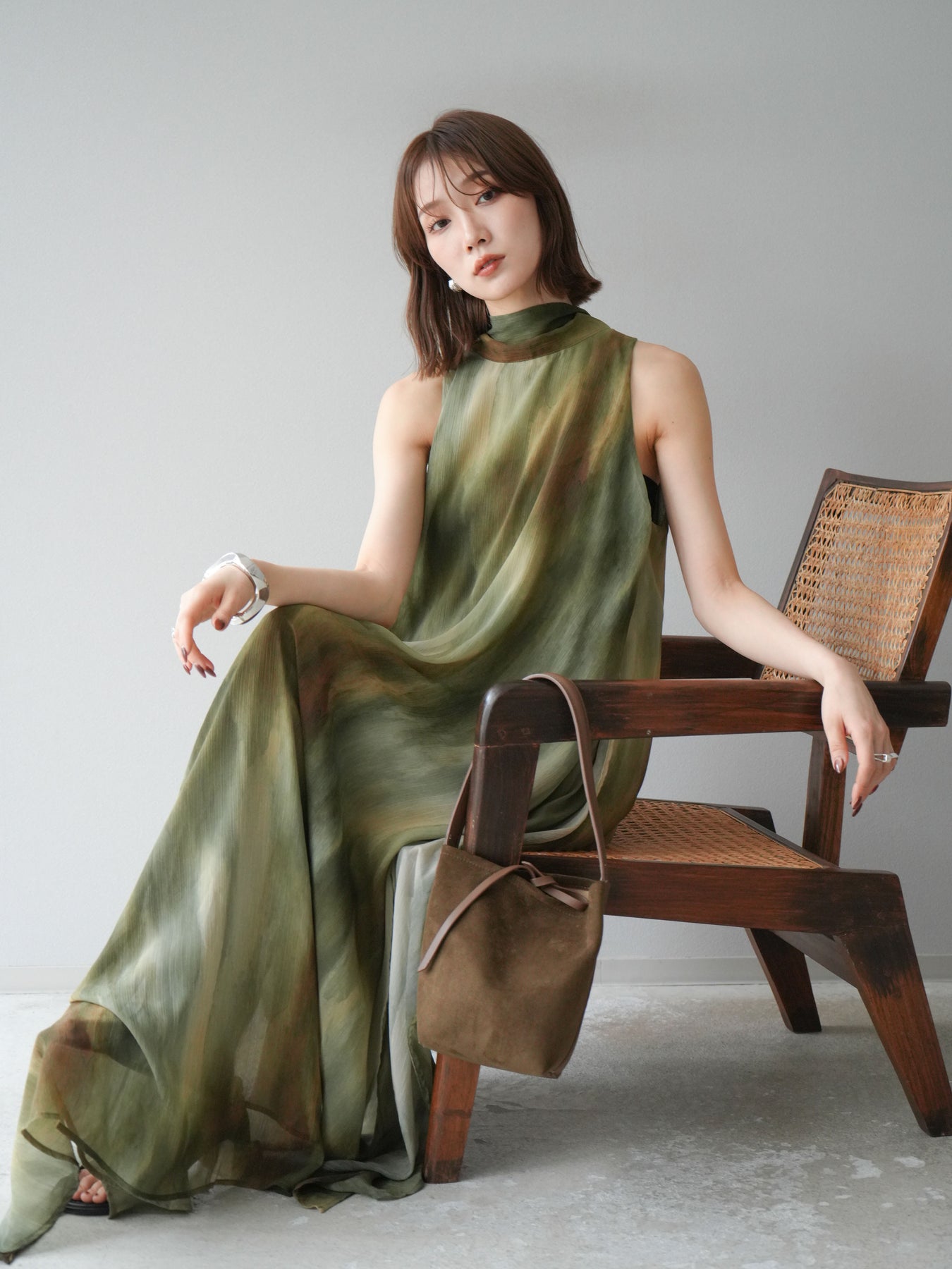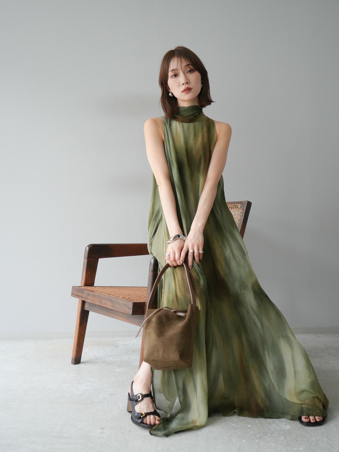 水彩画のようなニュアンスプリントが印象的な、1枚で存在感のあるワンピース。 軽やかなシアー素材を贅沢に使用し、動くたびにふわりと揺れるエアリーなシルエットが魅力。 首元は上品なハイネックデザインで、バックには抜け感を演出するスリット入り。 レイヤードデザインにより奥行きのある表情を楽しめ、リゾートからフォーマルシーンまで幅広く活躍します。 インナー次第で印象を変えられる、着回し力の高い一着です。 ※ボトムス、キャミソール(インナー)以外の商品は一律でインナーは付属していません。