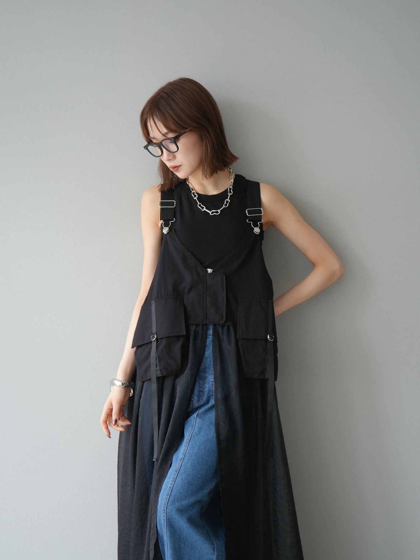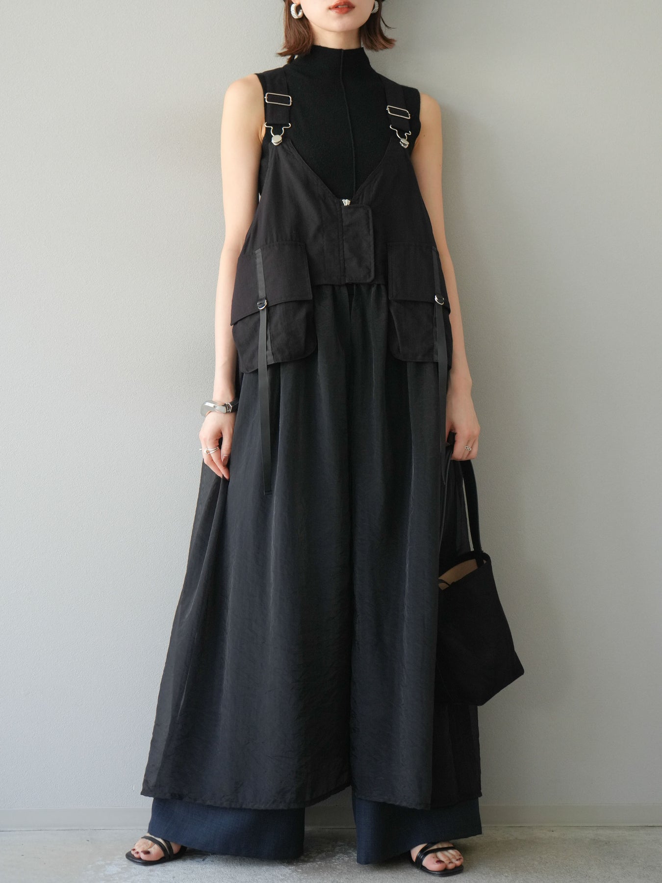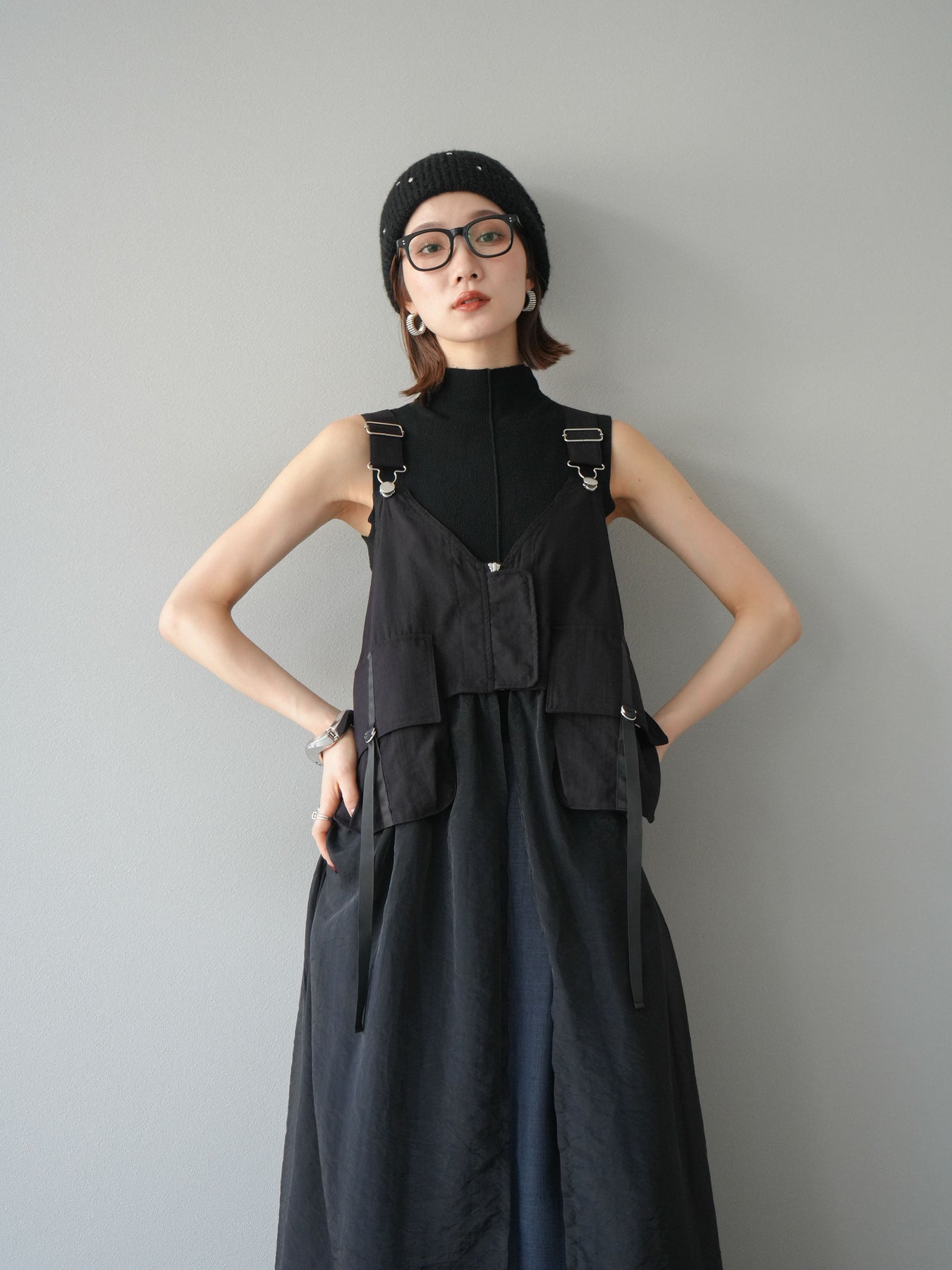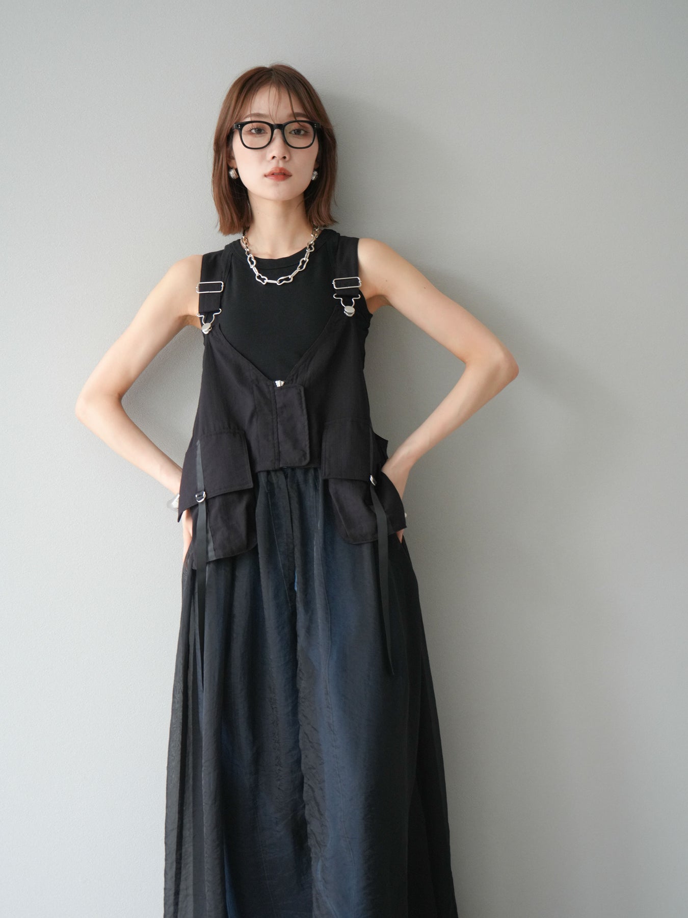 タクティカルベストとオーガンジーワンピースがレイヤードされた、モード感溢れるコンビデザイン。 ベスト部分はジップと大きめポケットでミリタリーライクなエッセンスをプラスしつつ、 シアーなオーガンジーが軽やかで女性らしい抜け感を演出。 パンツやタートルネックなどの重ね着スタイルにも映え、個性と実用性を兼ね備えた一着です。 ※ボトムス、キャミソール(インナー)以外の商品は一律でインナーは付属していません。