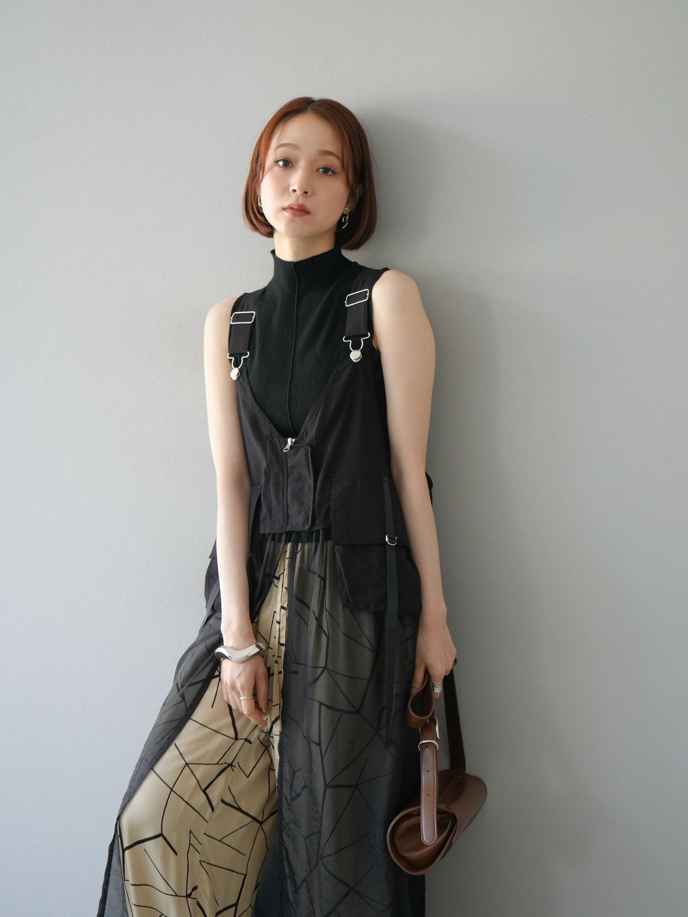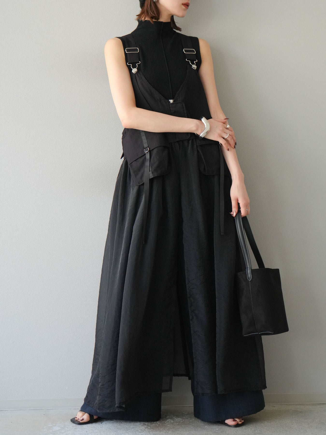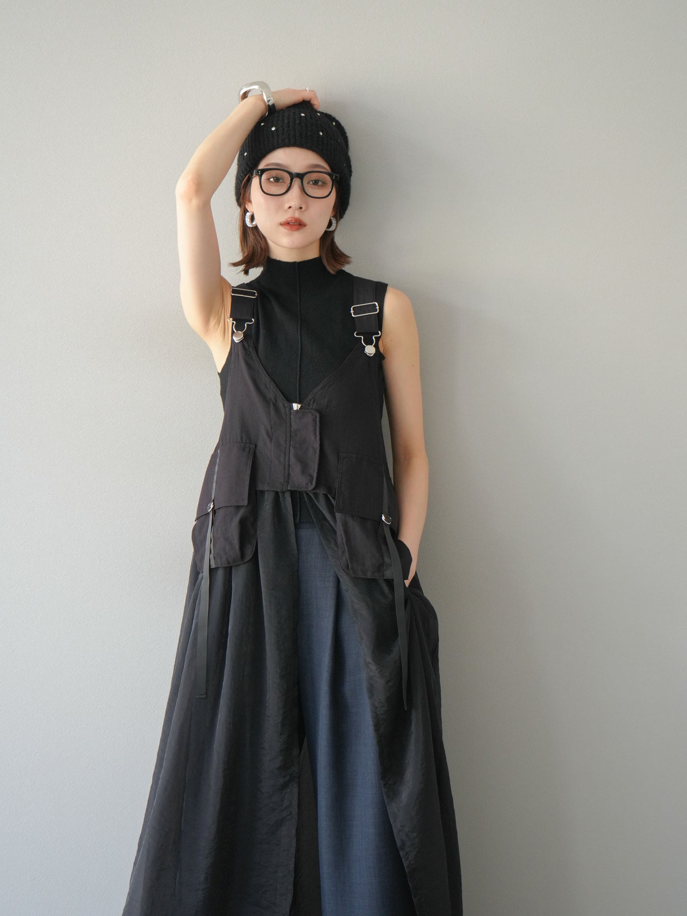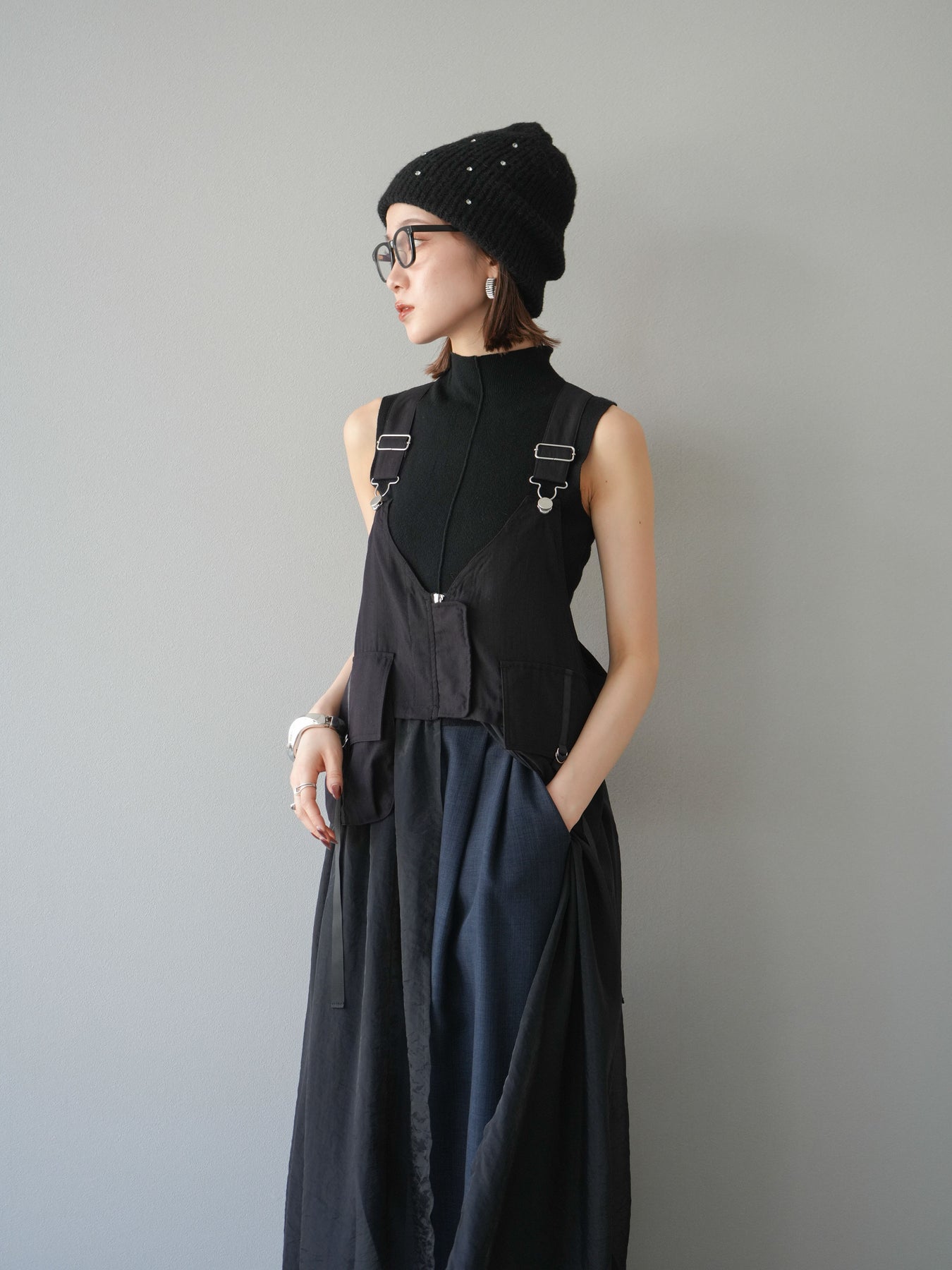 タクティカルベストとオーガンジーワンピースがレイヤードされた、モード感溢れるコンビデザイン。 ベスト部分はジップと大きめポケットでミリタリーライクなエッセンスをプラスしつつ、 シアーなオーガンジーが軽やかで女性らしい抜け感を演出。 パンツやタートルネックなどの重ね着スタイルにも映え、個性と実用性を兼ね備えた一着です。 ※ボトムス、キャミソール(インナー)以外の商品は一律でインナーは付属していません。