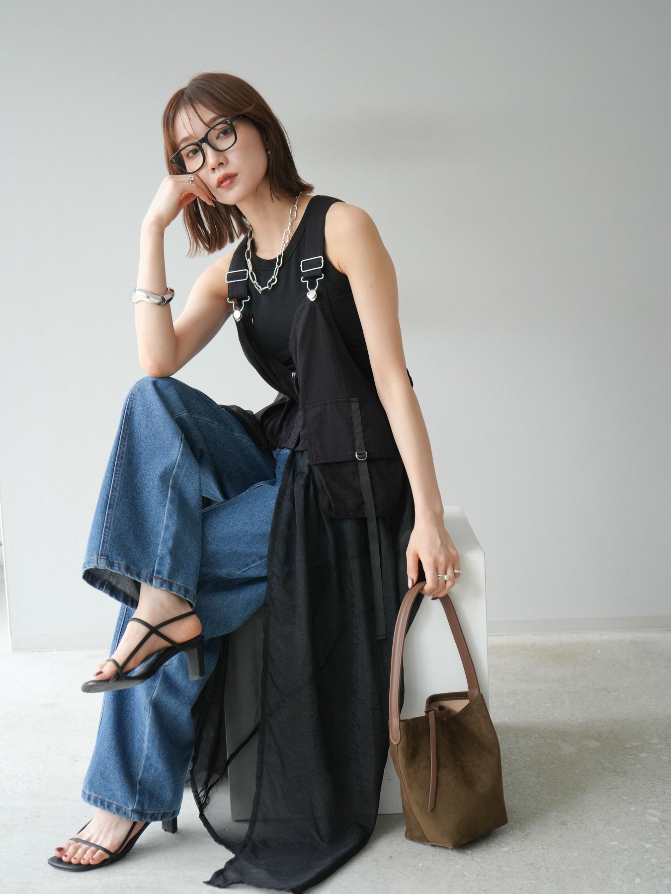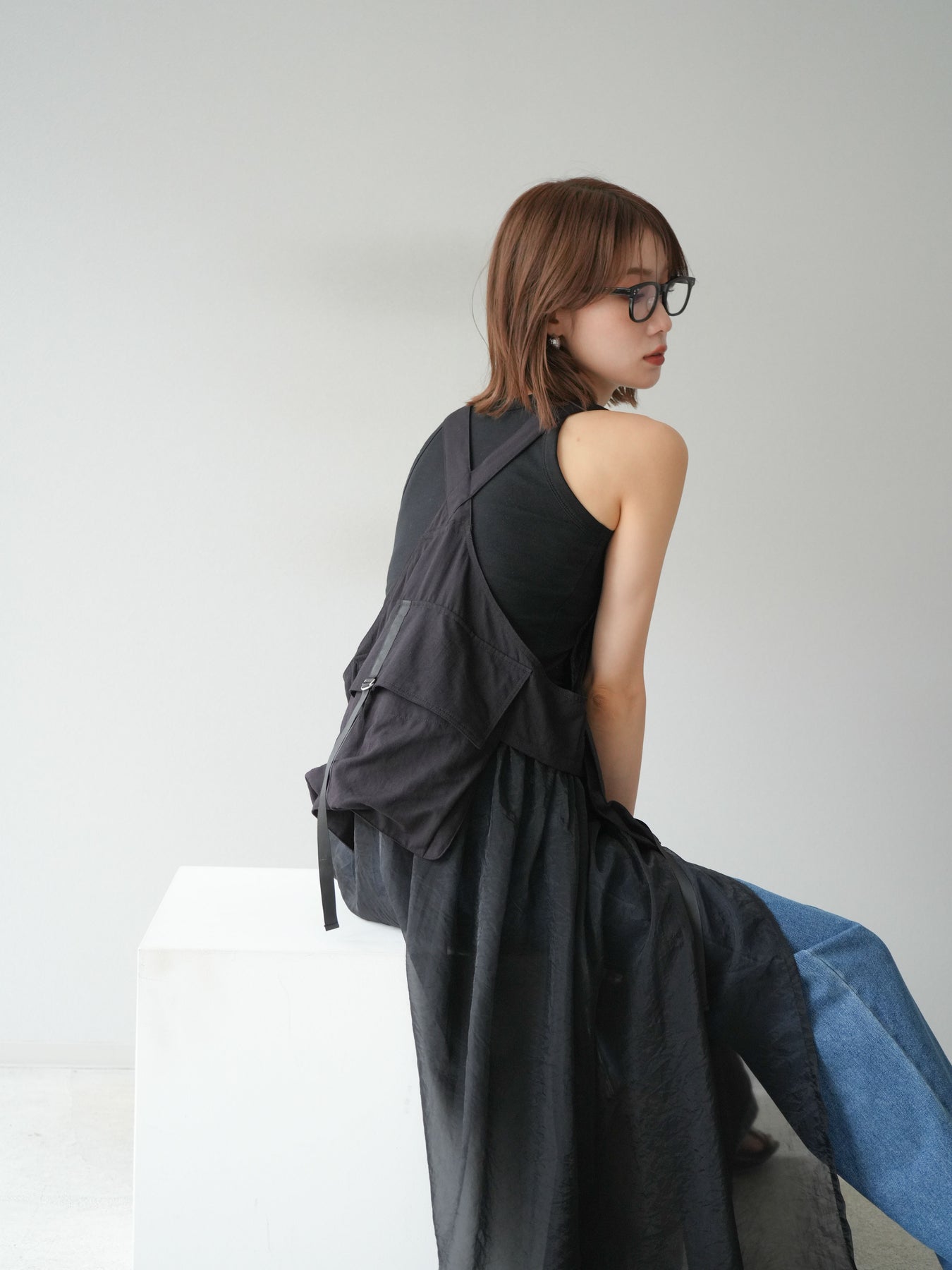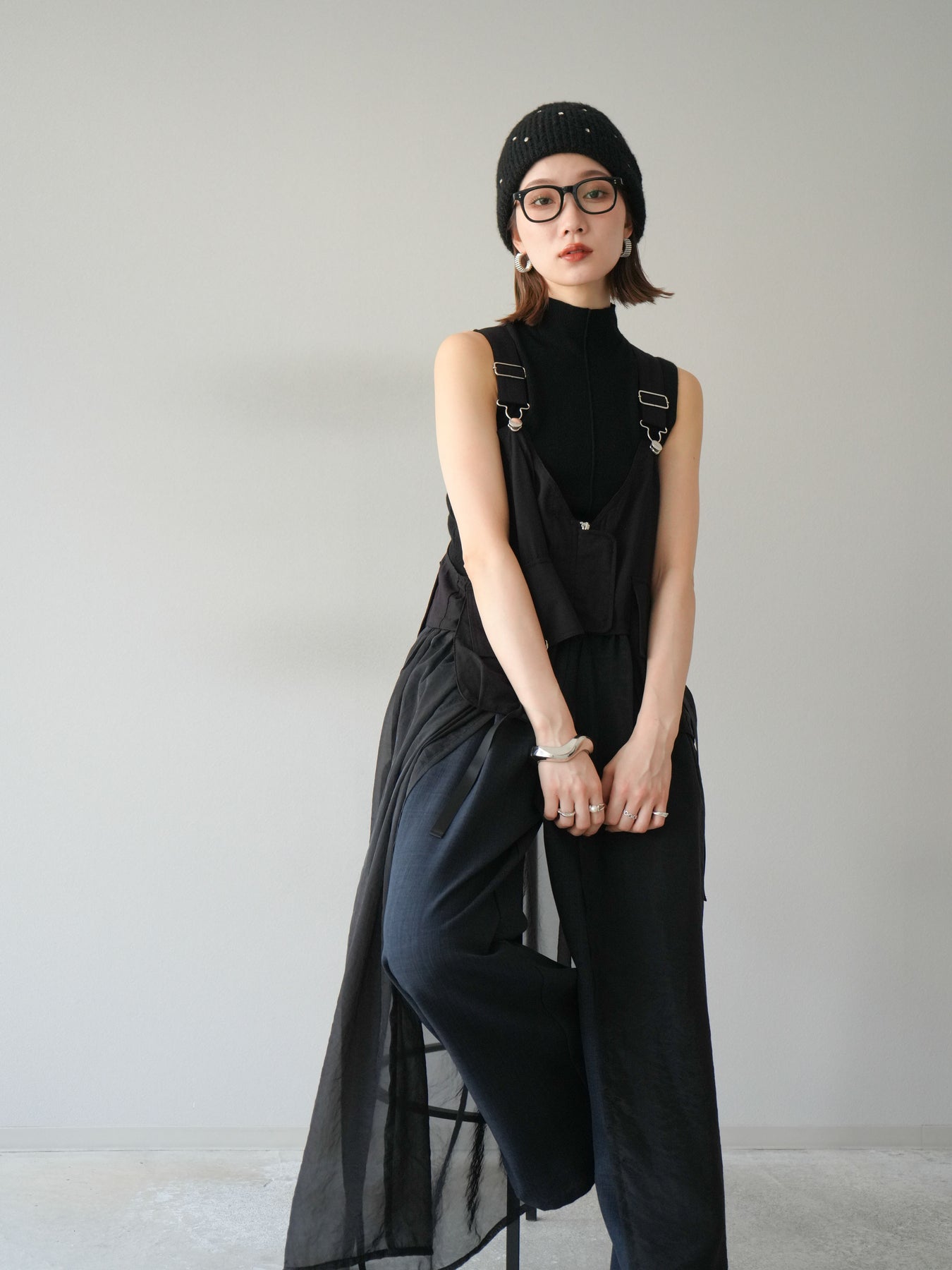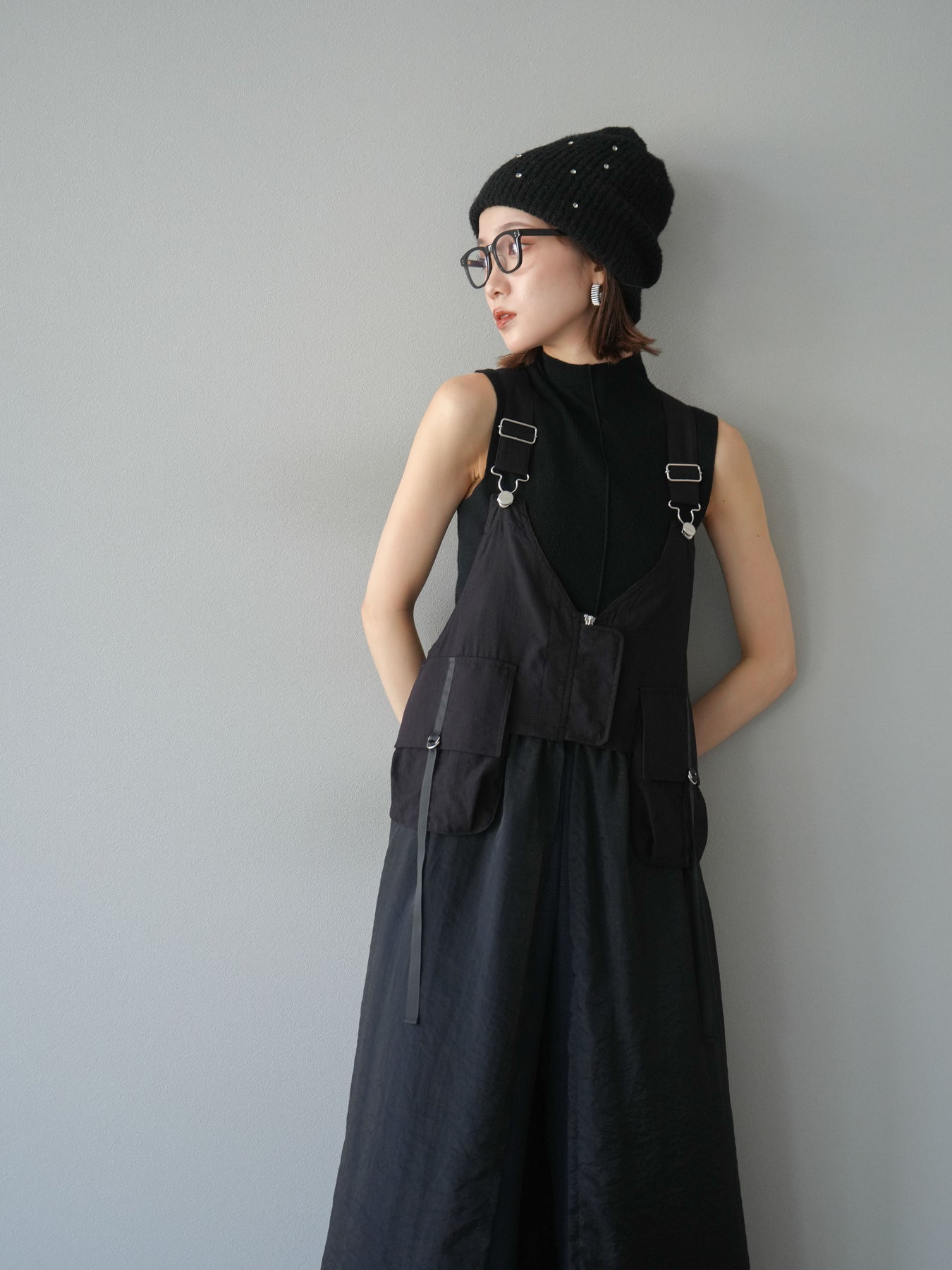 タクティカルベストとオーガンジーワンピースがレイヤードされた、モード感溢れるコンビデザイン。 ベスト部分はジップと大きめポケットでミリタリーライクなエッセンスをプラスしつつ、 シアーなオーガンジーが軽やかで女性らしい抜け感を演出。 パンツやタートルネックなどの重ね着スタイルにも映え、個性と実用性を兼ね備えた一着です。 ※ボトムス、キャミソール(インナー)以外の商品は一律でインナーは付属していません。
