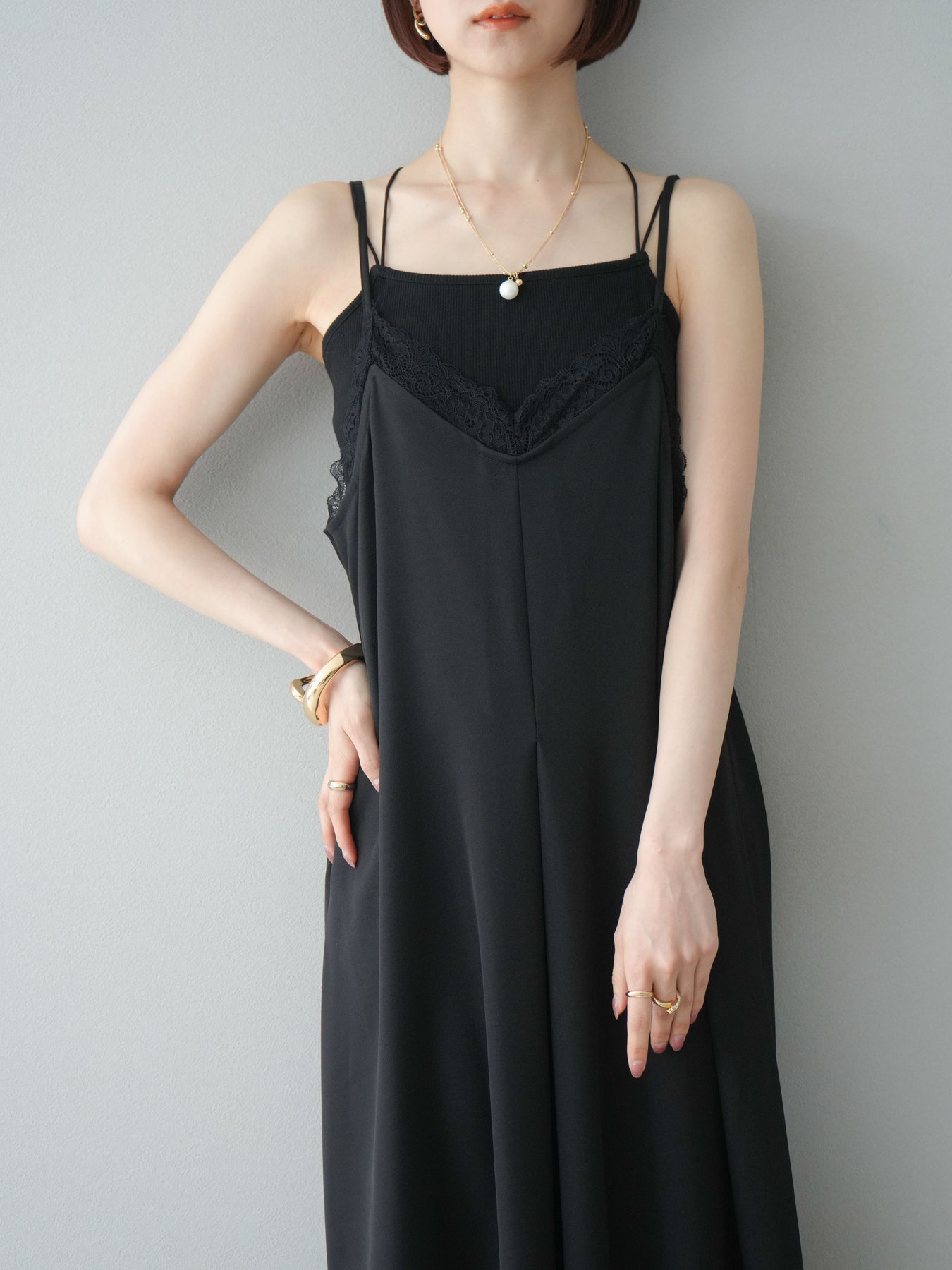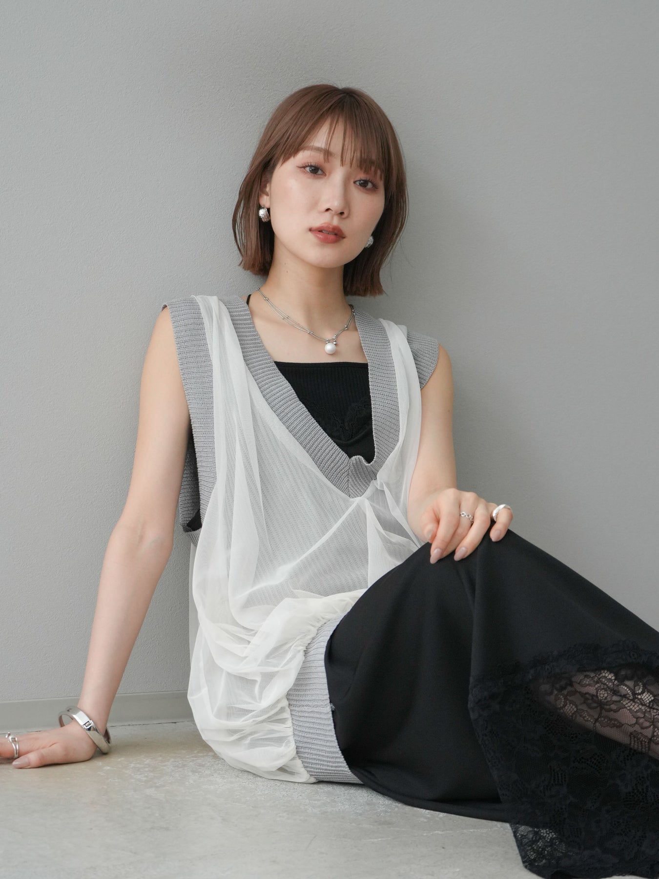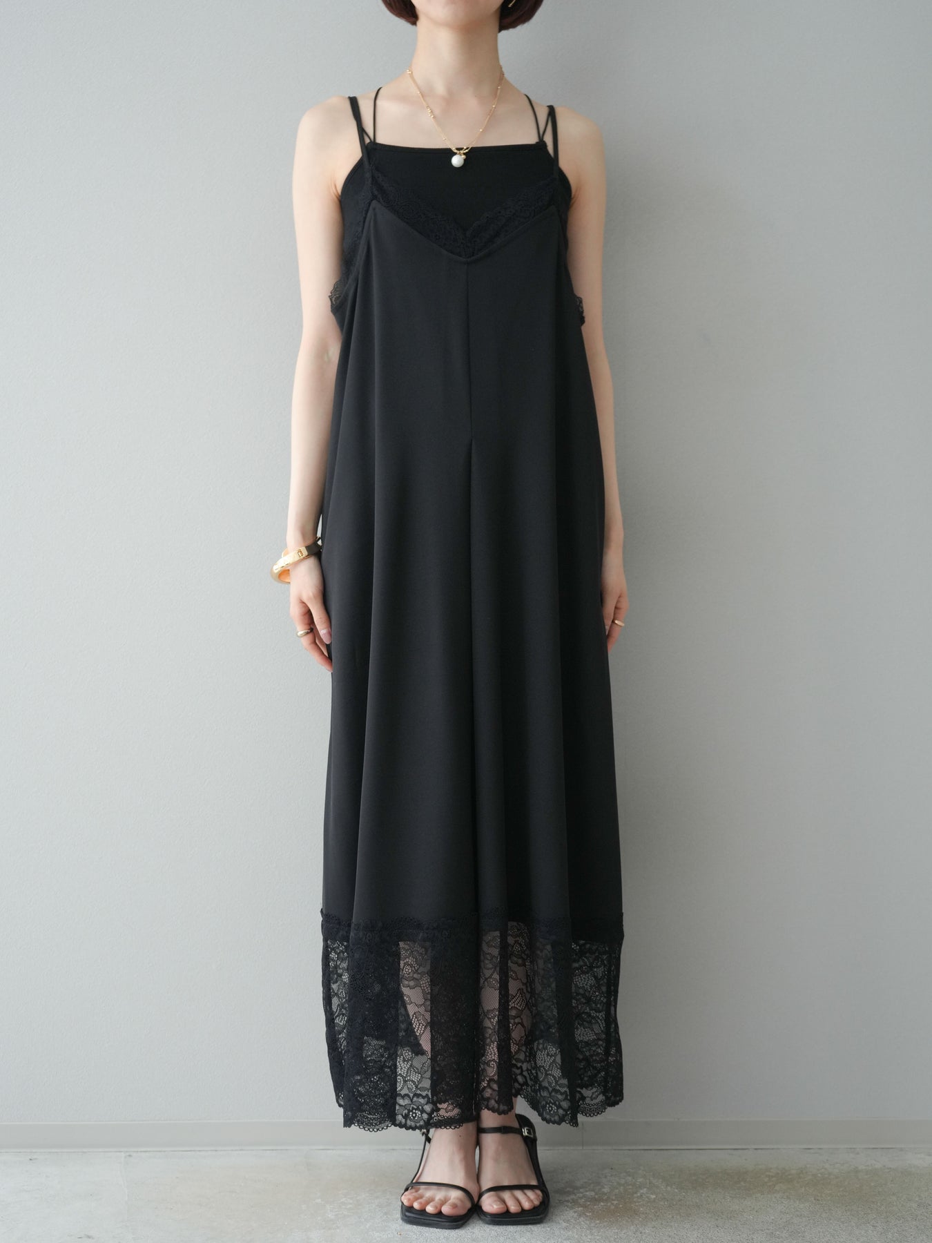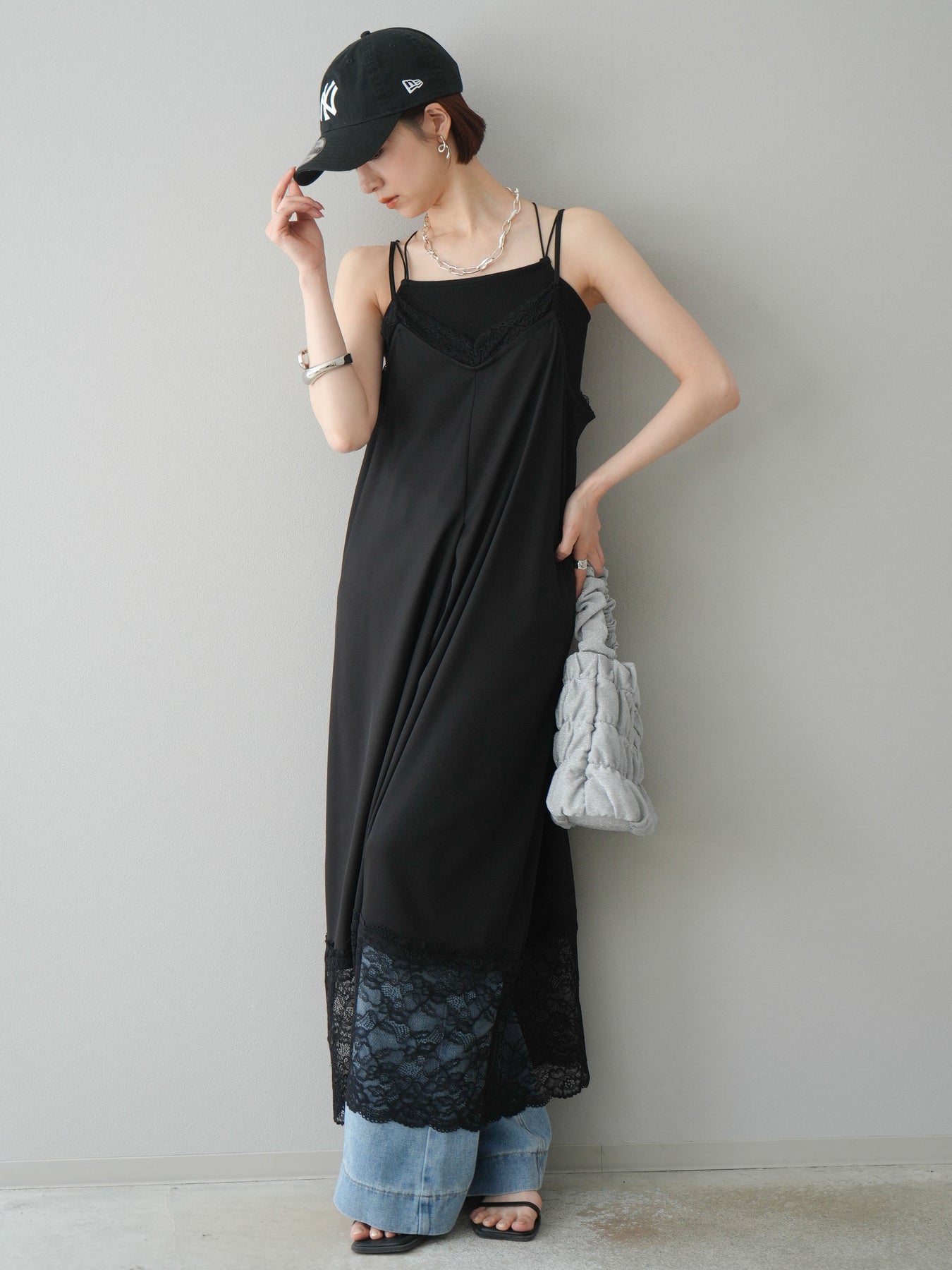 這款時尚吊帶洋裝的下擺和胸前飾有搶眼的蕾絲。柔軟的布料勾勒出優美的輪廓。褶襉設計展現出女性柔美的線條,並帶有柔和的喇叭形。建議搭配T卹或透視上衣,打造適合長期穿著的單品。 ※除下裝、吊帶背心(內衣)以外的商品均為標準品,不含內衣。