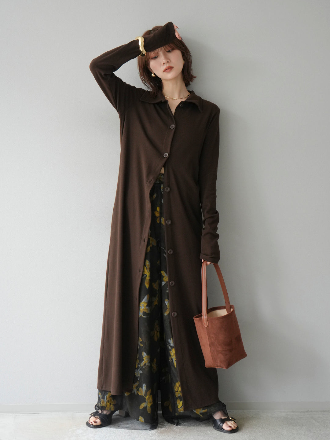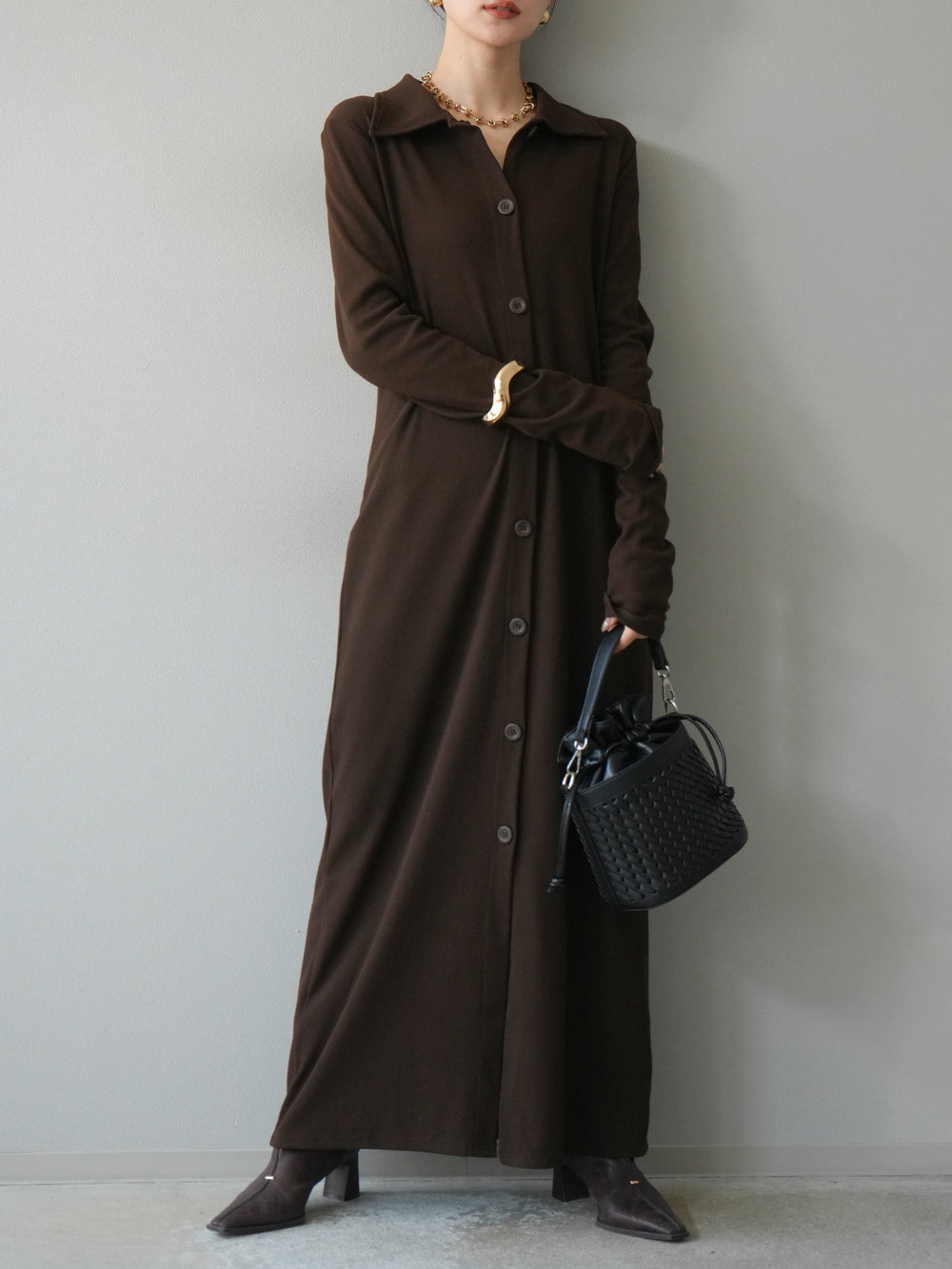 [予約]襟付きカットリブボタンワンピース/ブラウン