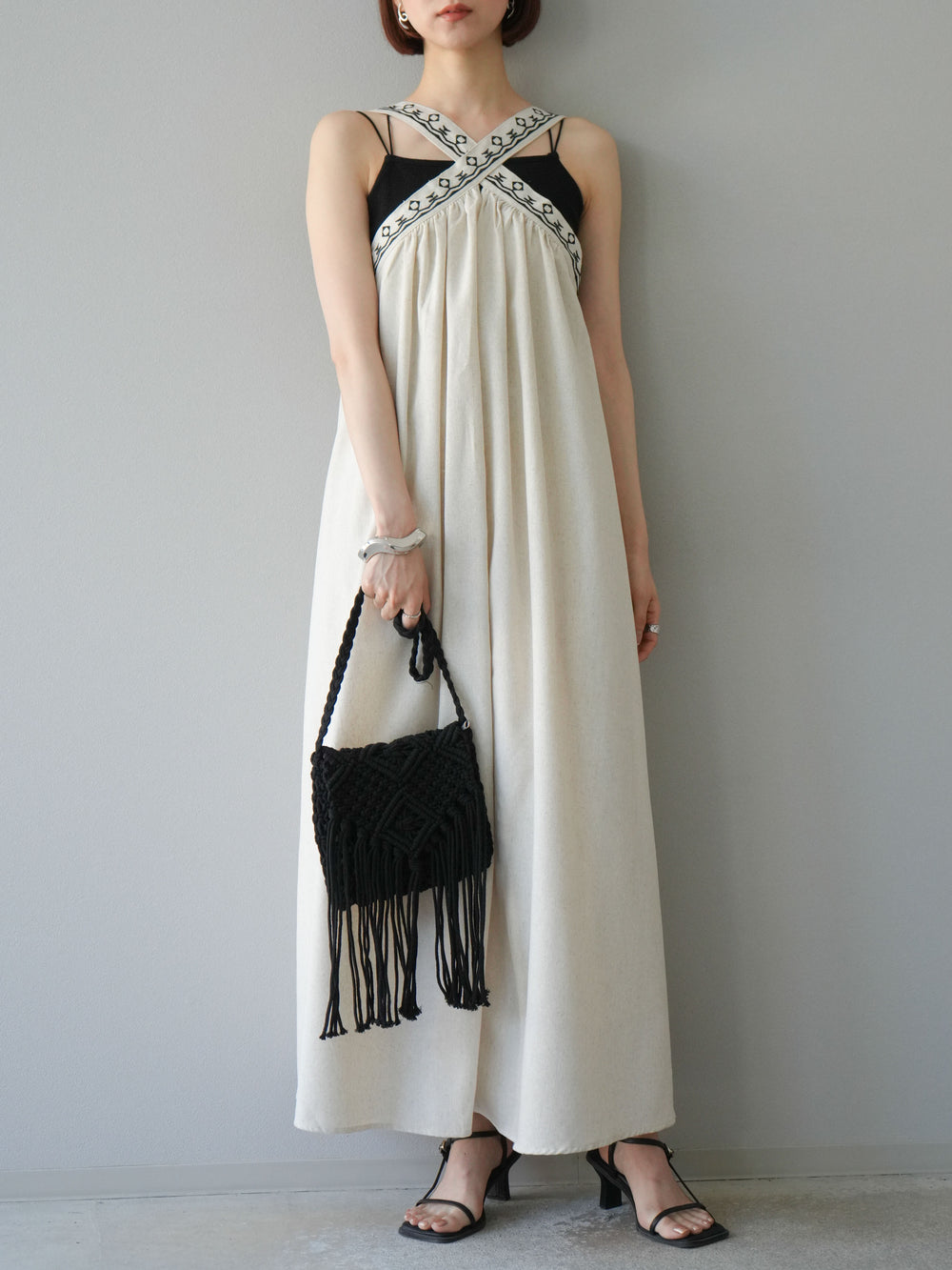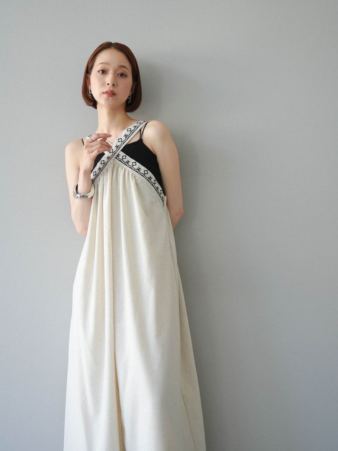 [予約]リネンライク刺繍デザインワンピース/オートミール
