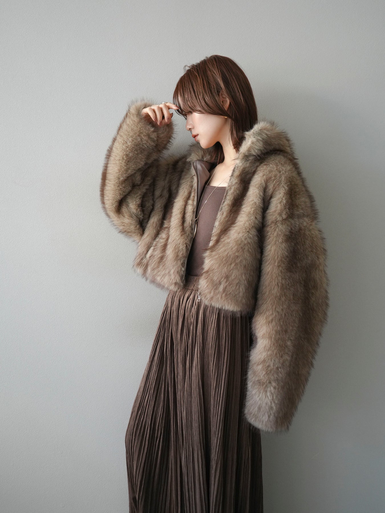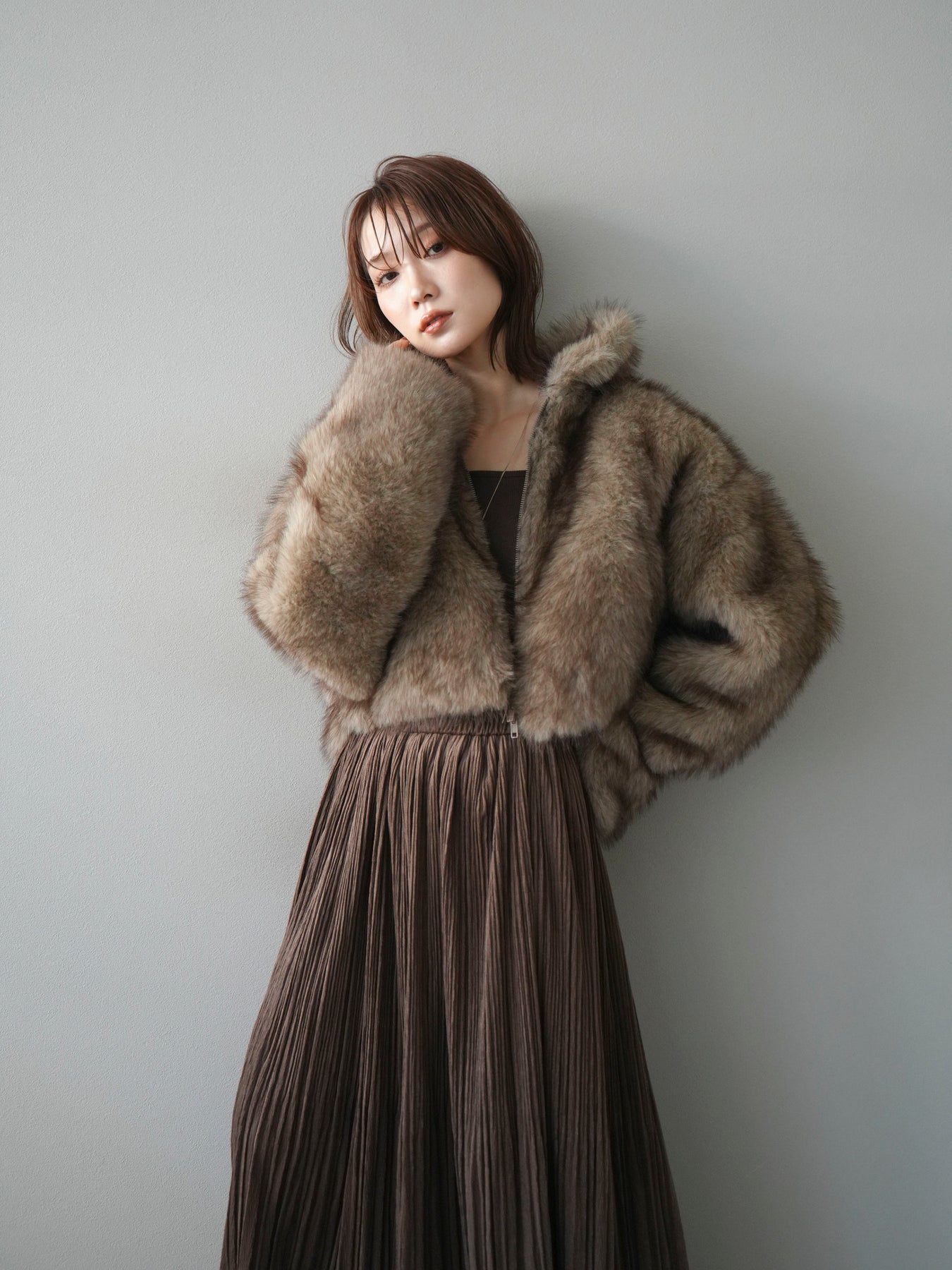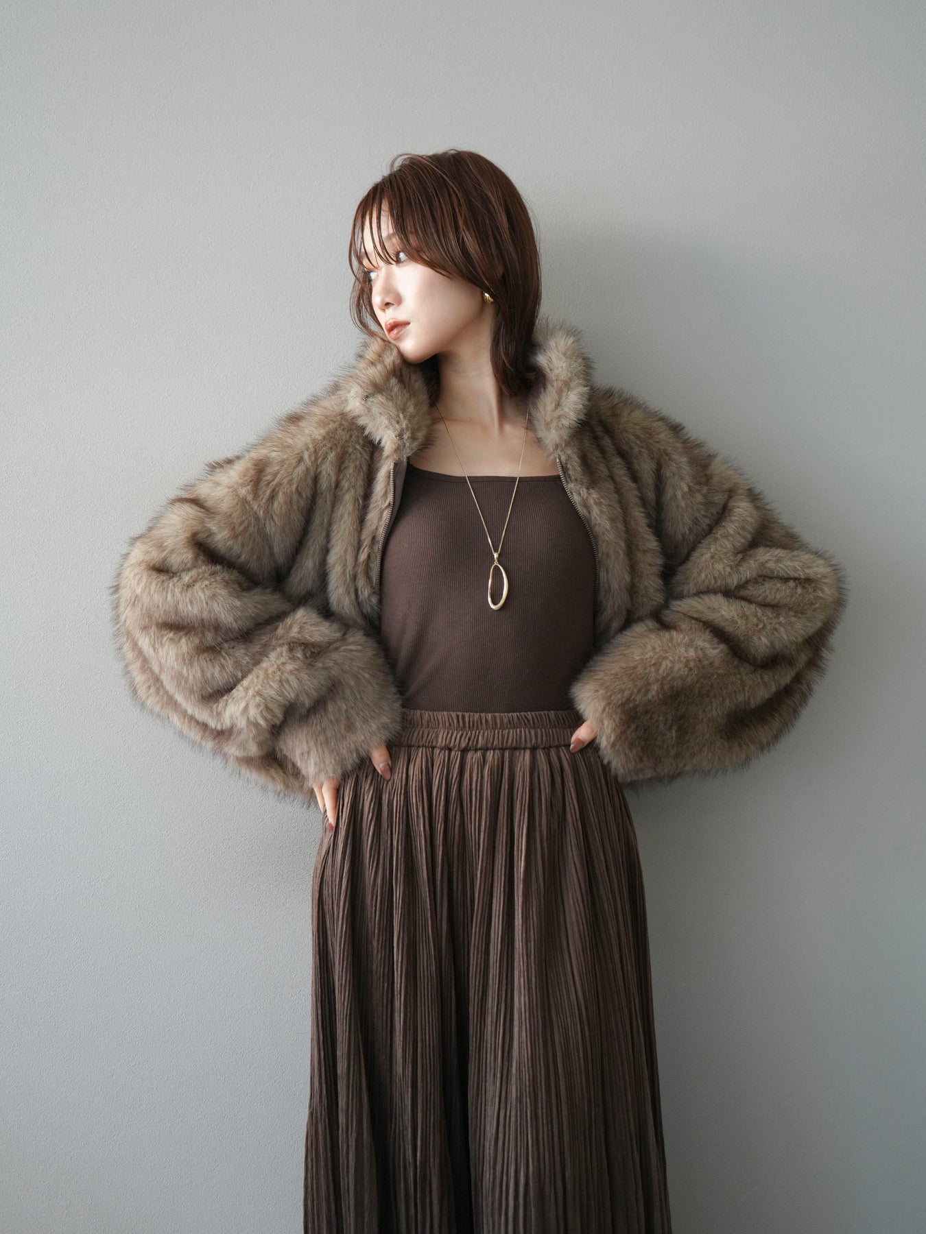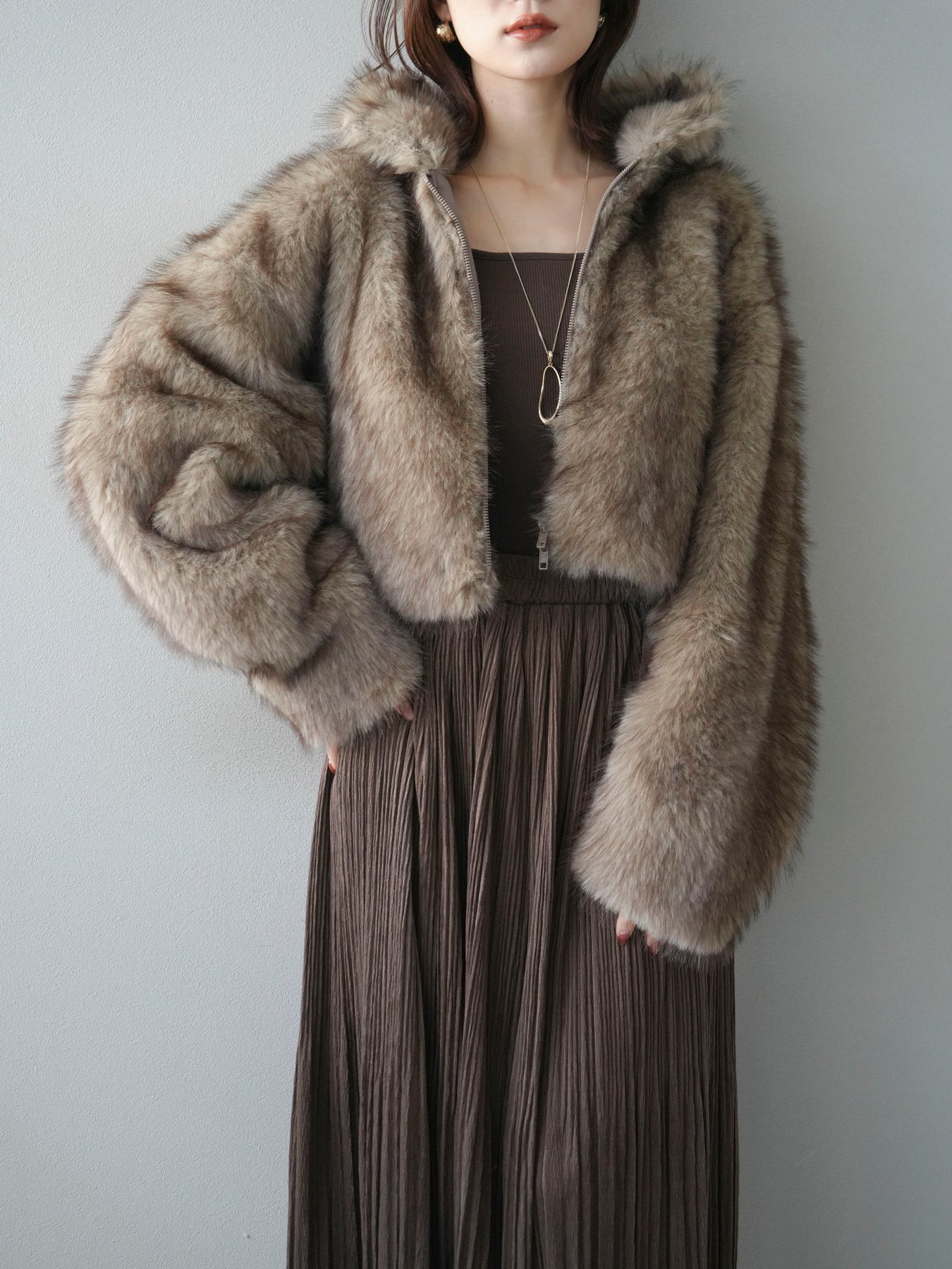 毛足の長いフェイクファーが贅沢な印象を与えるショートZIPジャケット。 ふんわりとした質感でボリューム感がありながらも、軽やかな着心地が魅力です。 コンパクトな丈感がバランスよく、ワンピースやワイドパンツなどとの相性も抜群。 フロントジップ仕様で着脱しやすく、開けて羽織るとこなれたスタイリングに仕上がります。 デイリーから特別なシーンまで、冬のコーディネートを華やかに彩る1着です。 ※ボトムス、キャミソール(インナー)以外の商品は一律でインナーは付属していません。