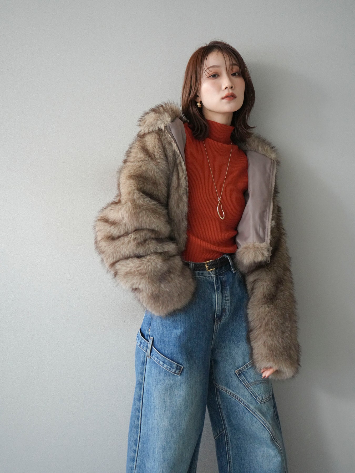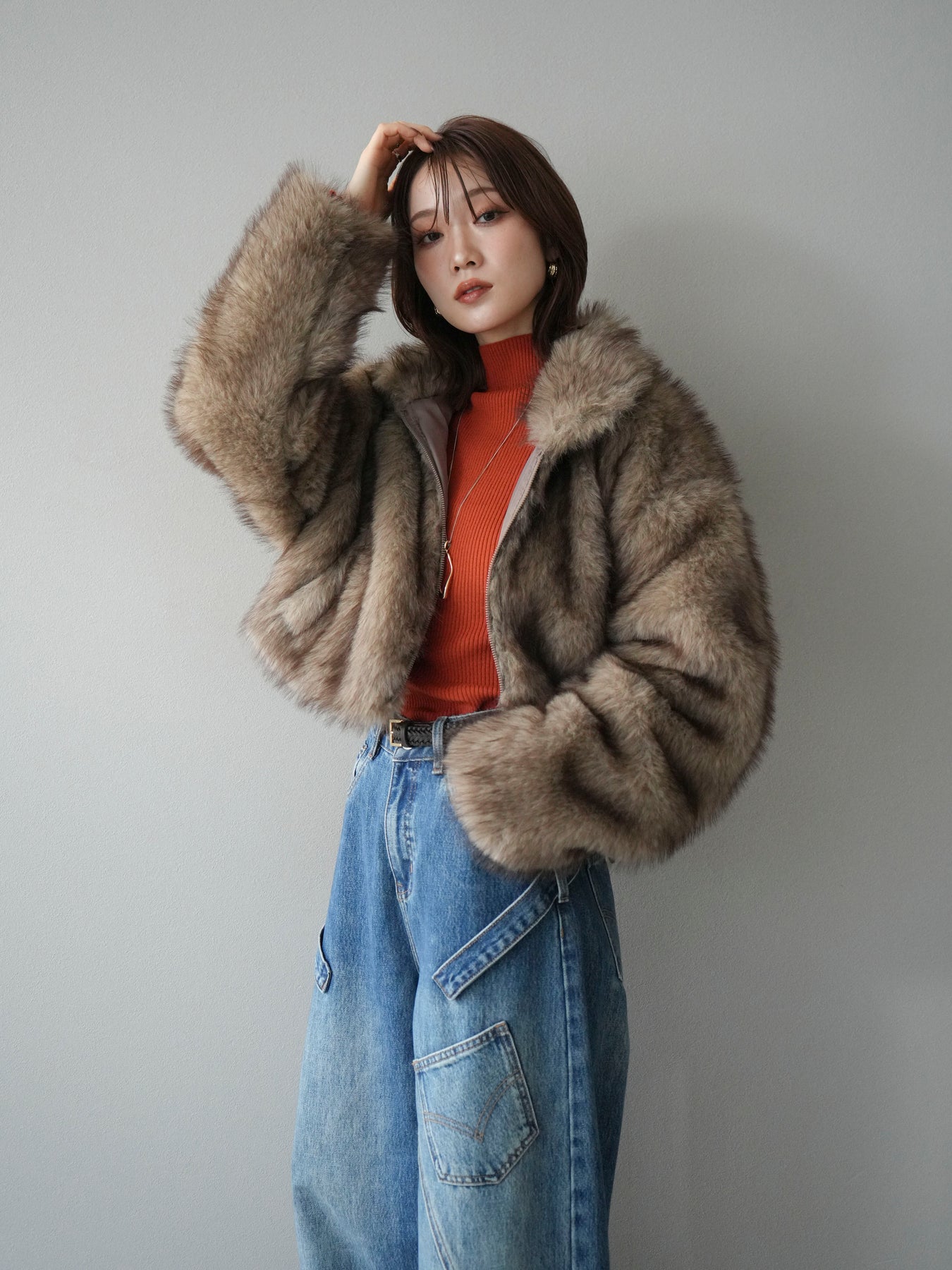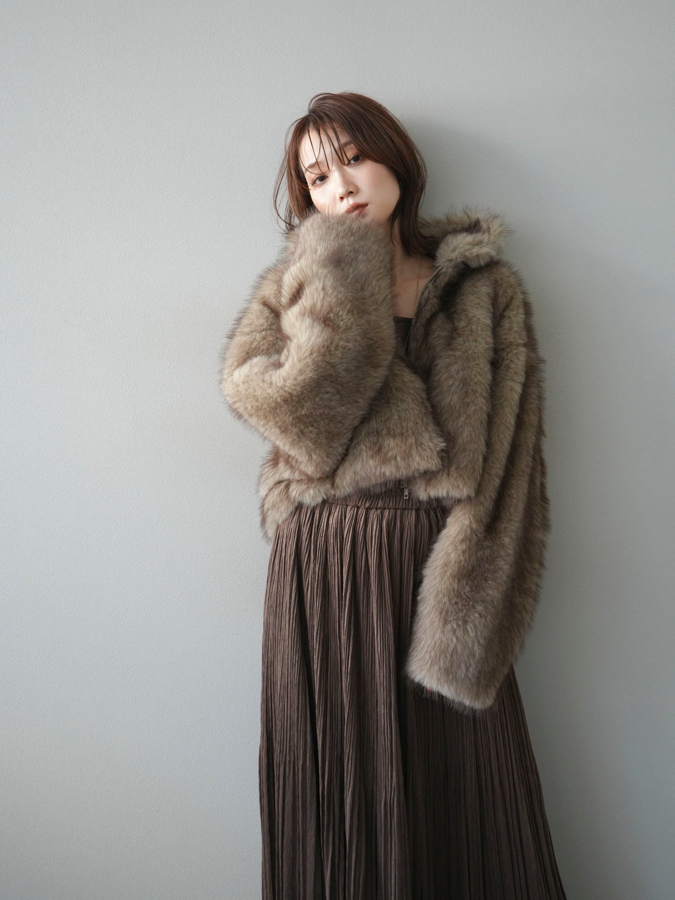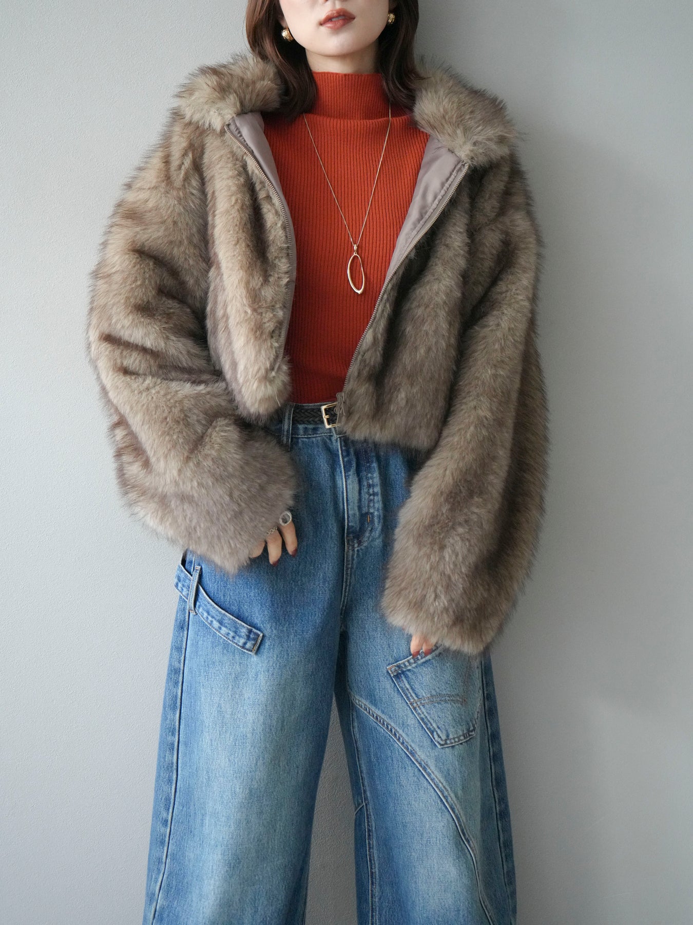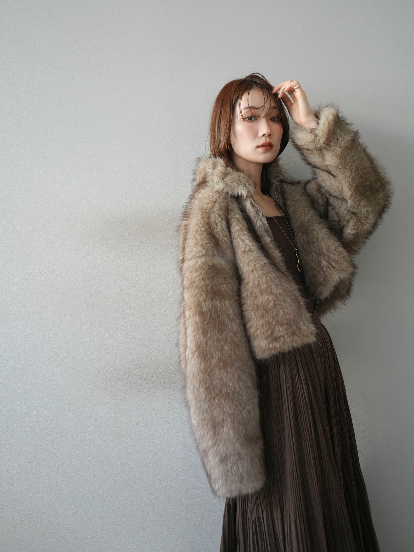 毛足の長いフェイクファーが贅沢な印象を与えるショートZIPジャケット。 ふんわりとした質感でボリューム感がありながらも、軽やかな着心地が魅力です。 コンパクトな丈感がバランスよく、ワンピースやワイドパンツなどとの相性も抜群。 フロントジップ仕様で着脱しやすく、開けて羽織るとこなれたスタイリングに仕上がります。 デイリーから特別なシーンまで、冬のコーディネートを華やかに彩る1着です。 ※ボトムス、キャミソール(インナー)以外の商品は一律でインナーは付属していません。