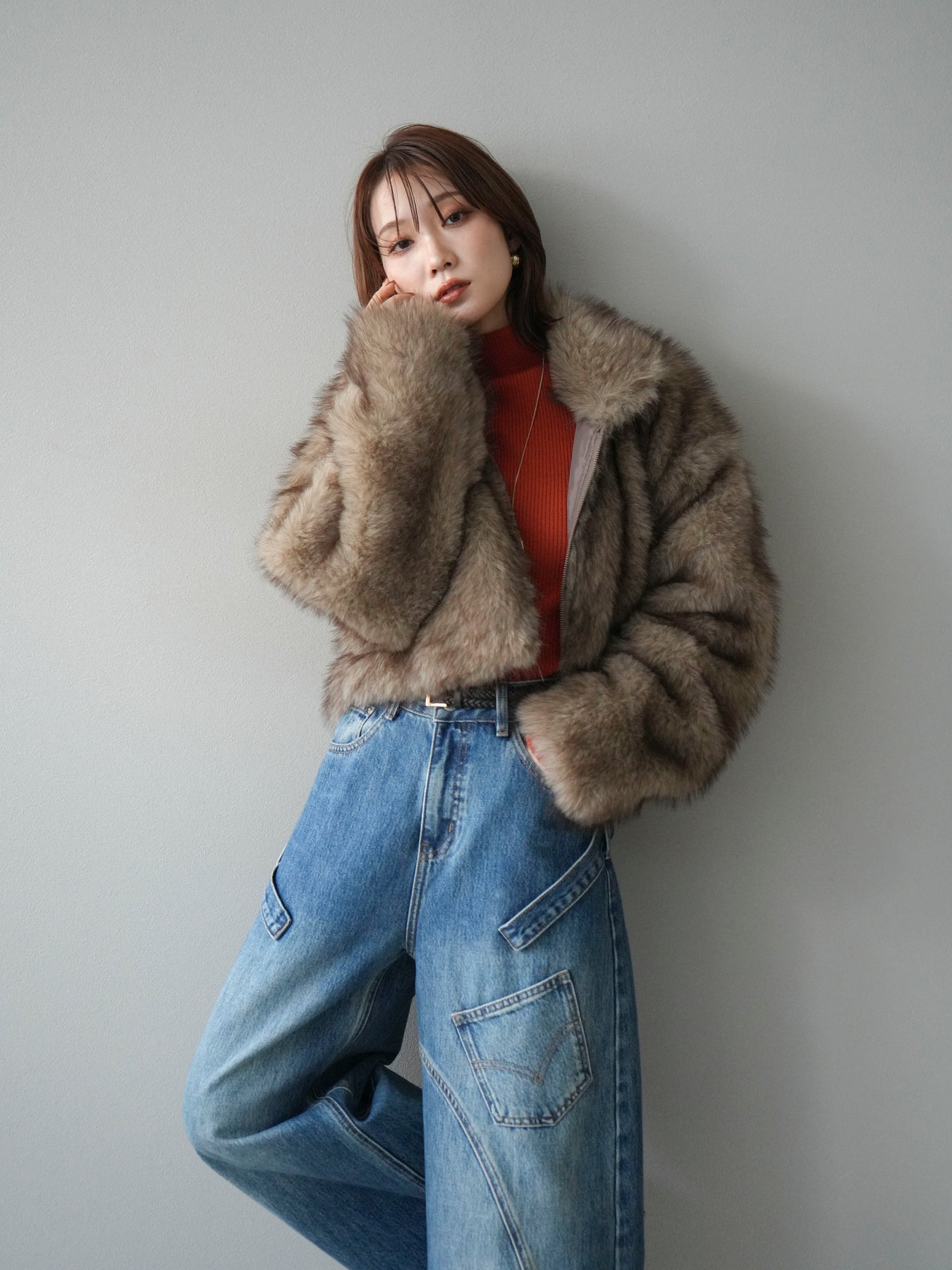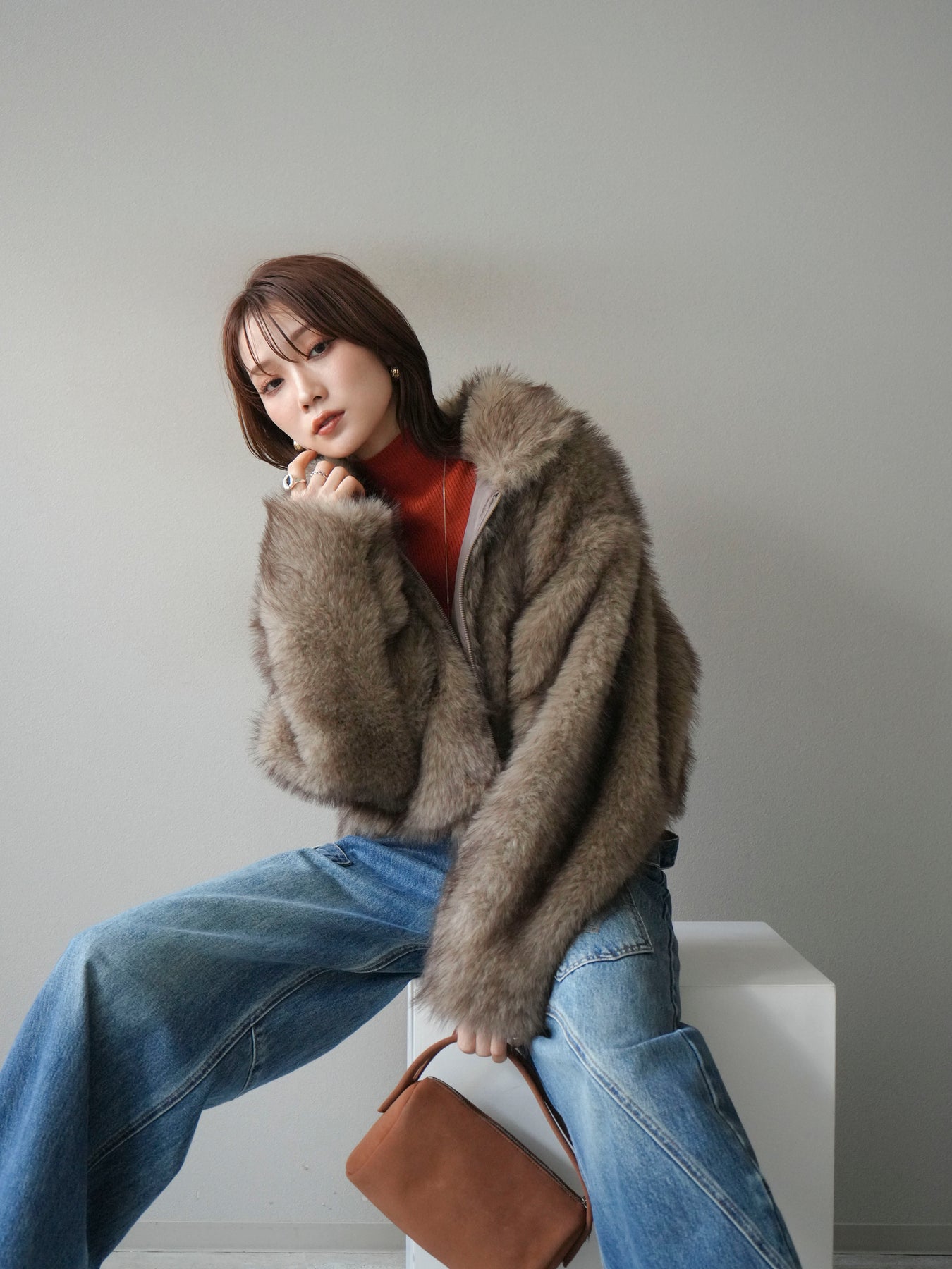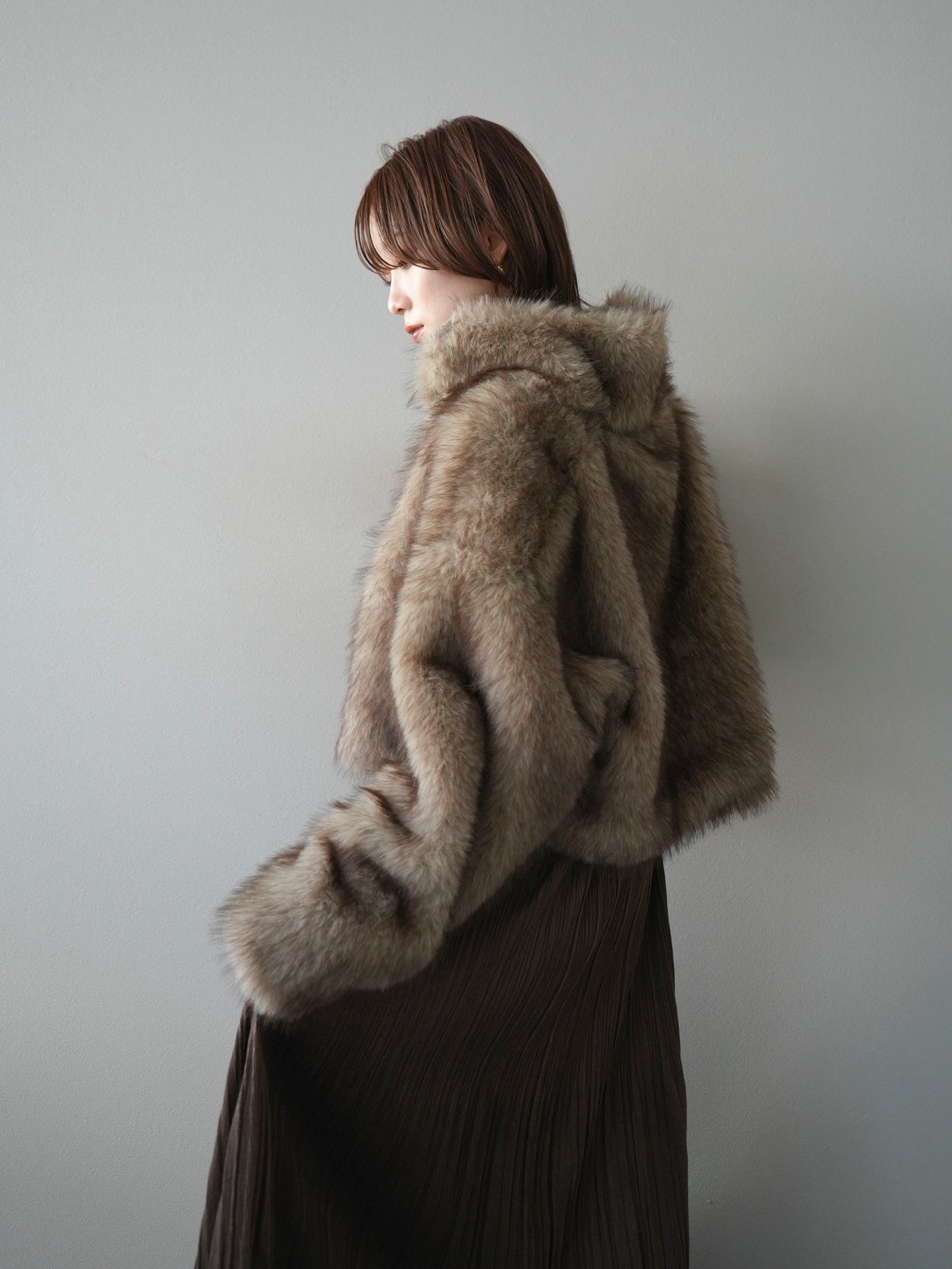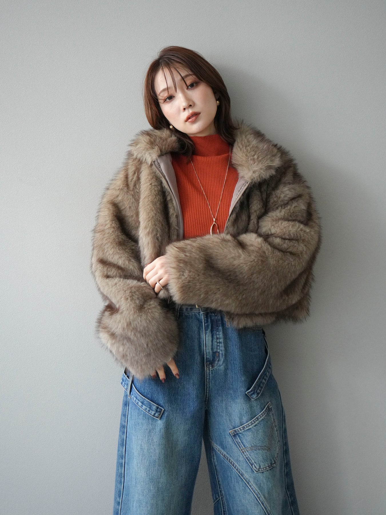 毛足の長いフェイクファーが贅沢な印象を与えるショートZIPジャケット。 ふんわりとした質感でボリューム感がありながらも、軽やかな着心地が魅力です。 コンパクトな丈感がバランスよく、ワンピースやワイドパンツなどとの相性も抜群。 フロントジップ仕様で着脱しやすく、開けて羽織るとこなれたスタイリングに仕上がります。 デイリーから特別なシーンまで、冬のコーディネートを華やかに彩る1着です。 ※ボトムス、キャミソール(インナー)以外の商品は一律でインナーは付属していません。