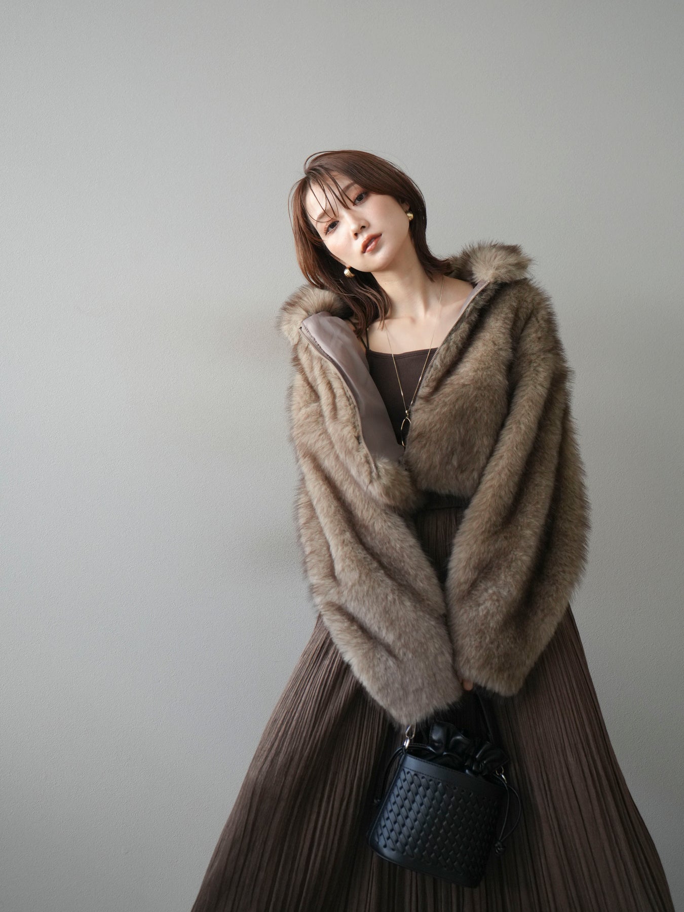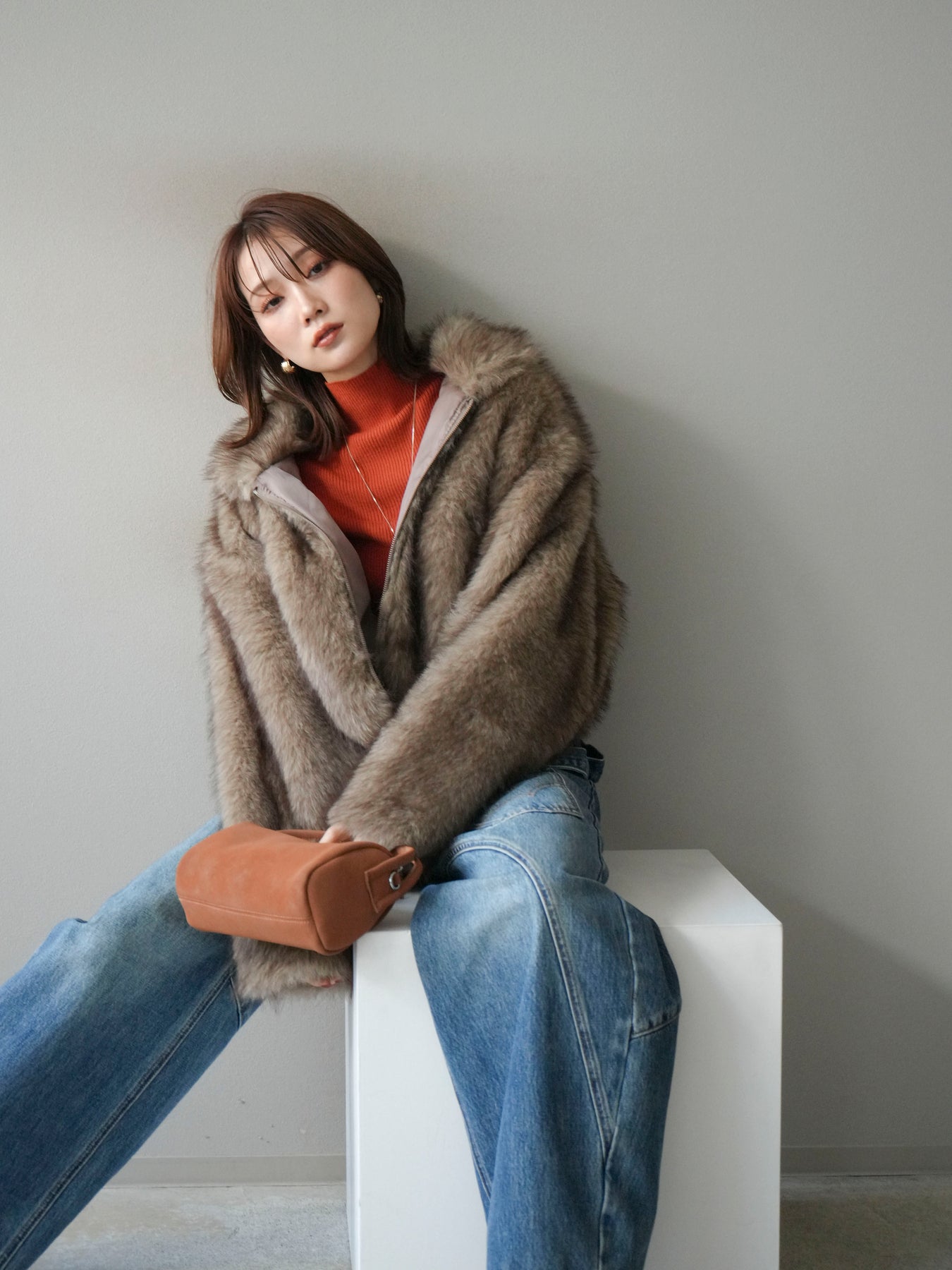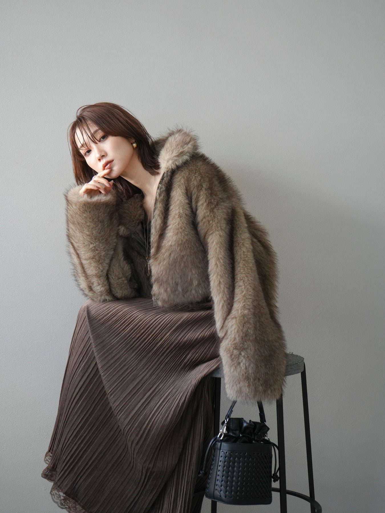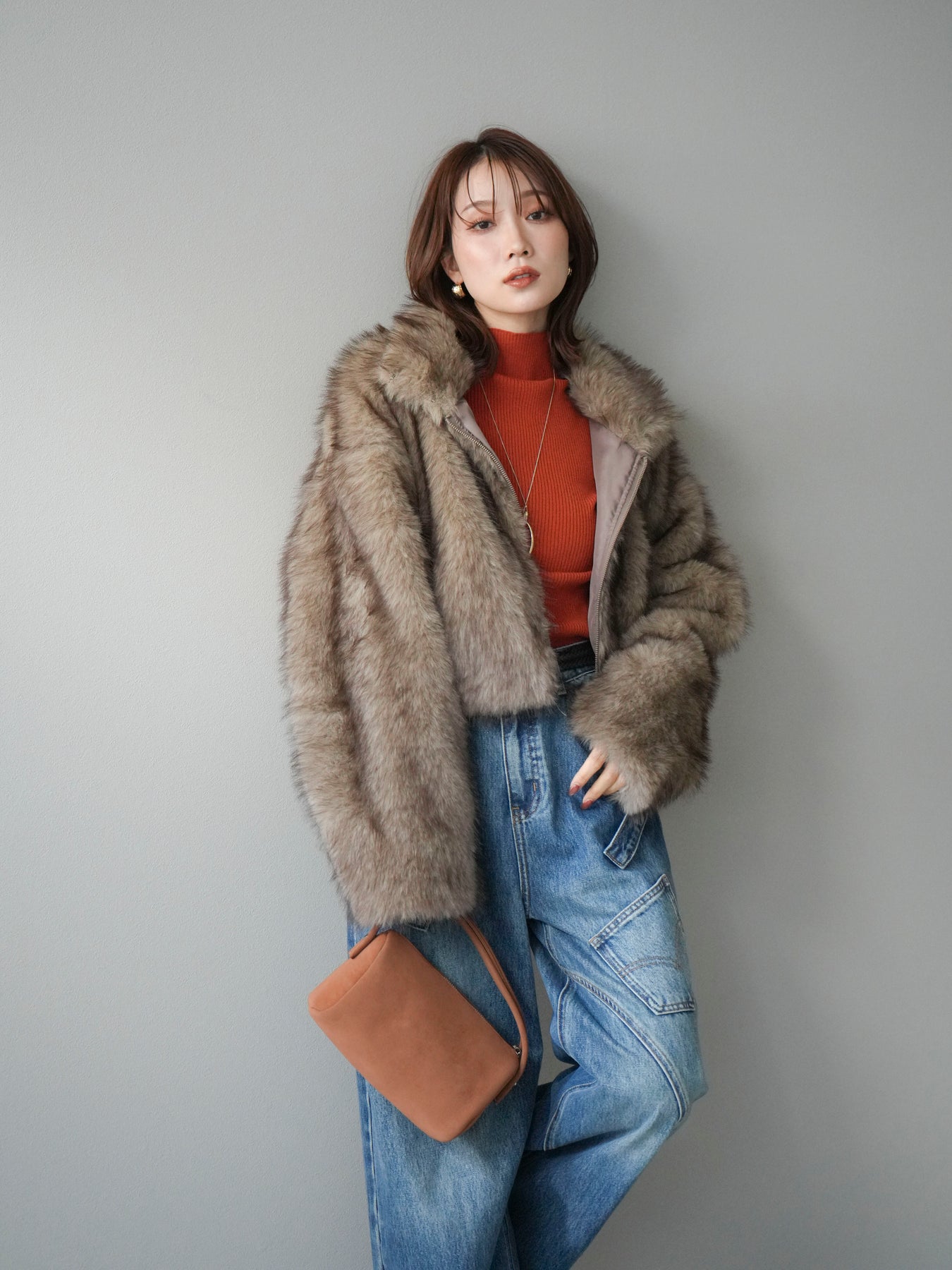 毛足の長いフェイクファーが贅沢な印象を与えるショートZIPジャケット。 ふんわりとした質感でボリューム感がありながらも、軽やかな着心地が魅力です。 コンパクトな丈感がバランスよく、ワンピースやワイドパンツなどとの相性も抜群。 フロントジップ仕様で着脱しやすく、開けて羽織るとこなれたスタイリングに仕上がります。 デイリーから特別なシーンまで、冬のコーディネートを華やかに彩る1着です。 ※ボトムス、キャミソール(インナー)以外の商品は一律でインナーは付属していません。