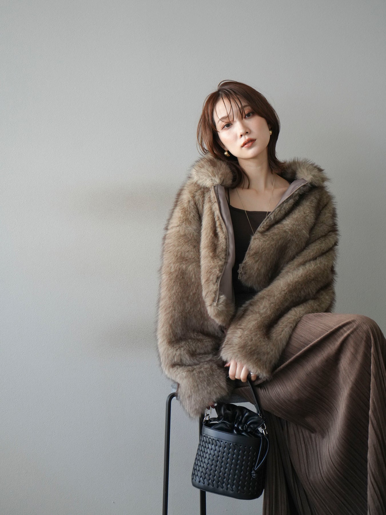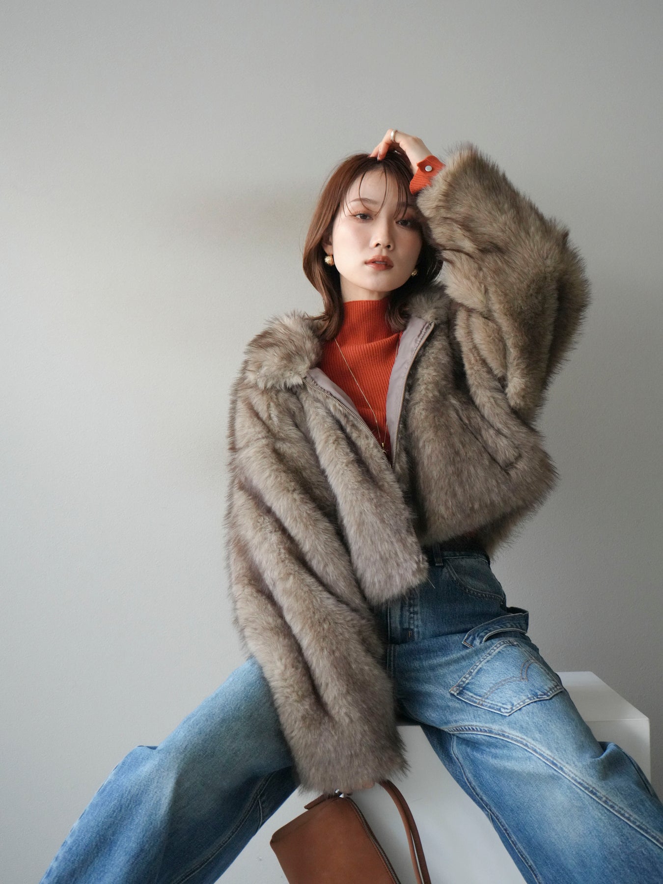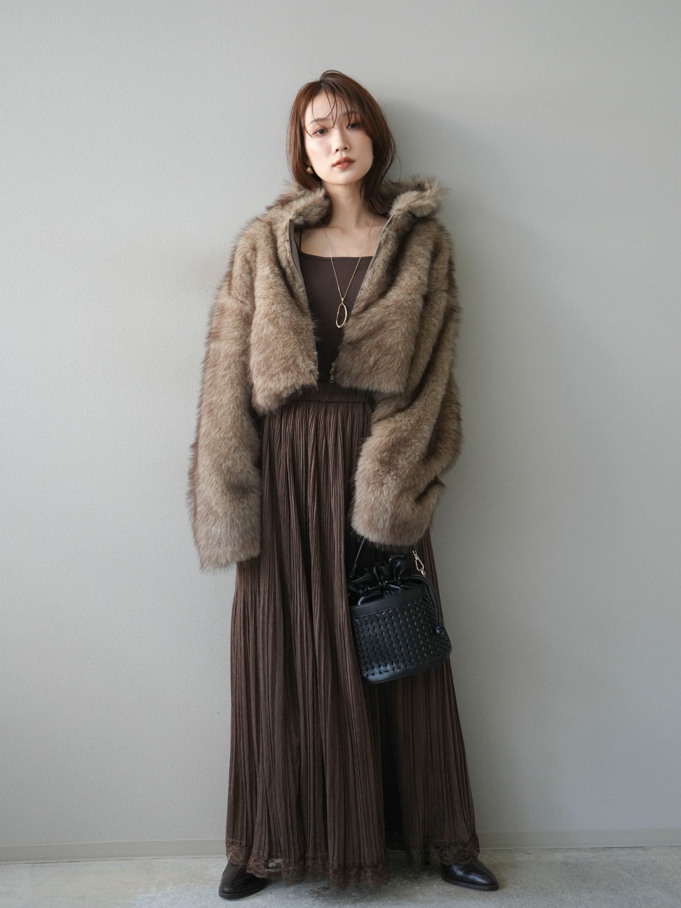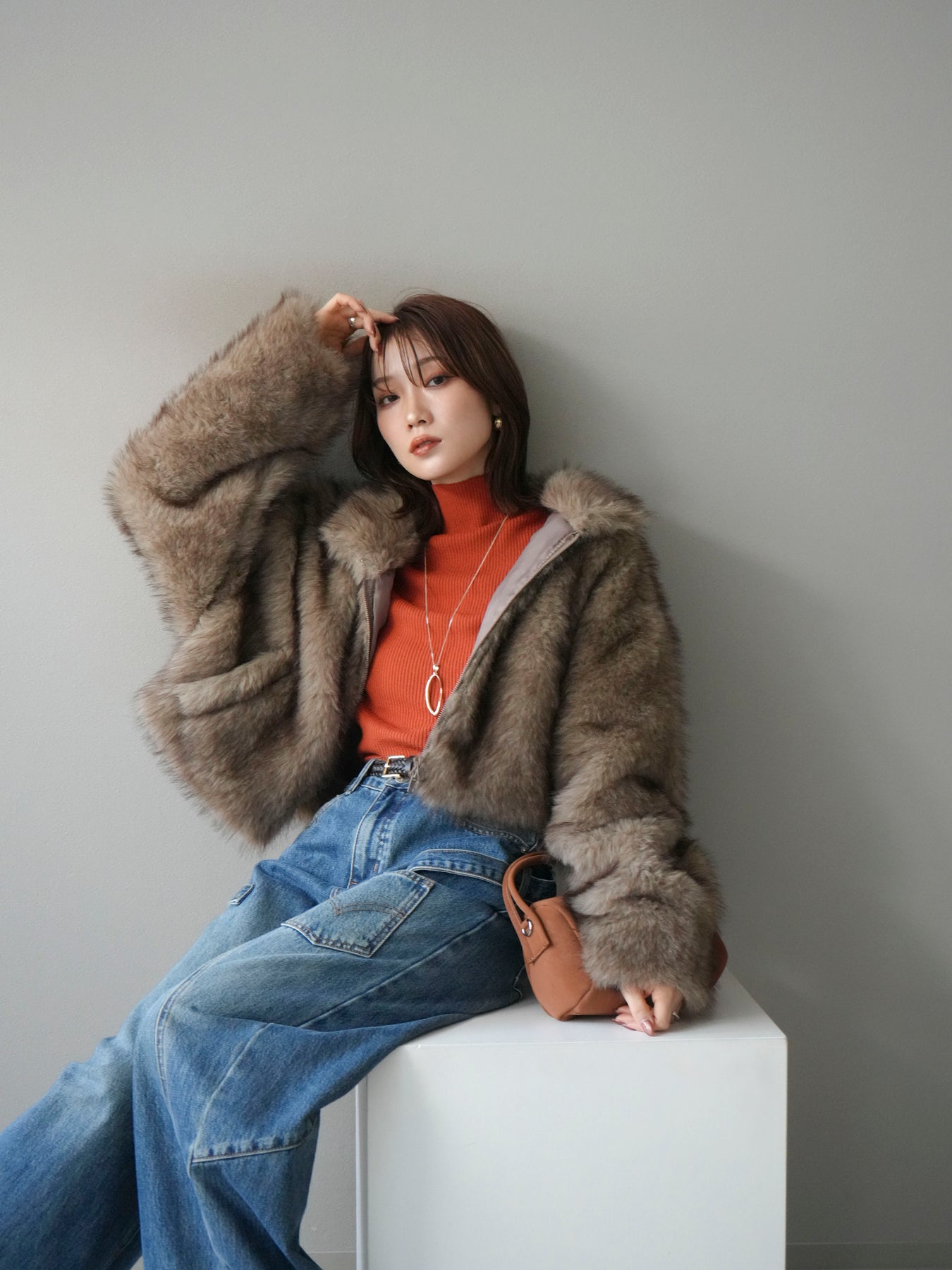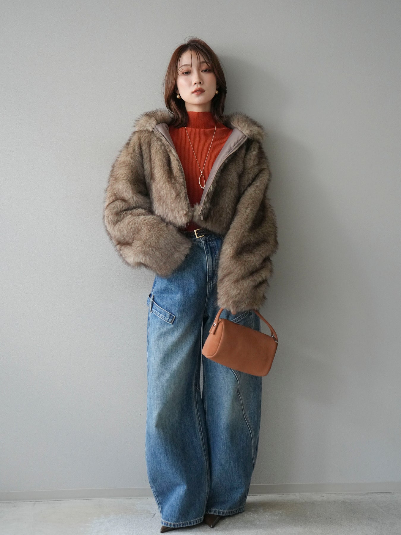 毛足の長いフェイクファーが贅沢な印象を与えるショートZIPジャケット。 ふんわりとした質感でボリューム感がありながらも、軽やかな着心地が魅力です。 コンパクトな丈感がバランスよく、ワンピースやワイドパンツなどとの相性も抜群。 フロントジップ仕様で着脱しやすく、開けて羽織るとこなれたスタイリングに仕上がります。 デイリーから特別なシーンまで、冬のコーディネートを華やかに彩る1着です。 ※ボトムス、キャミソール(インナー)以外の商品は一律でインナーは付属していません。
