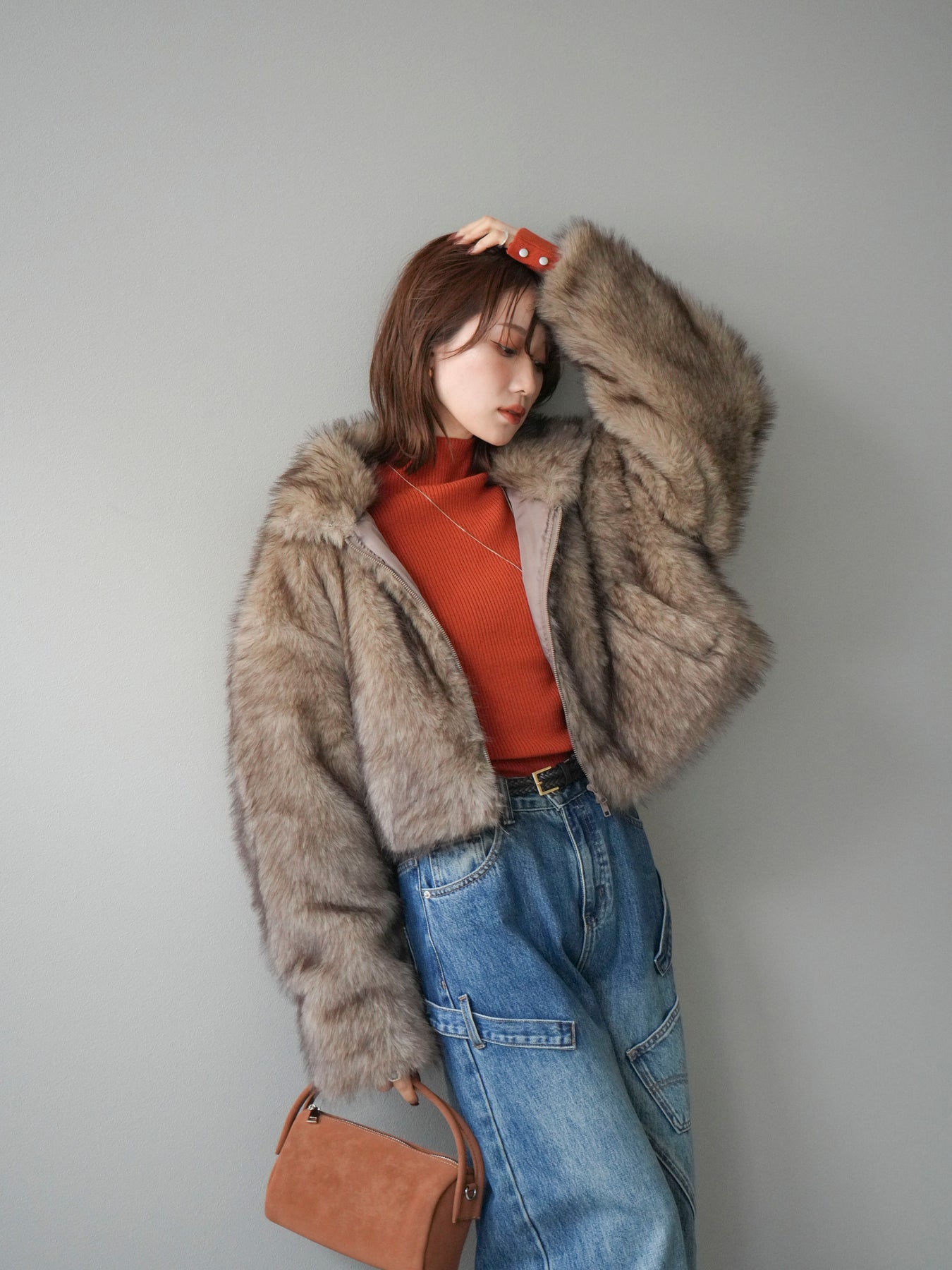 [予約]フェイクファーショートZIPジャケット/brownmix