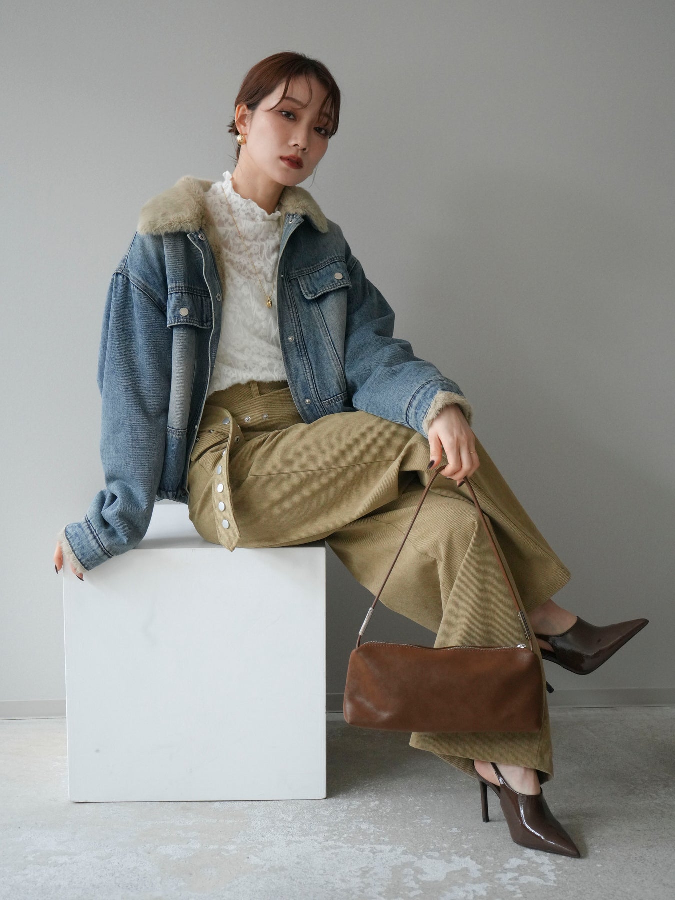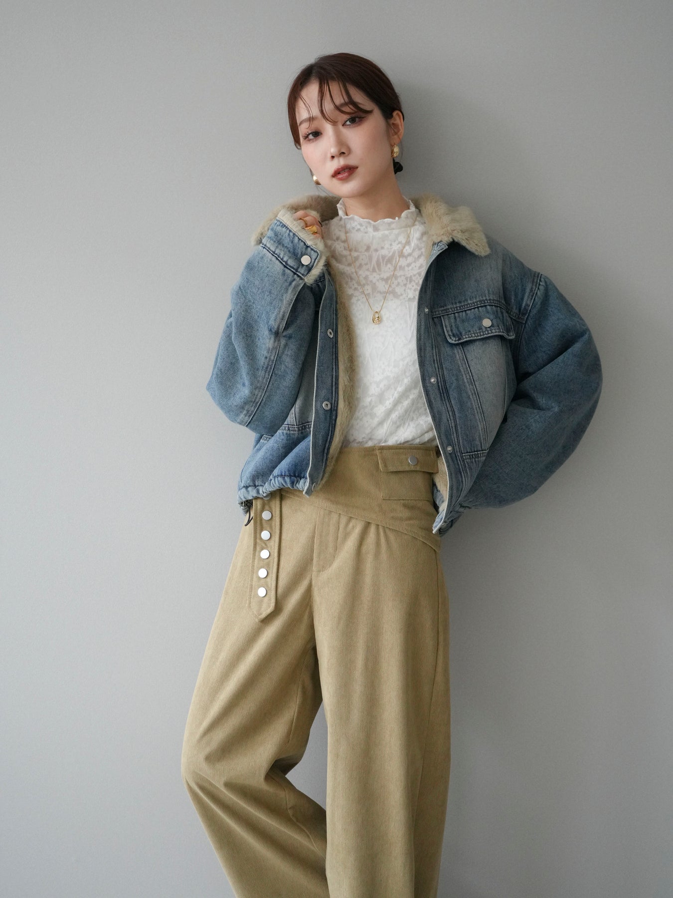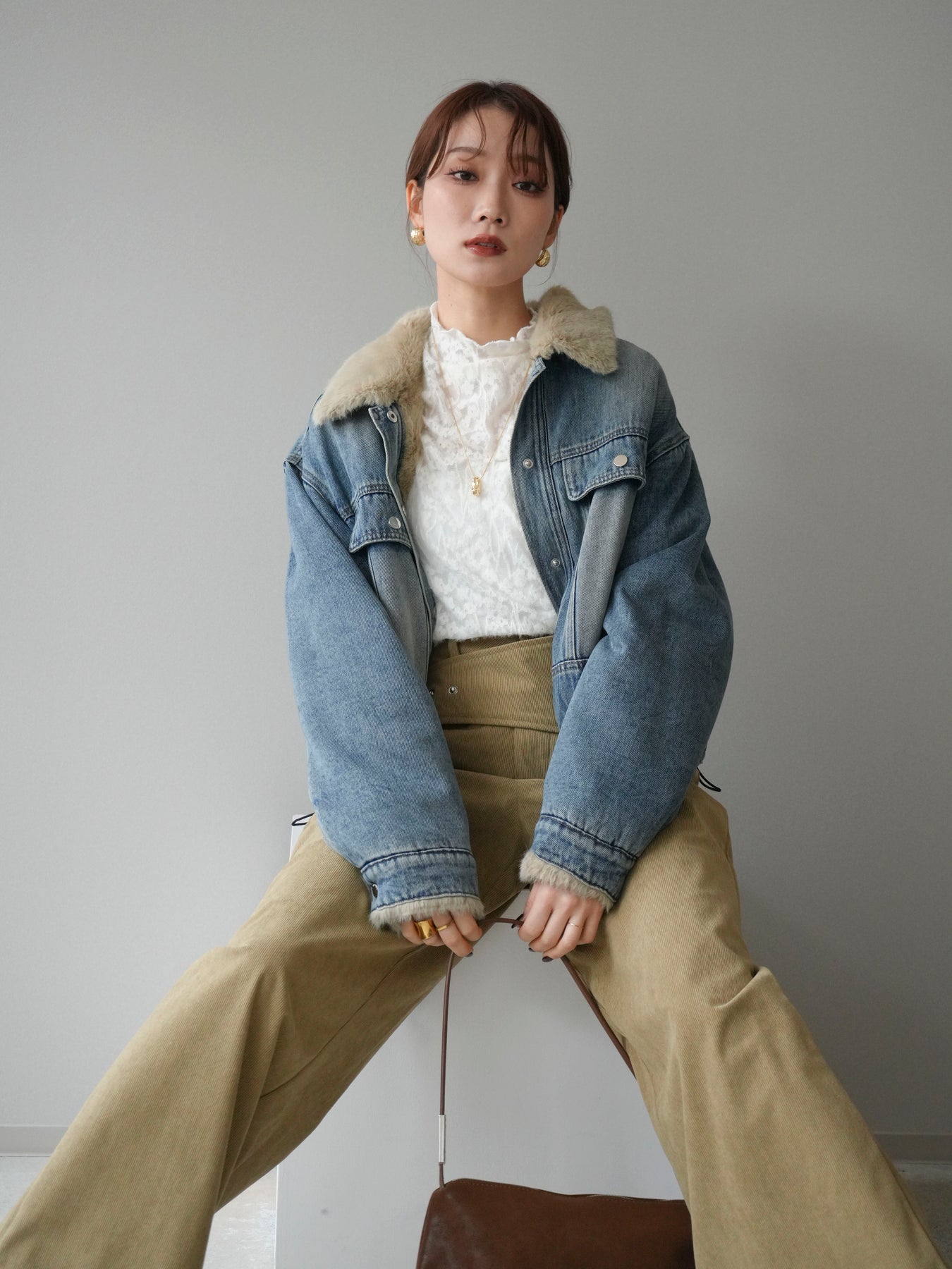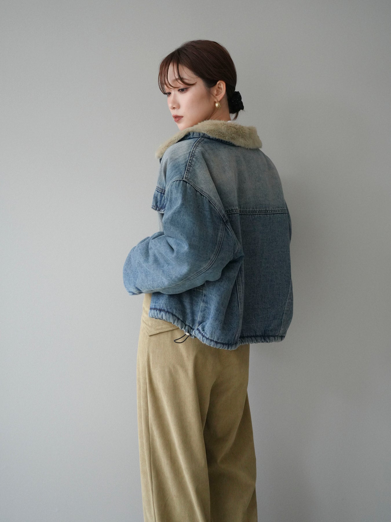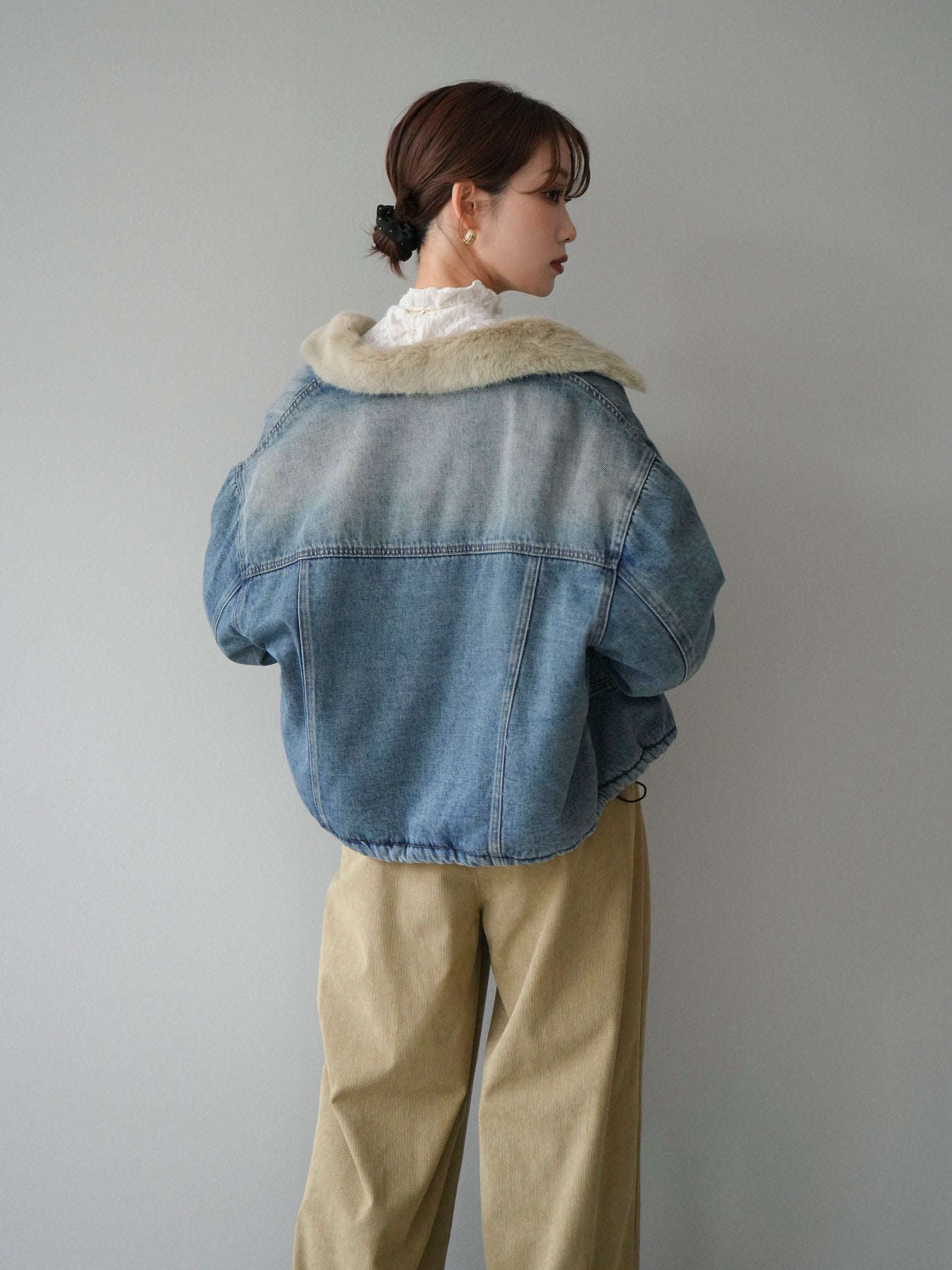 ふんわりとしたファーカラーが目を惹く、デニム素材のショートジャケット。 ヴィンテージライクな風合いのデニムに、ボリュームのあるファーを組み合わせることで、上品さとカジュアルさを両立。 コンパクトな丈感がスタイルアップを叶え、ボトムを選ばずバランスよく着こなせます。 内側までふわりとしたファー仕様で、暖かさと軽やかな着心地を兼ね備えた一枚。 羽織るだけでシーズンムードを高めてくれる、主役級のアウターです。 ※ボトムス、キャミソール(インナー)以外の商品は一律でインナーは付属していません。