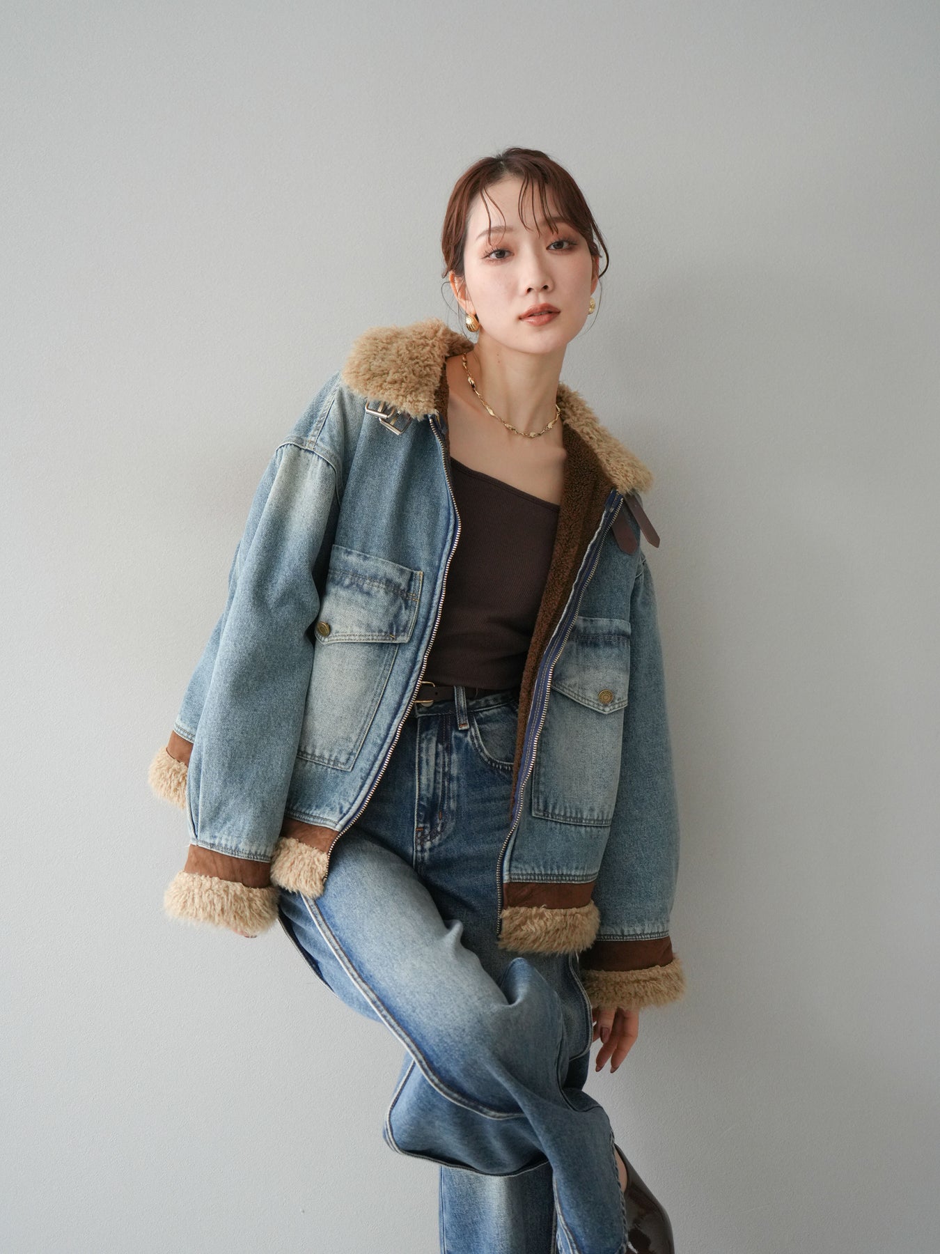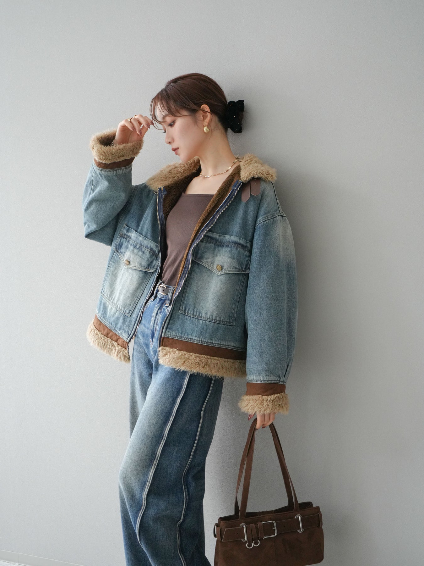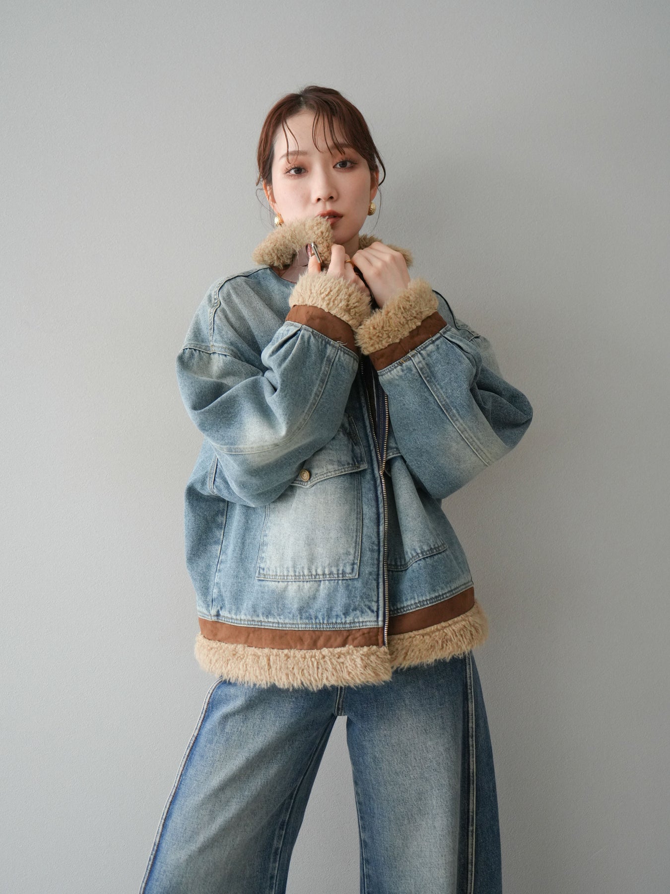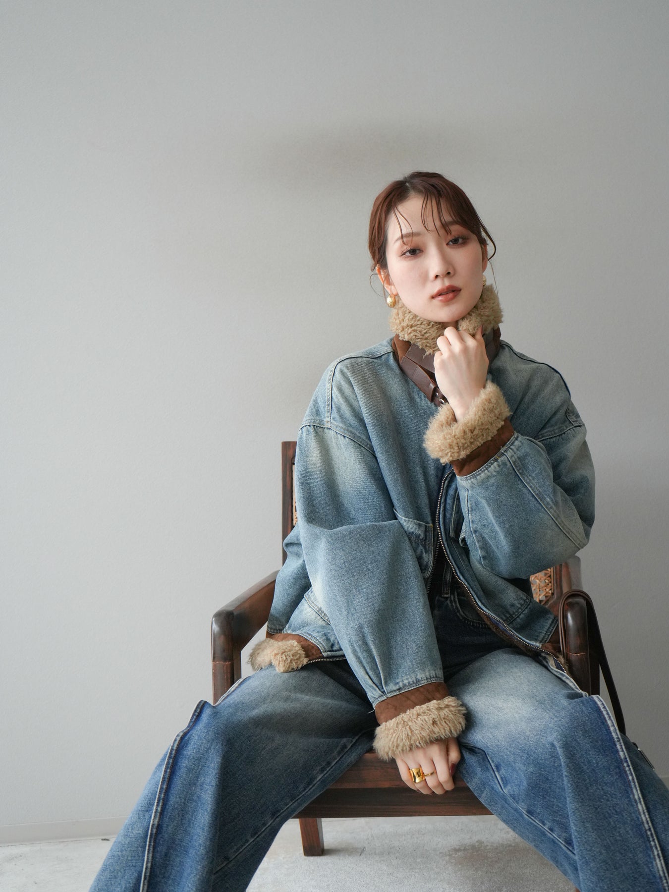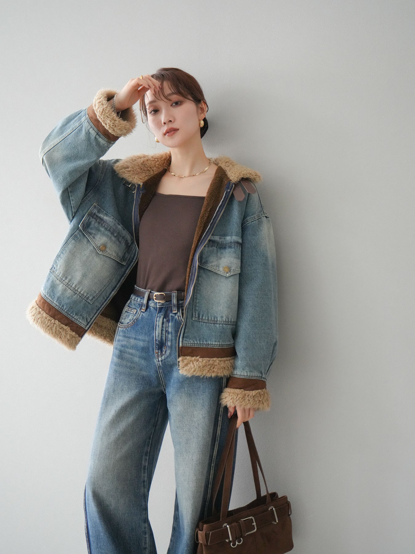 ボアファーとデニムを組み合わせた異素材ミックスが魅力のスタンドカラージャケット。 ヴィンテージライクな色落ちデニムに、ふんわりとしたファーがシーズンムードを高めます。 程よくゆとりのあるシルエットで、インナーを重ねてももたつかず快適な着心地。 首元まで暖かいスタンドカラー仕様で、デザイン性と防寒性を兼ね備えています。 カジュアルからフェミニンまで、どんなコーデにもマッチする万能アウターです。 ※ボトムス、キャミソール(インナー)以外の商品は一律でインナーは付属していません。
