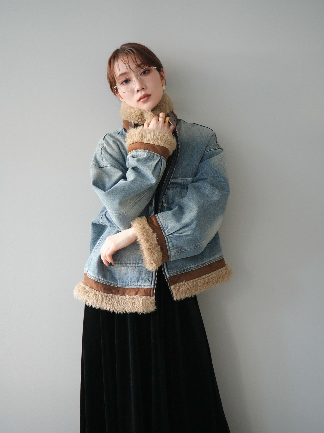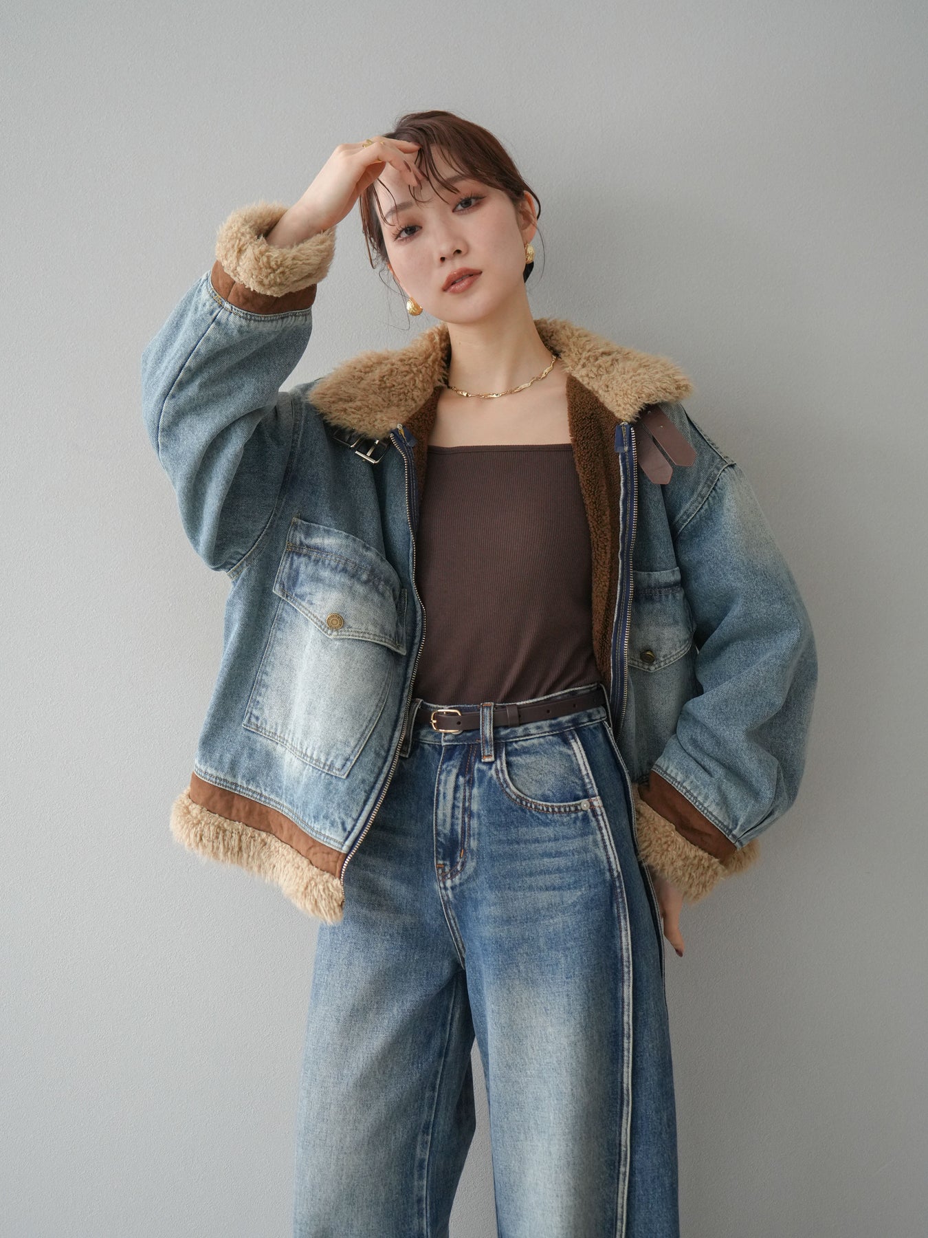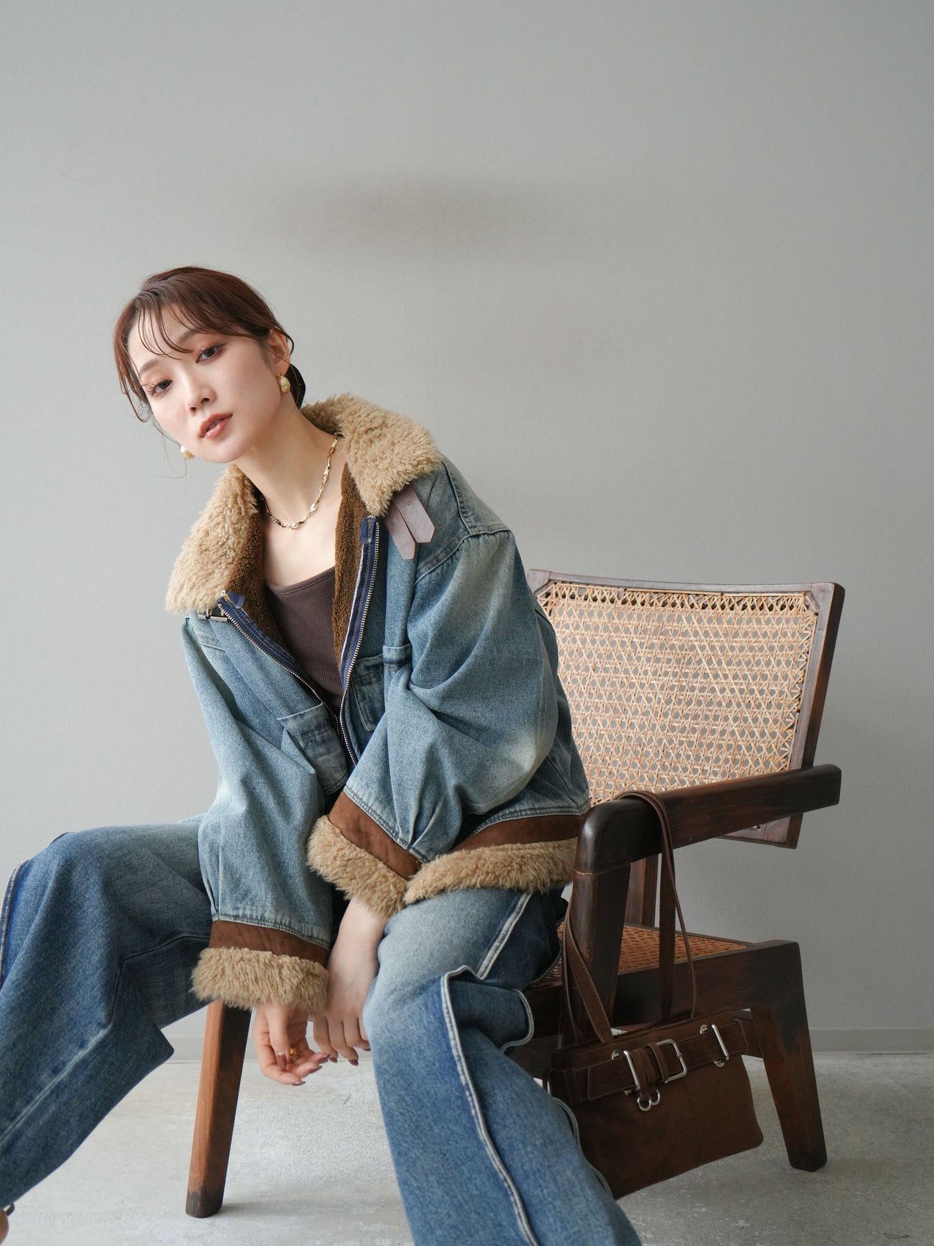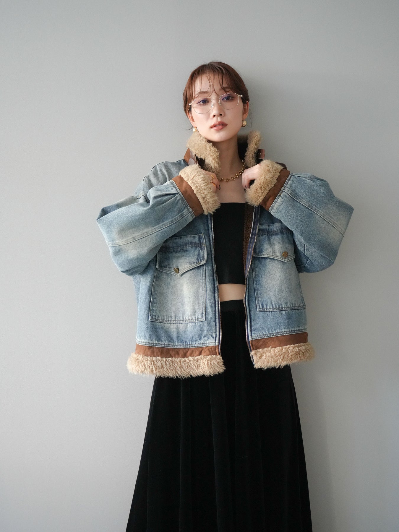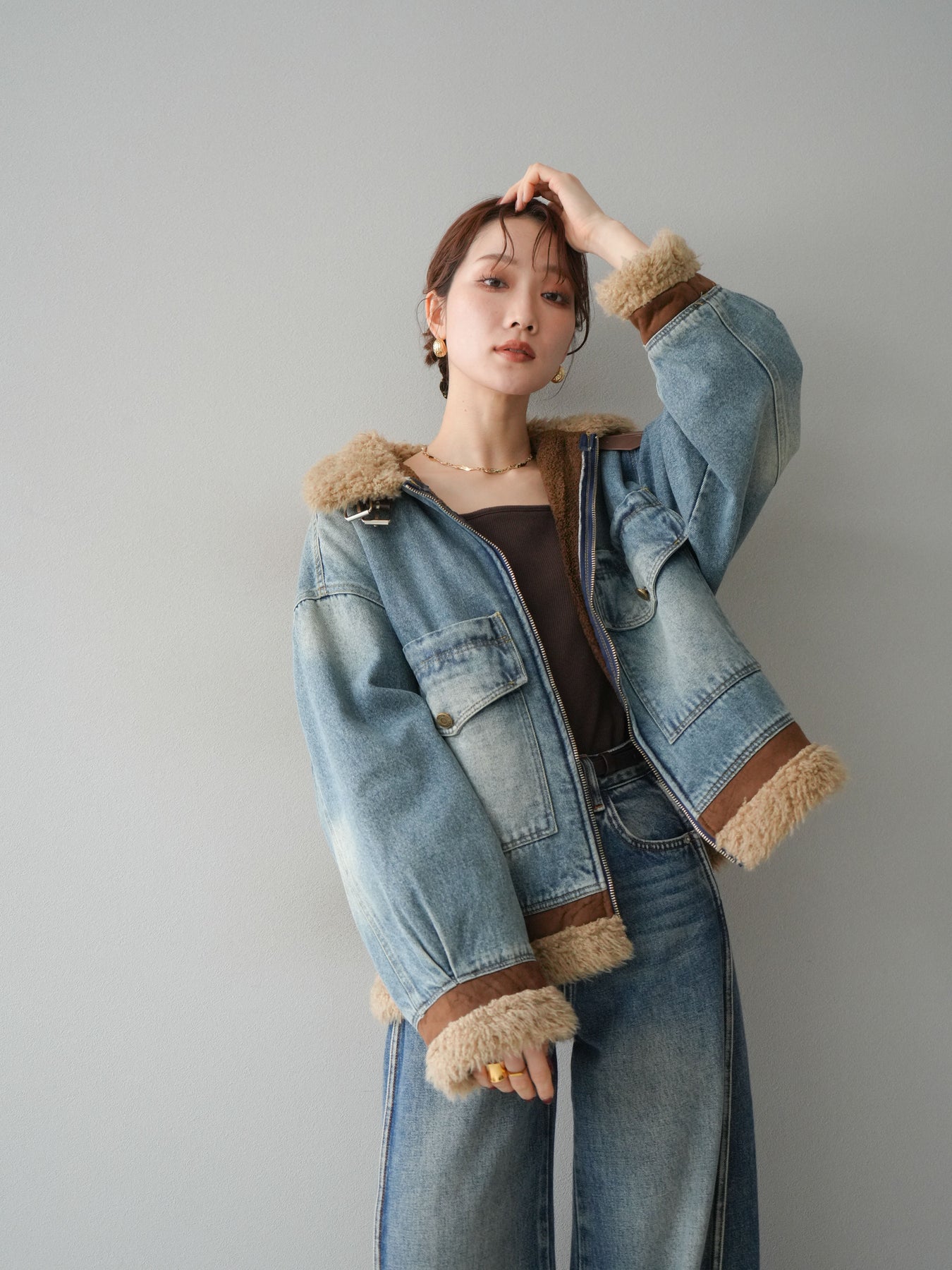 ボアファーとデニムを組み合わせた異素材ミックスが魅力のスタンドカラージャケット。 ヴィンテージライクな色落ちデニムに、ふんわりとしたファーがシーズンムードを高めます。 程よくゆとりのあるシルエットで、インナーを重ねてももたつかず快適な着心地。 首元まで暖かいスタンドカラー仕様で、デザイン性と防寒性を兼ね備えています。 カジュアルからフェミニンまで、どんなコーデにもマッチする万能アウターです。 ※ボトムス、キャミソール(インナー)以外の商品は一律でインナーは付属していません。