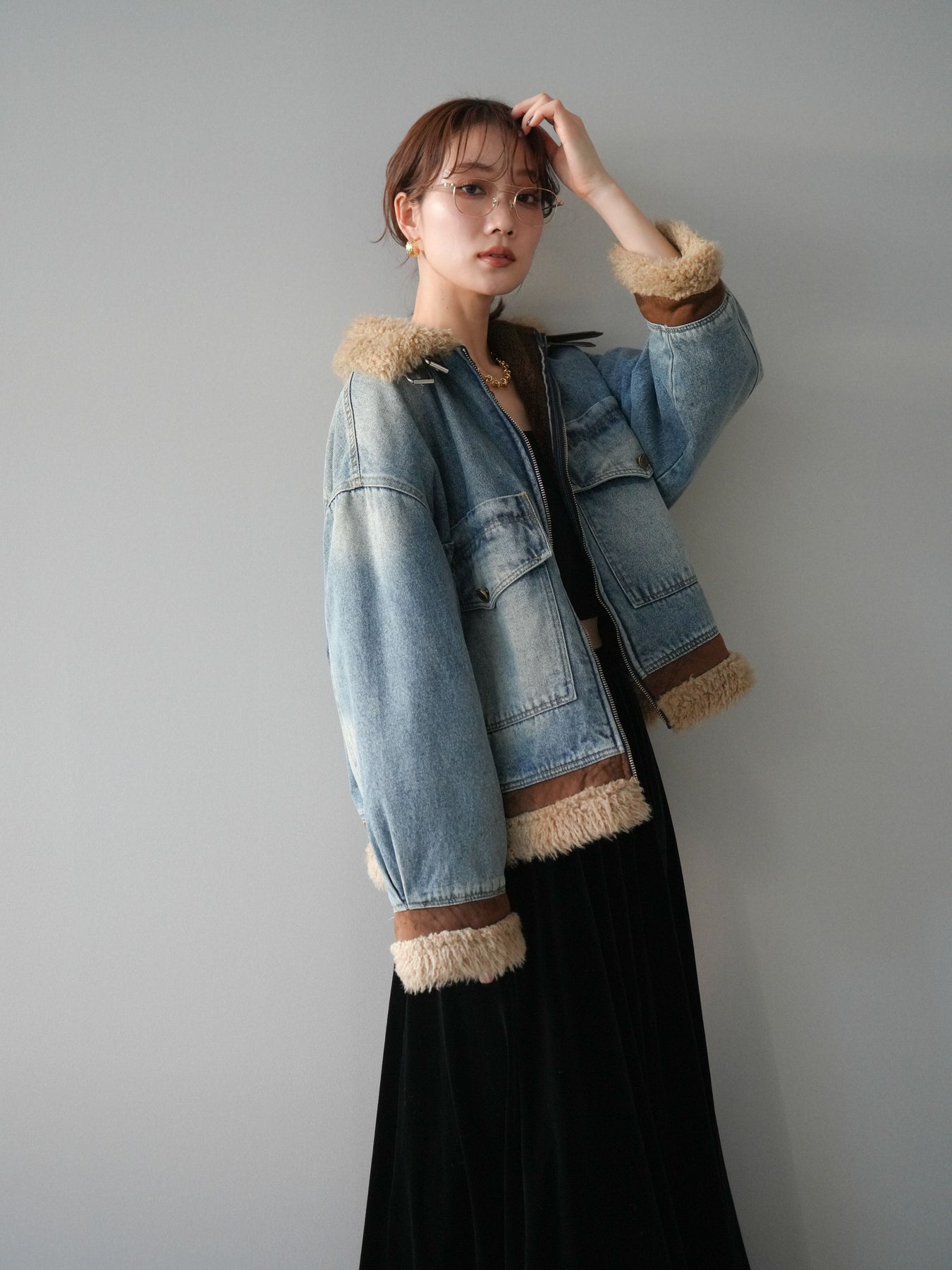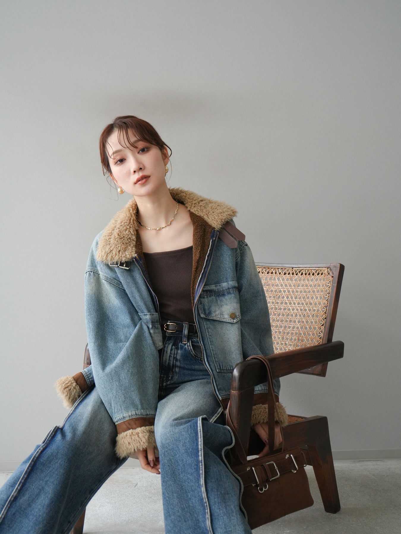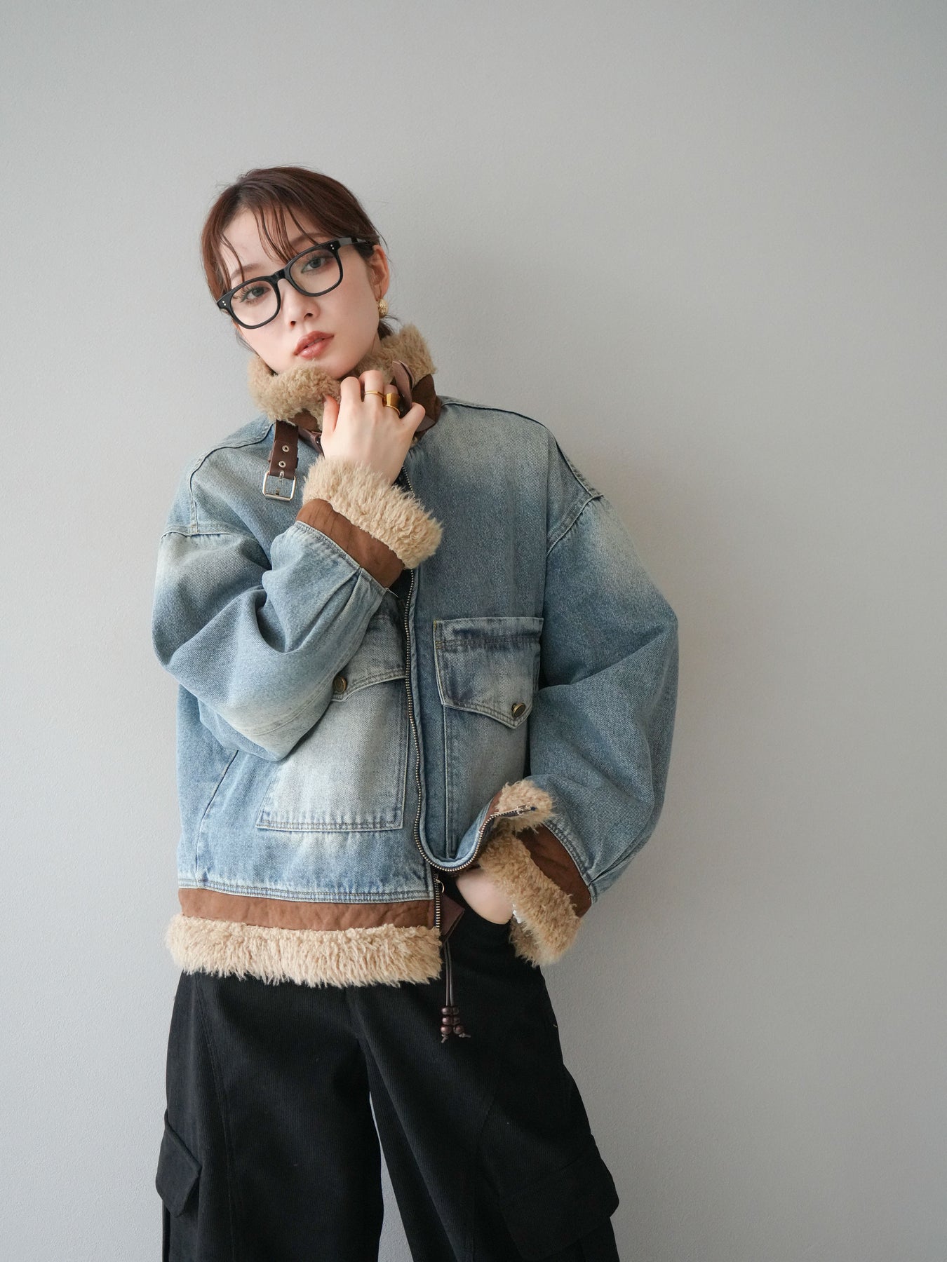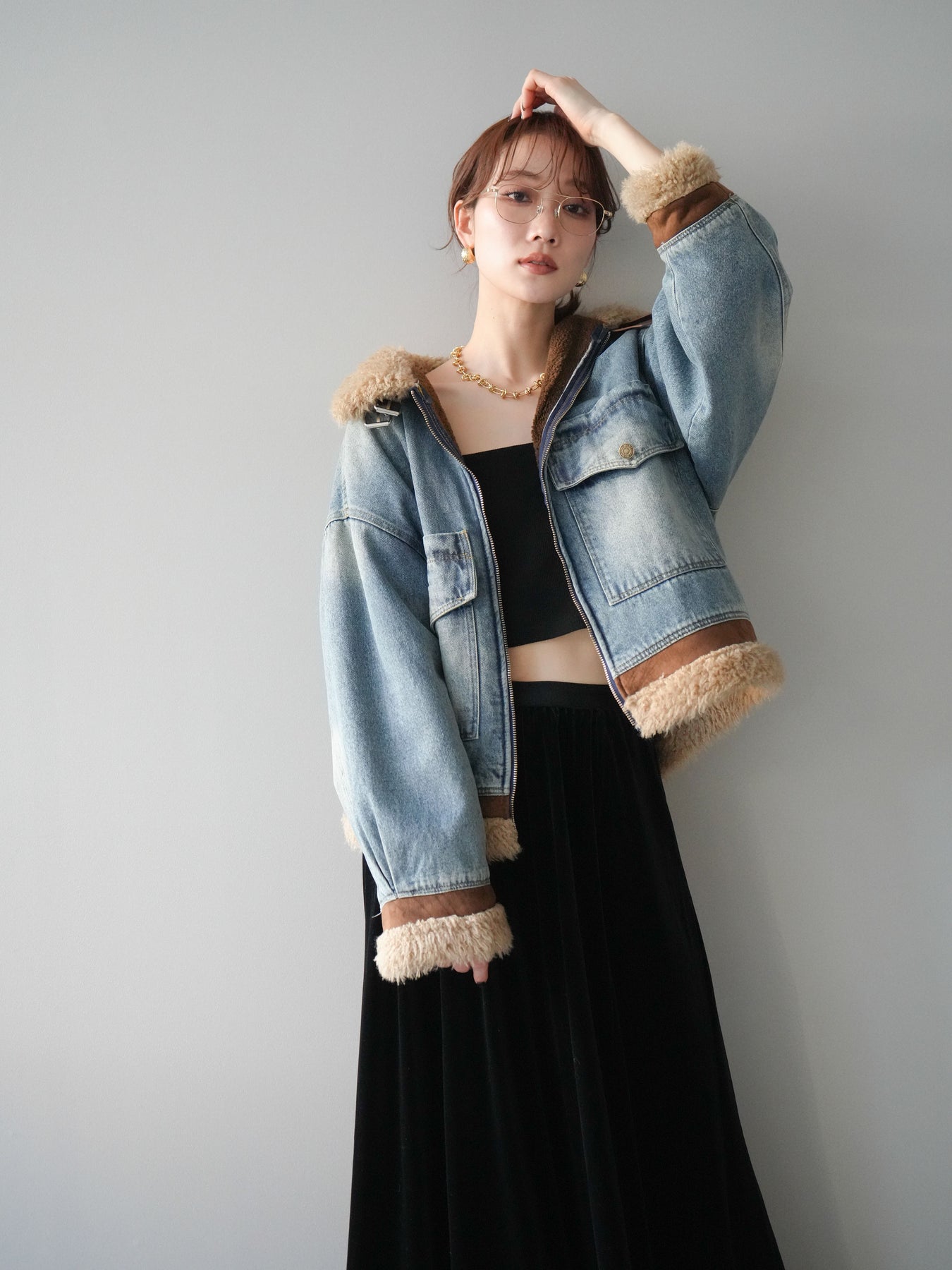 ボアファーとデニムを組み合わせた異素材ミックスが魅力のスタンドカラージャケット。 ヴィンテージライクな色落ちデニムに、ふんわりとしたファーがシーズンムードを高めます。 程よくゆとりのあるシルエットで、インナーを重ねてももたつかず快適な着心地。 首元まで暖かいスタンドカラー仕様で、デザイン性と防寒性を兼ね備えています。 カジュアルからフェミニンまで、どんなコーデにもマッチする万能アウターです。 ※ボトムス、キャミソール(インナー)以外の商品は一律でインナーは付属していません。