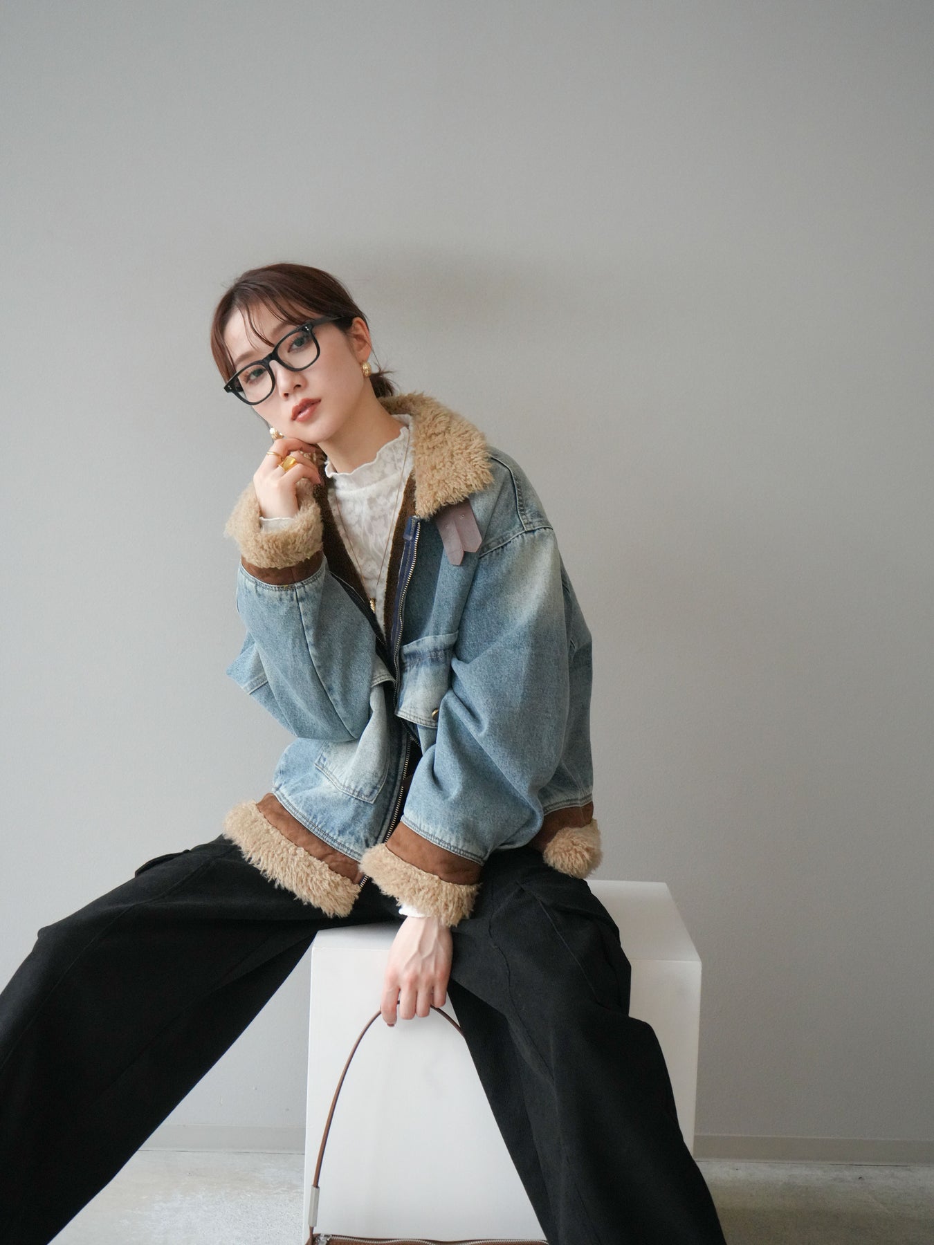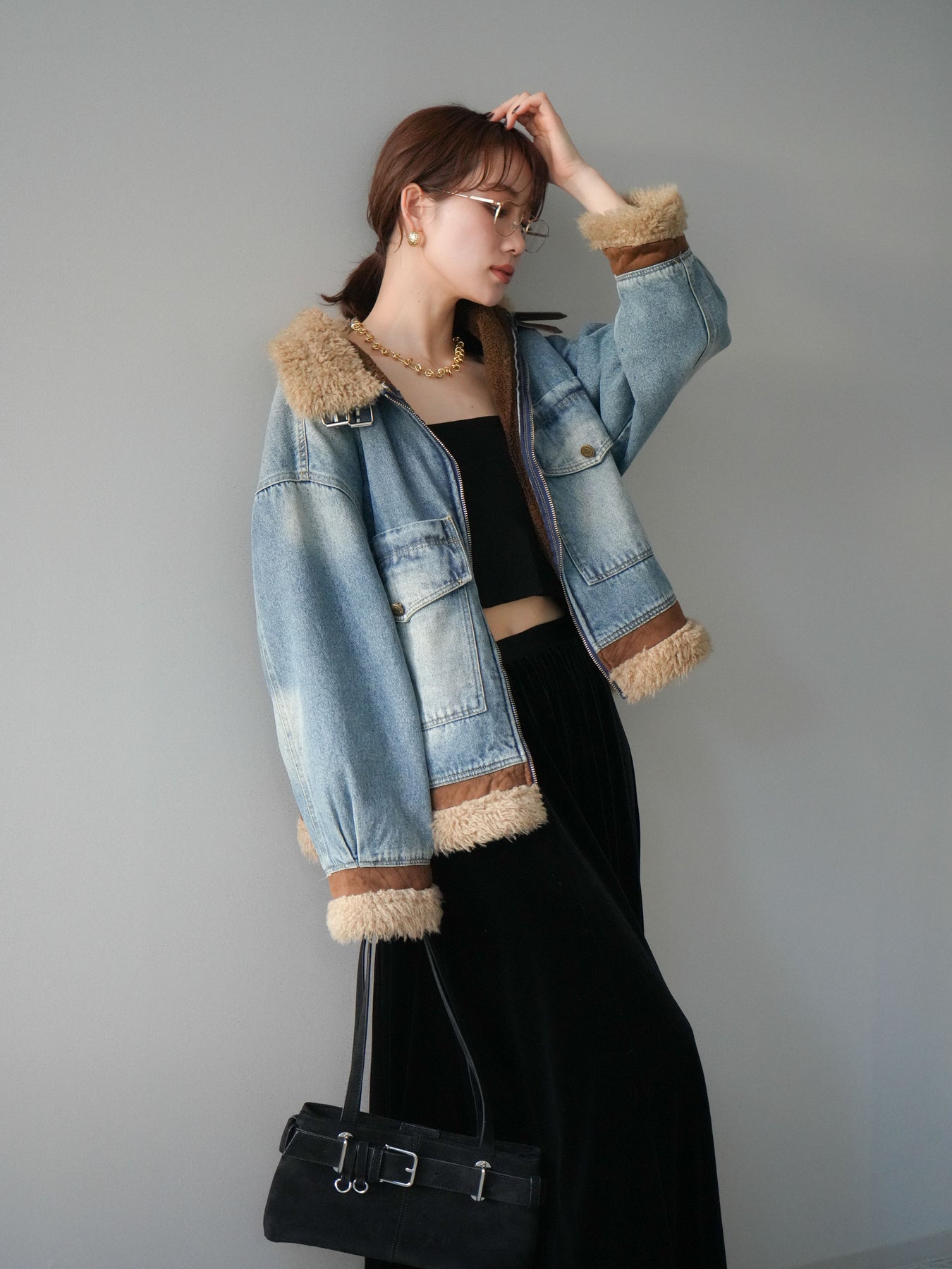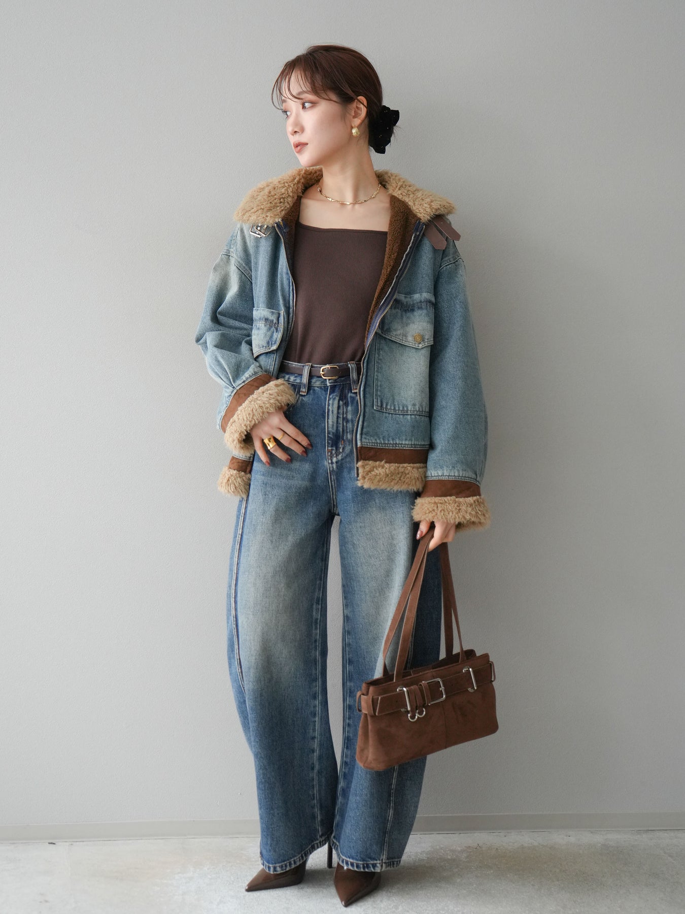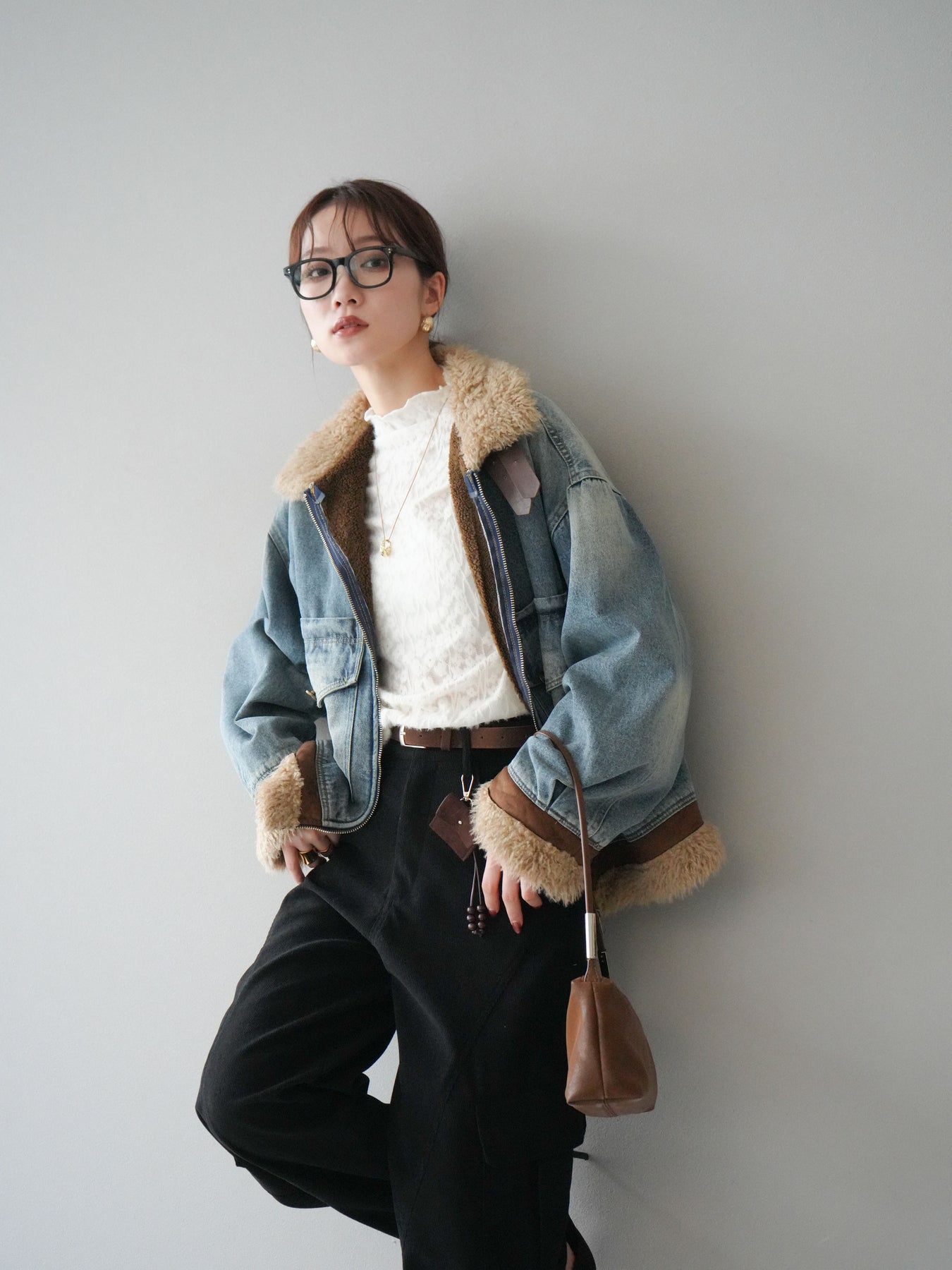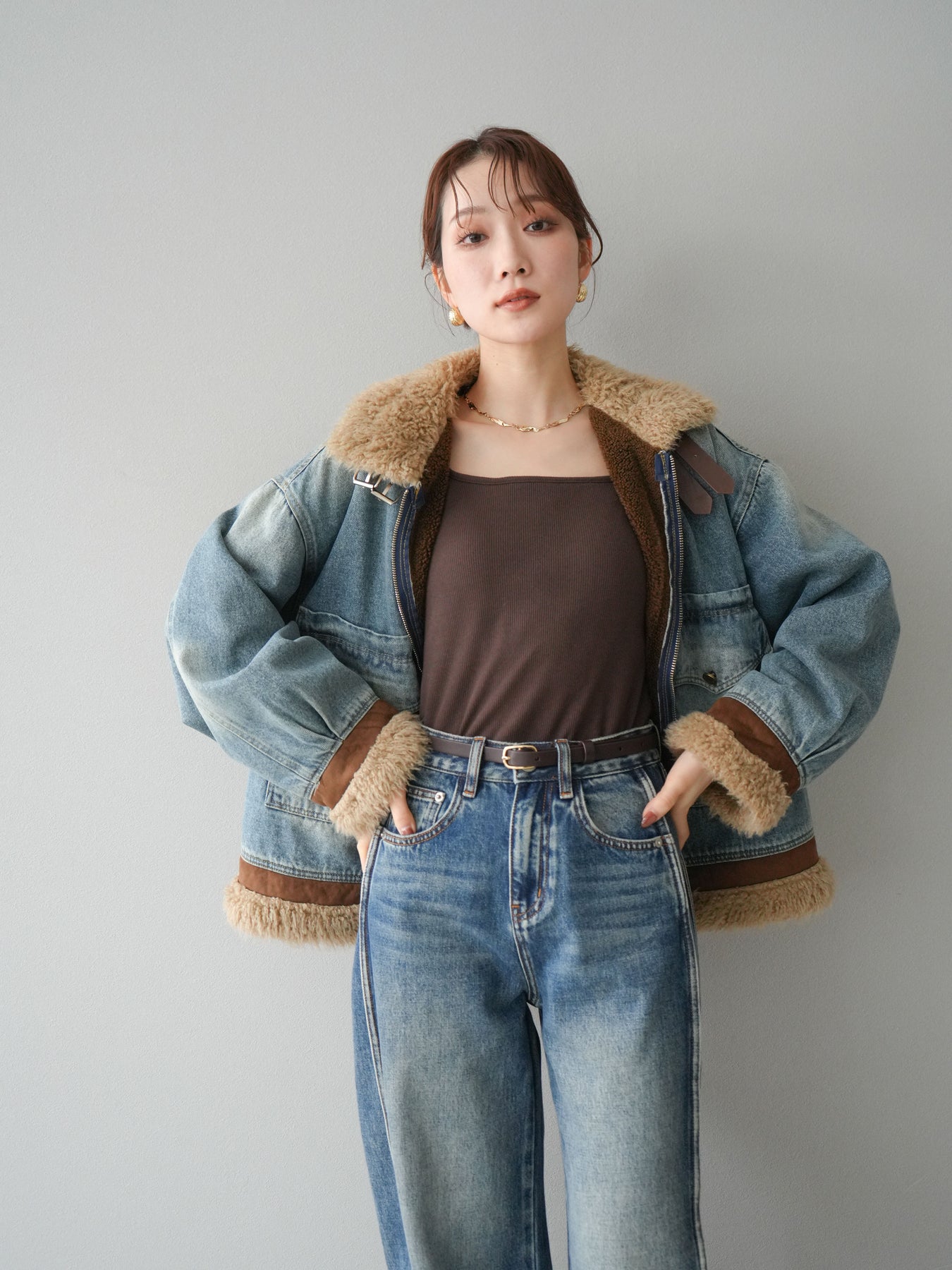 ボアファーとデニムを組み合わせた異素材ミックスが魅力のスタンドカラージャケット。 ヴィンテージライクな色落ちデニムに、ふんわりとしたファーがシーズンムードを高めます。 程よくゆとりのあるシルエットで、インナーを重ねてももたつかず快適な着心地。 首元まで暖かいスタンドカラー仕様で、デザイン性と防寒性を兼ね備えています。 カジュアルからフェミニンまで、どんなコーデにもマッチする万能アウターです。 ※ボトムス、キャミソール(インナー)以外の商品は一律でインナーは付属していません。