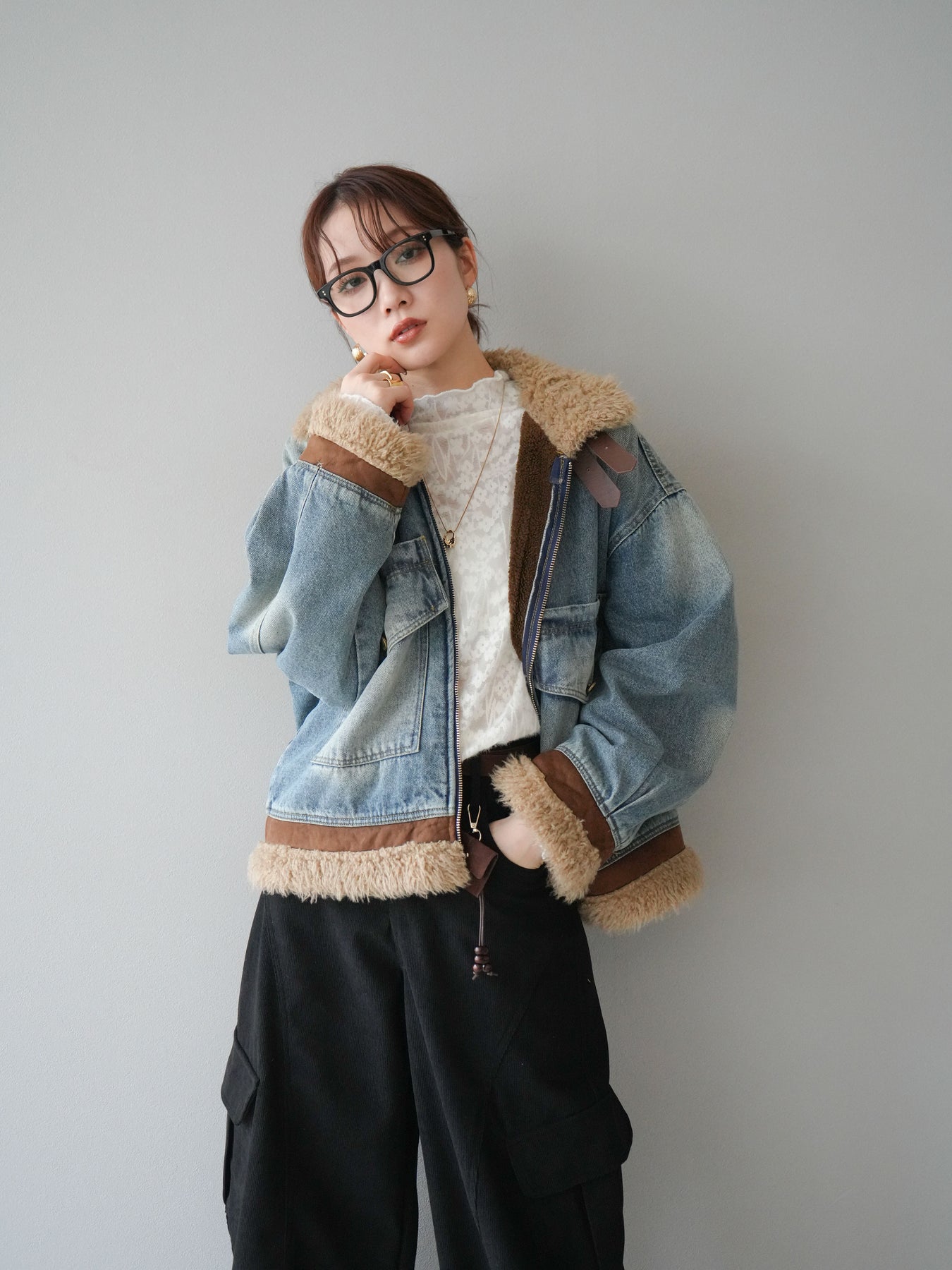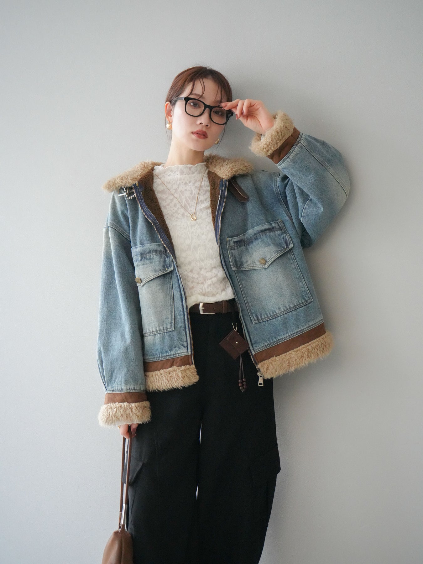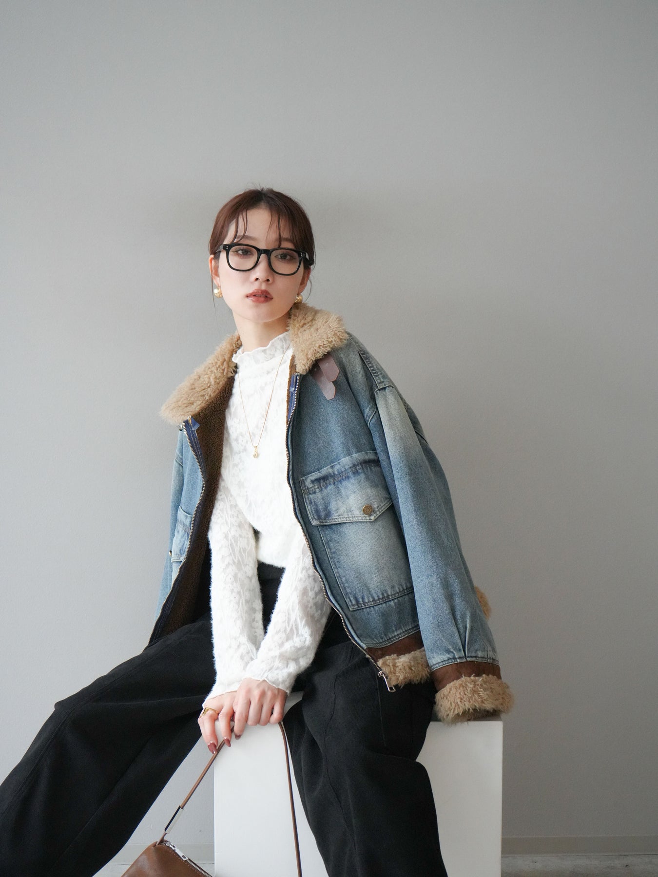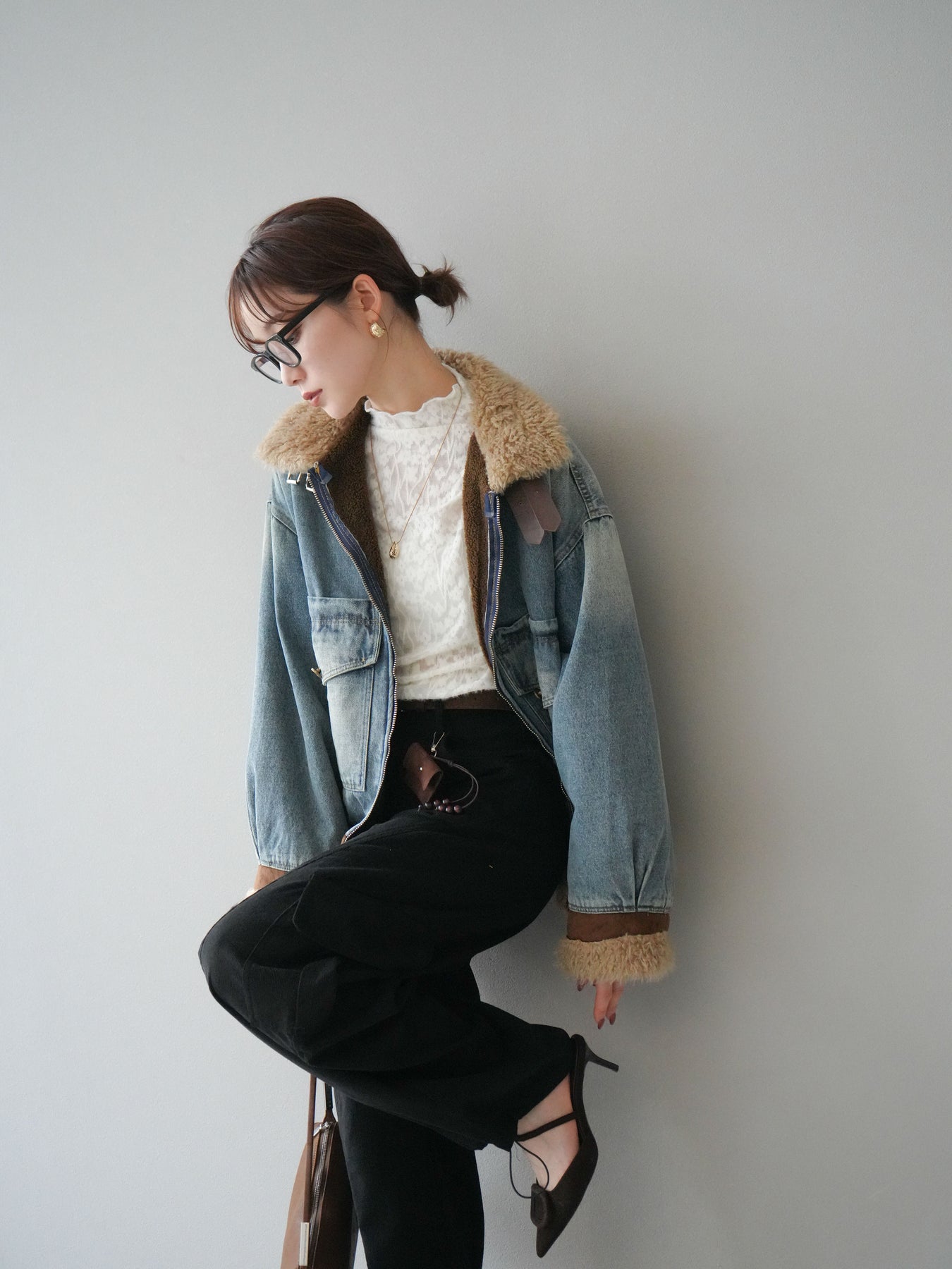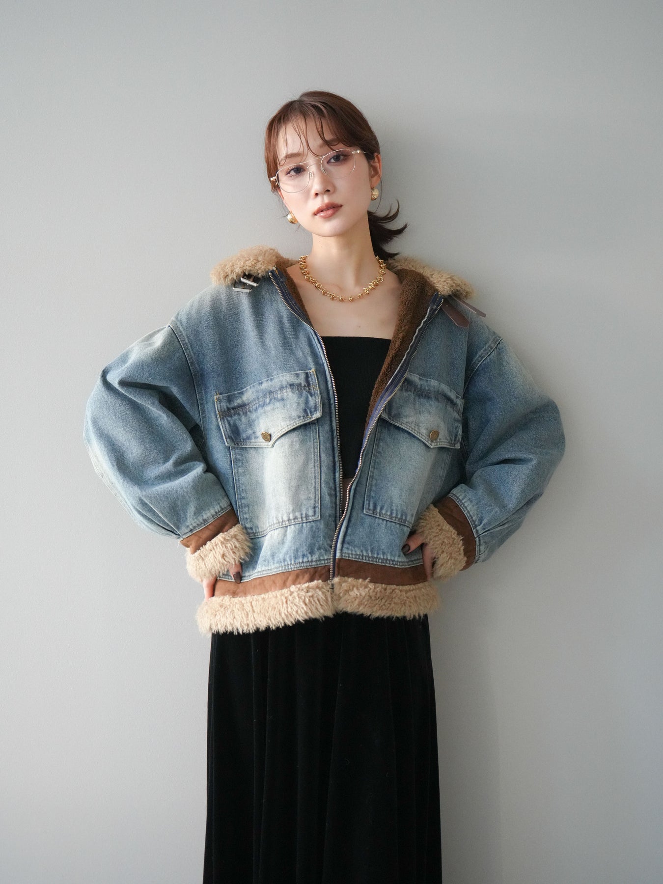 ボアファーとデニムを組み合わせた異素材ミックスが魅力のスタンドカラージャケット。 ヴィンテージライクな色落ちデニムに、ふんわりとしたファーがシーズンムードを高めます。 程よくゆとりのあるシルエットで、インナーを重ねてももたつかず快適な着心地。 首元まで暖かいスタンドカラー仕様で、デザイン性と防寒性を兼ね備えています。 カジュアルからフェミニンまで、どんなコーデにもマッチする万能アウターです。 ※ボトムス、キャミソール(インナー)以外の商品は一律でインナーは付属していません。