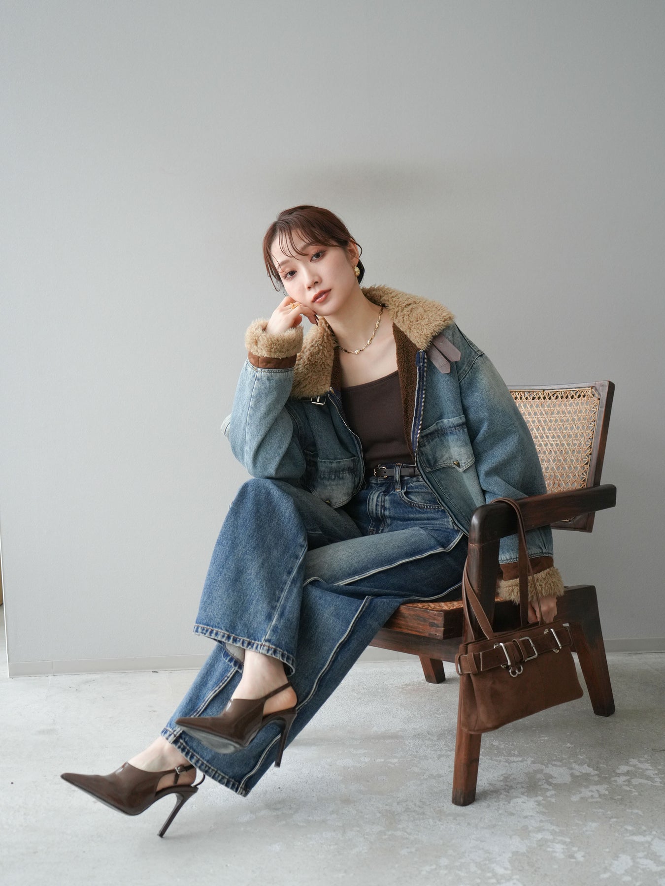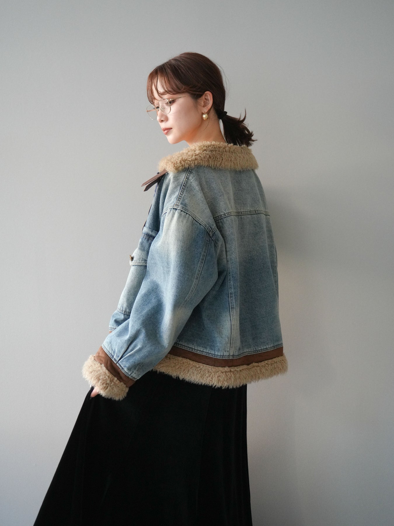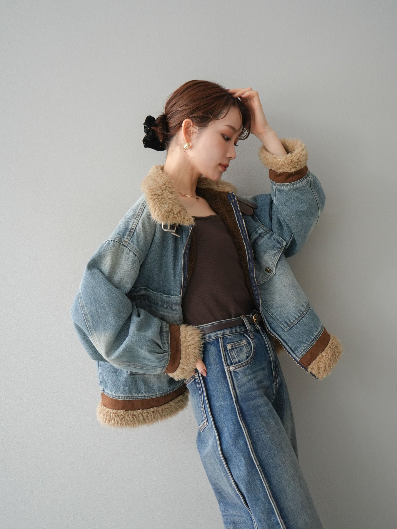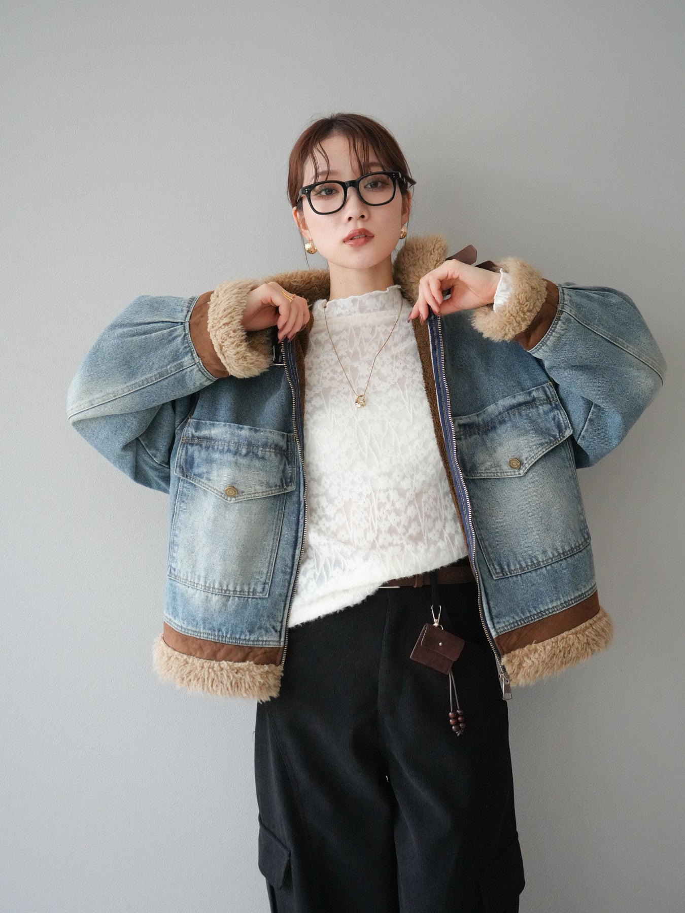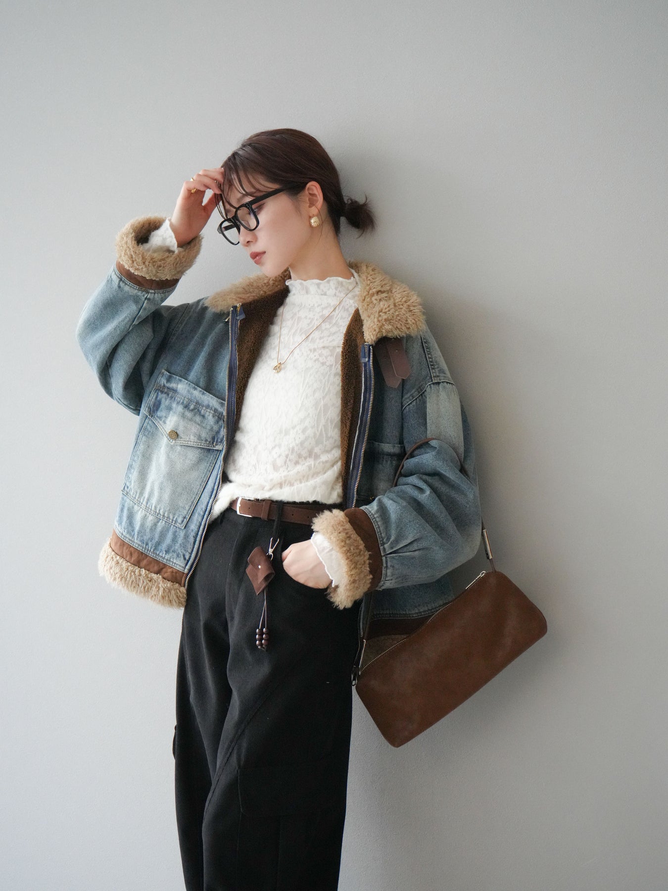 ボアファーとデニムを組み合わせた異素材ミックスが魅力のスタンドカラージャケット。 ヴィンテージライクな色落ちデニムに、ふんわりとしたファーがシーズンムードを高めます。 程よくゆとりのあるシルエットで、インナーを重ねてももたつかず快適な着心地。 首元まで暖かいスタンドカラー仕様で、デザイン性と防寒性を兼ね備えています。 カジュアルからフェミニンまで、どんなコーデにもマッチする万能アウターです。 ※ボトムス、キャミソール(インナー)以外の商品は一律でインナーは付属していません。