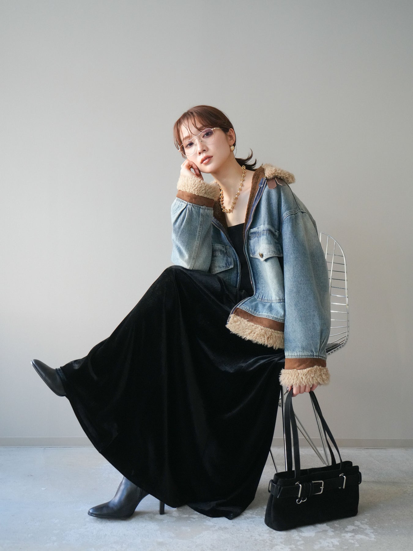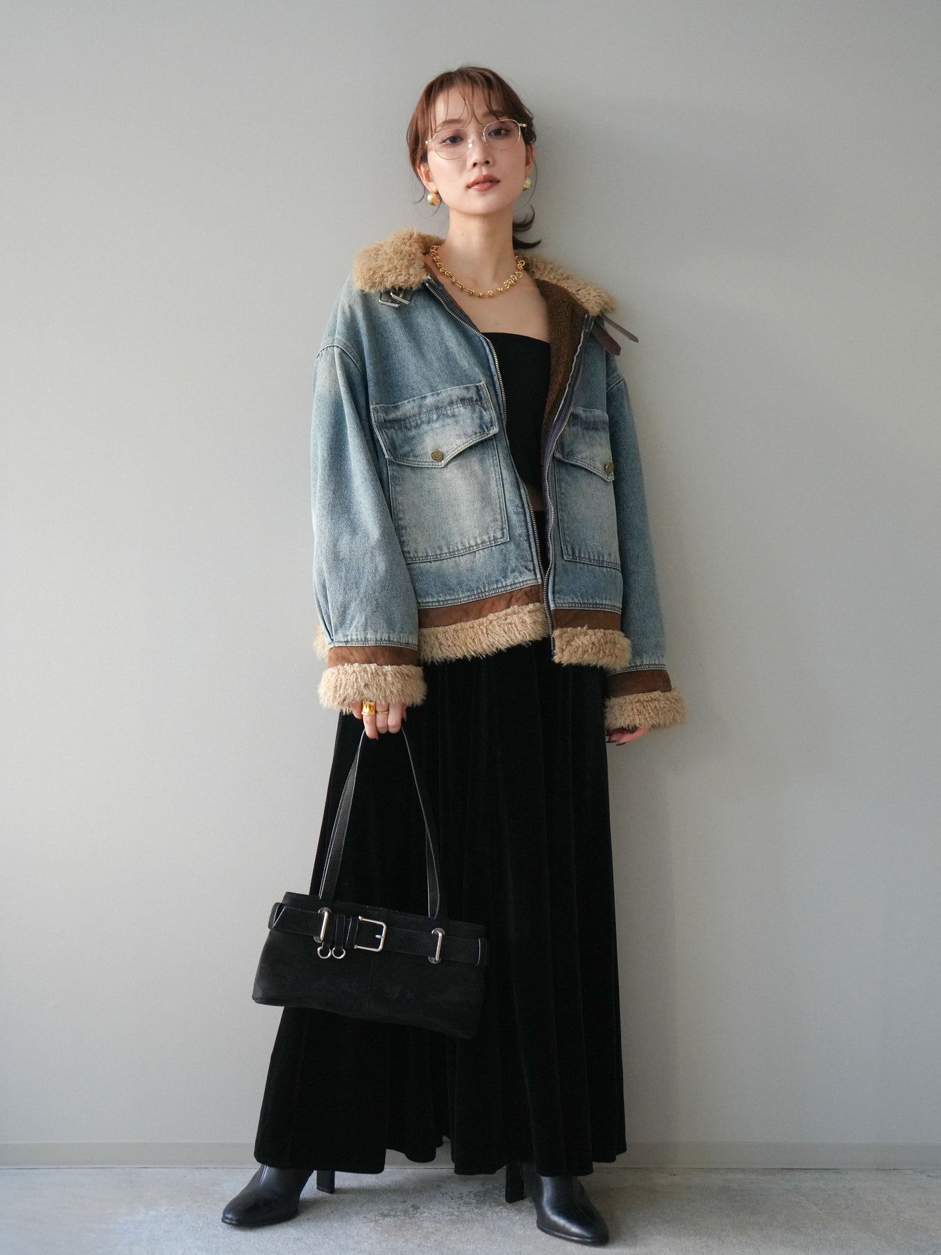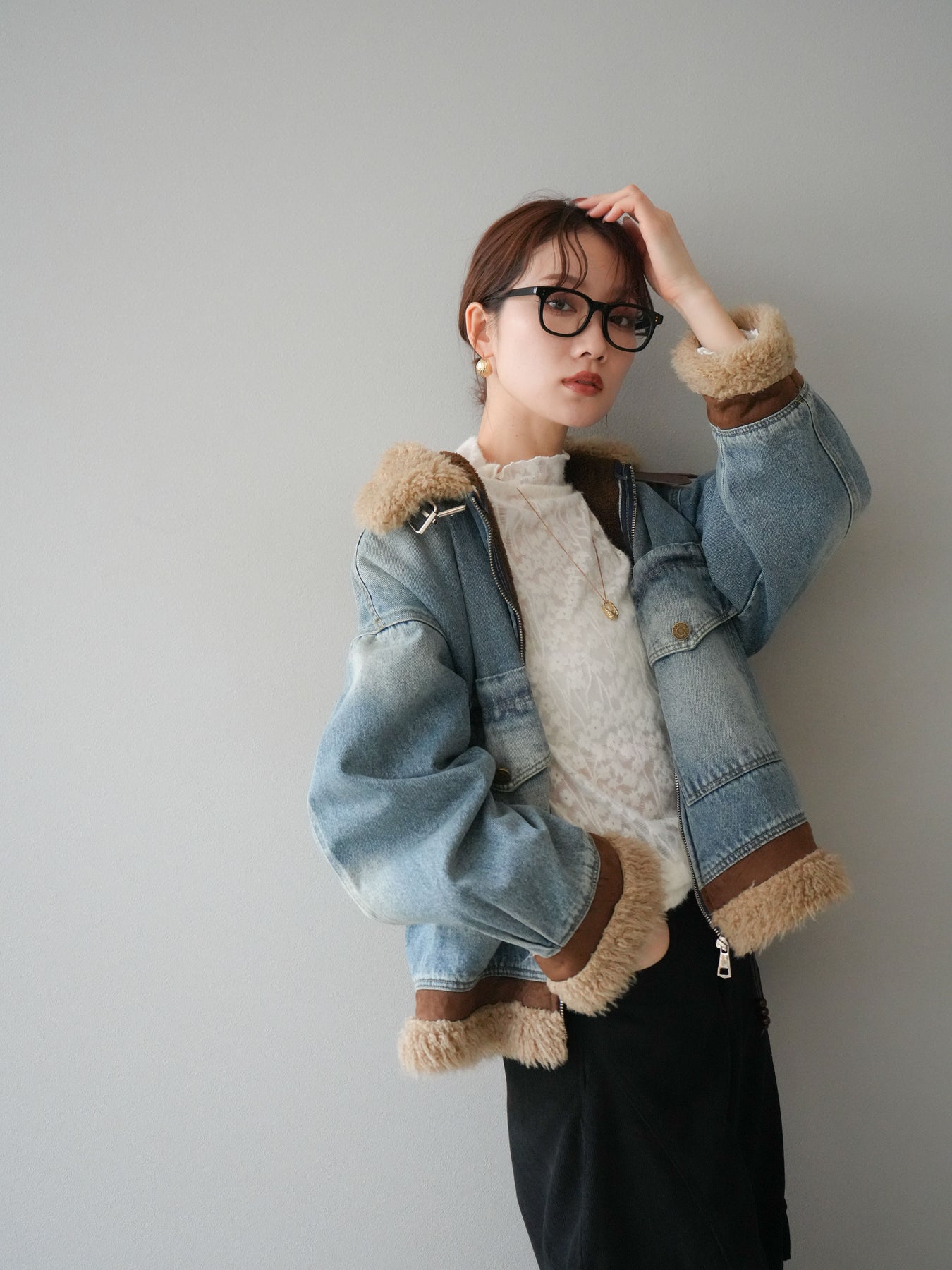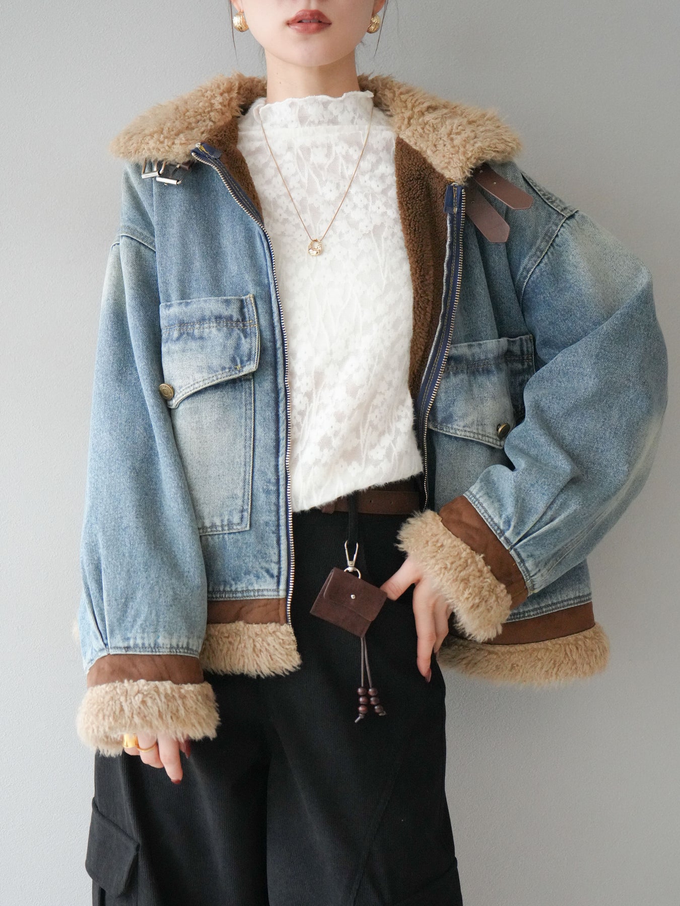 ボアファーとデニムを組み合わせた異素材ミックスが魅力のスタンドカラージャケット。 ヴィンテージライクな色落ちデニムに、ふんわりとしたファーがシーズンムードを高めます。 程よくゆとりのあるシルエットで、インナーを重ねてももたつかず快適な着心地。 首元まで暖かいスタンドカラー仕様で、デザイン性と防寒性を兼ね備えています。 カジュアルからフェミニンまで、どんなコーデにもマッチする万能アウターです。 ※ボトムス、キャミソール(インナー)以外の商品は一律でインナーは付属していません。