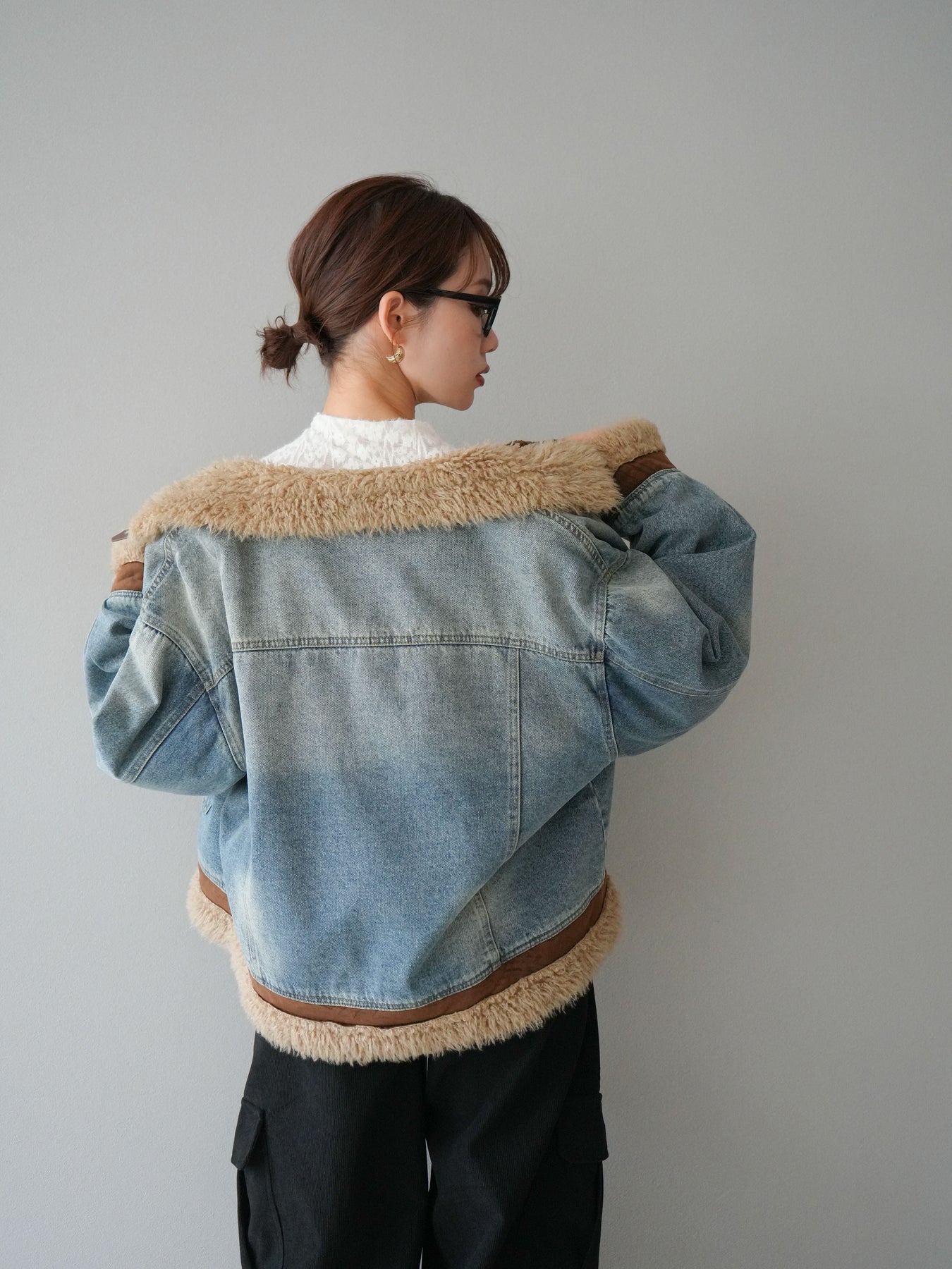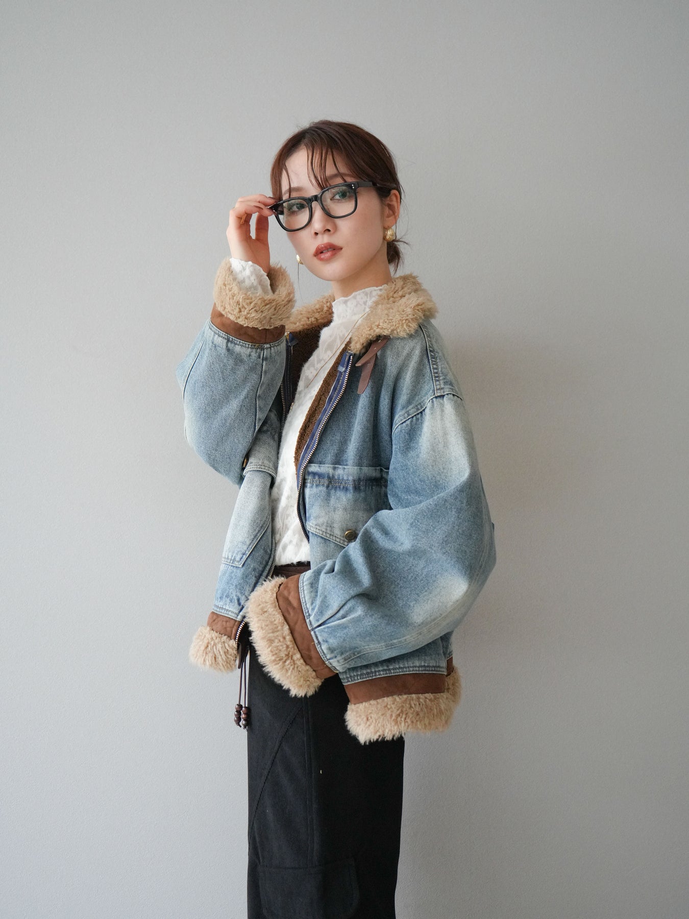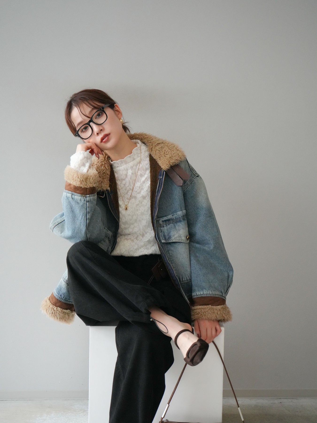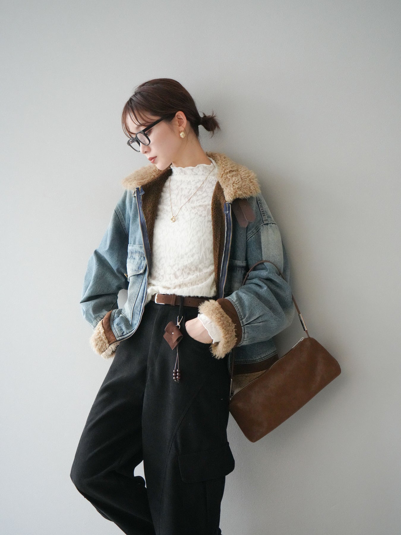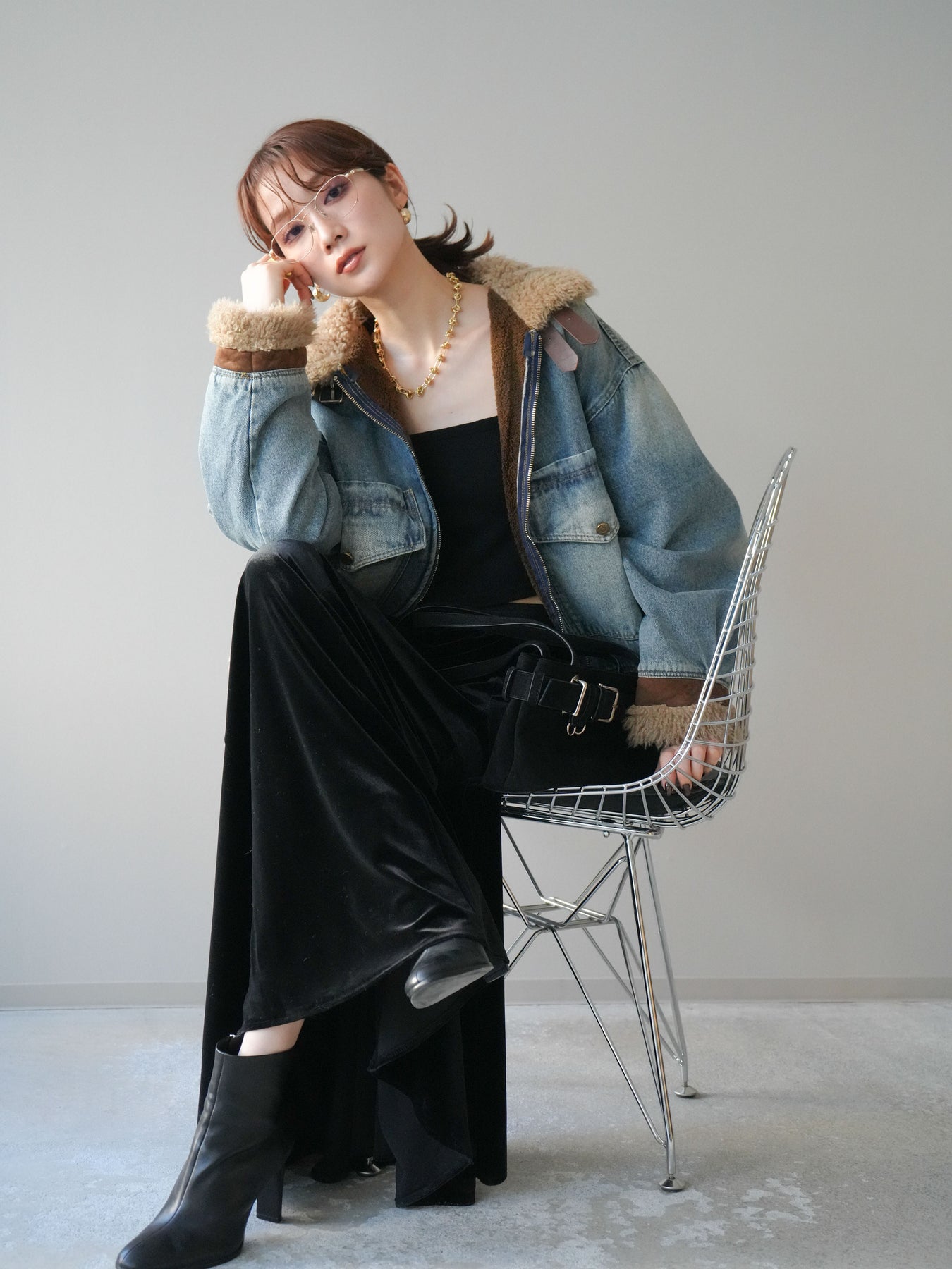ボアファーとデニムを組み合わせた異素材ミックスが魅力のスタンドカラージャケット。 ヴィンテージライクな色落ちデニムに、ふんわりとしたファーがシーズンムードを高めます。 程よくゆとりのあるシルエットで、インナーを重ねてももたつかず快適な着心地。 首元まで暖かいスタンドカラー仕様で、デザイン性と防寒性を兼ね備えています。 カジュアルからフェミニンまで、どんなコーデにもマッチする万能アウターです。 ※ボトムス、キャミソール(インナー)以外の商品は一律でインナーは付属していません。