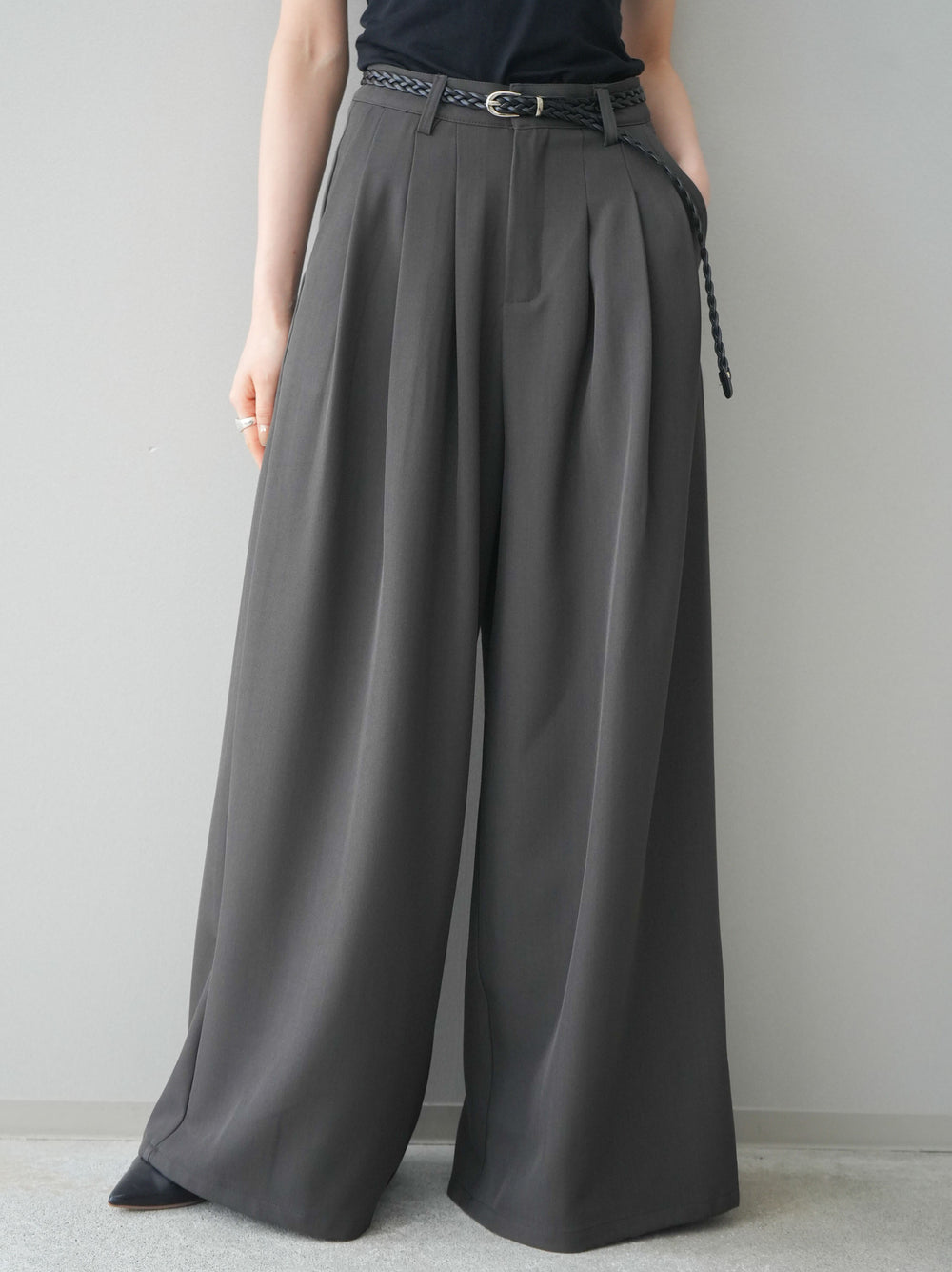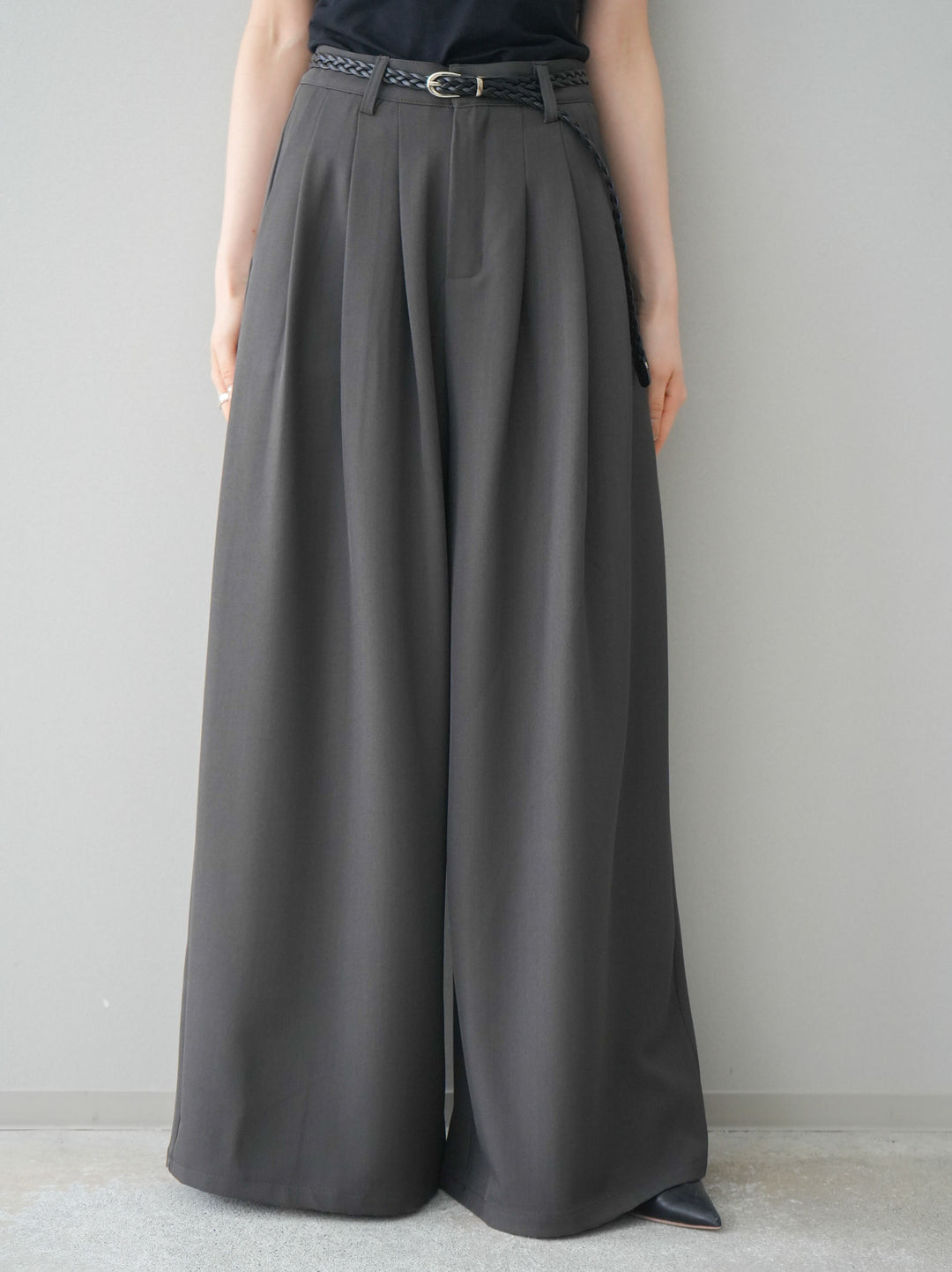 [予約]編み込みベルト付タックワイドパンツ/gray