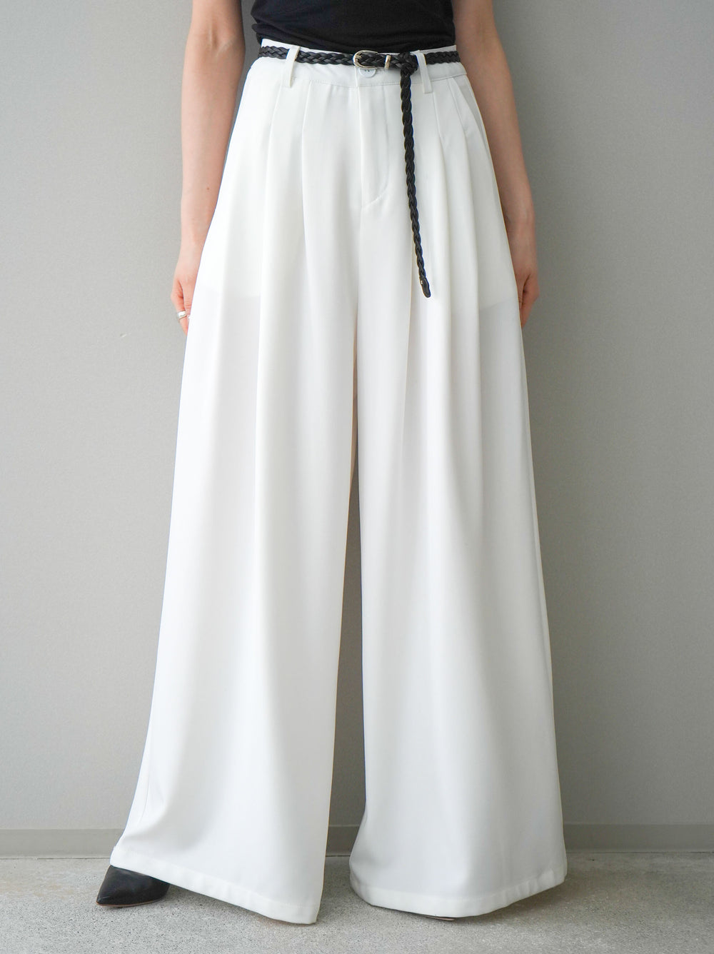 [予約]編み込みベルト付タックワイドパンツ/white