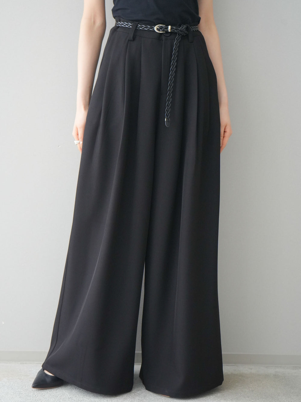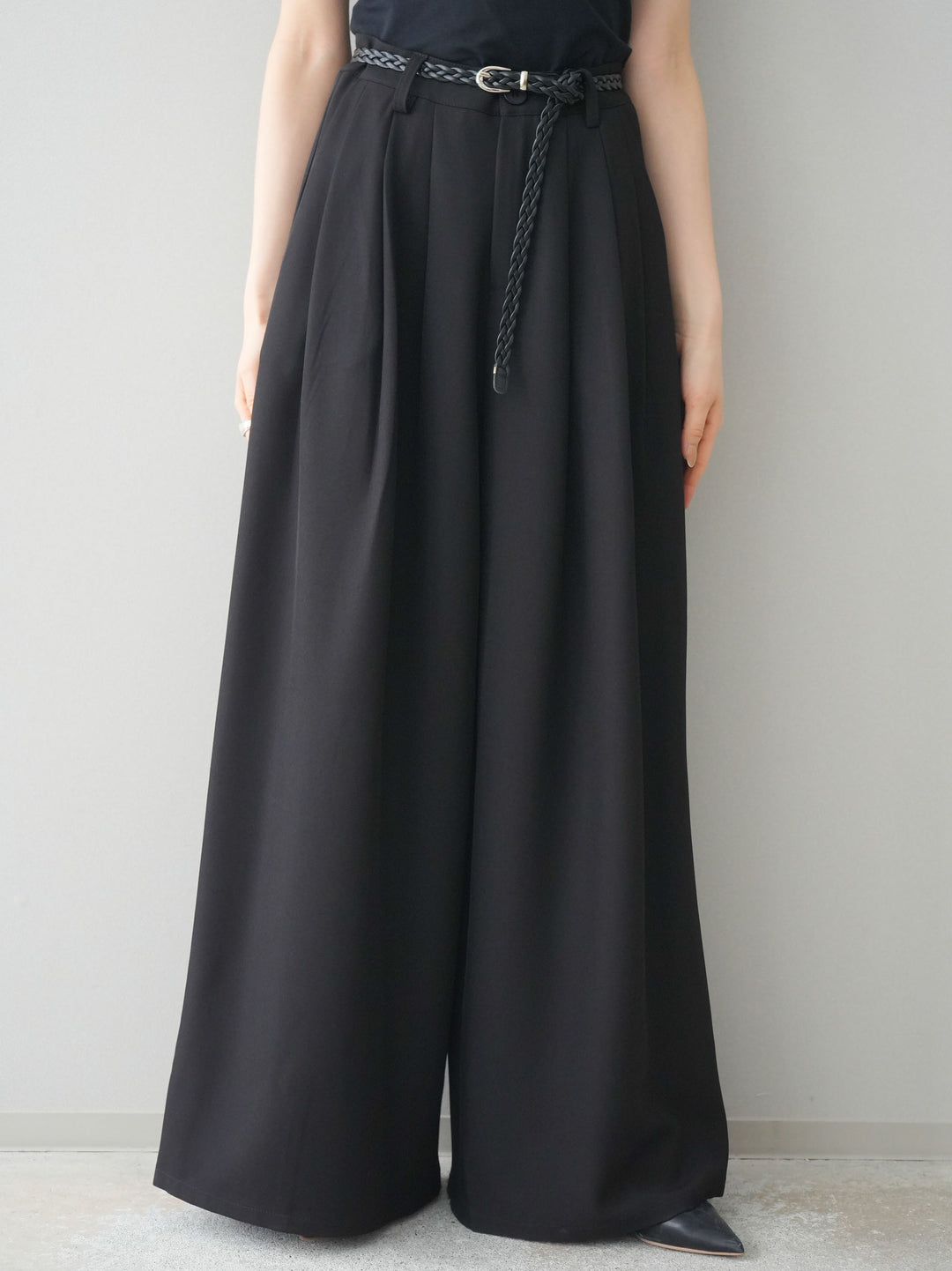 [予約]編み込みベルト付タックワイドパンツ/black