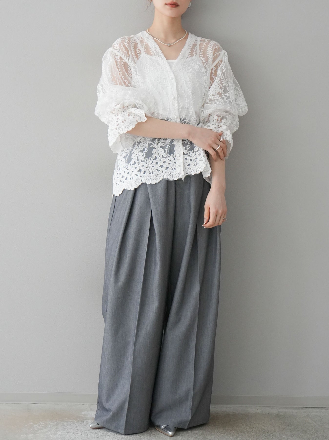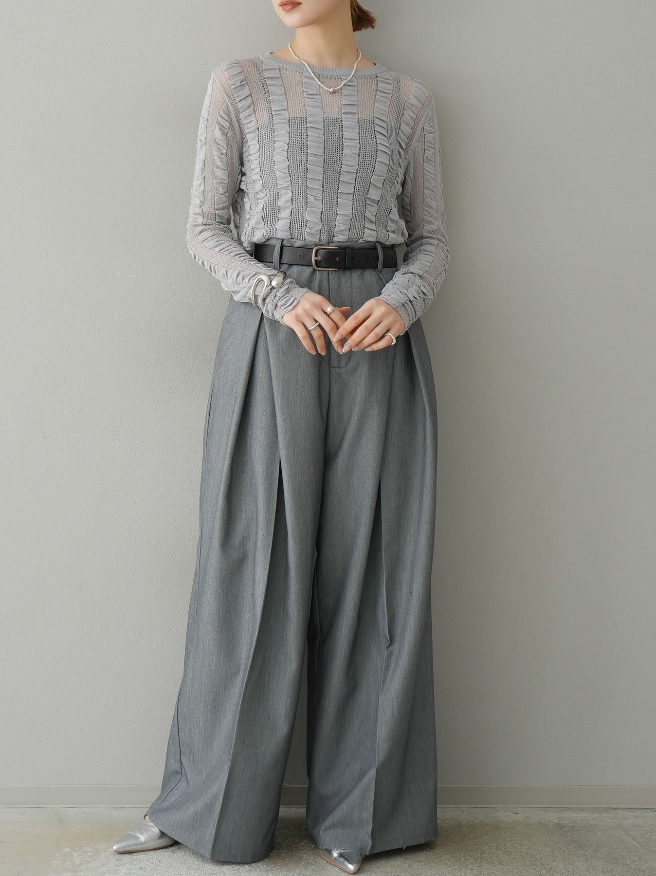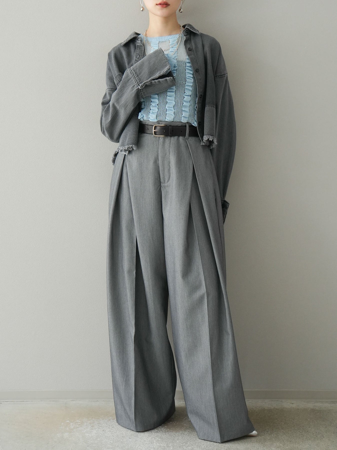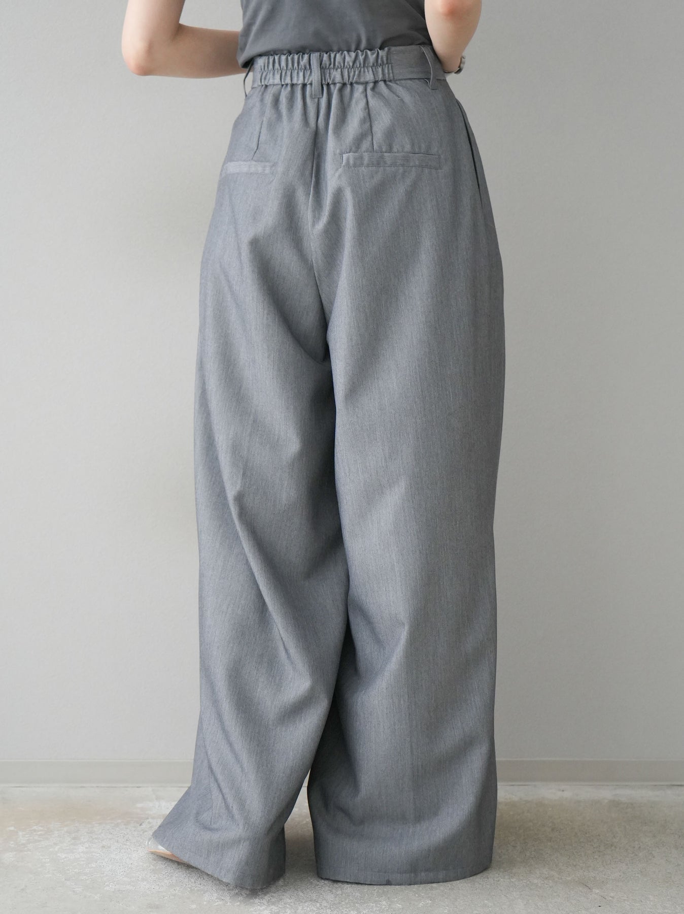 寬褲,具有迷人、精緻的塞褶設計。斜紋布材質的適度軟硬,保持優美的輪廓,還有拉長雙腿的效果。腰部設計精緻,非常適合將上衣塞進褲子裡穿著。該商品可與從休閒裝到現代裝等多種服裝搭配,並且一年四季均可穿著。 ※除下裝、吊帶背心(內衣)以外的所有商品均不包含內衣。