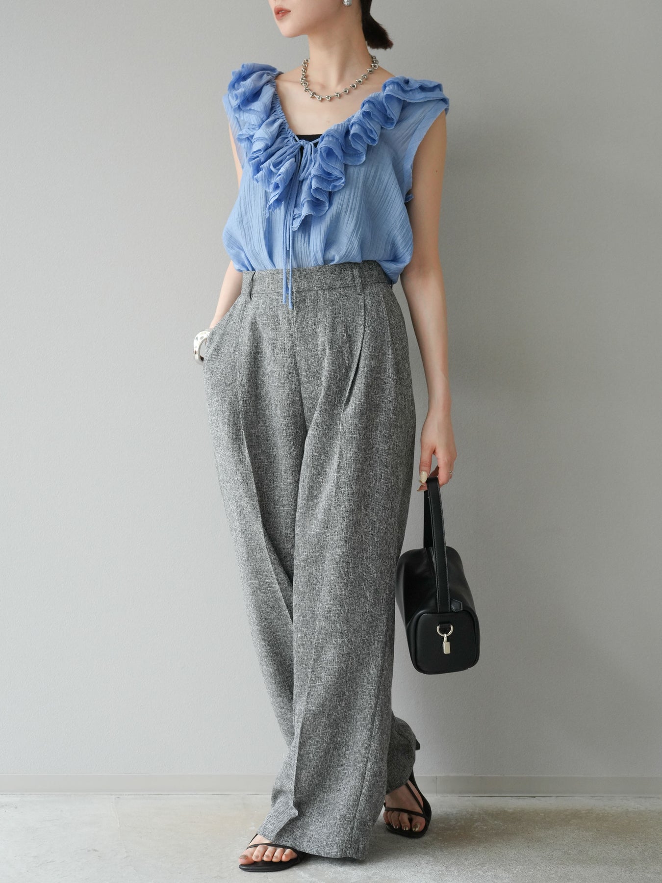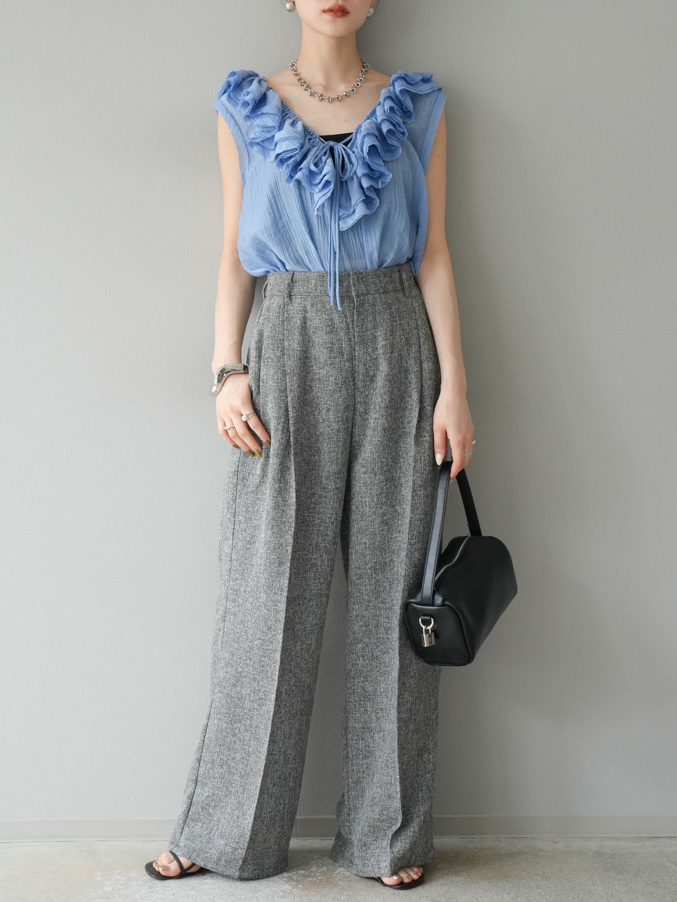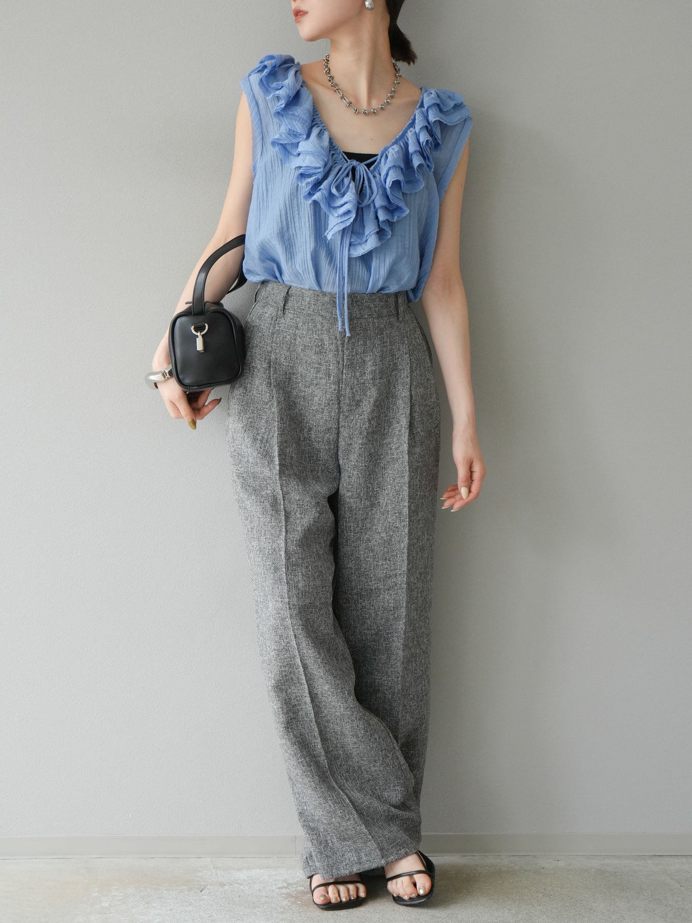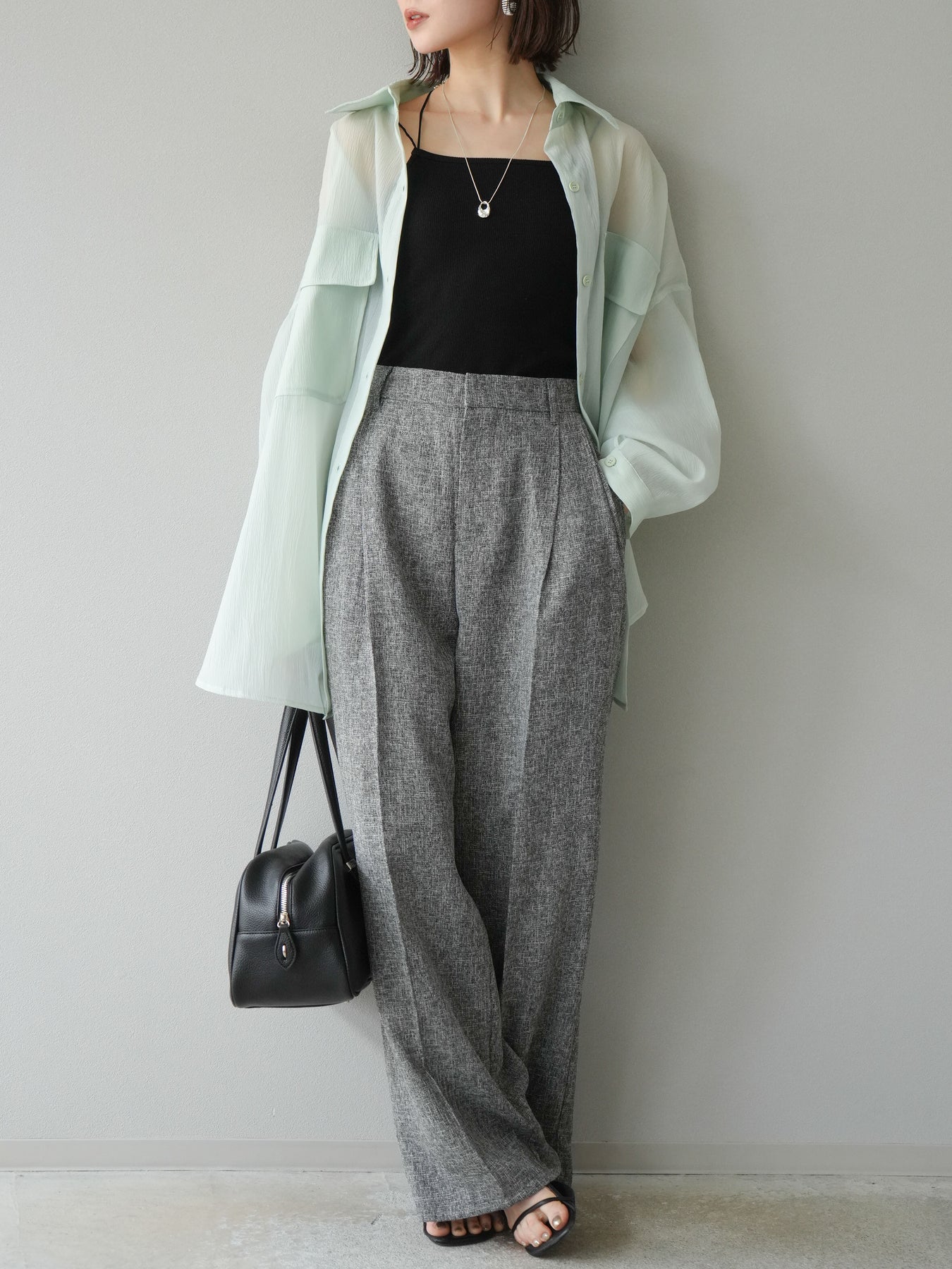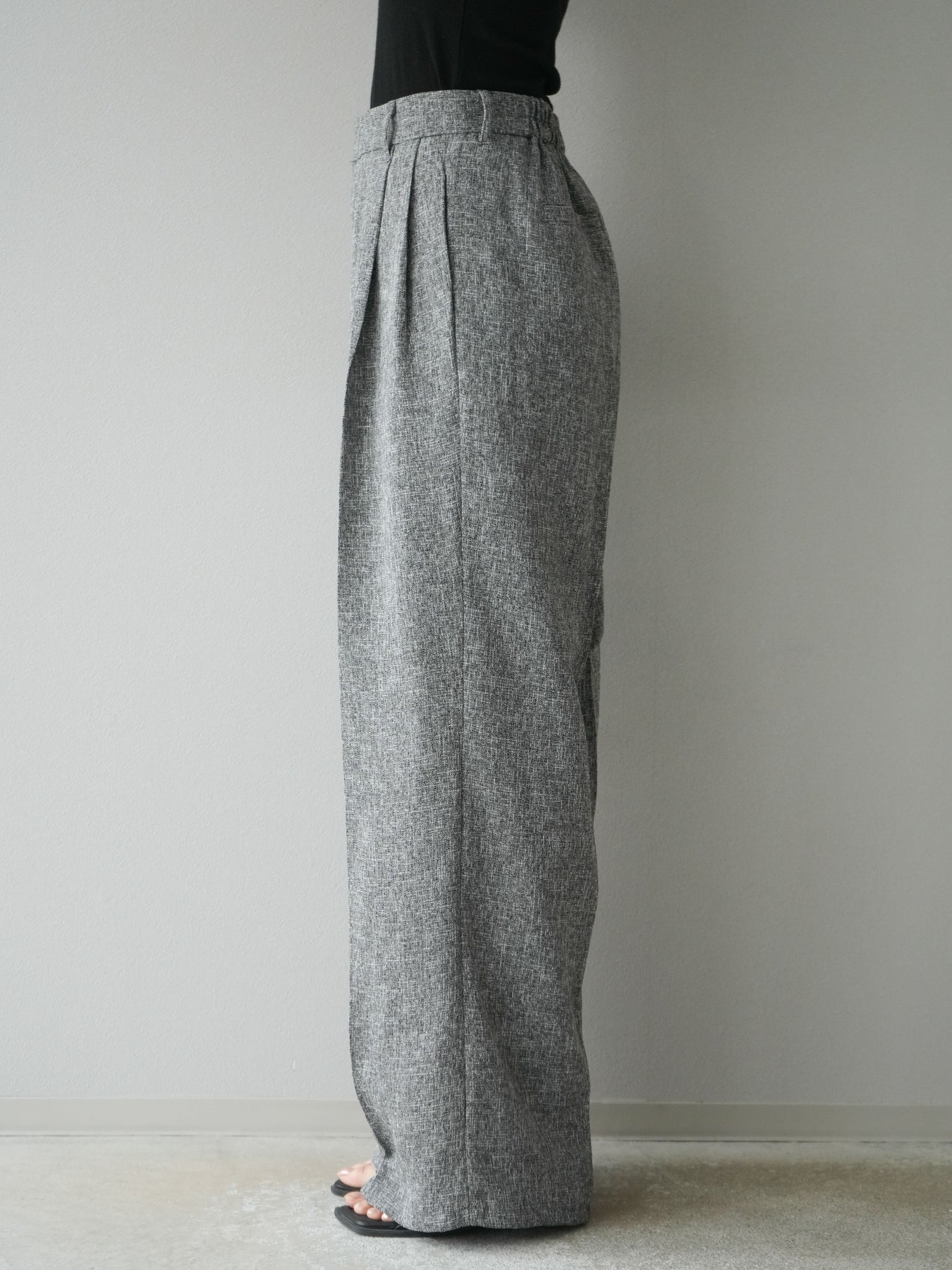 以富有表現力的混合粗花呢面料製成的寬褲。優雅的輪廓帶來輕鬆的穿著體驗,前側的褶襉設計則營造出立體俐落的造型。搭配高跟鞋可打造成熟造型,搭配運動鞋則可打造休閒造型。無論工作場合或休閒場合,這款褲子都值得信賴。