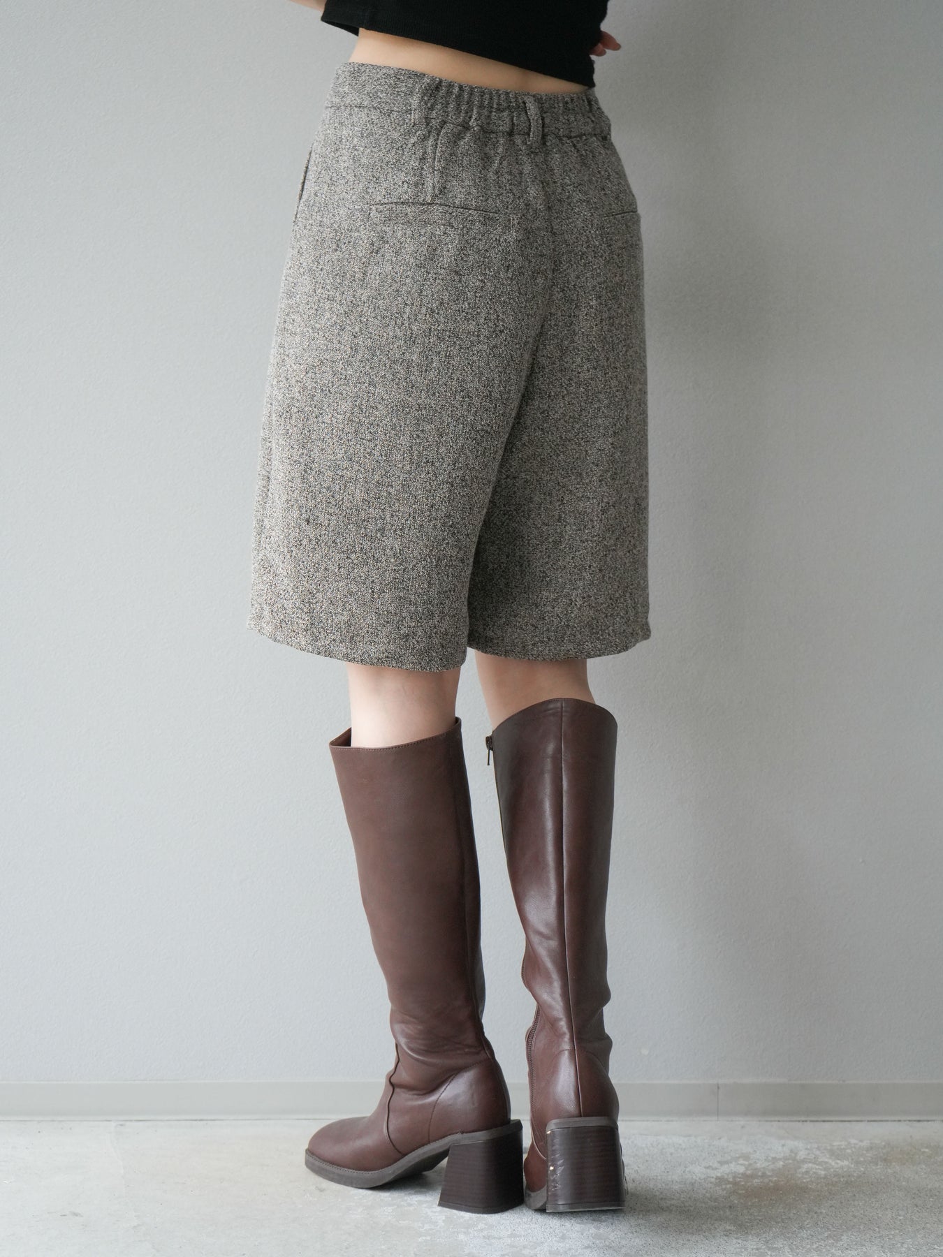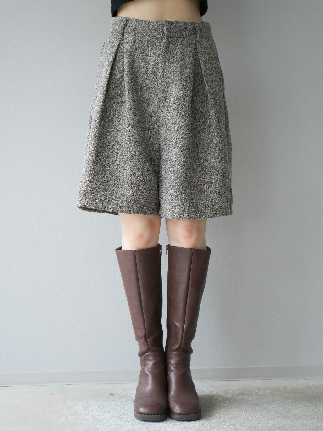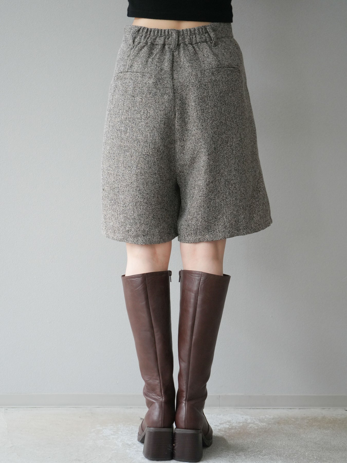 クラシカルなツイード素材を使用したハーフパンツ。表情のある生地感がスタイリングに奥行きを与え、シンプルなトップスを合わせるだけでも洗練された印象に仕上がります。ハイウエストデザインで腰回りをすっきりと見せ、タック入りのシルエットが程よいゆとりを生み出し、快適な履き心地を叶えます。膝上丈のバランスはブーツやローファーとも好相性で、秋冬のコーディネートを旬な雰囲気にアップデートしてくれる一枚です。