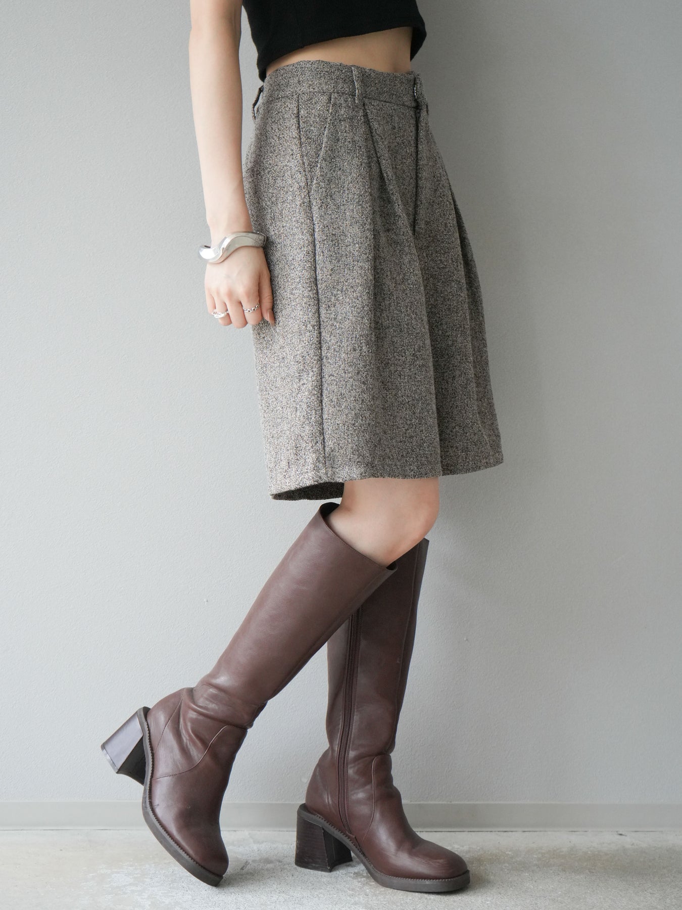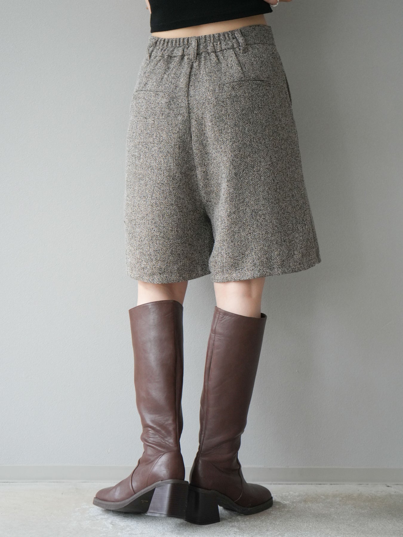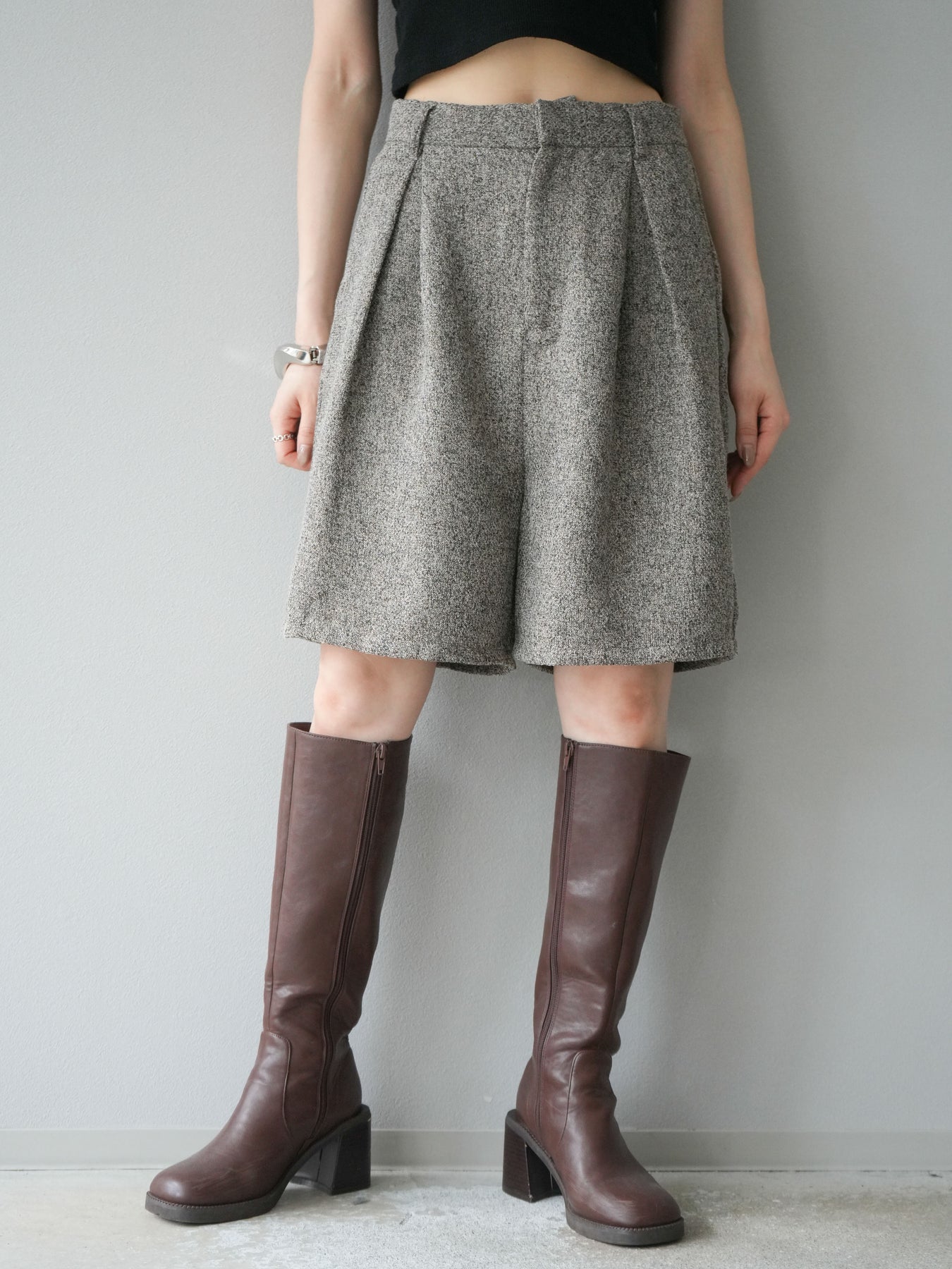 クラシカルなツイード素材を使用したハーフパンツ。表情のある生地感がスタイリングに奥行きを与え、シンプルなトップスを合わせるだけでも洗練された印象に仕上がります。ハイウエストデザインで腰回りをすっきりと見せ、タック入りのシルエットが程よいゆとりを生み出し、快適な履き心地を叶えます。膝上丈のバランスはブーツやローファーとも好相性で、秋冬のコーディネートを旬な雰囲気にアップデートしてくれる一枚です。