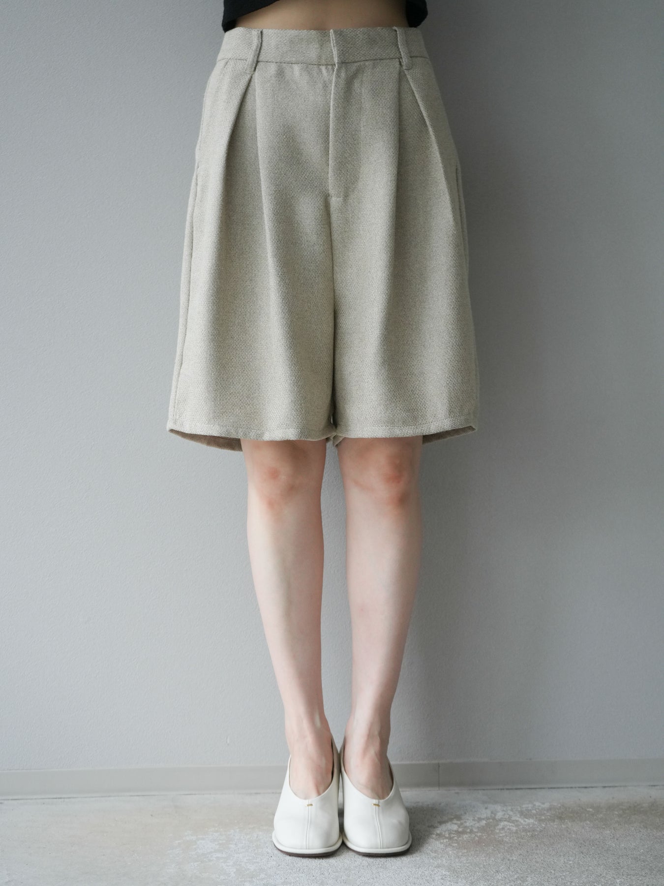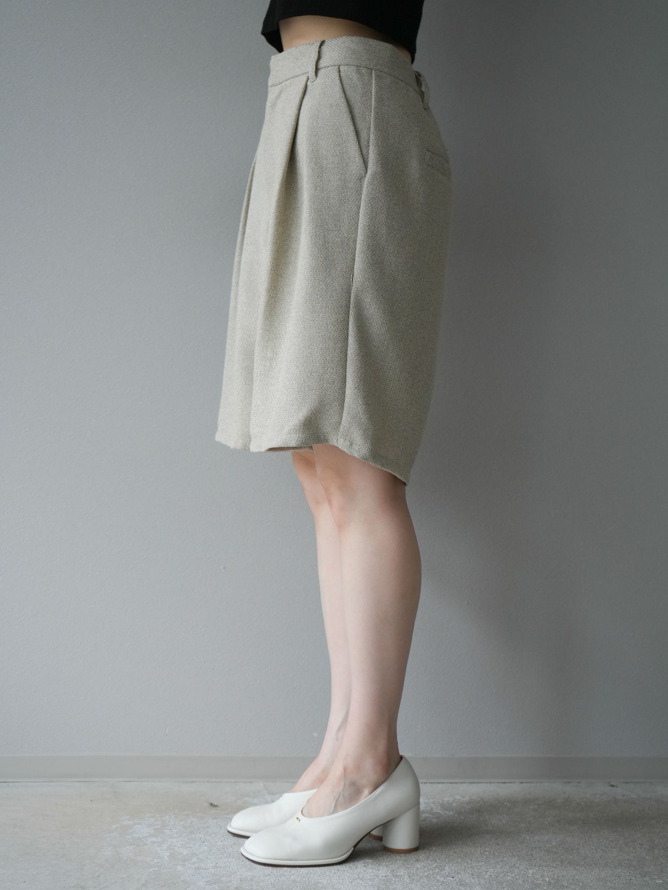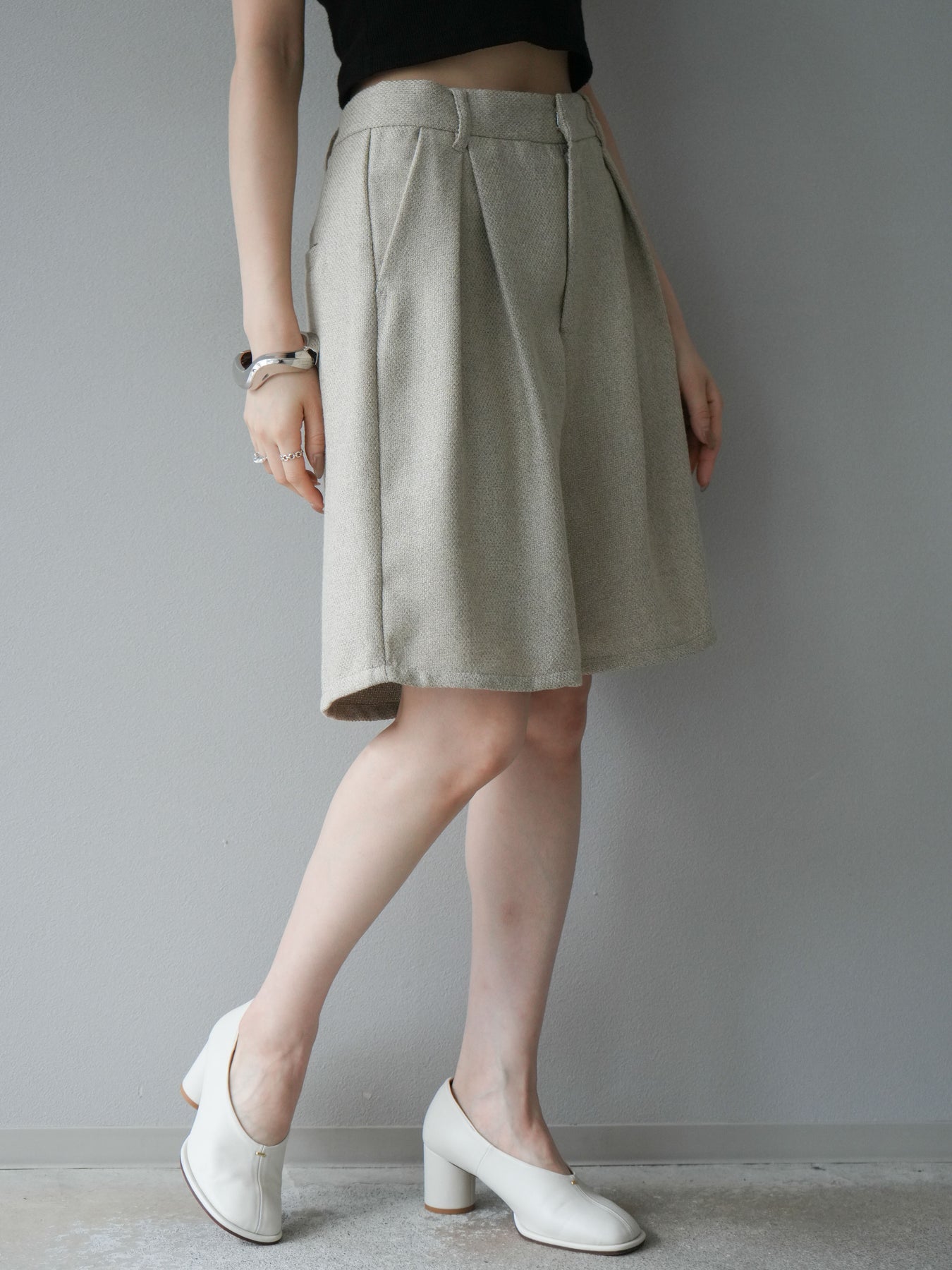 クラシカルなツイード素材を使用したハーフパンツ。表情のある生地感がスタイリングに奥行きを与え、シンプルなトップスを合わせるだけでも洗練された印象に仕上がります。ハイウエストデザインで腰回りをすっきりと見せ、タック入りのシルエットが程よいゆとりを生み出し、快適な履き心地を叶えます。膝上丈のバランスはブーツやローファーとも好相性で、秋冬のコーディネートを旬な雰囲気にアップデートしてくれる一枚です。