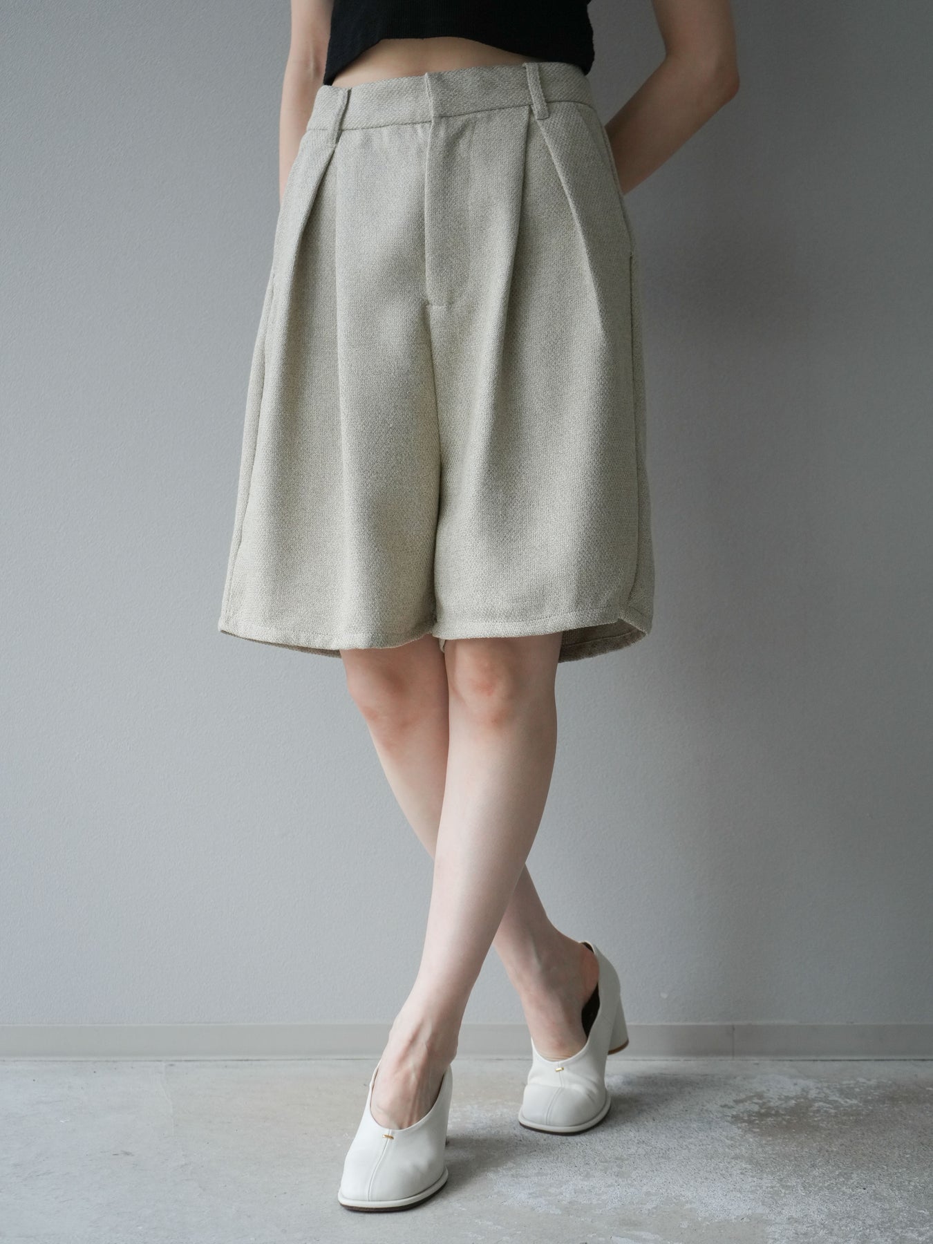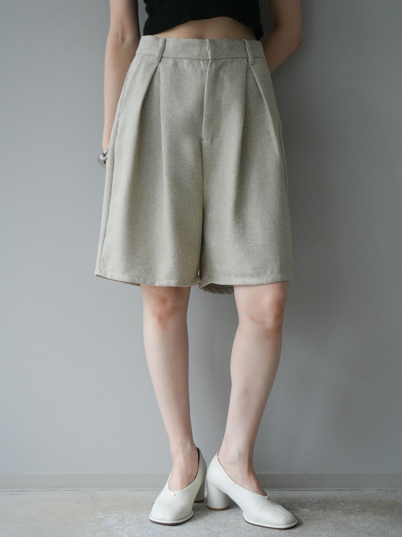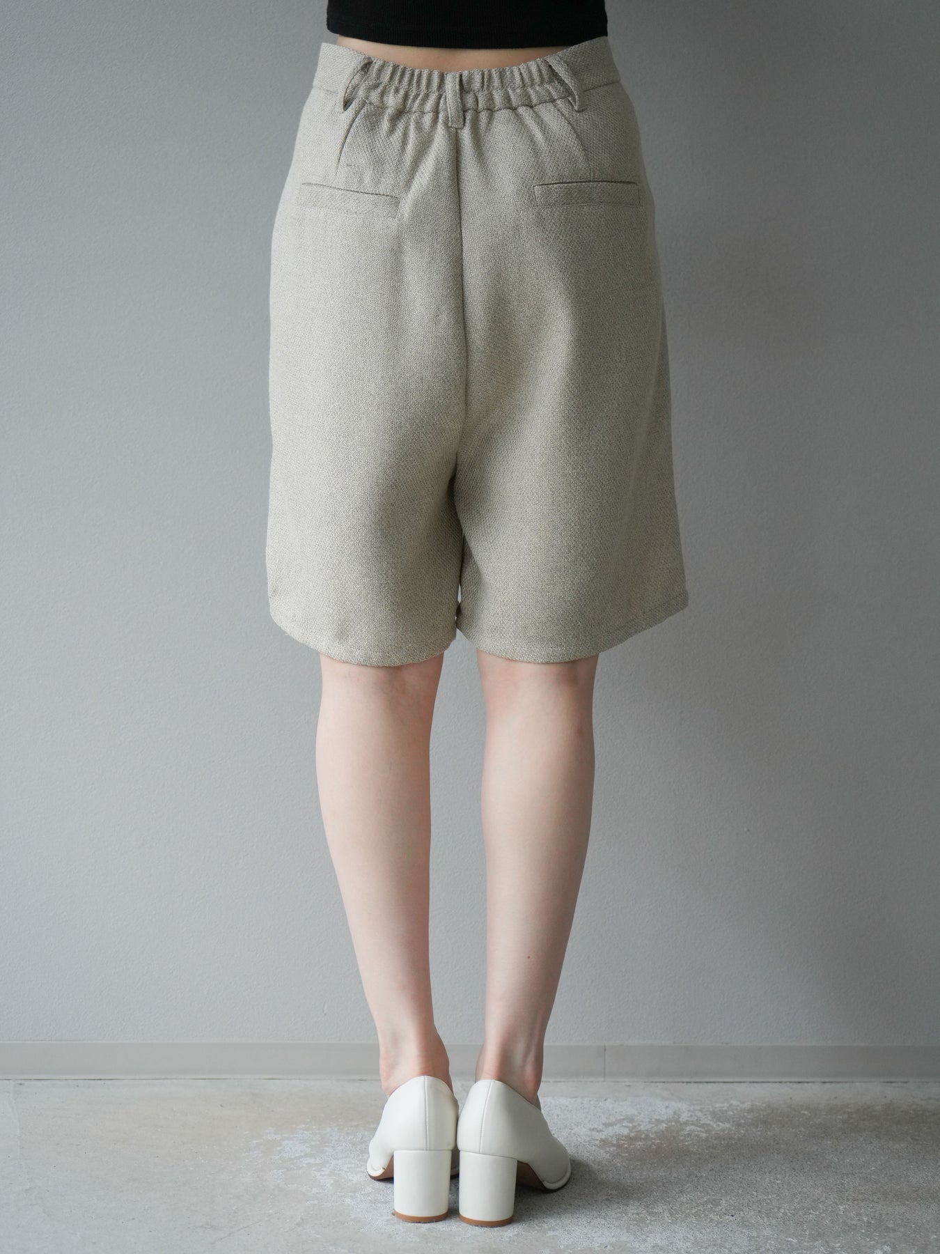 クラシカルなツイード素材を使用したハーフパンツ。表情のある生地感がスタイリングに奥行きを与え、シンプルなトップスを合わせるだけでも洗練された印象に仕上がります。ハイウエストデザインで腰回りをすっきりと見せ、タック入りのシルエットが程よいゆとりを生み出し、快適な履き心地を叶えます。膝上丈のバランスはブーツやローファーとも好相性で、秋冬のコーディネートを旬な雰囲気にアップデートしてくれる一枚です。