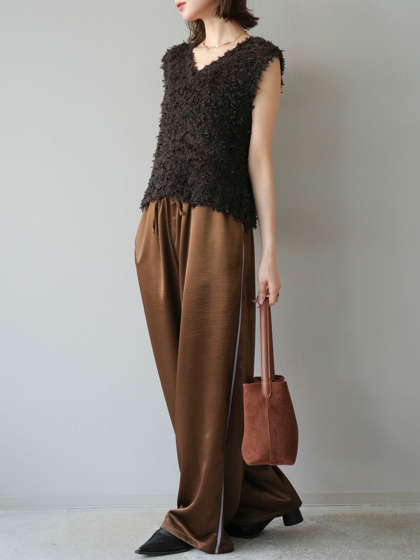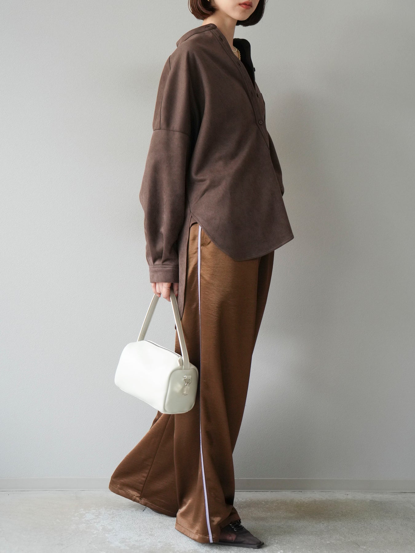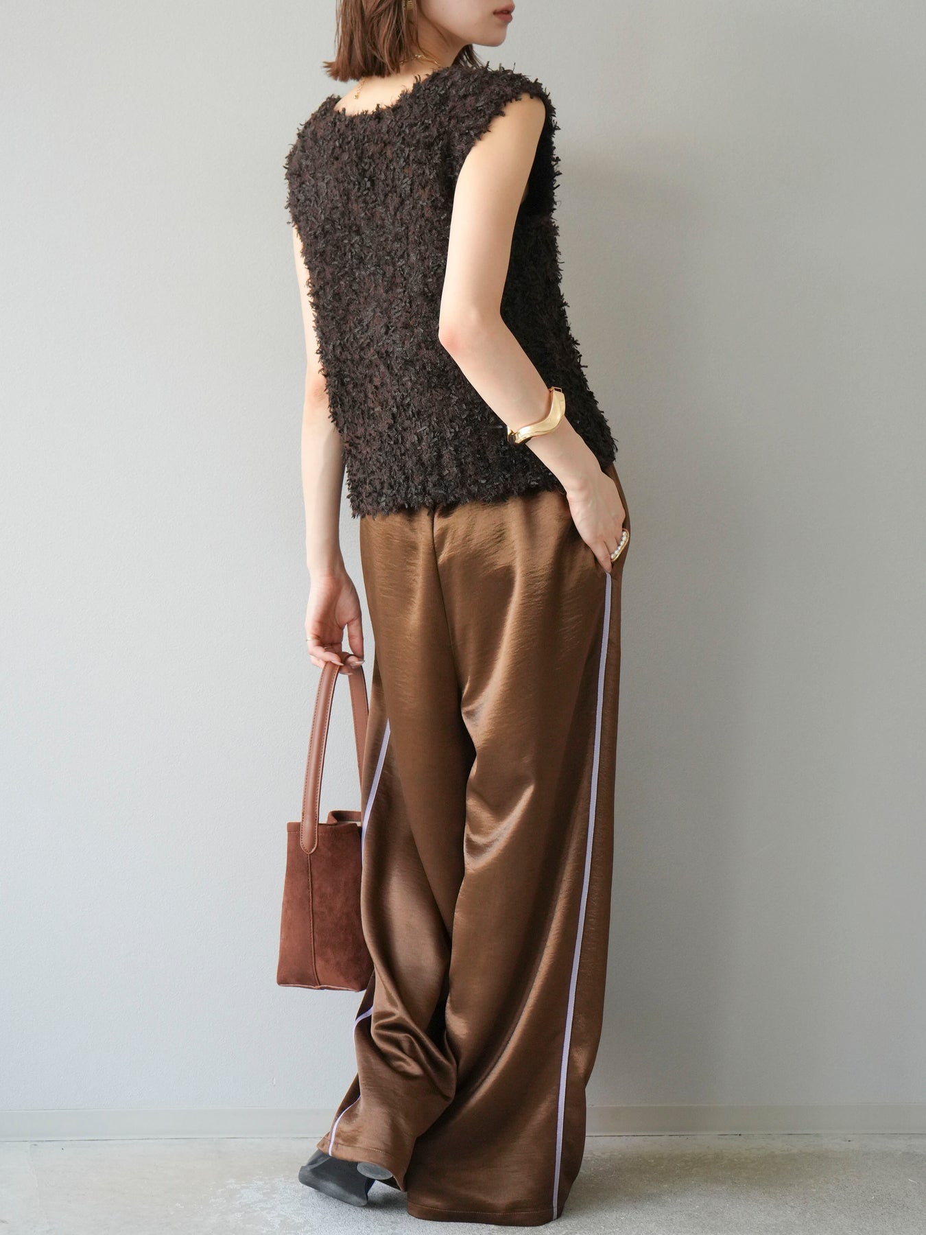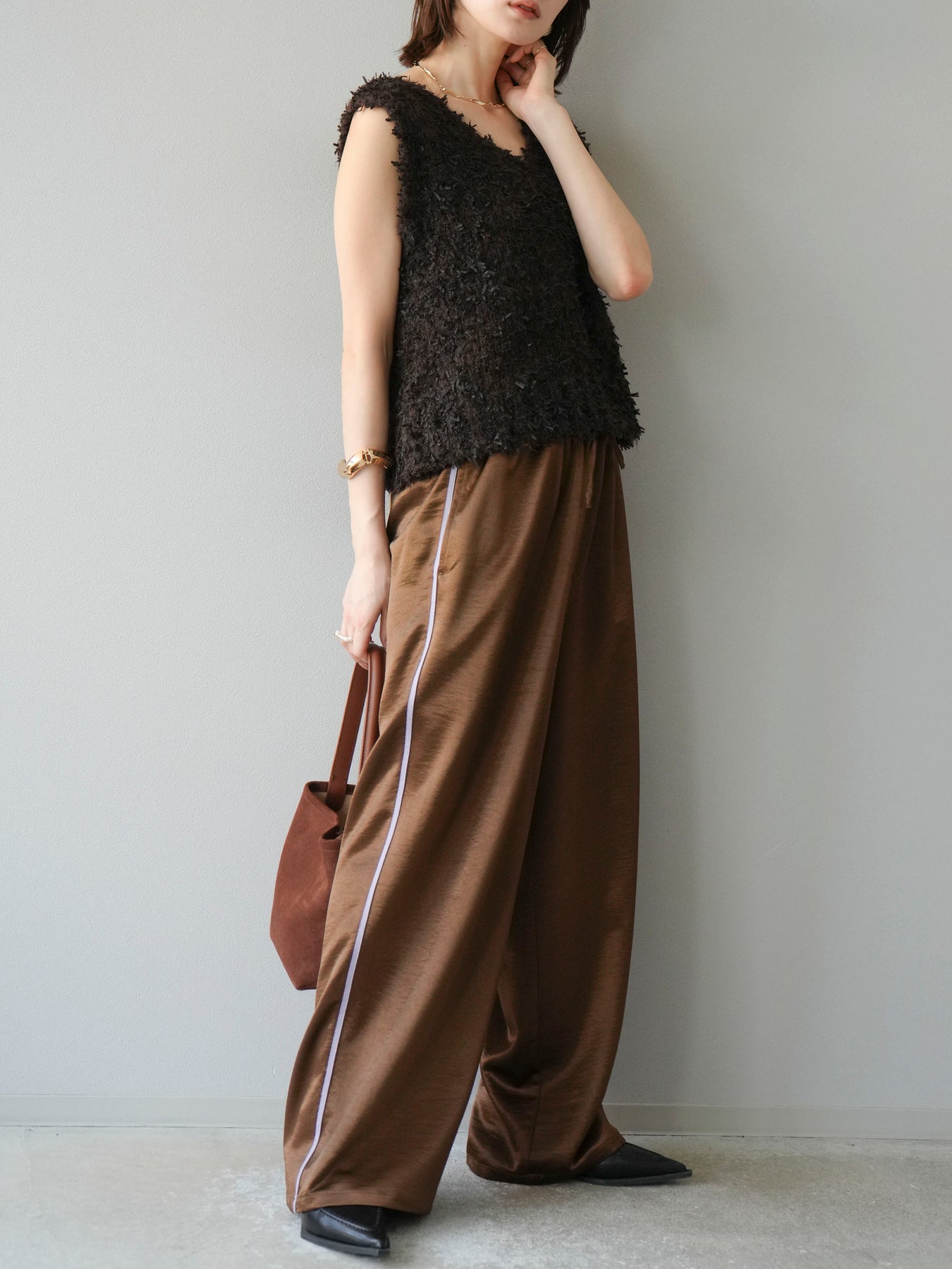 [予約]サテンラインワイドパンツ/ブラウン
