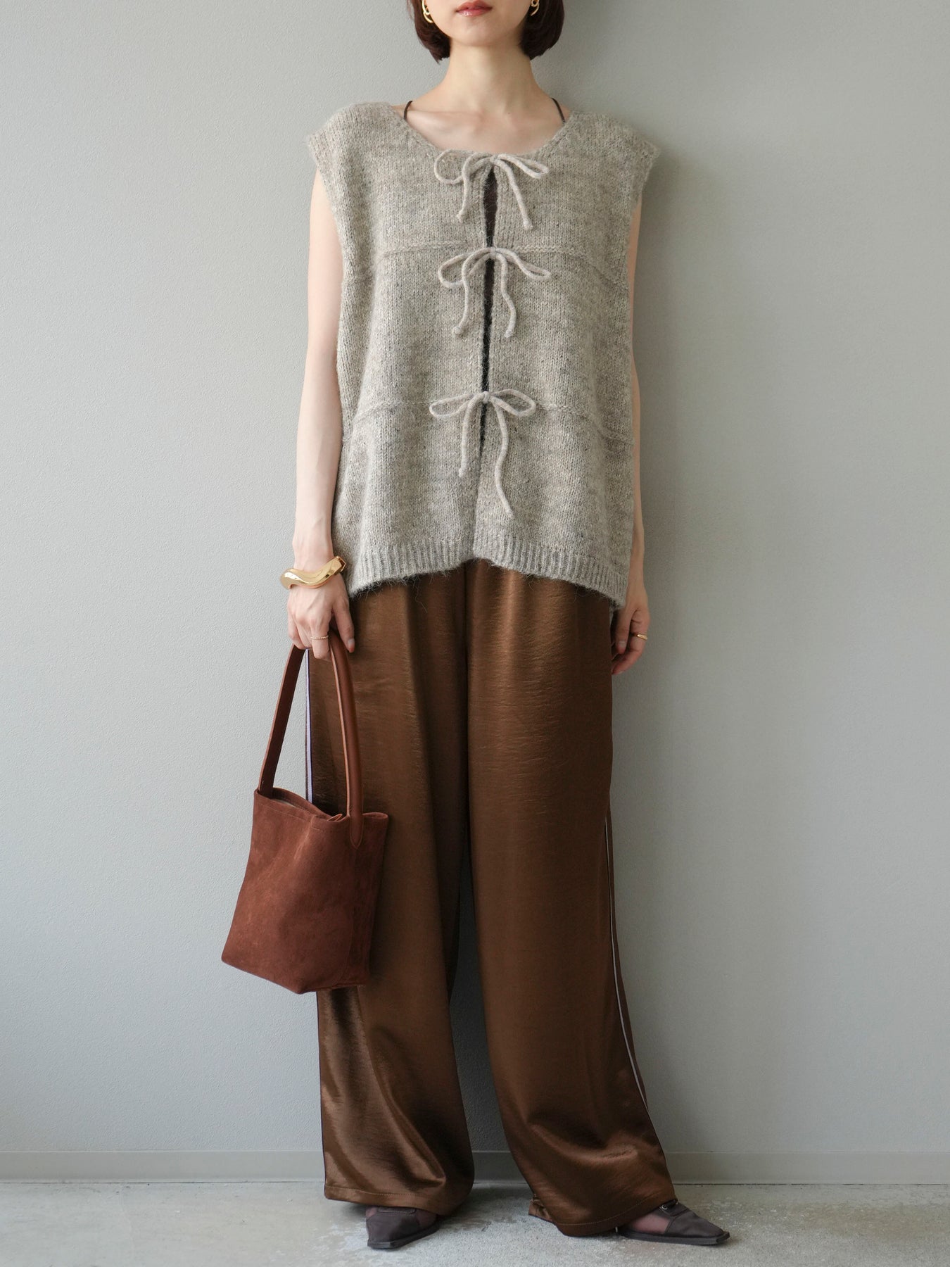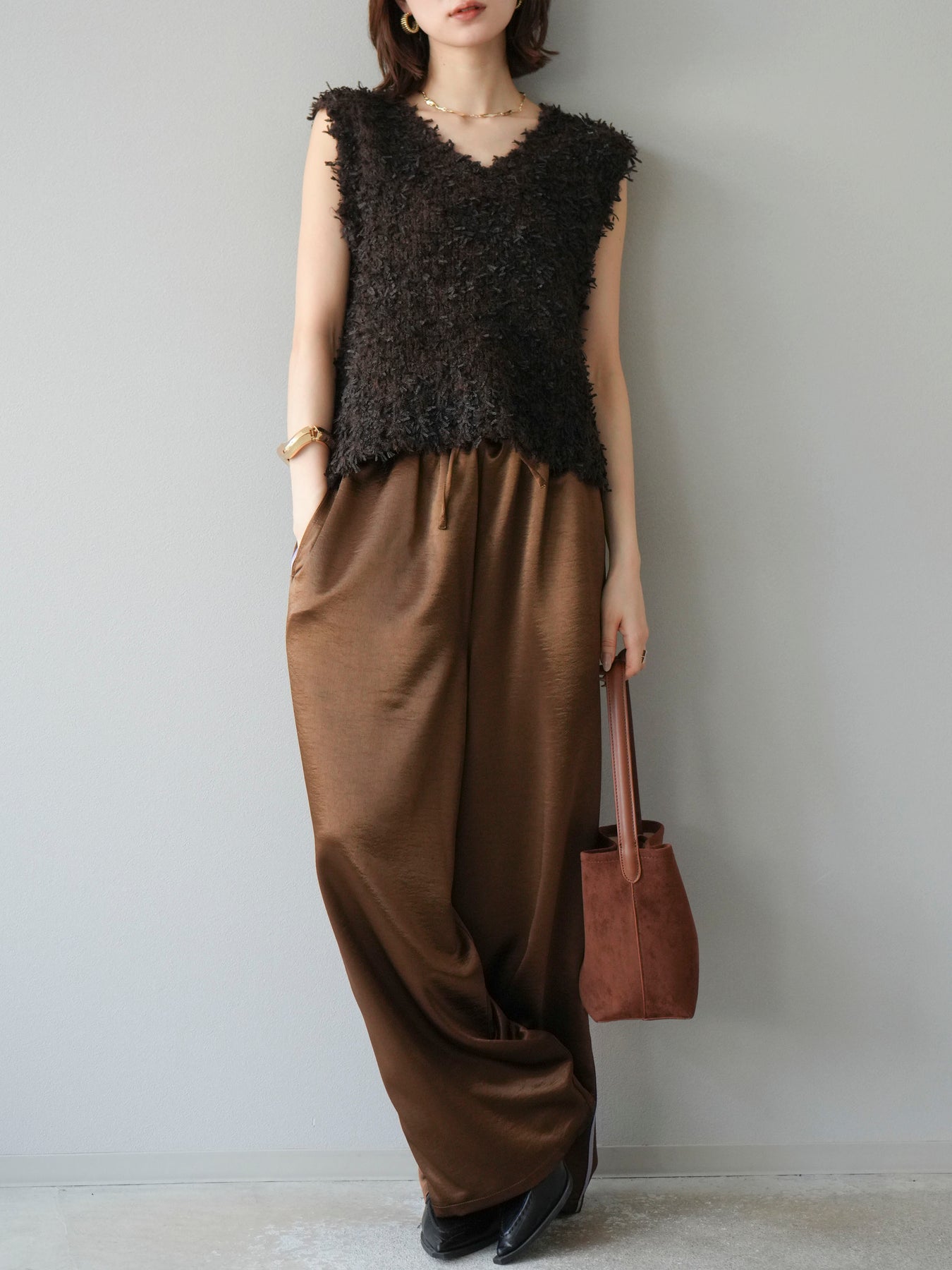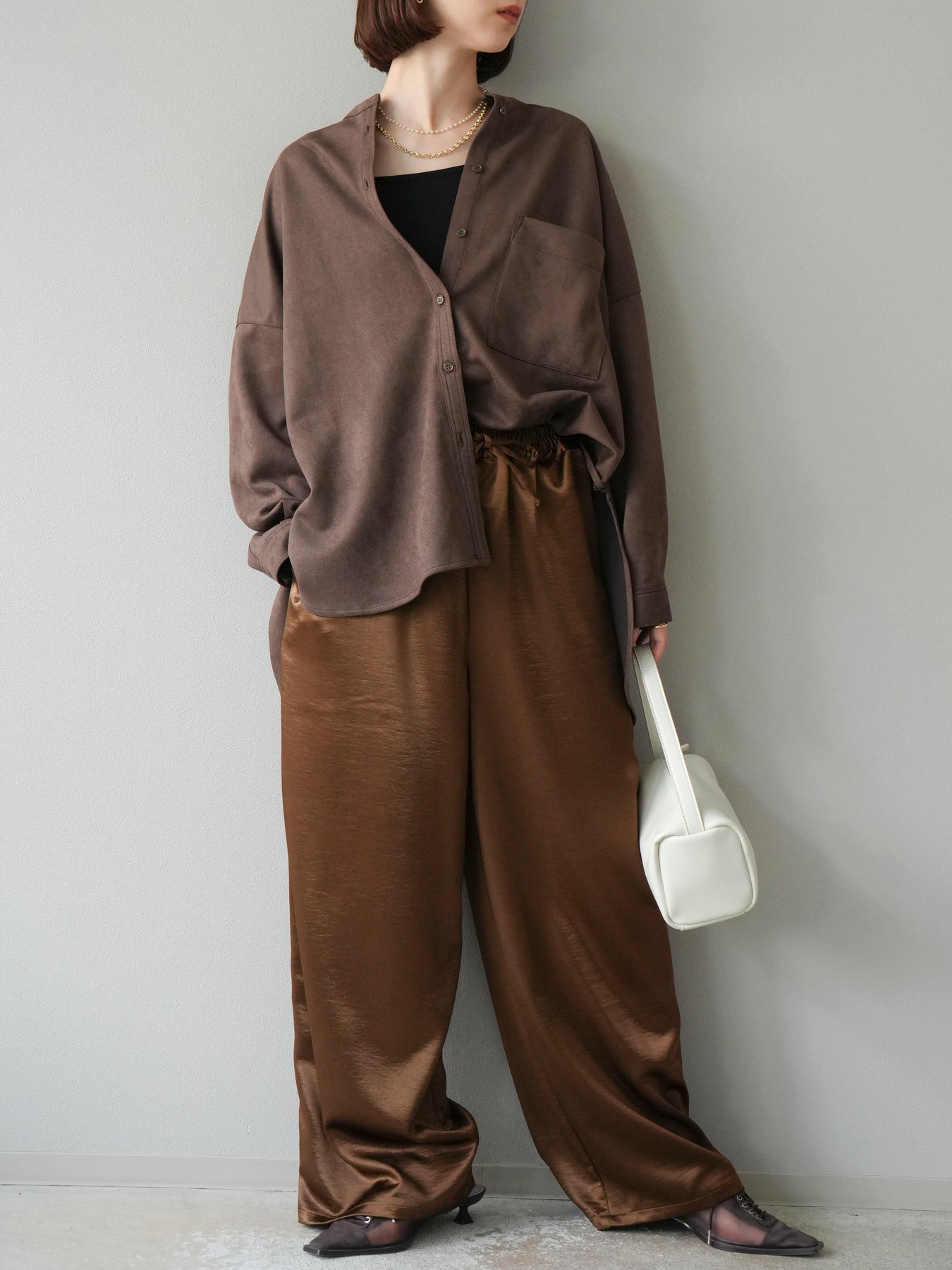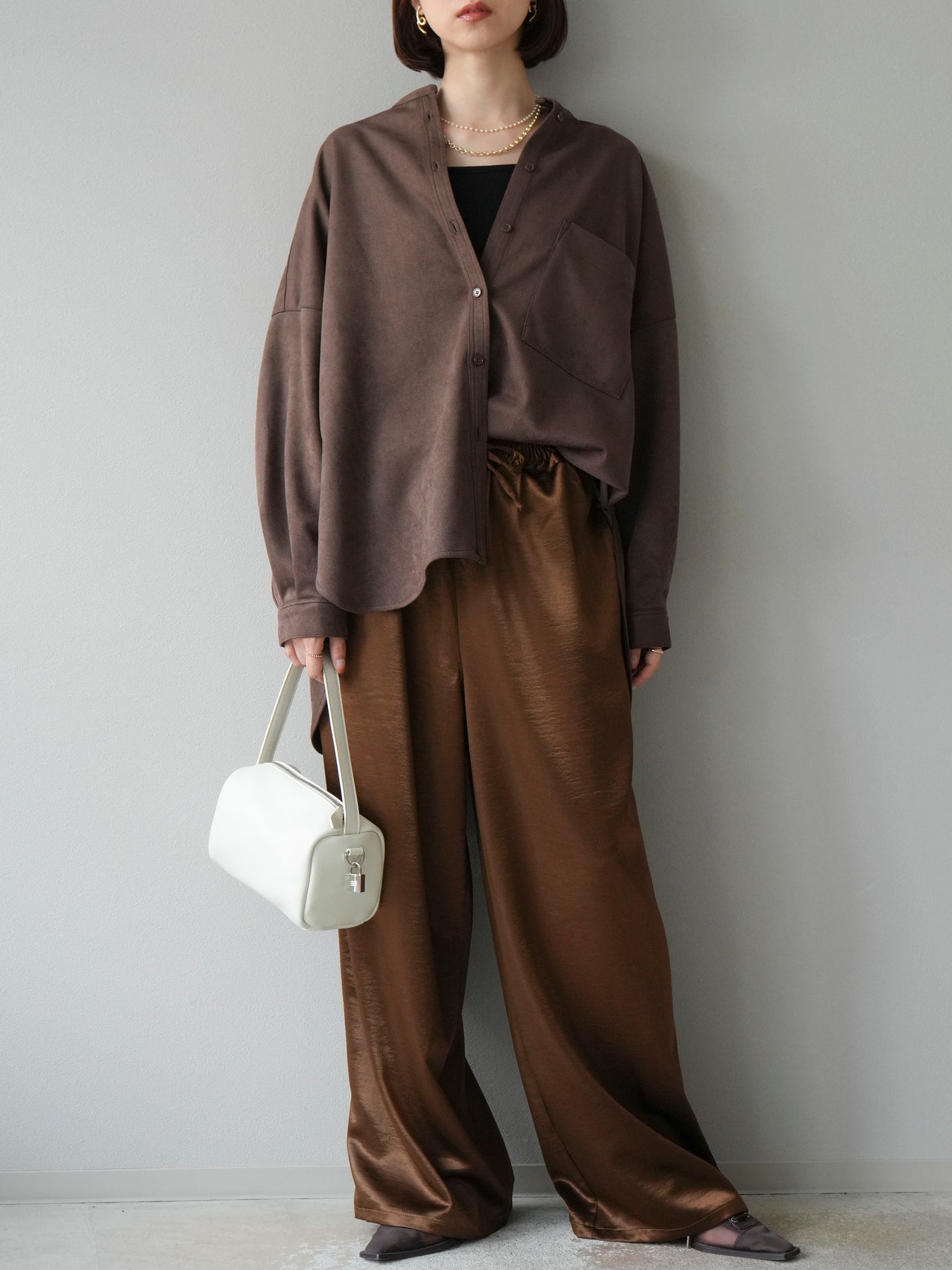 [予約]サテンラインワイドパンツ/ブラウン