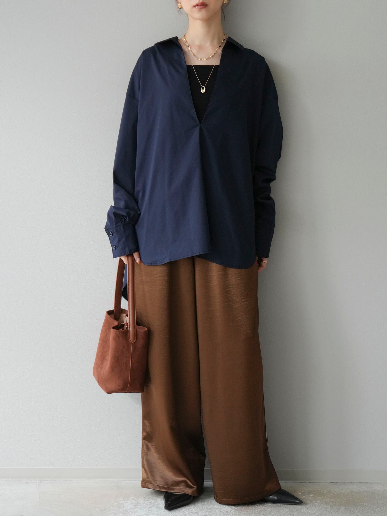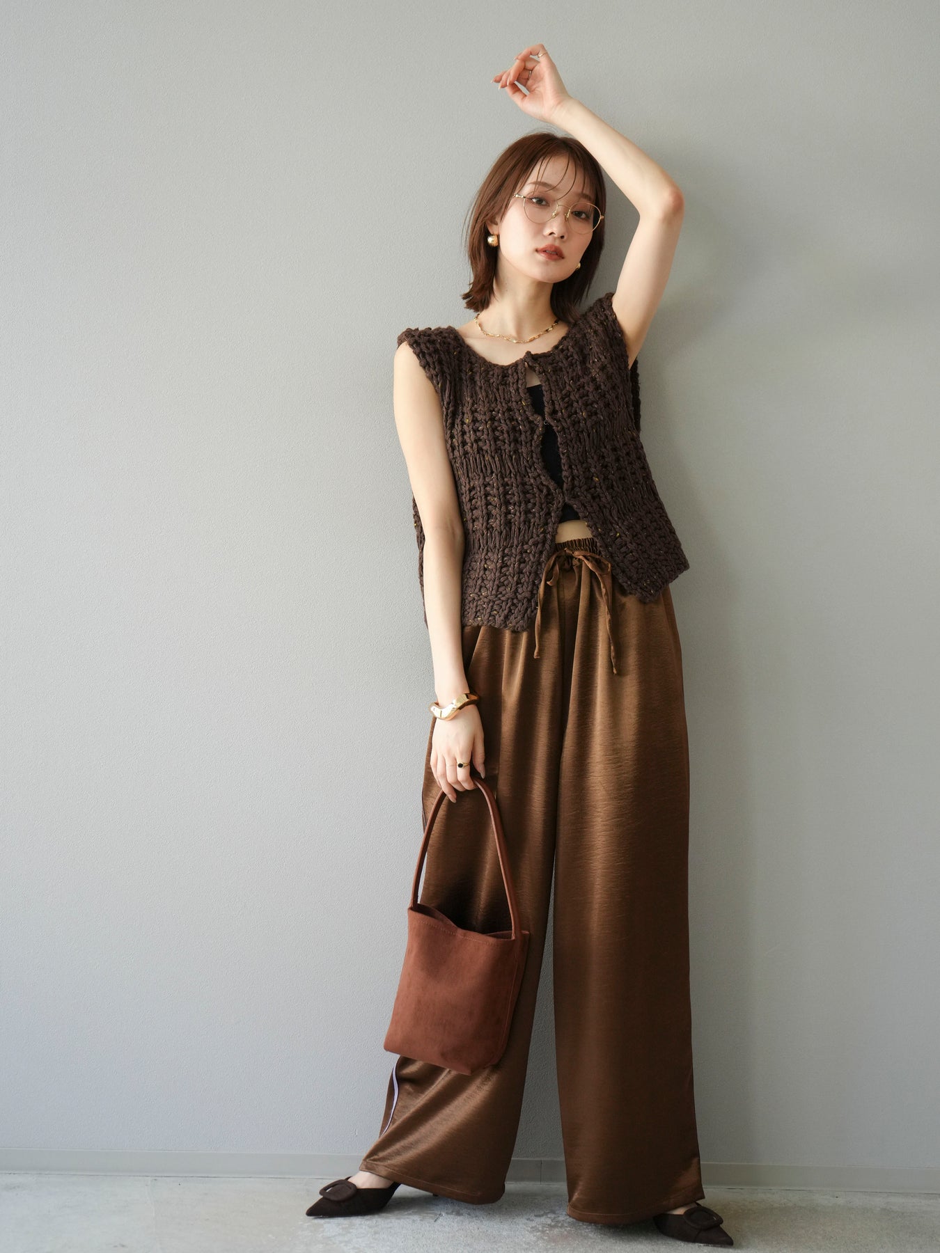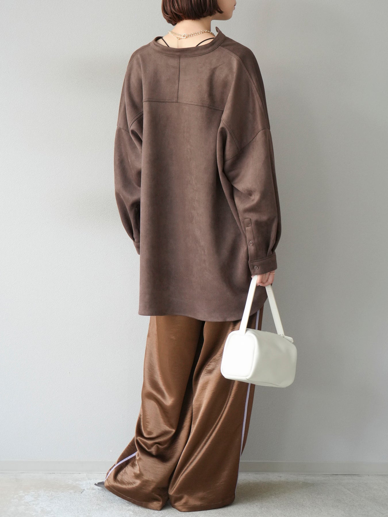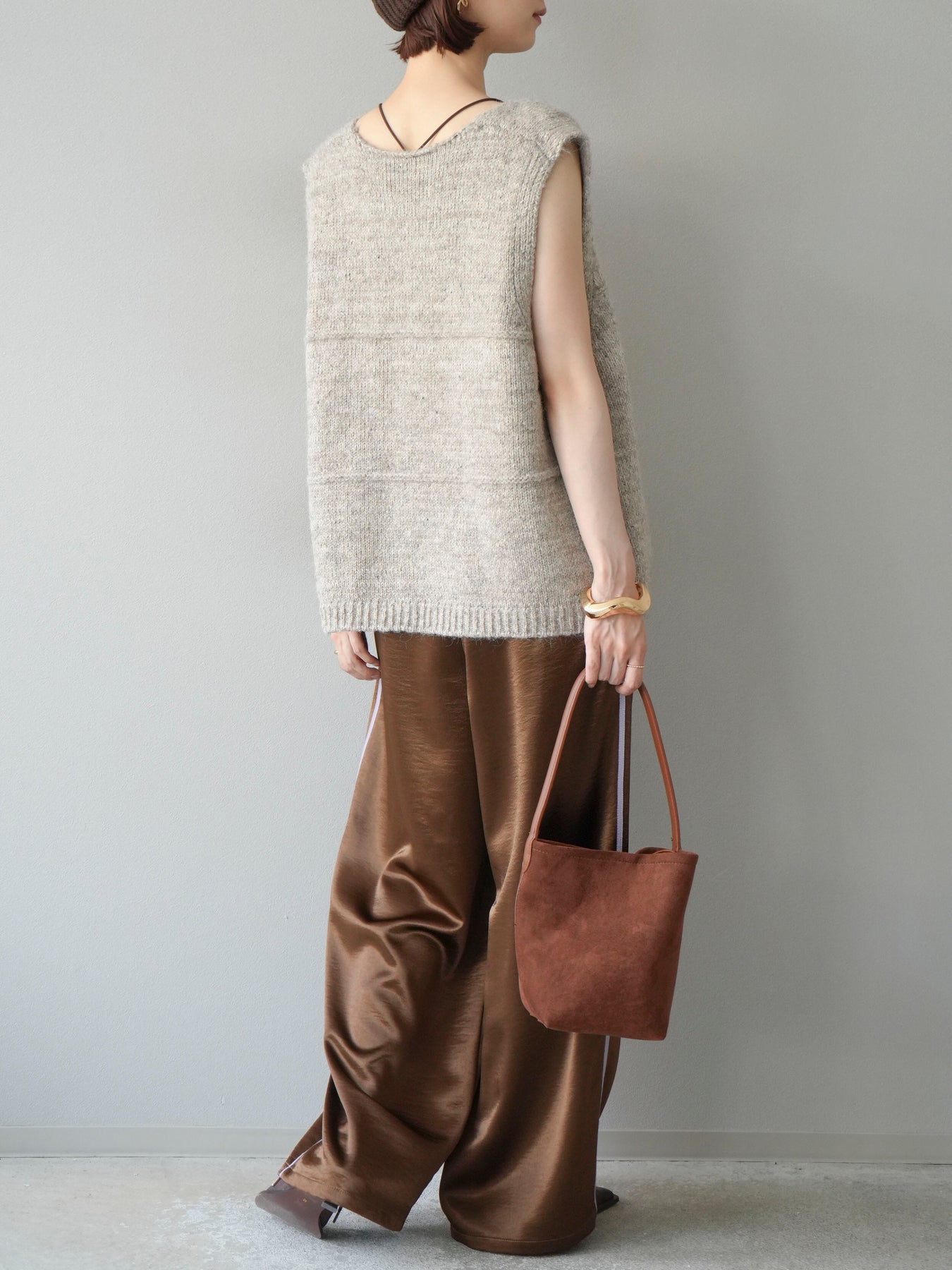 [予約]サテンラインワイドパンツ/ブラウン